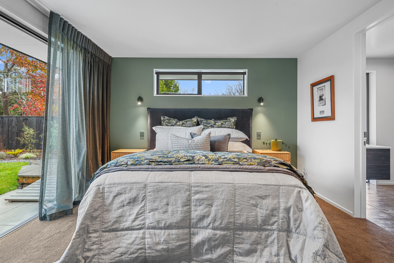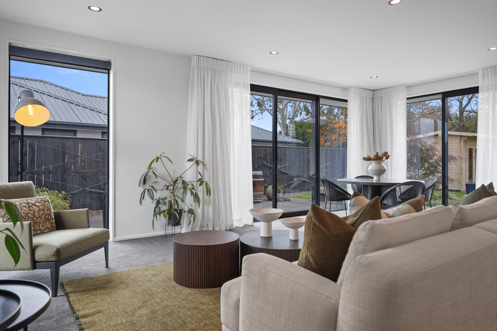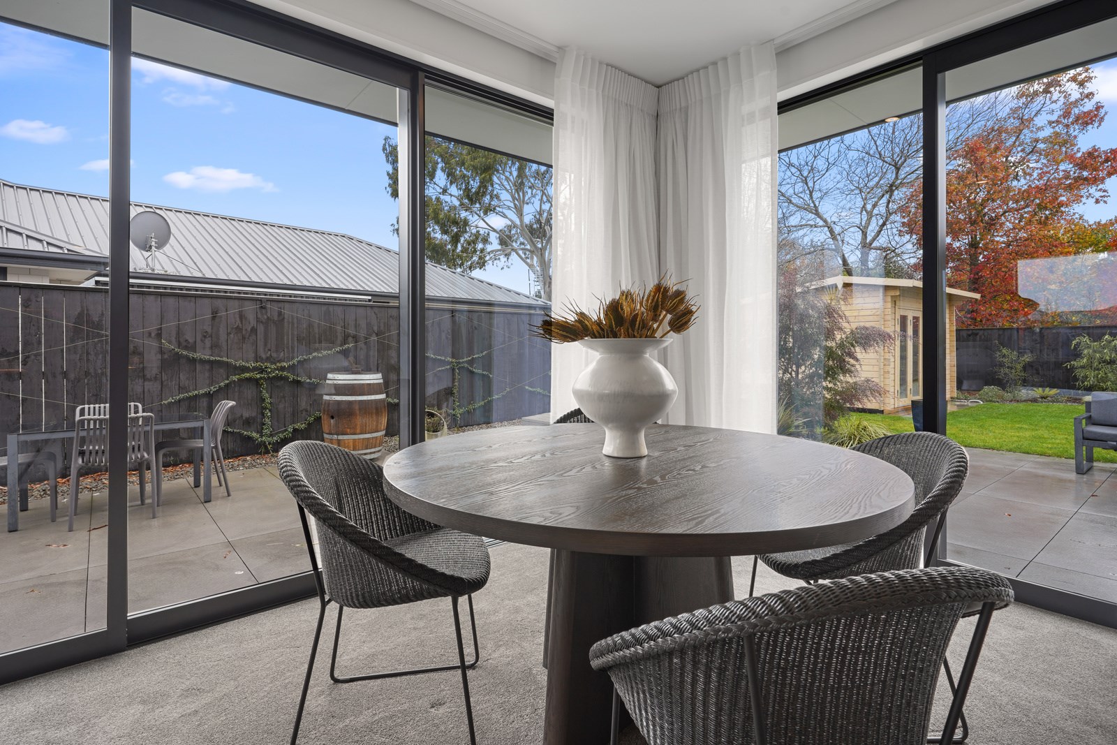 The kitchen is set back in this main area to deliver that all important together-apart scenario – and a peninsula bench aids the division. The dining zone has sliders on two sides which serve to define the space; with the doors open, there’s a feeling of dining alfresco. Bedrooms are located away from the hubbub of communal living, in a wing off the kitchen past the laundry that has access to the garage and the side garden. Two spacious bedrooms with floor-to-ceiling windows share a bathroom with separate powder room. At the end of the hall the main bedroom with ensuite and walk-in robe has garden access through sliding doors and completes this elegant balance of form and function.