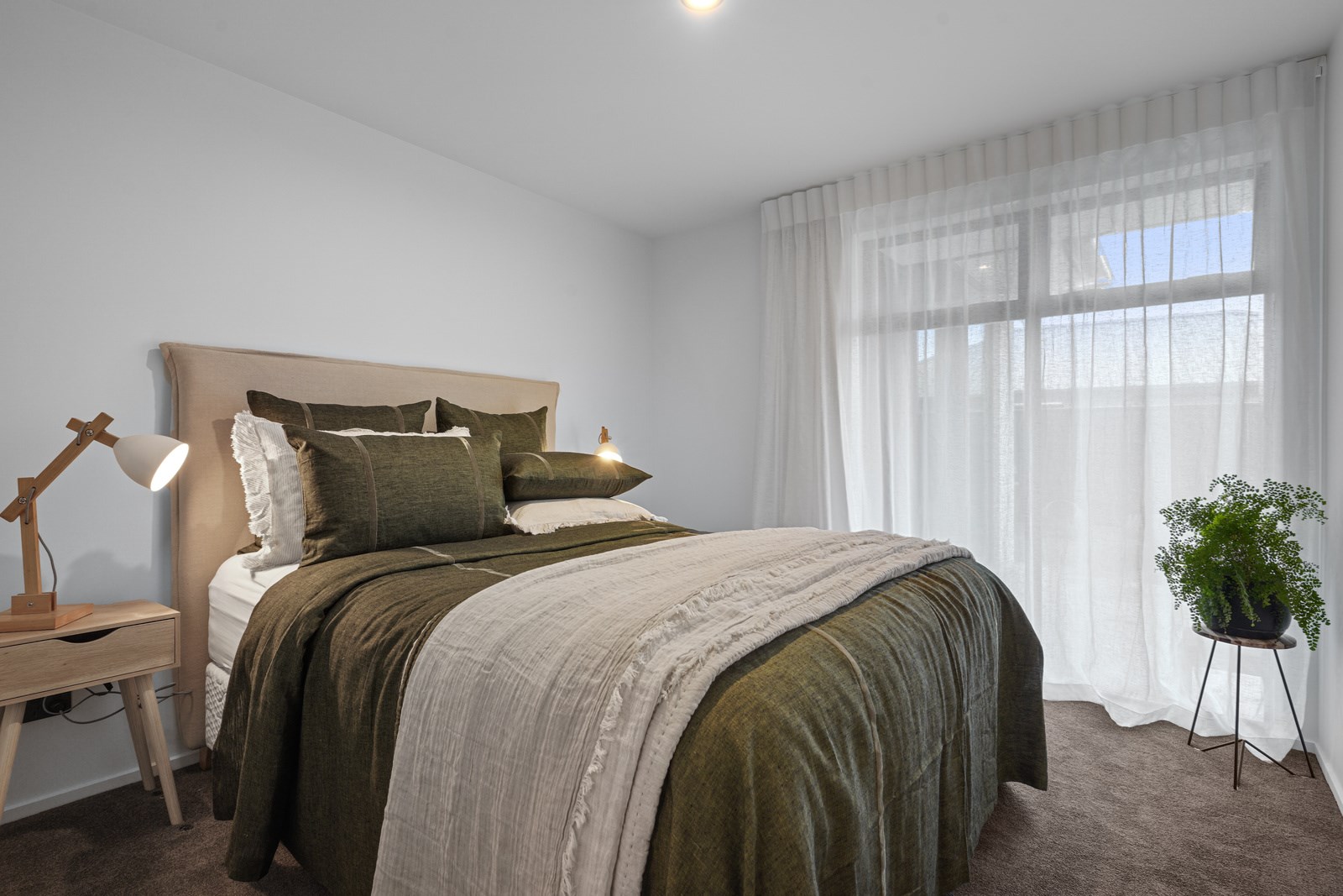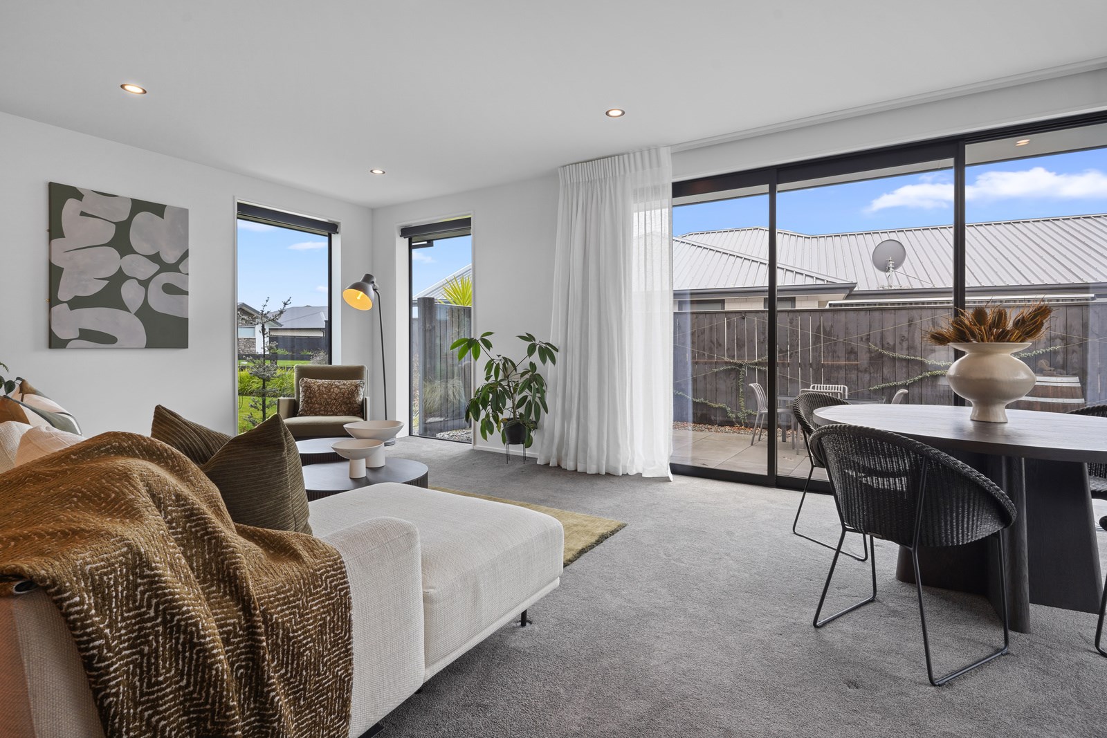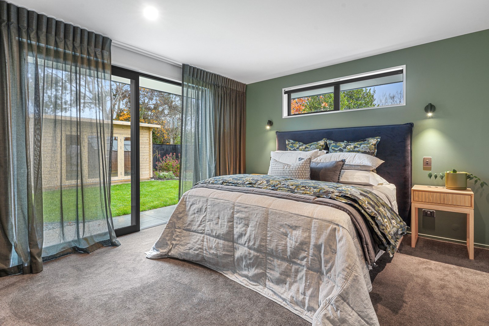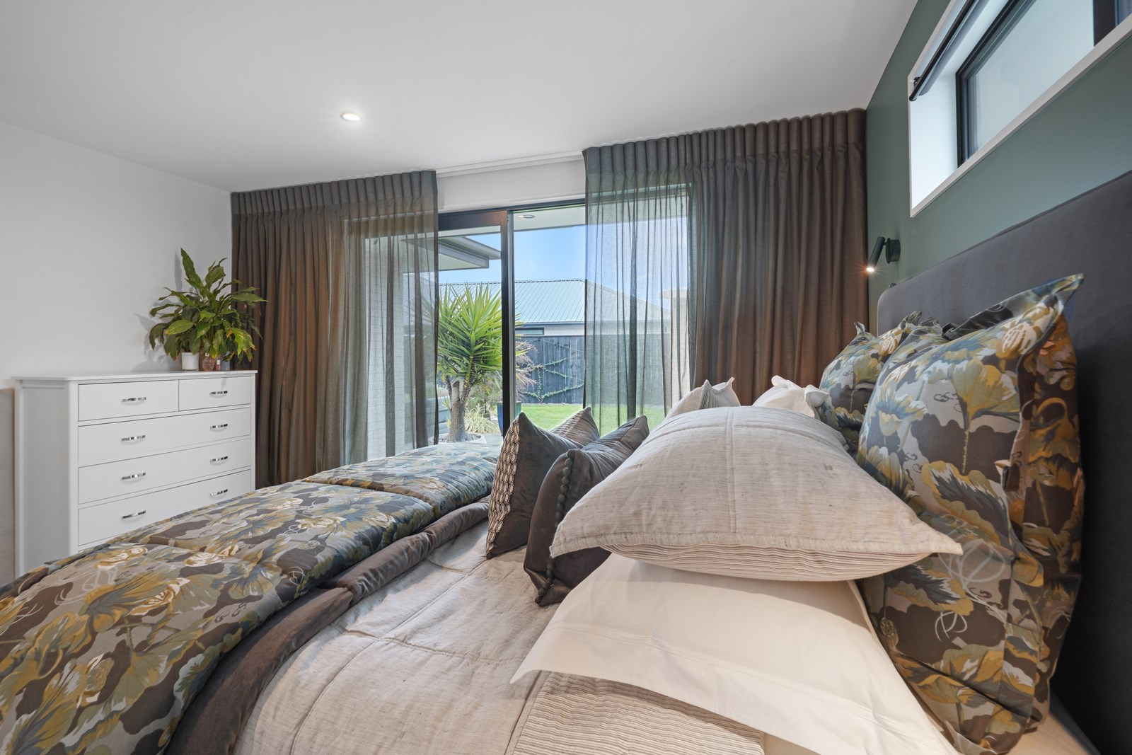 The kitchen is set back in this main area to deliver that all important together-apart scenario – and a peninsula bench aids the division. The dining zone has sliders on two sides which serve to define the space; with the doors open, there’s a feeling of dining alfresco. Bedrooms are located away from the hubbub of communal living, in a wing off the kitchen past the laundry that has access to the garage and the side garden. Two spacious bedrooms with floor-to-ceiling windows share a bathroom with separate powder room. At the end of the hall the main bedroom with ensuite and walk-in robe has garden access through sliding doors and completes this elegant balance of form and function.