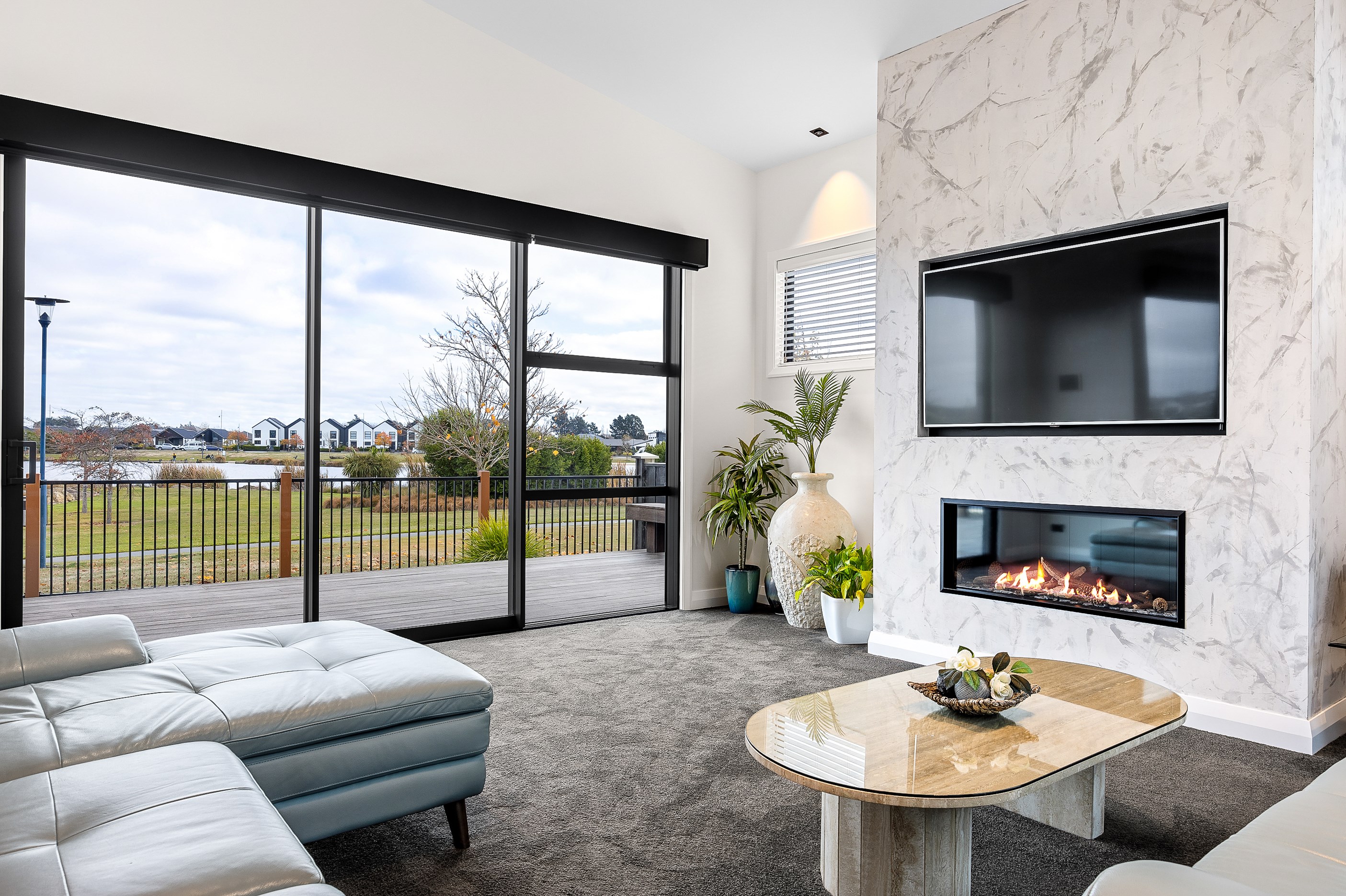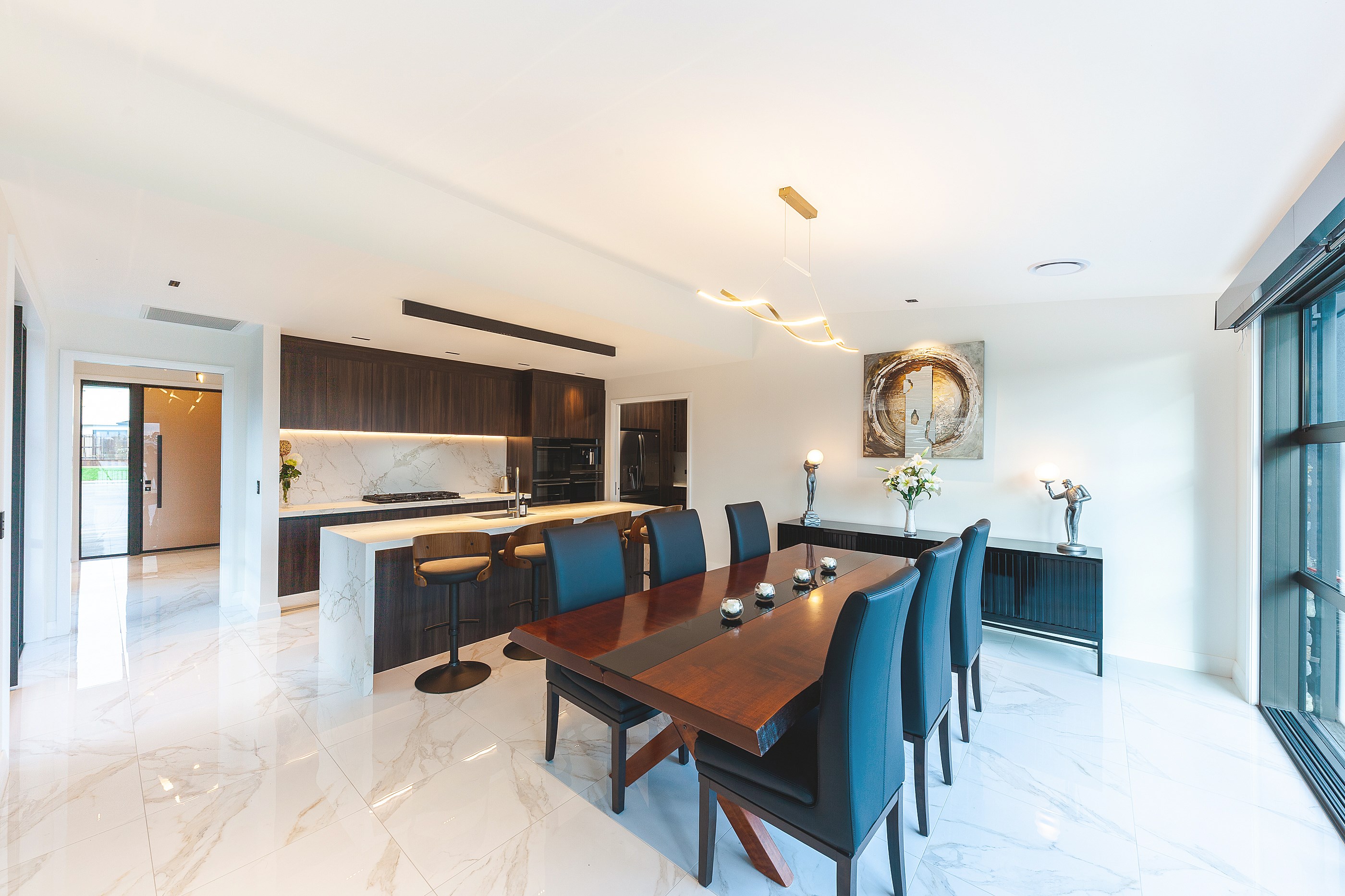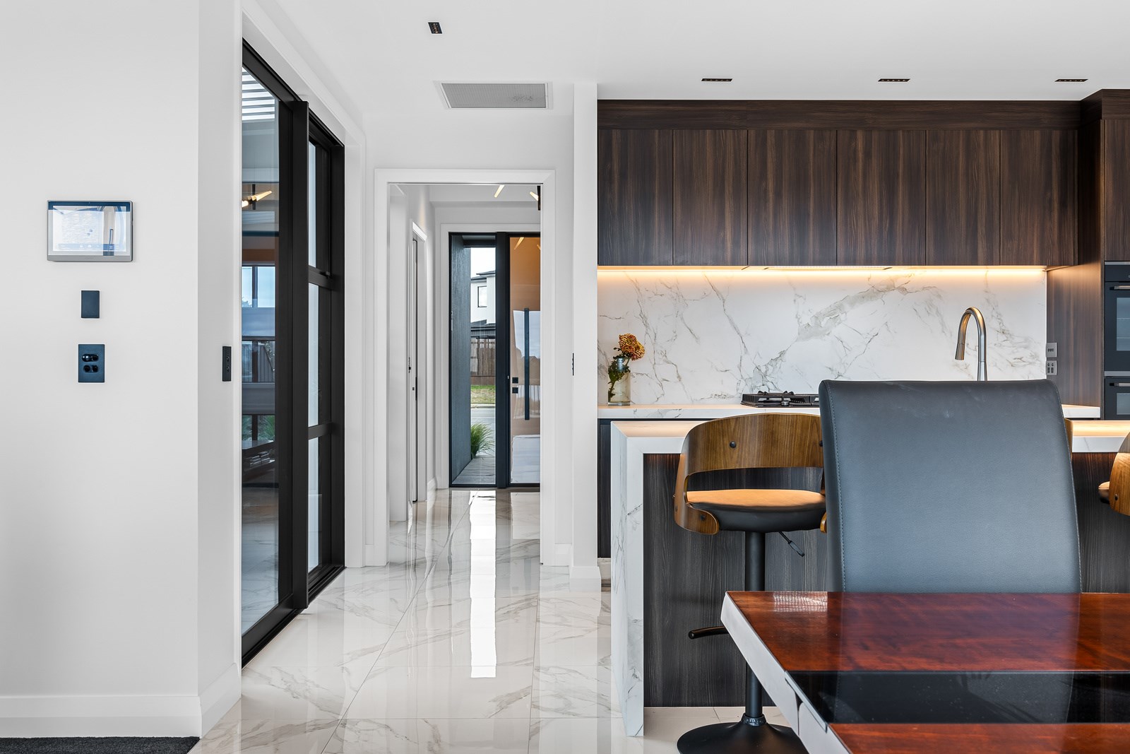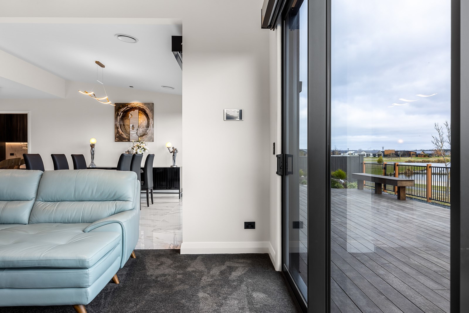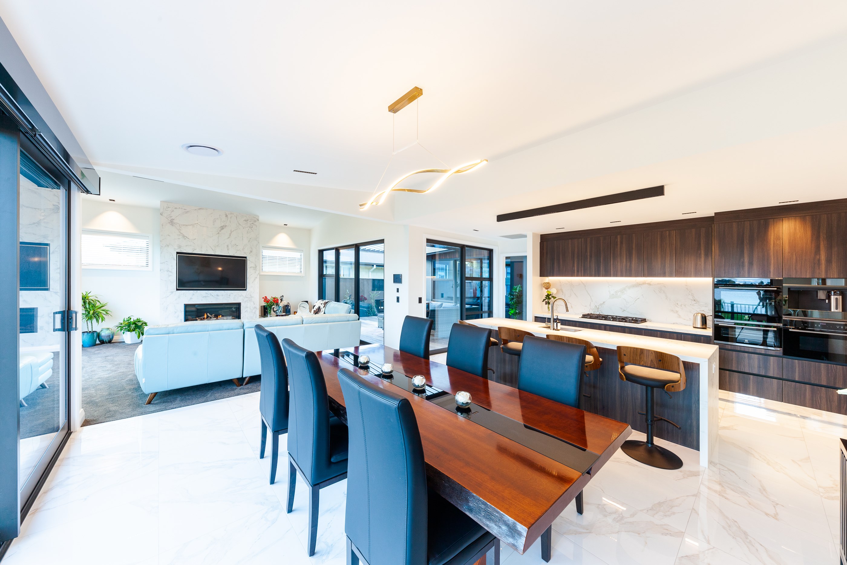 Stone veneer, LMA timber cladding and horizontal feature windows make for a stunning first impression of this home which makes maximises its spectacular 180-degree views of Pegasus Lake and close proximity to the beach. Its bold design elevates the streetscape as much as it does the lifestyle of its occupants, with a layout that works like a charm. On arrival, elegant marbled tiling runs through the entrance to the kitchen and dining area. The designer Millbrook kitchen is a showstopper with sleek black accents, integrated appliances, porcelain benchtops and a butler’s pantry with cavity sliders, making for mess free entertaining.