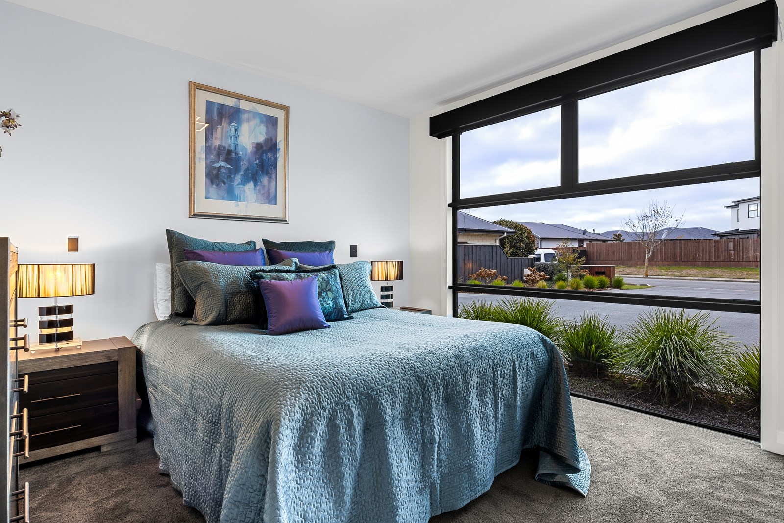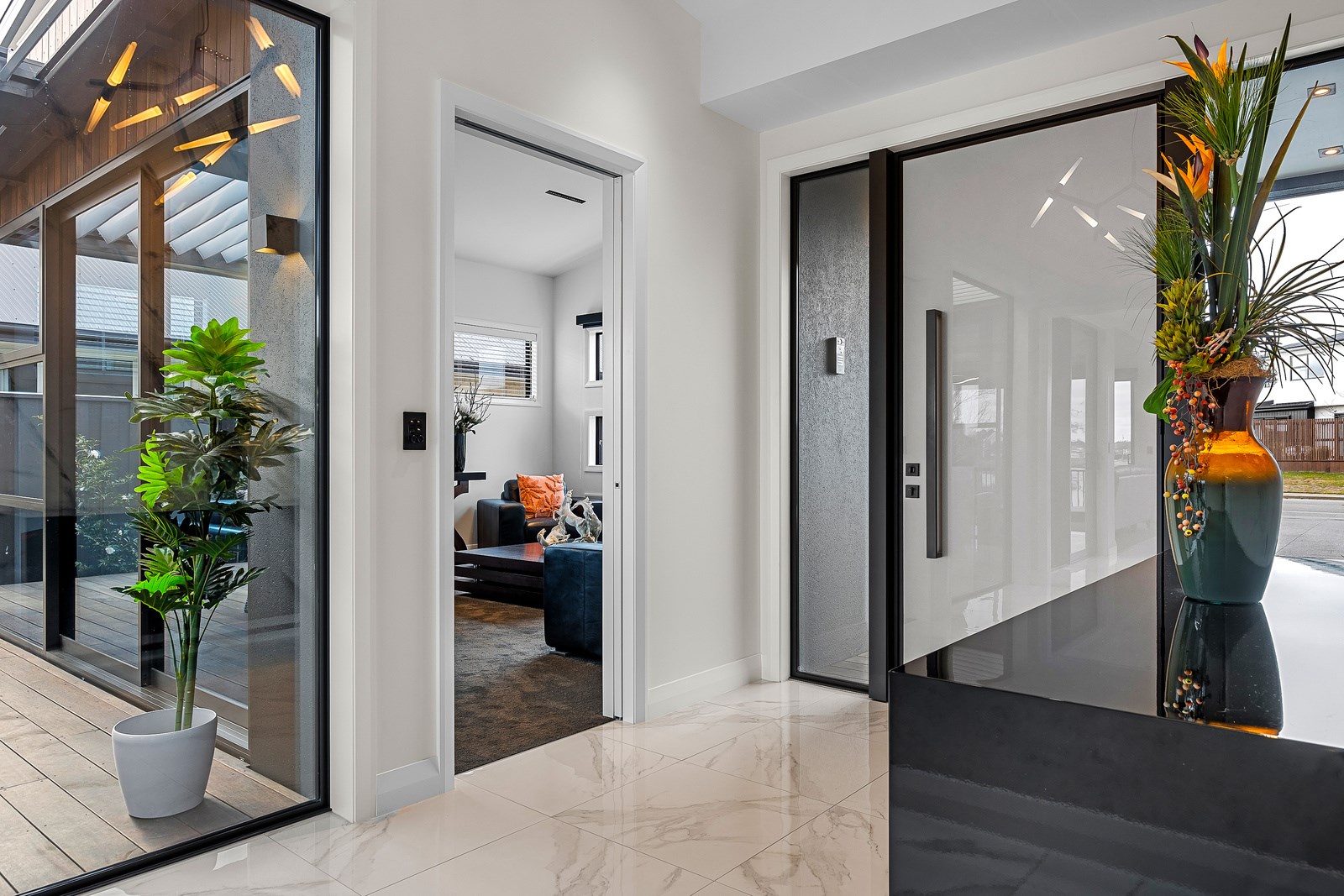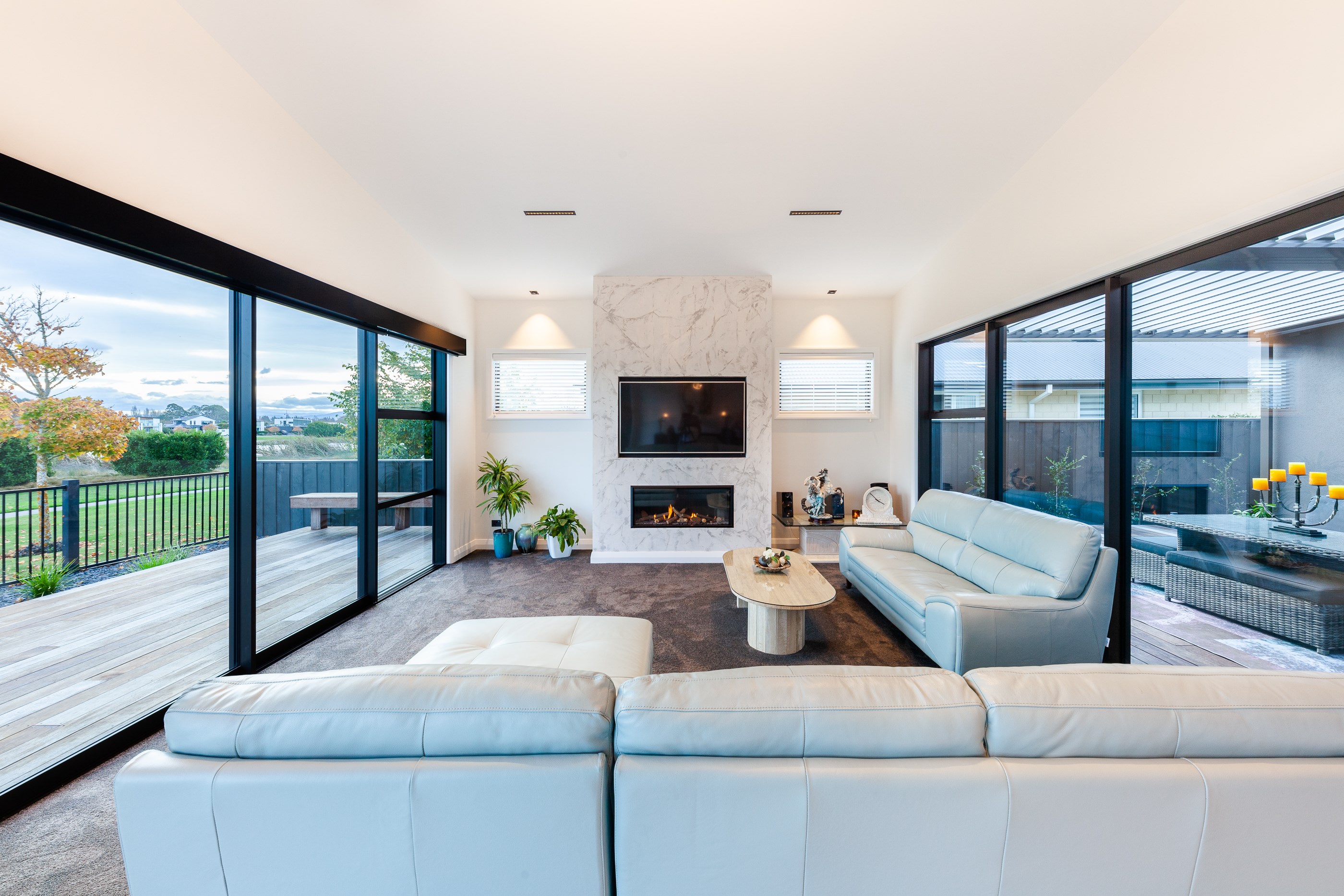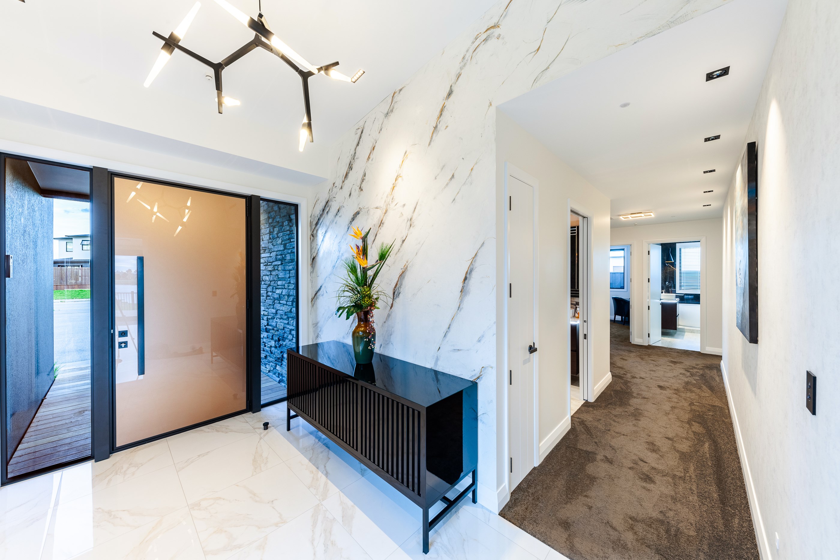 Stone veneer, LMA timber cladding and horizontal feature windows make for a stunning first impression of this home which makes maximises its spectacular 180-degree views of Pegasus Lake and close proximity to the beach. Its bold design elevates the streetscape as much as it does the lifestyle of its occupants, with a layout that works like a charm. On arrival, elegant marbled tiling runs through the entrance to the kitchen and dining area. The designer Millbrook kitchen is a showstopper with sleek black accents, integrated appliances, porcelain benchtops and a butler’s pantry with cavity sliders, making for mess free entertaining.