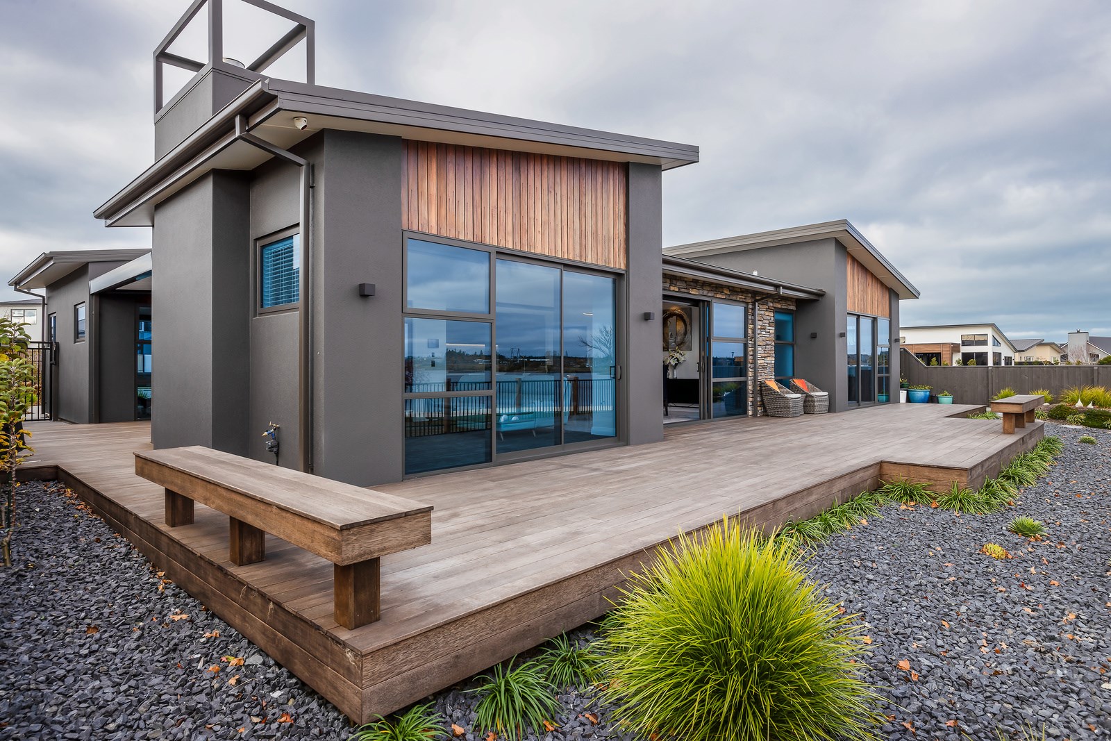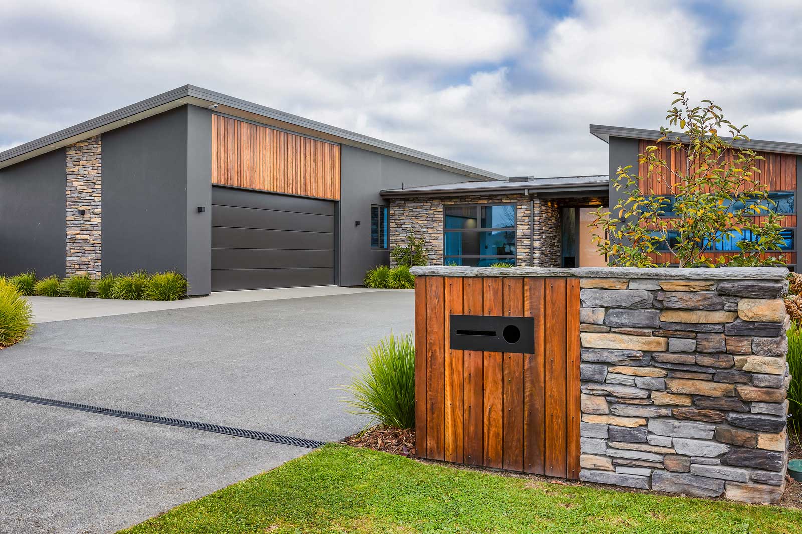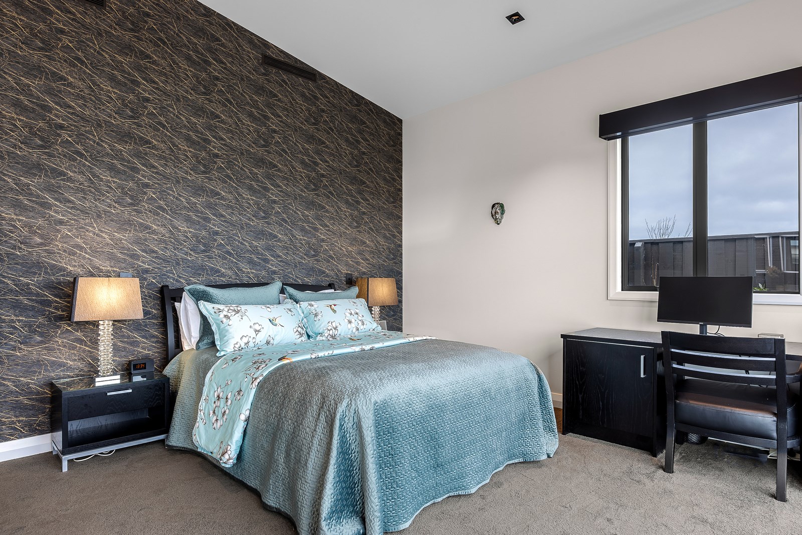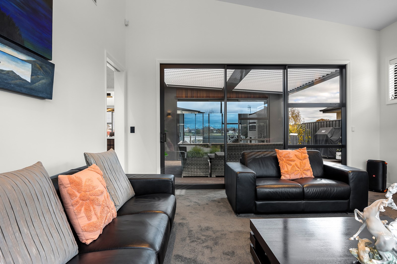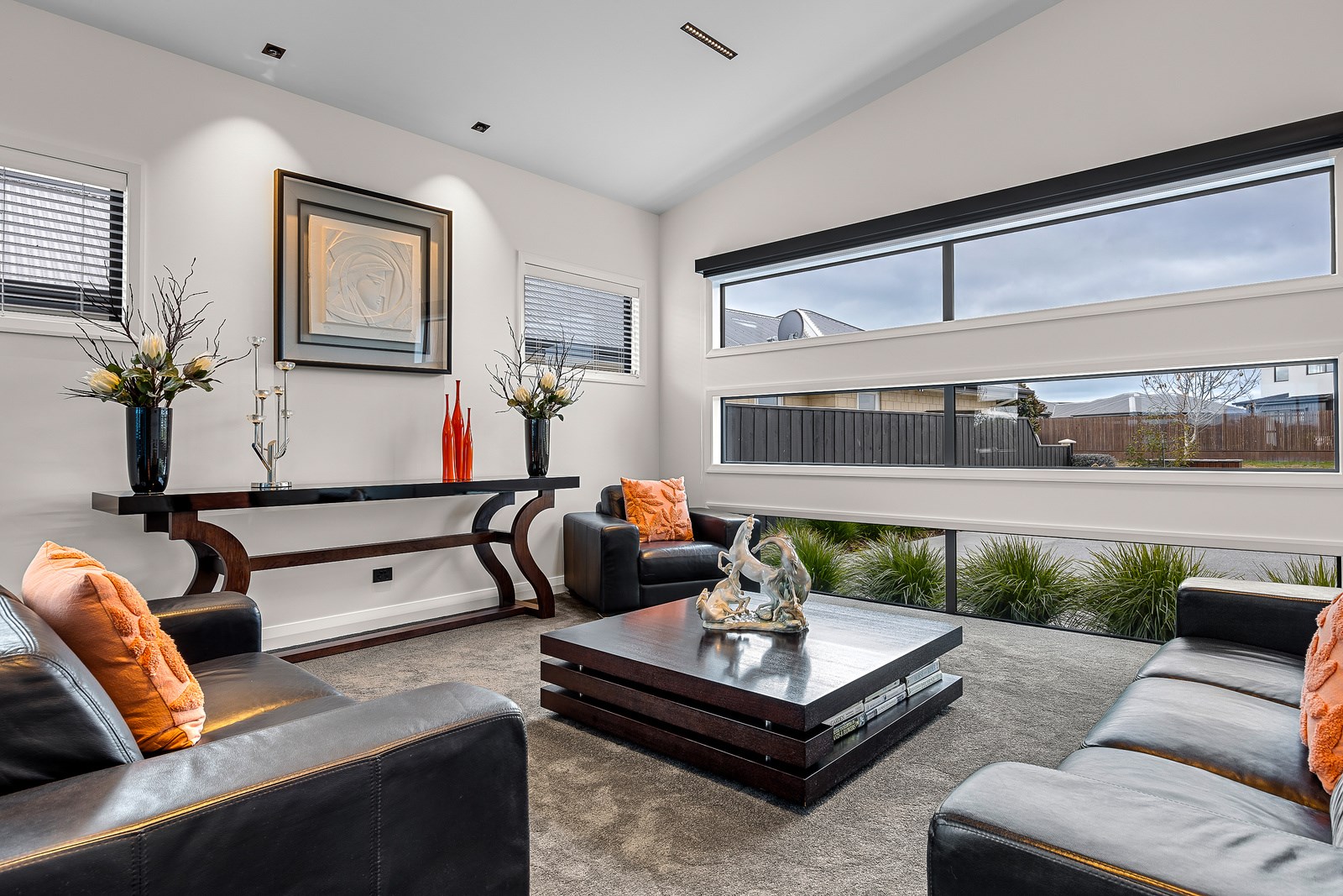 Stone veneer, LMA timber cladding and horizontal feature windows make for a stunning first impression of this home which makes maximises its spectacular 180-degree views of Pegasus Lake and close proximity to the beach. Its bold design elevates the streetscape as much as it does the lifestyle of its occupants, with a layout that works like a charm. On arrival, elegant marbled tiling runs through the entrance to the kitchen and dining area. The designer Millbrook kitchen is a showstopper with sleek black accents, integrated appliances, porcelain benchtops and a butler’s pantry with cavity sliders, making for mess free entertaining.