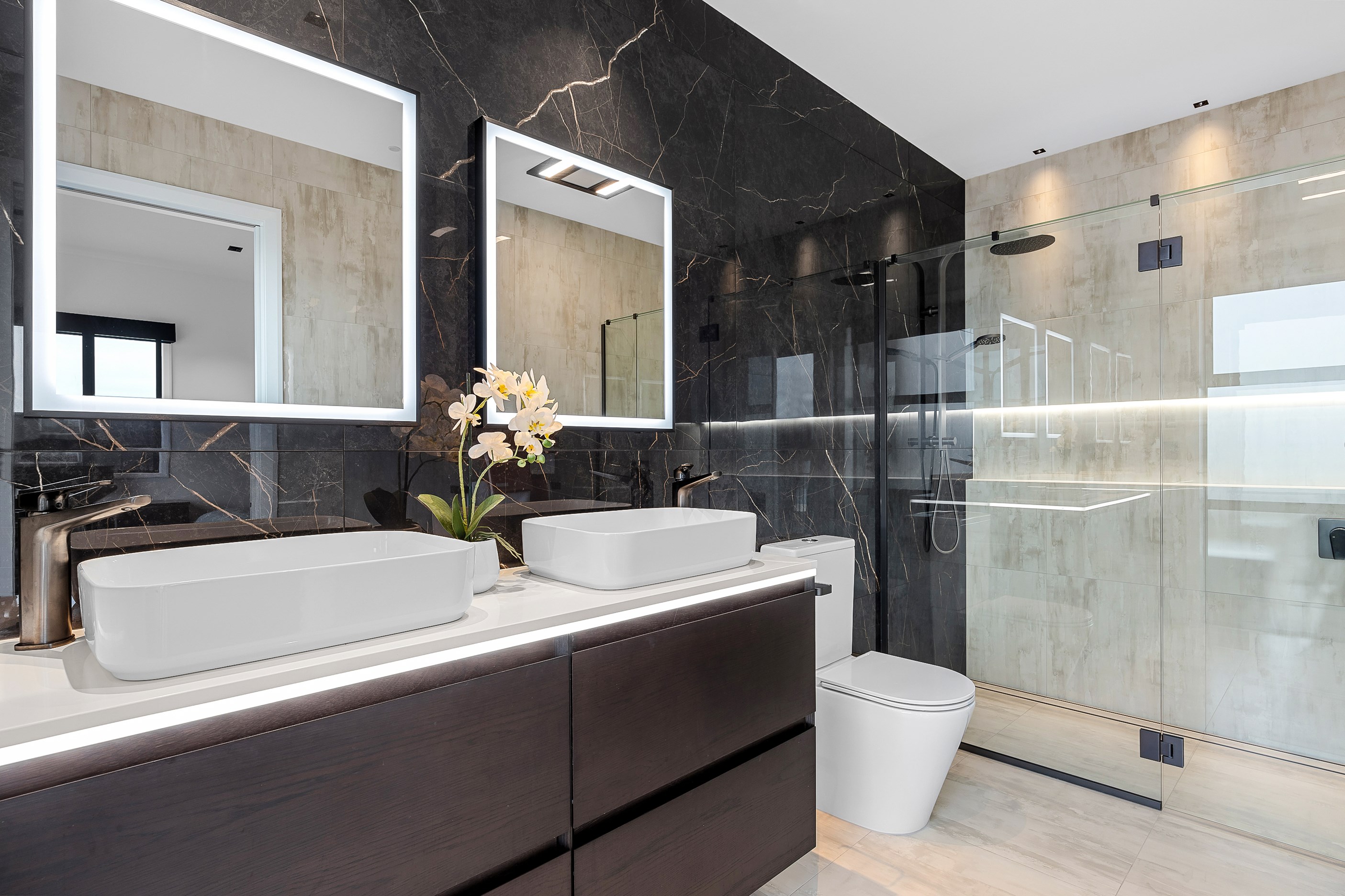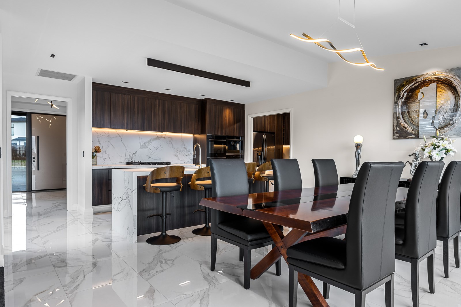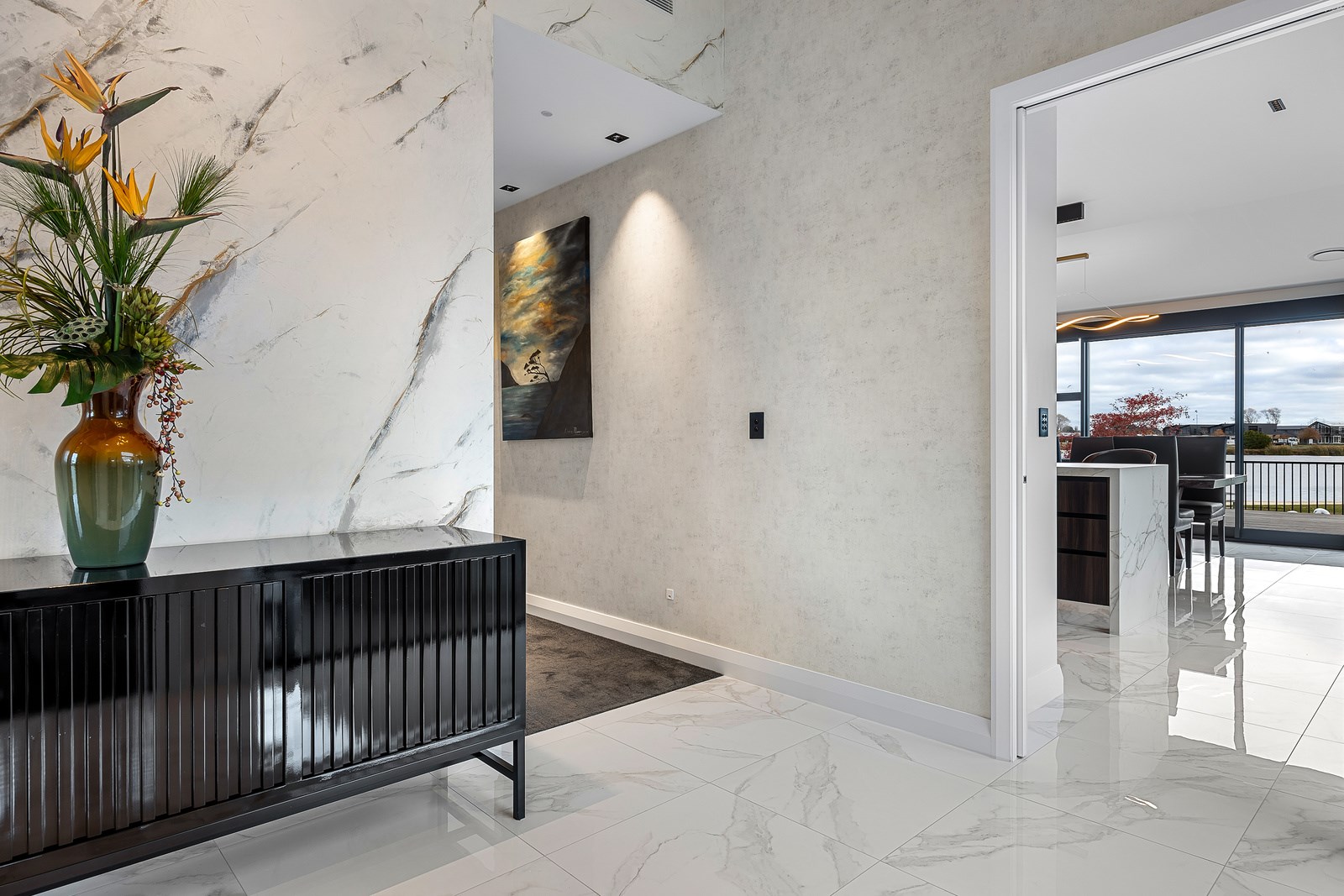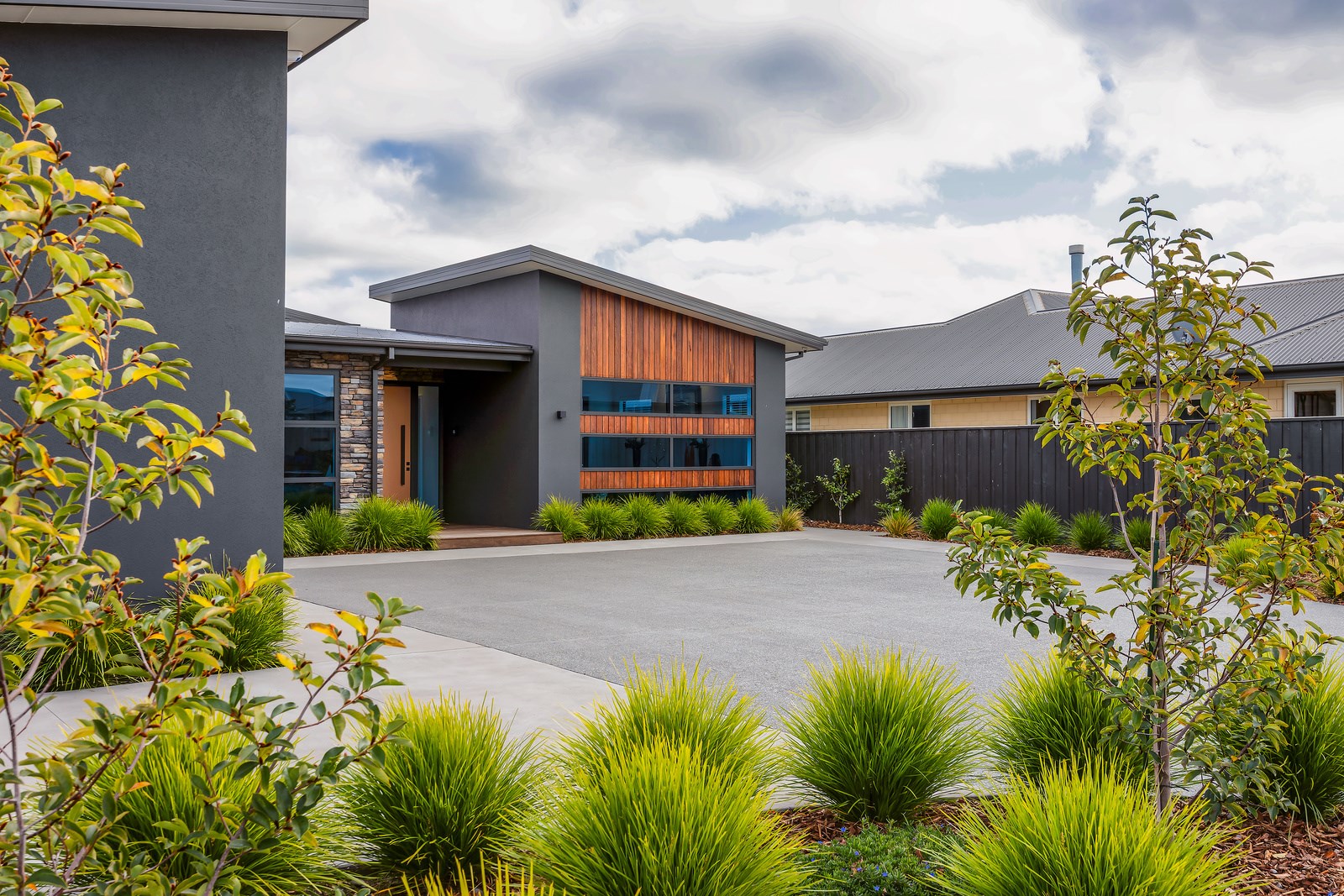 Stone veneer, LMA timber cladding and horizontal feature windows make for a stunning first impression of this home which makes maximises its spectacular 180-degree views of Pegasus Lake and close proximity to the beach. Its bold design elevates the streetscape as much as it does the lifestyle of its occupants, with a layout that works like a charm. On arrival, elegant marbled tiling runs through the entrance to the kitchen and dining area. The designer Millbrook kitchen is a showstopper with sleek black accents, integrated appliances, porcelain benchtops and a butler’s pantry with cavity sliders, making for mess free entertaining.