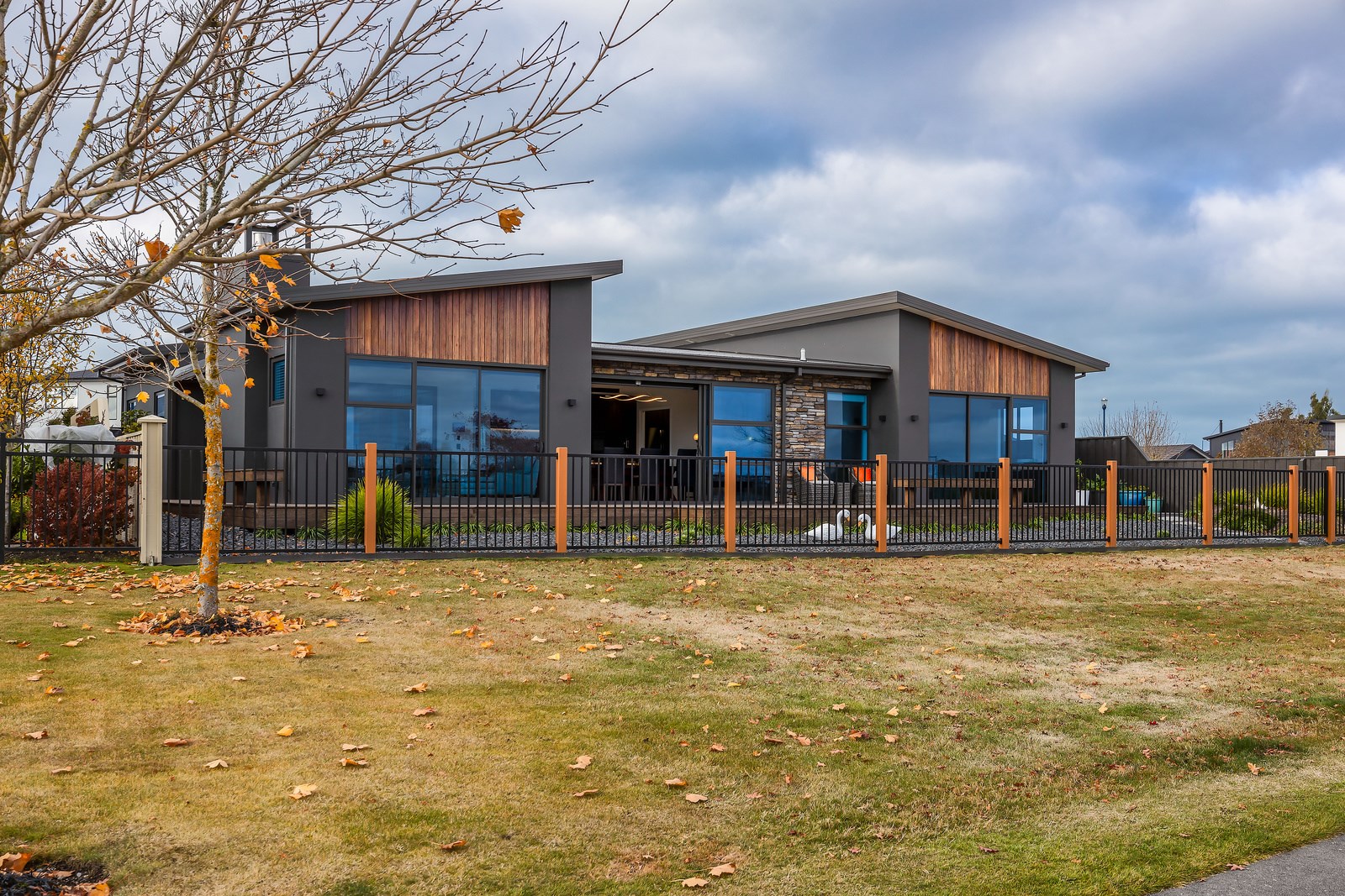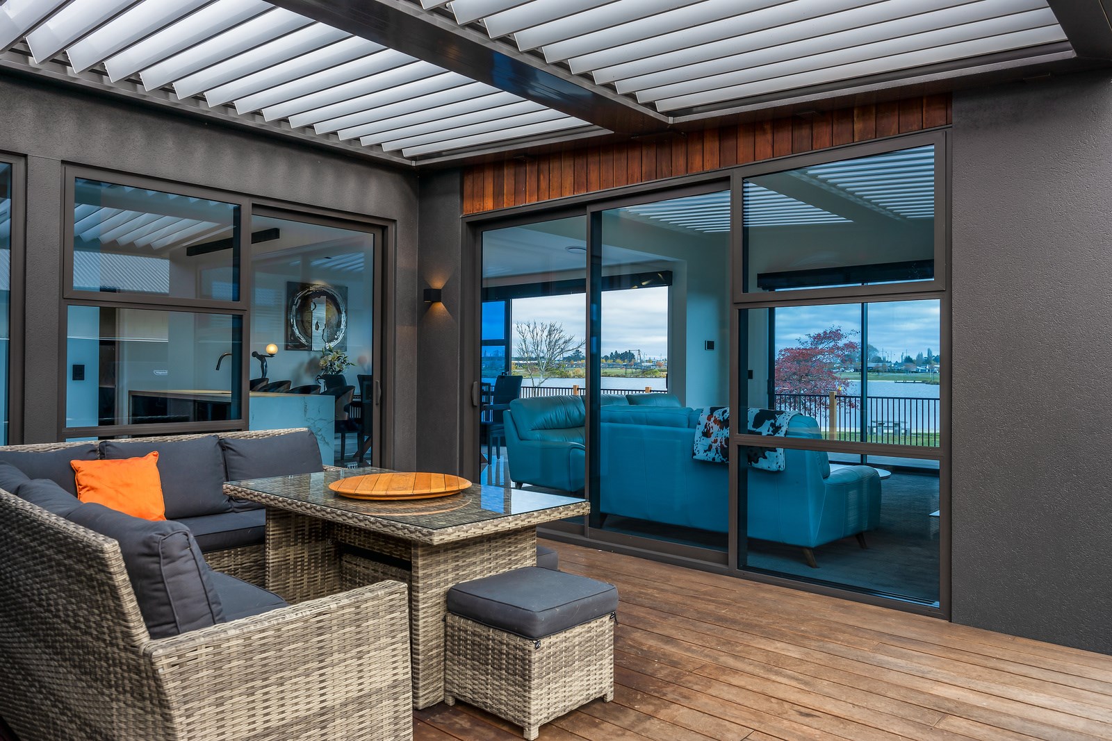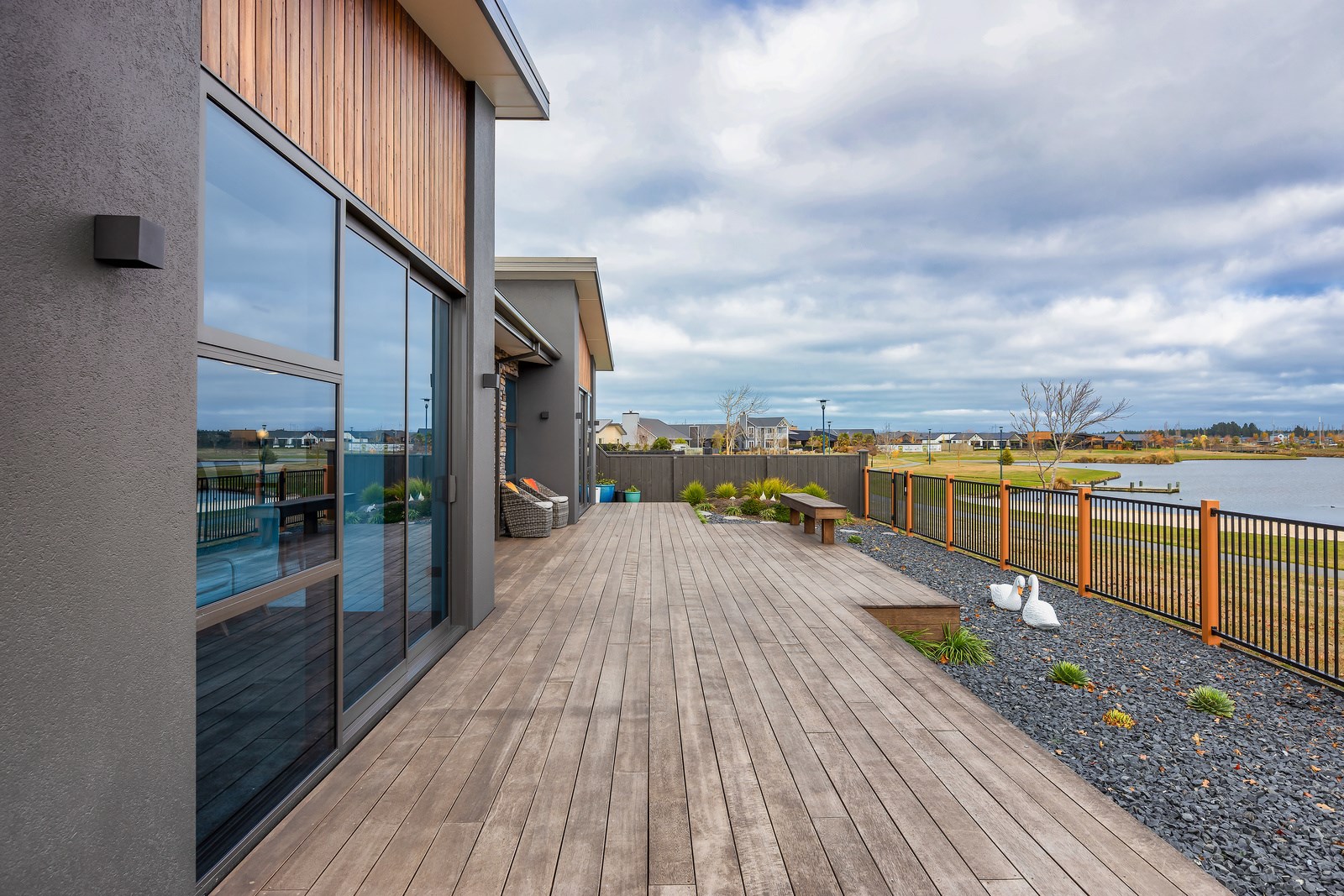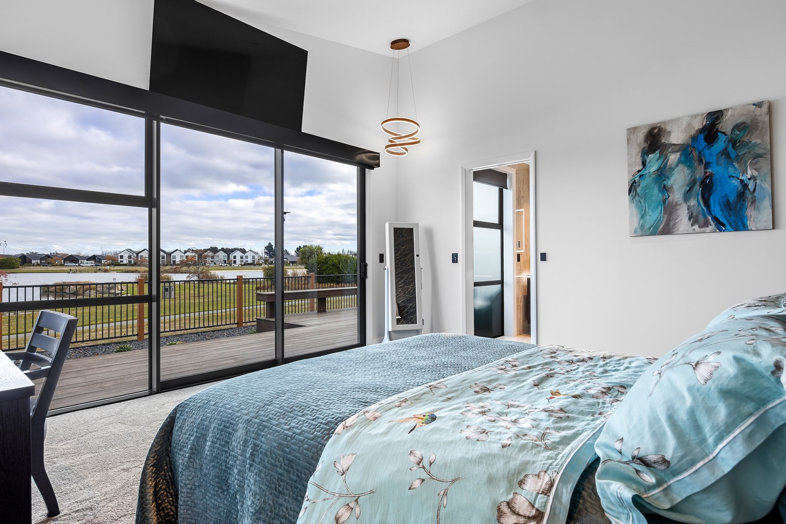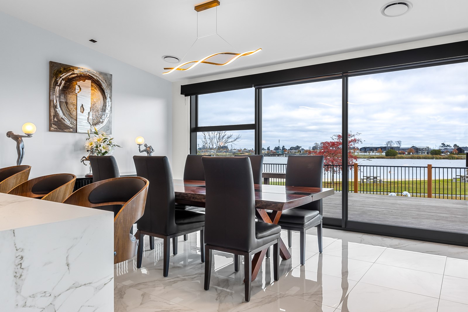 Two spacious living rooms flow through to an outdoor alfresco area protected by the louvred roof. Into the powder room, the vaulted ceiling has an opening skylight which drenches the room with natural light. The grandly proportioned master suite boasts a light filled ensuite thanks to a large, frosted window, while generous sliding stacker doors open to the western decking with astonishing views of the lake. Two additional bedrooms are serviced by a contemporary bathroom, and there is a multitude of storage options in the laundry, oversized garage and storeroom. Breathtaking for its individuality, this single storey 300sqm is an achievement that teams modern luxury with functionality.