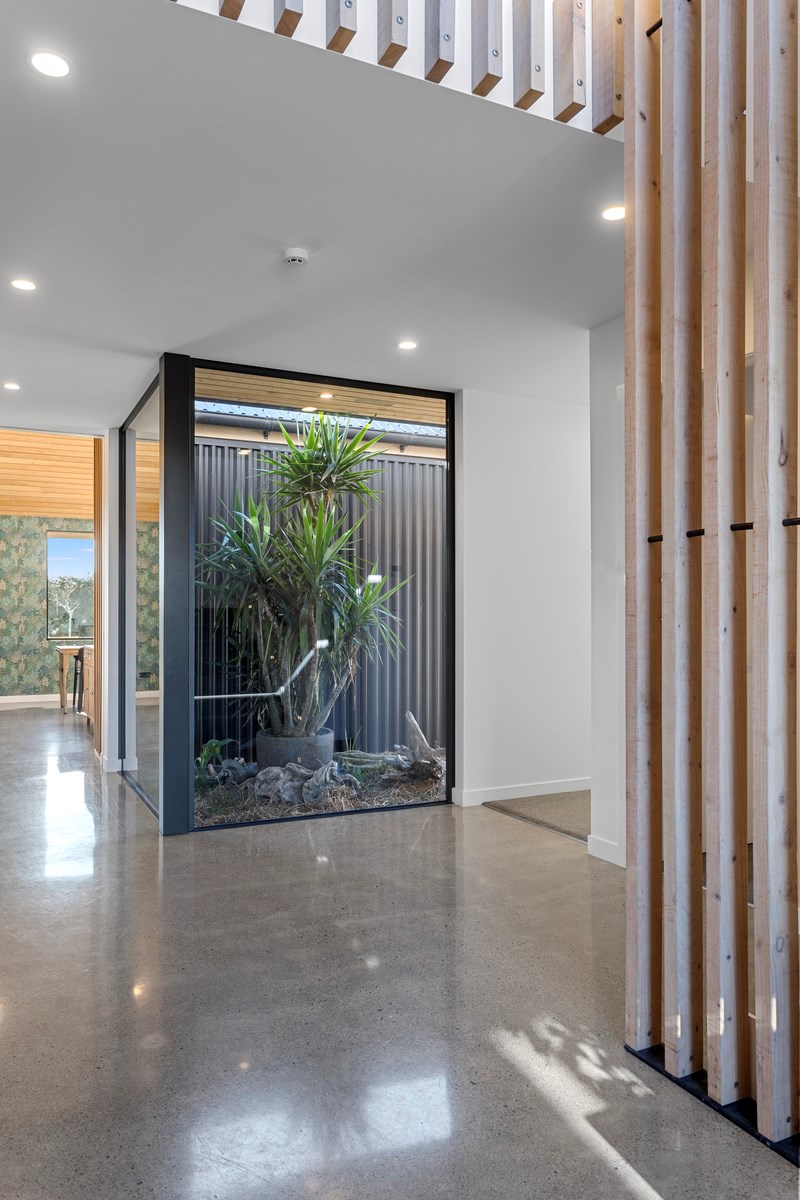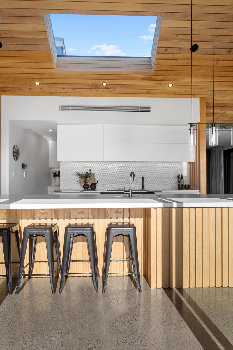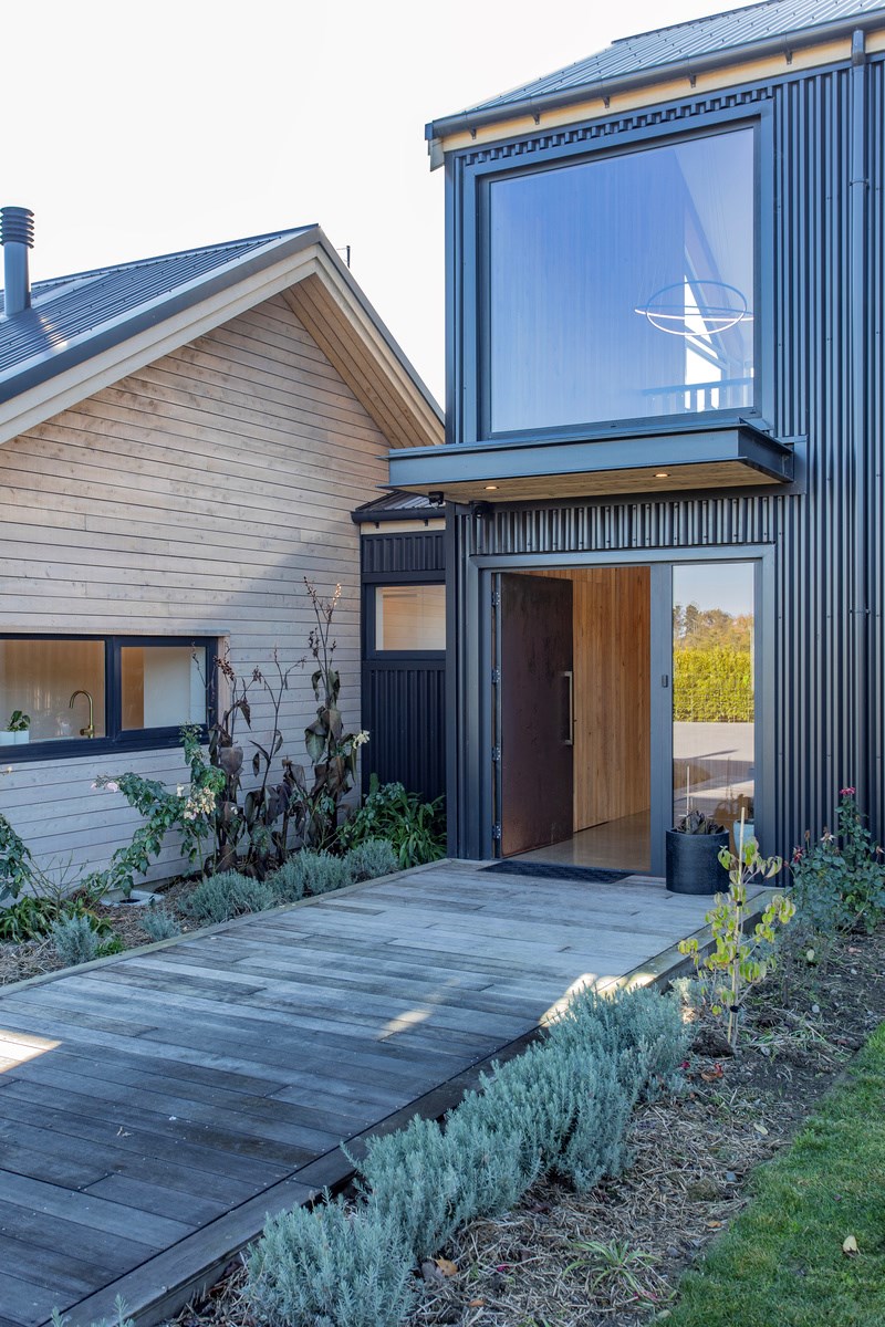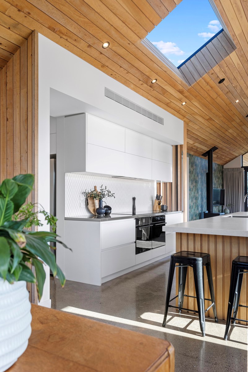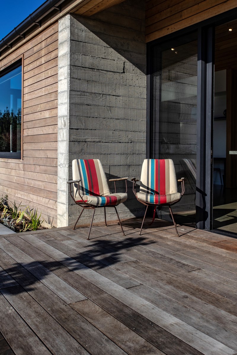 The macrocarpa is used in cladding, the entry with ‘hidden’ doors, a dramatic stairwell and the mezzanine landing. Sustainable living was achieved by investing in passive concepts. The house is wrapped in an airtight envelope using the Pro Clima Intello system; mechanical ventilation was required to enable it to breathe. The Stiebel ‘lungs’ of the house filter and circulate the air, while ducted heat pumps keep it cool. Underfloor heat pump hydronic heating regulates the ground floor slab and a log burner adds to the home’s earthy ambience. Solar panels power the electrics and rainwater is collected in underground tanks. The result is an earthy, grounded home that feels very easy and comfortable to be in.