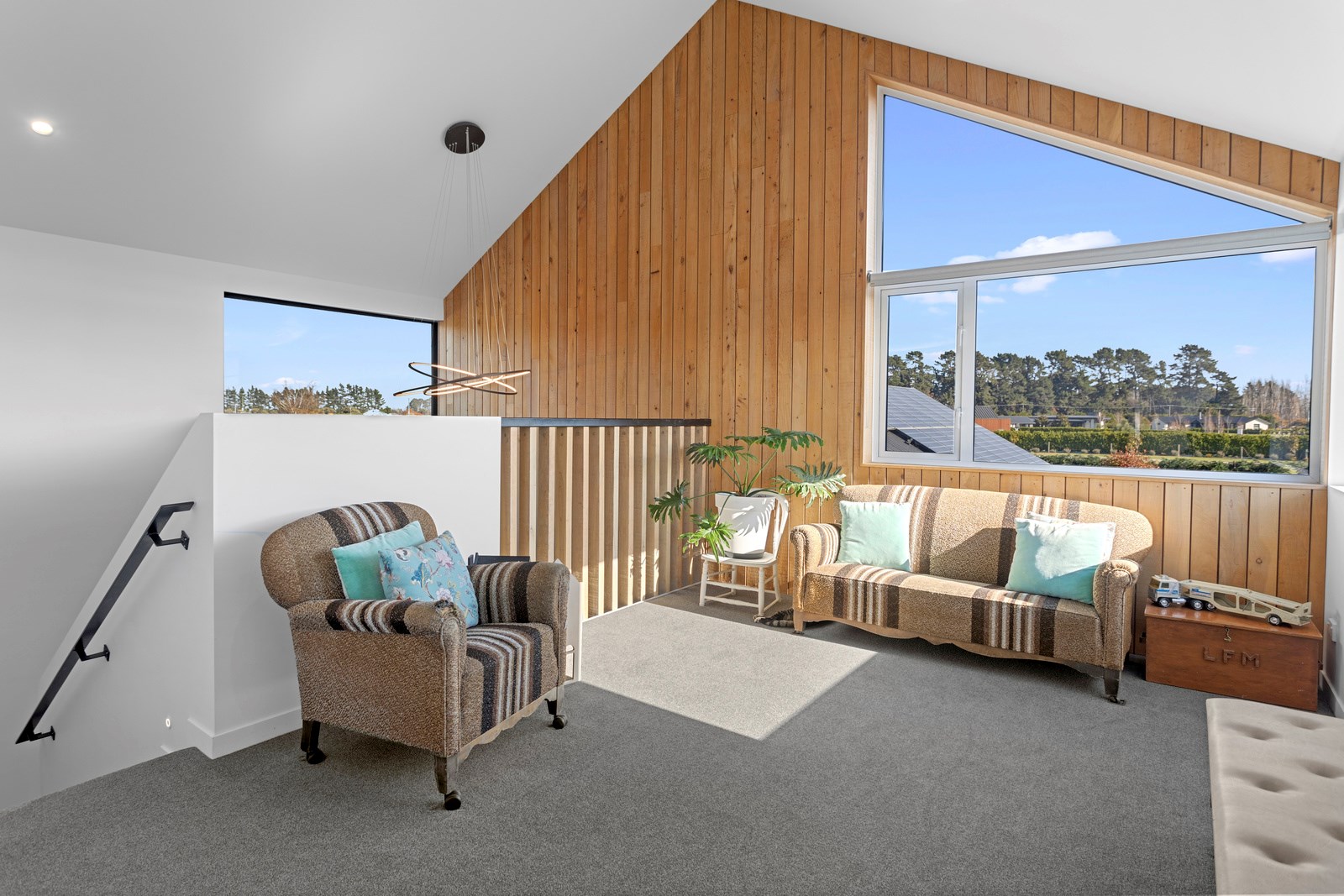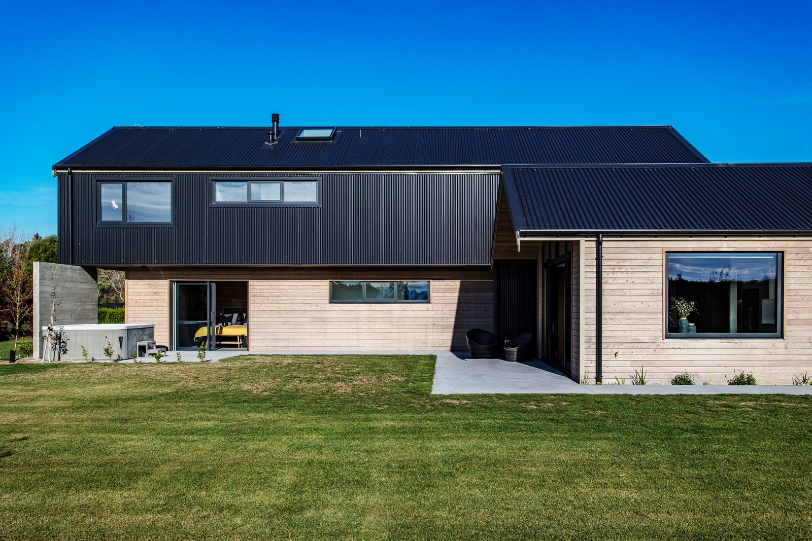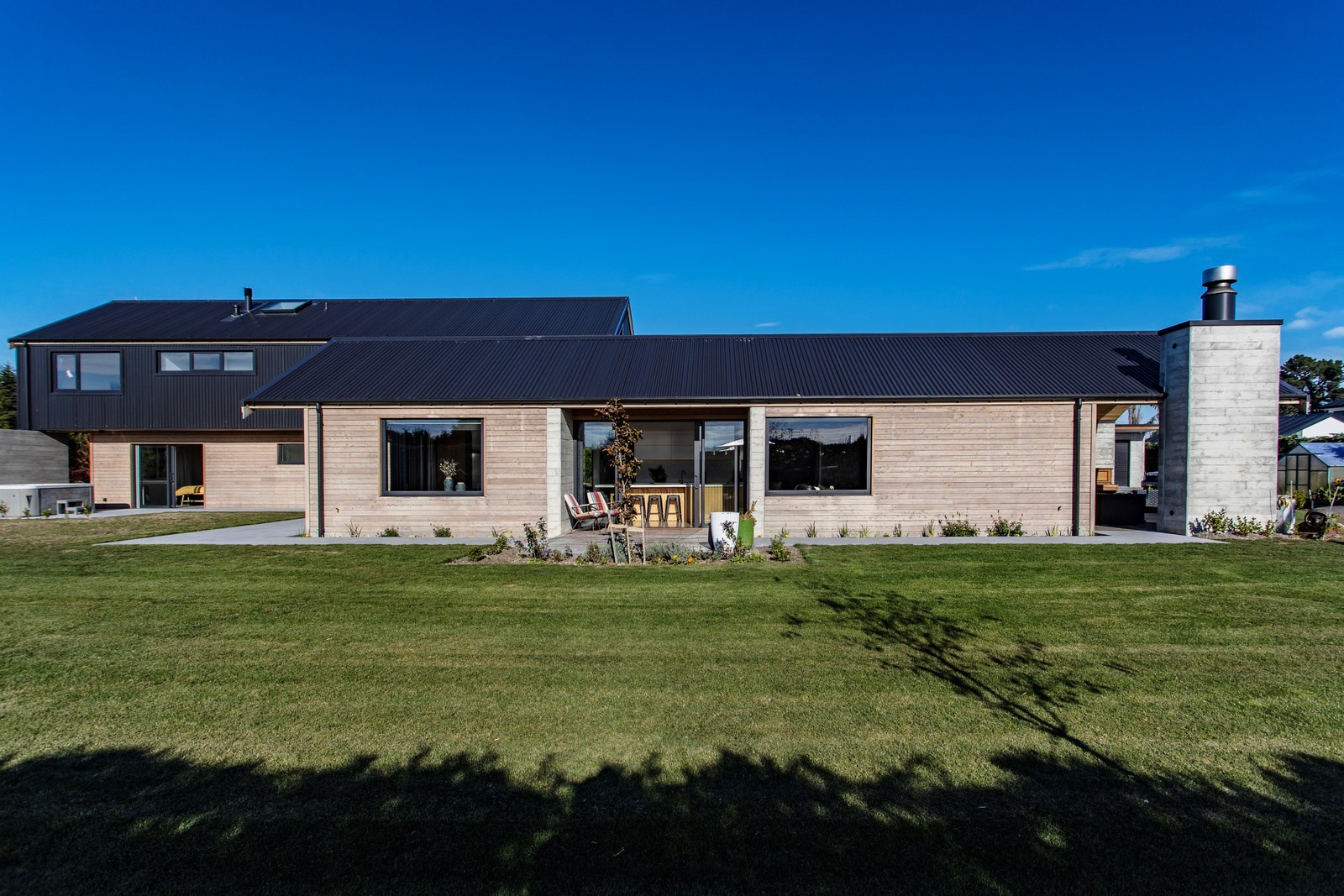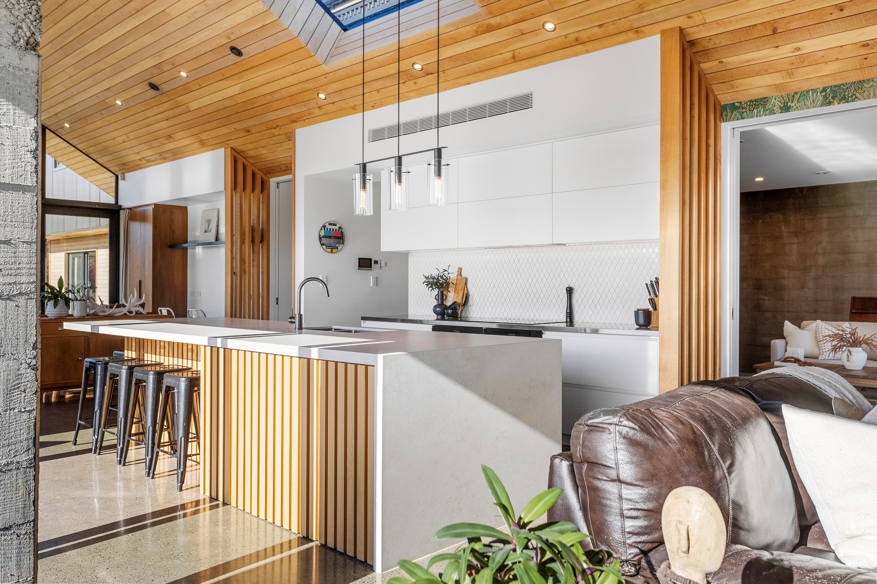 The macrocarpa is used in cladding, the entry with ‘hidden’ doors, a dramatic stairwell and the mezzanine landing. Sustainable living was achieved by investing in passive concepts. The house is wrapped in an airtight envelope using the Pro Clima Intello system; mechanical ventilation was required to enable it to breathe. The Stiebel ‘lungs’ of the house filter and circulate the air, while ducted heat pumps keep it cool. Underfloor heat pump hydronic heating regulates the ground floor slab and a log burner adds to the home’s earthy ambience. Solar panels power the electrics and rainwater is collected in underground tanks. The result is an earthy, grounded home that feels very easy and comfortable to be in.
