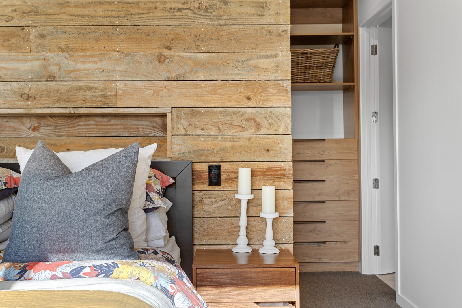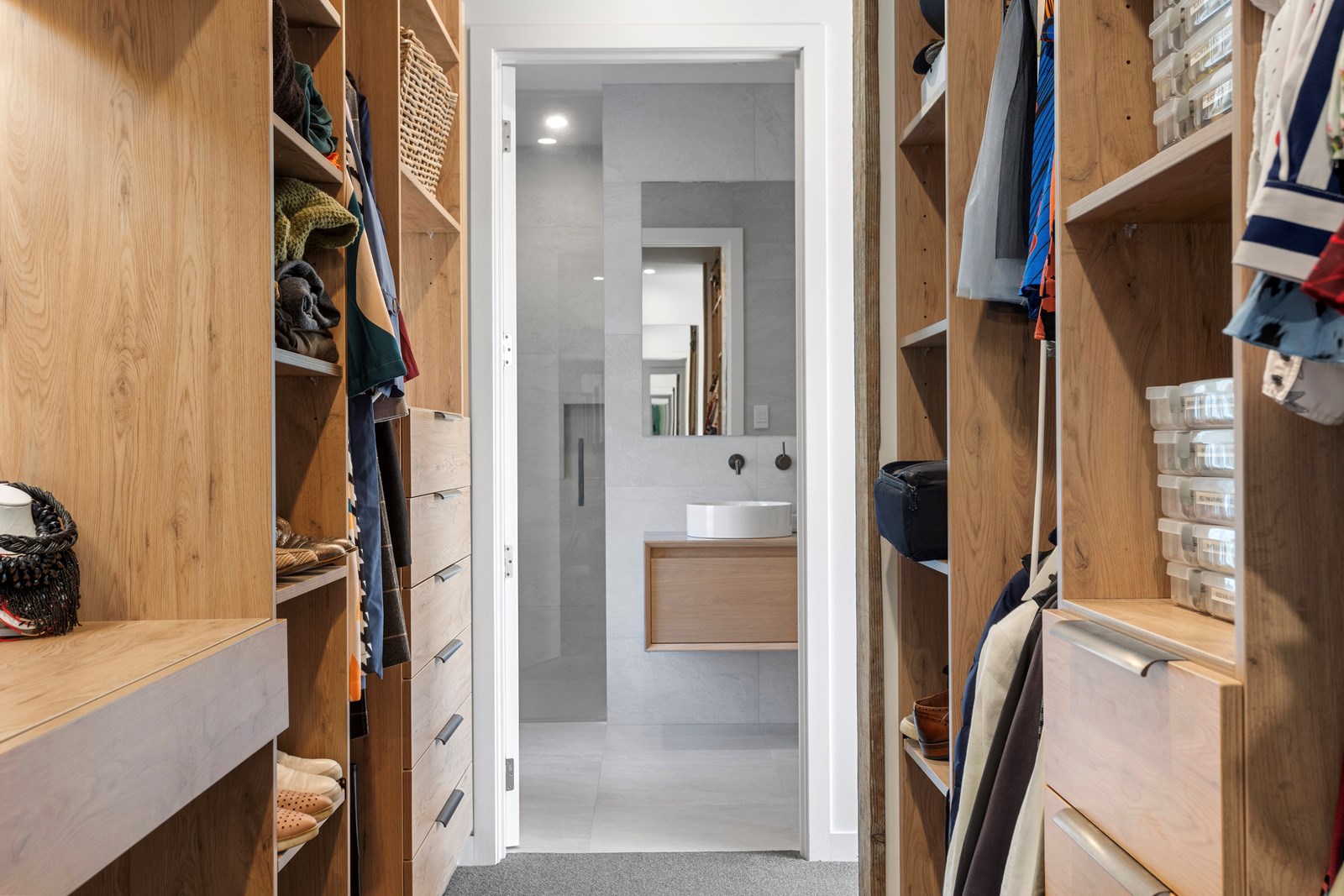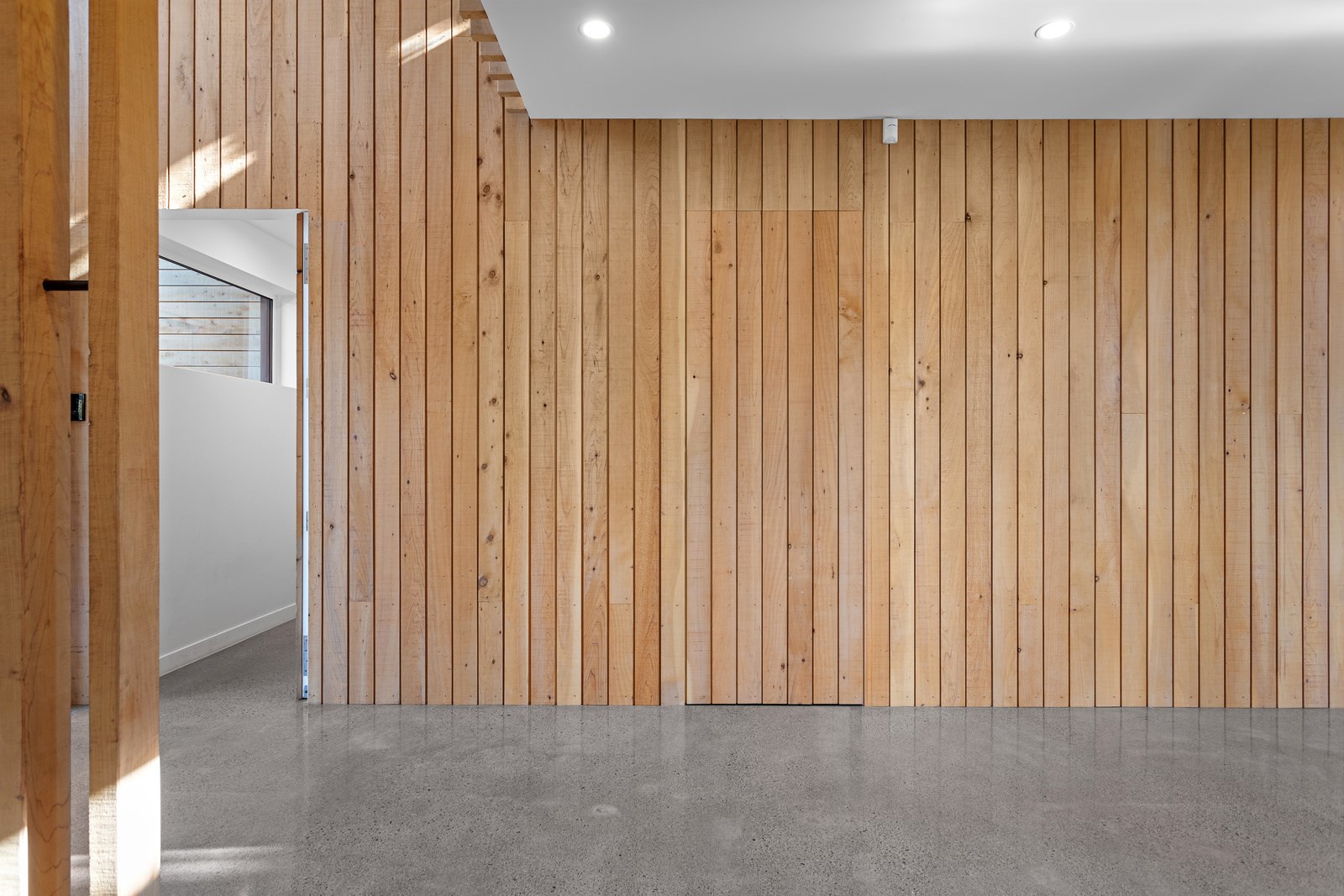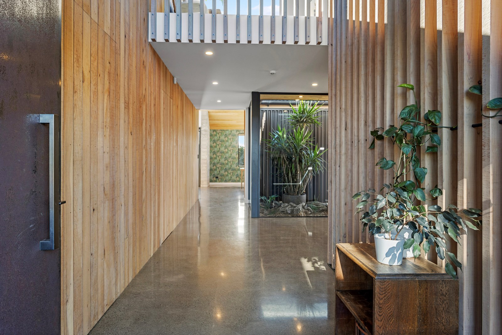 The macrocarpa is used in cladding, the entry with ‘hidden’ doors, a dramatic stairwell and the mezzanine landing. Sustainable living was achieved by investing in passive concepts. The house is wrapped in an airtight envelope using the Pro Clima Intello system; mechanical ventilation was required to enable it to breathe. The Stiebel ‘lungs’ of the house filter and circulate the air, while ducted heat pumps keep it cool. Underfloor heat pump hydronic heating regulates the ground floor slab and a log burner adds to the home’s earthy ambience. Solar panels power the electrics and rainwater is collected in underground tanks. The result is an earthy, grounded home that feels very easy and comfortable to be in.