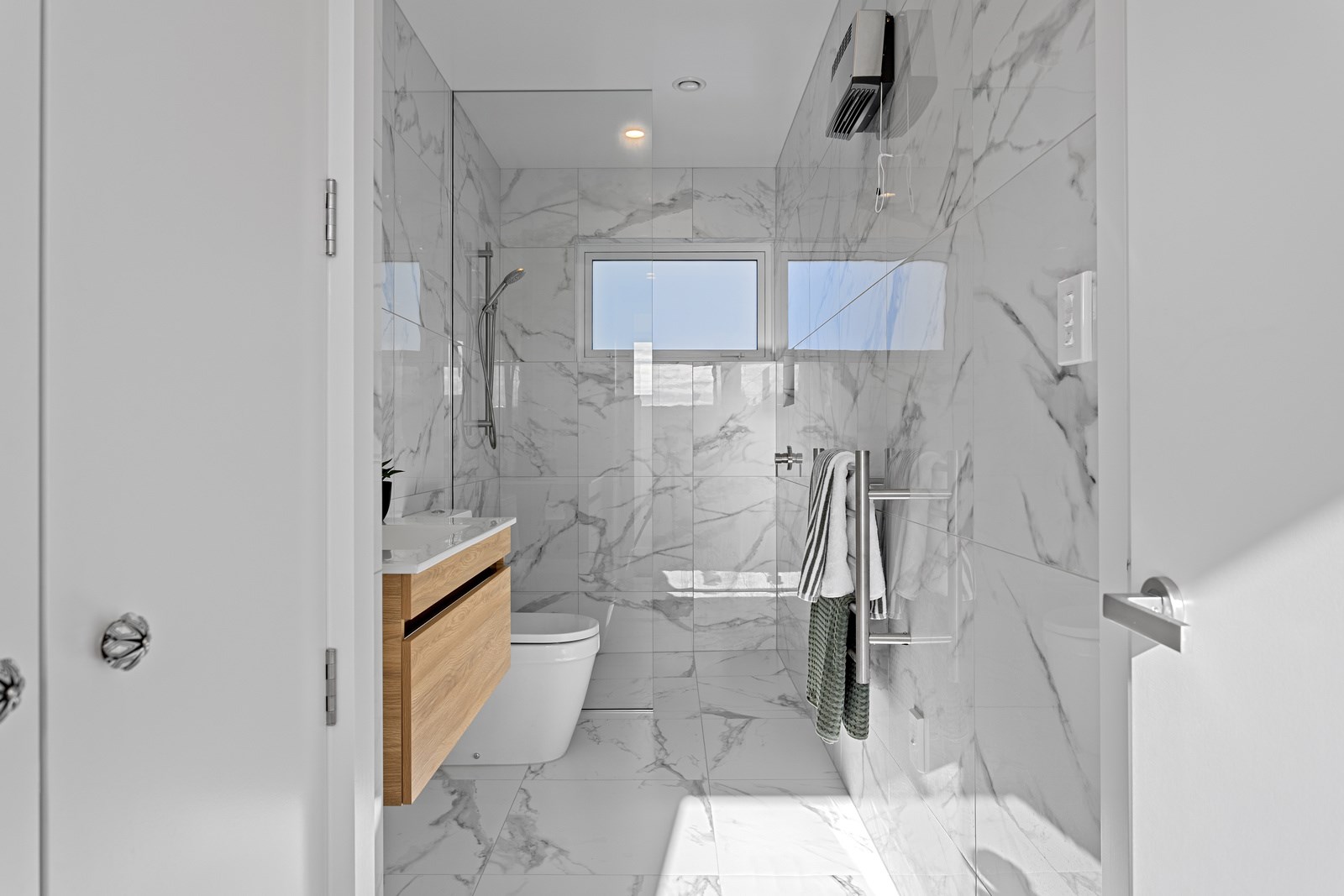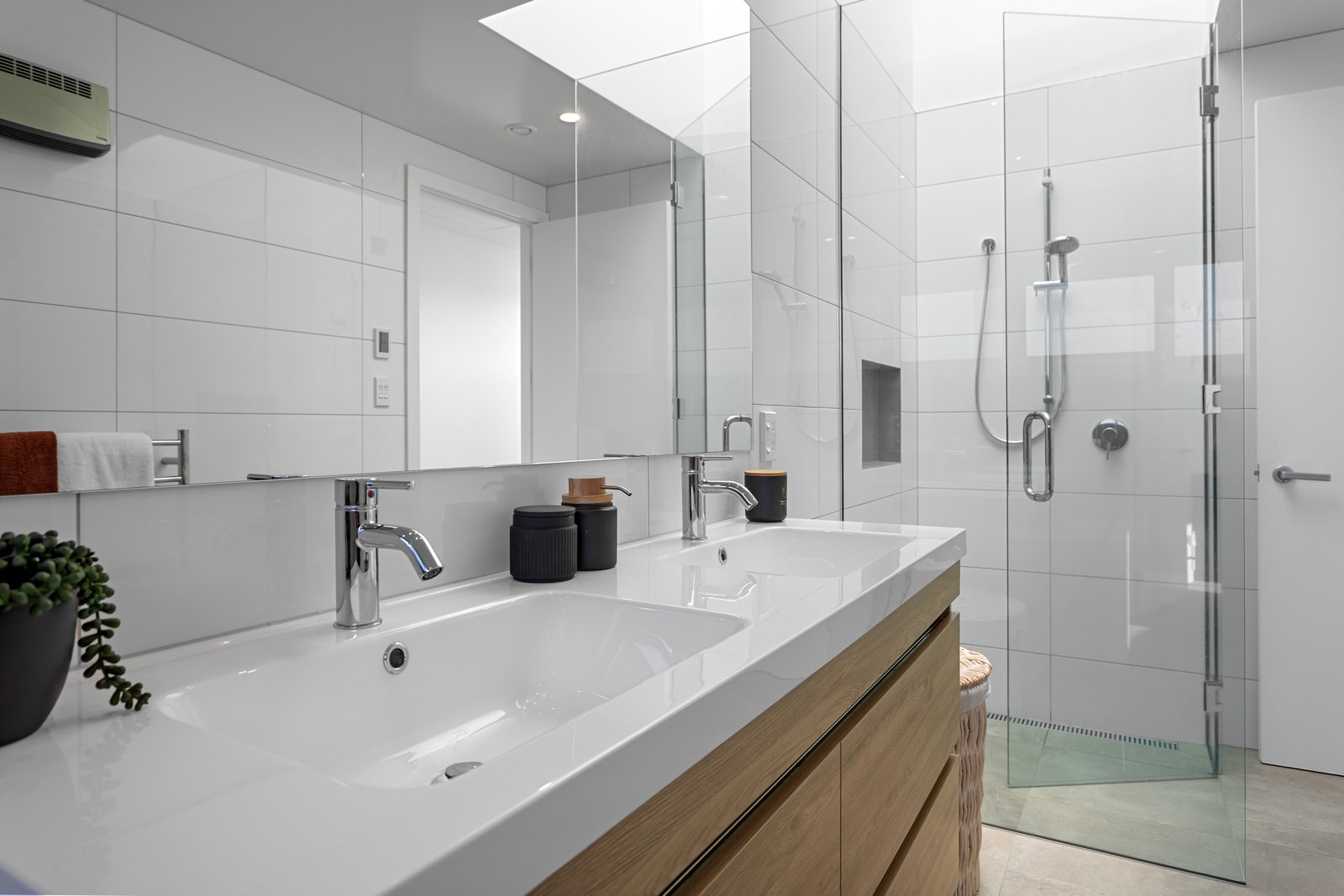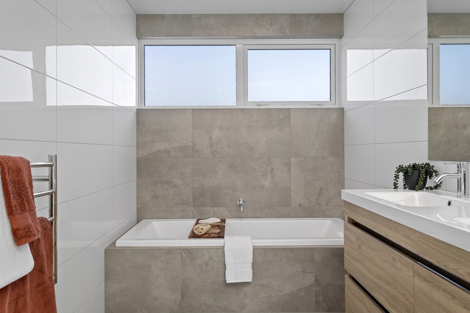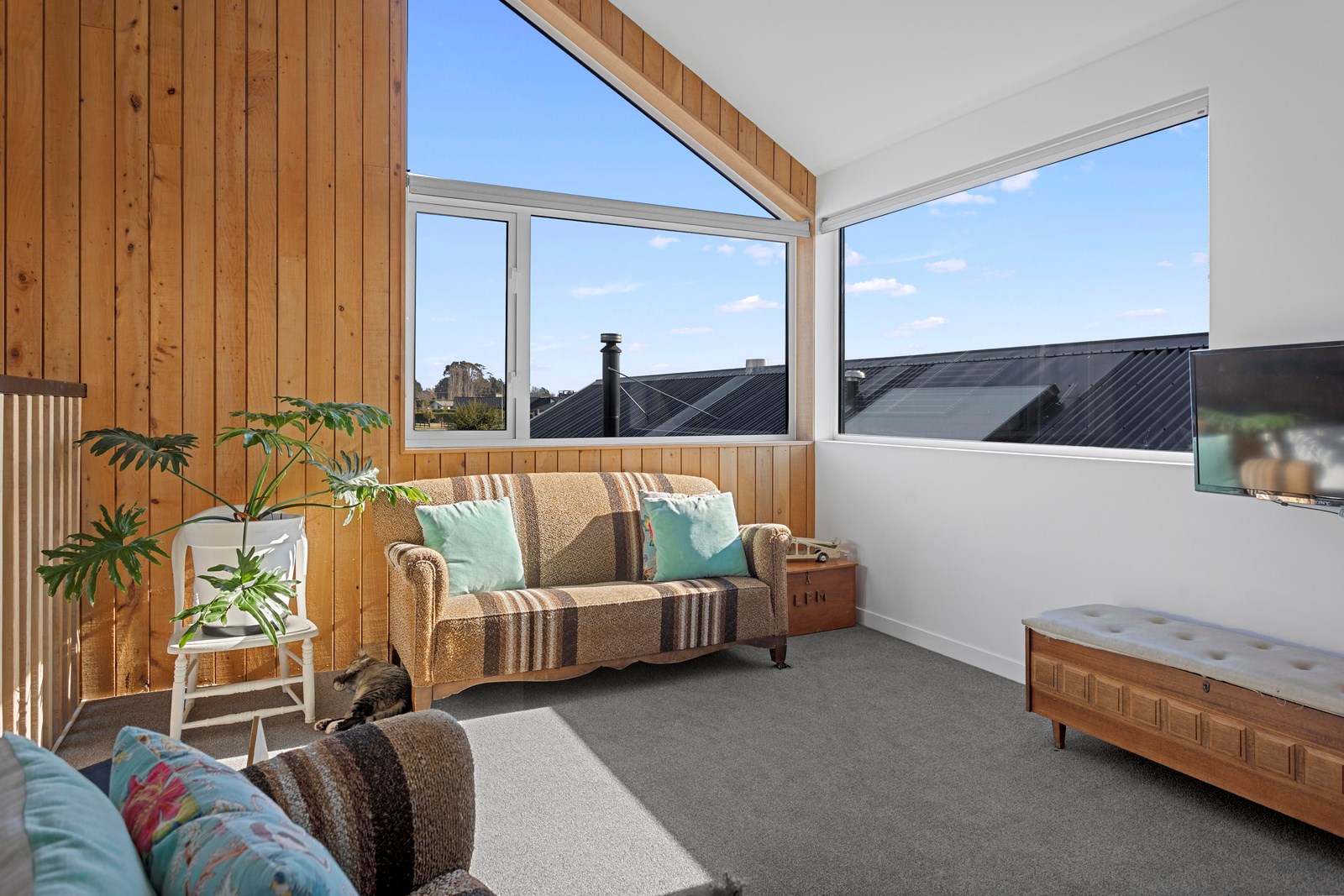 The macrocarpa is used in cladding, the entry with ‘hidden’ doors, a dramatic stairwell and the mezzanine landing. Sustainable living was achieved by investing in passive concepts. The house is wrapped in an airtight envelope using the Pro Clima Intello system; mechanical ventilation was required to enable it to breathe. The Stiebel ‘lungs’ of the house filter and circulate the air, while ducted heat pumps keep it cool. Underfloor heat pump hydronic heating regulates the ground floor slab and a log burner adds to the home’s earthy ambience. Solar panels power the electrics and rainwater is collected in underground tanks. The result is an earthy, grounded home that feels very easy and comfortable to be in.