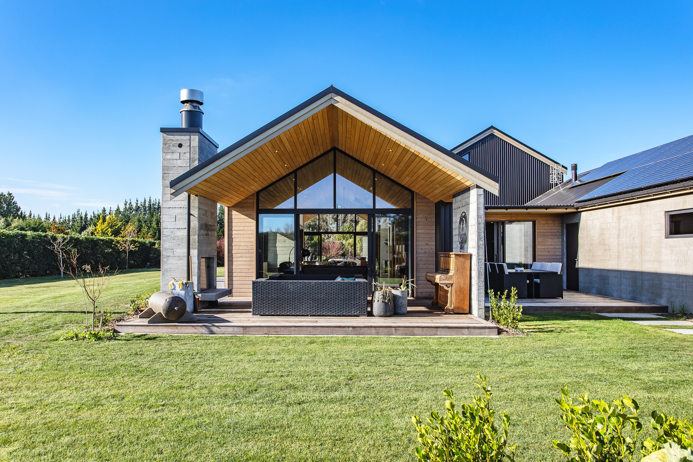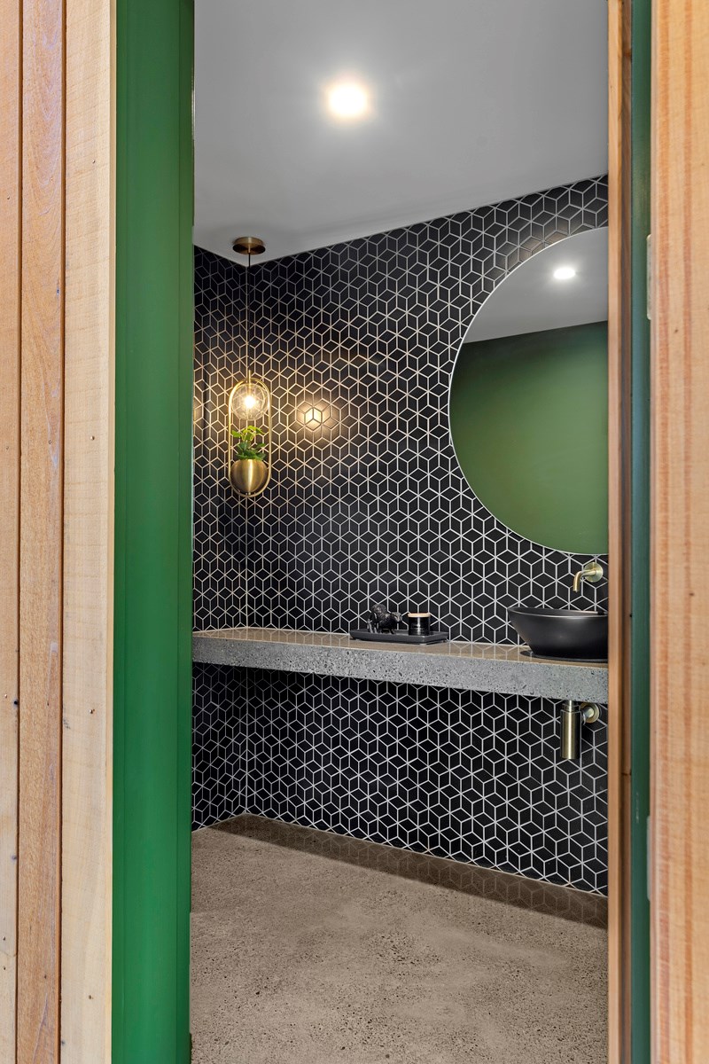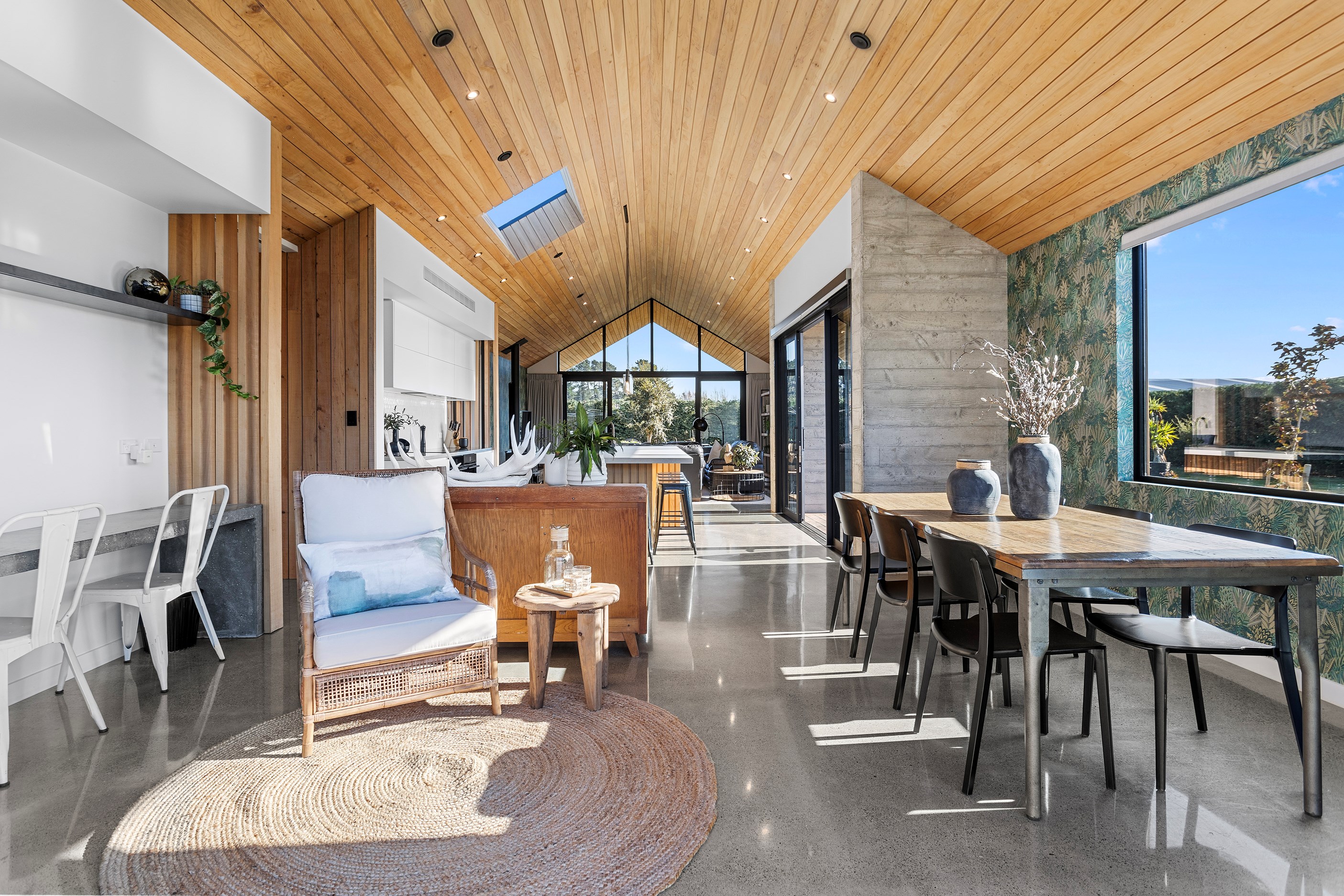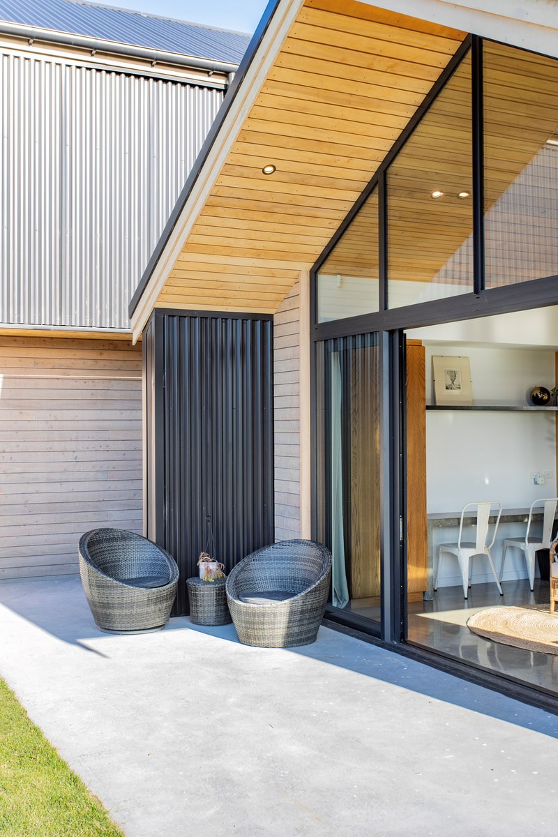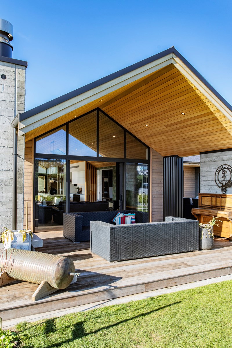It would be very hard not to alight anywhere in the open-plan living spaces of this Christchurch home and gaze out through the timber framing to the trees beyond. Petrie Architects designed the floorplan to sit lightly on the land; Angus Chisholm Builders brought their soulful vision to life. The idea was to utilise New Zealand materials such as macrocarpa, along with concrete, the latter used on floors as well as both precast and in situ thermal walls. The concrete theme has even been continued in the study and powder room, both of which have polished-concrete benchtops.