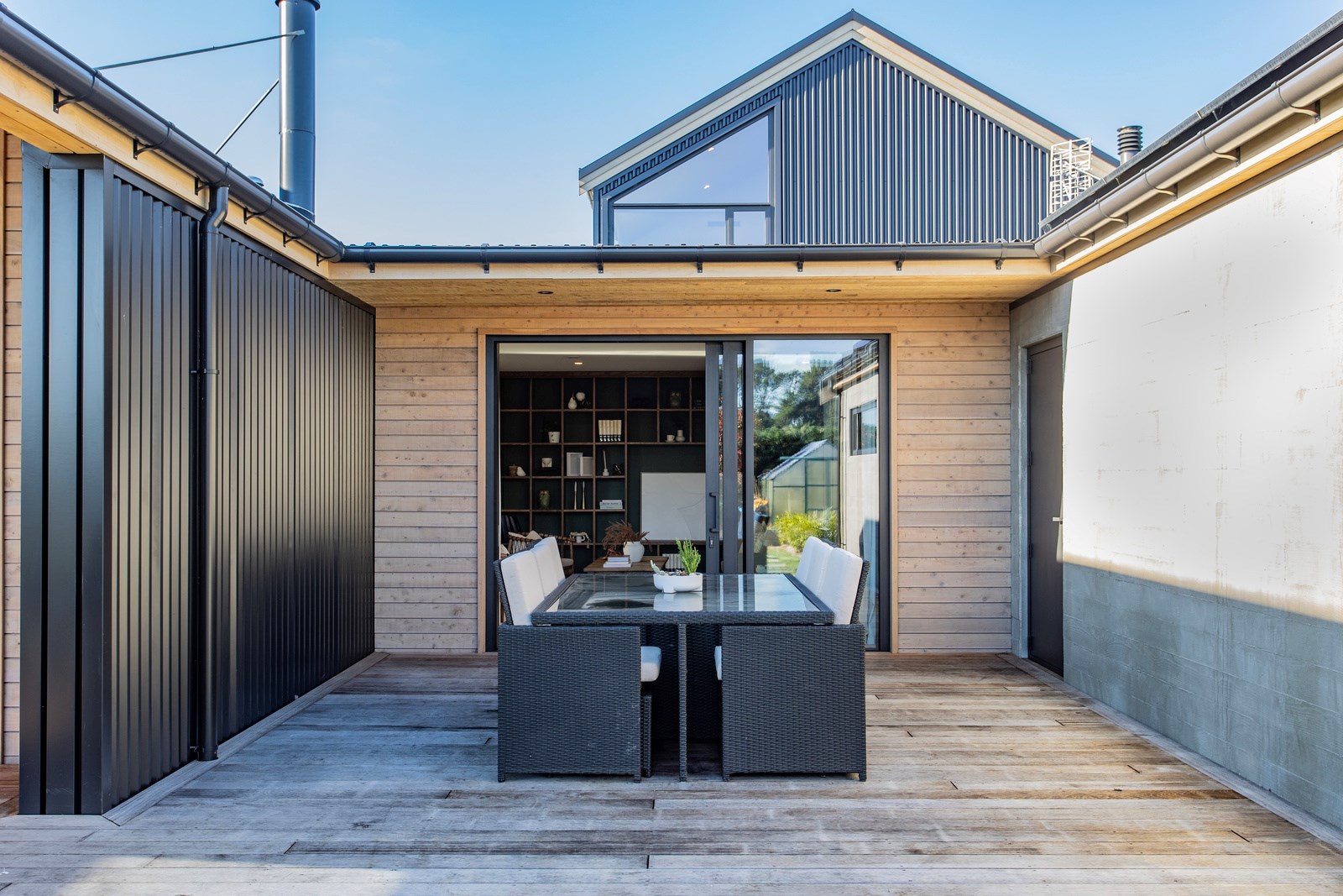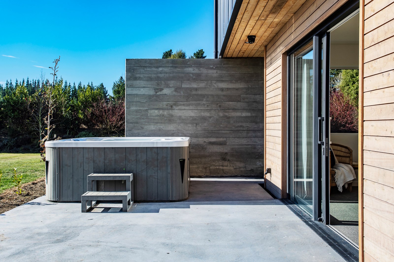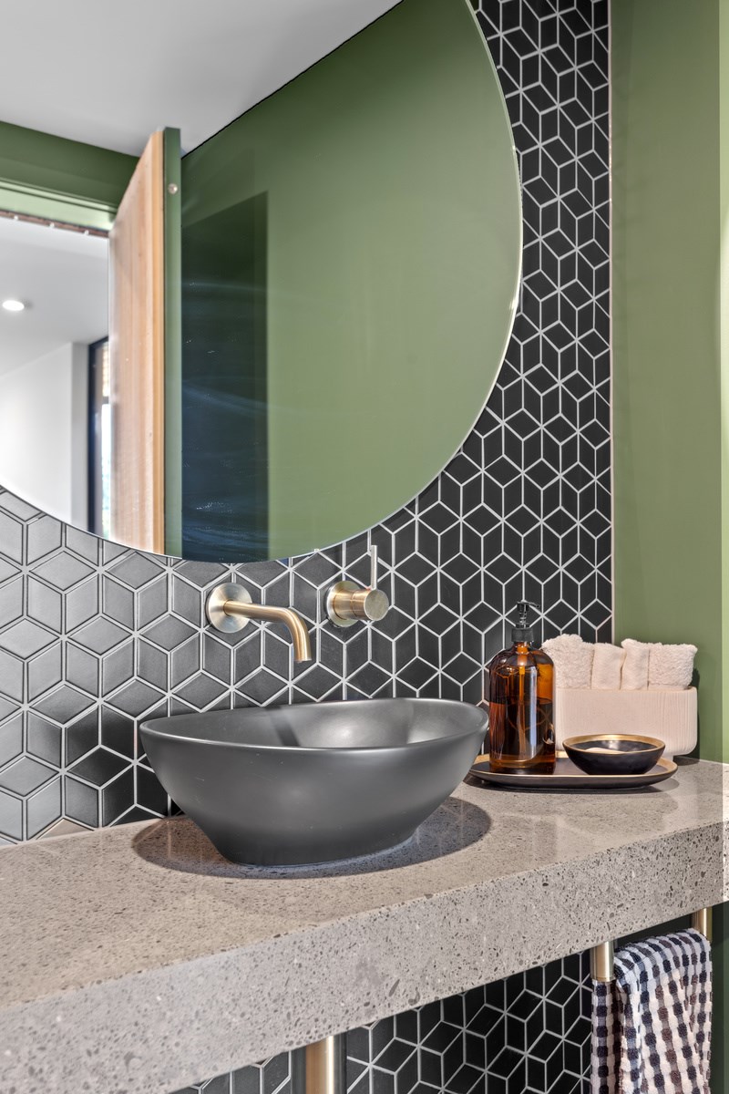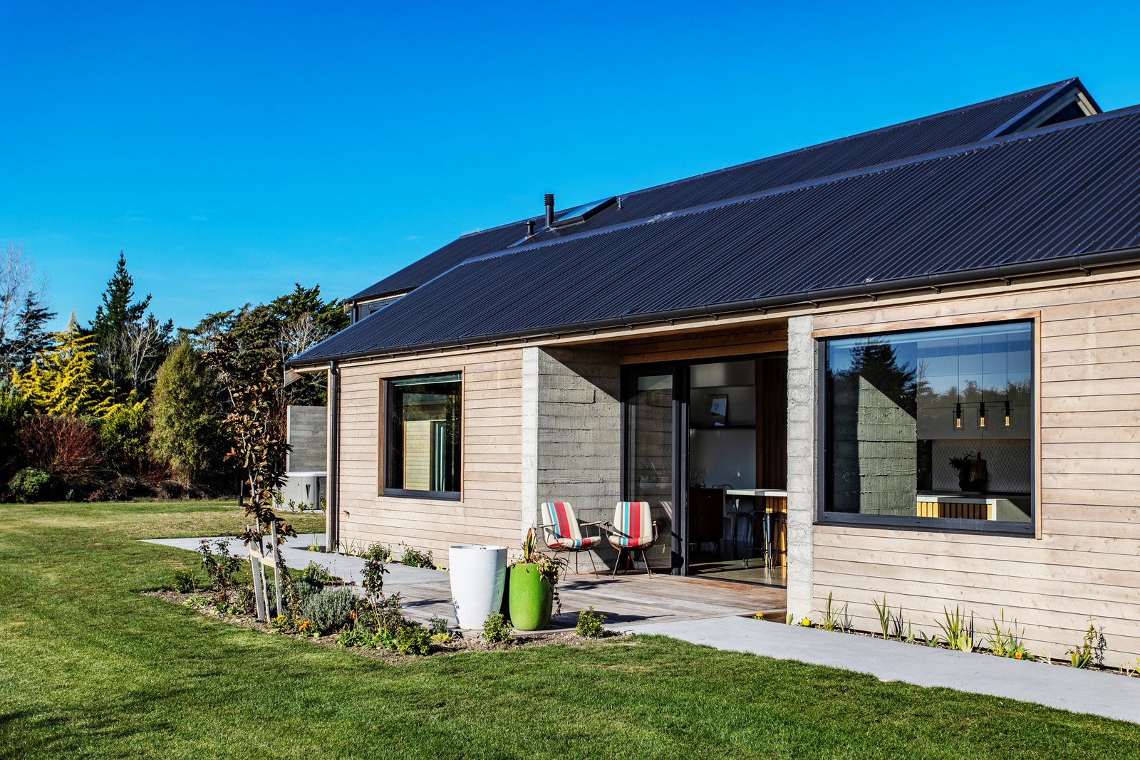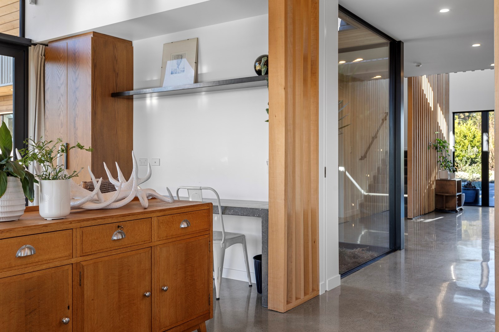 It would be very hard not to alight anywhere in the open-plan living spaces of this Christchurch home and gaze out through the timber framing to the trees beyond. Petrie Architects designed the floorplan to sit lightly on the land; Angus Chisholm Builders brought their soulful vision to life. The idea was to utilise New Zealand materials such as macrocarpa, along with concrete, the latter used on floors as well as both precast and in situ thermal walls. The concrete theme has even been continued in the study and powder room, both of which have polished-concrete benchtops.