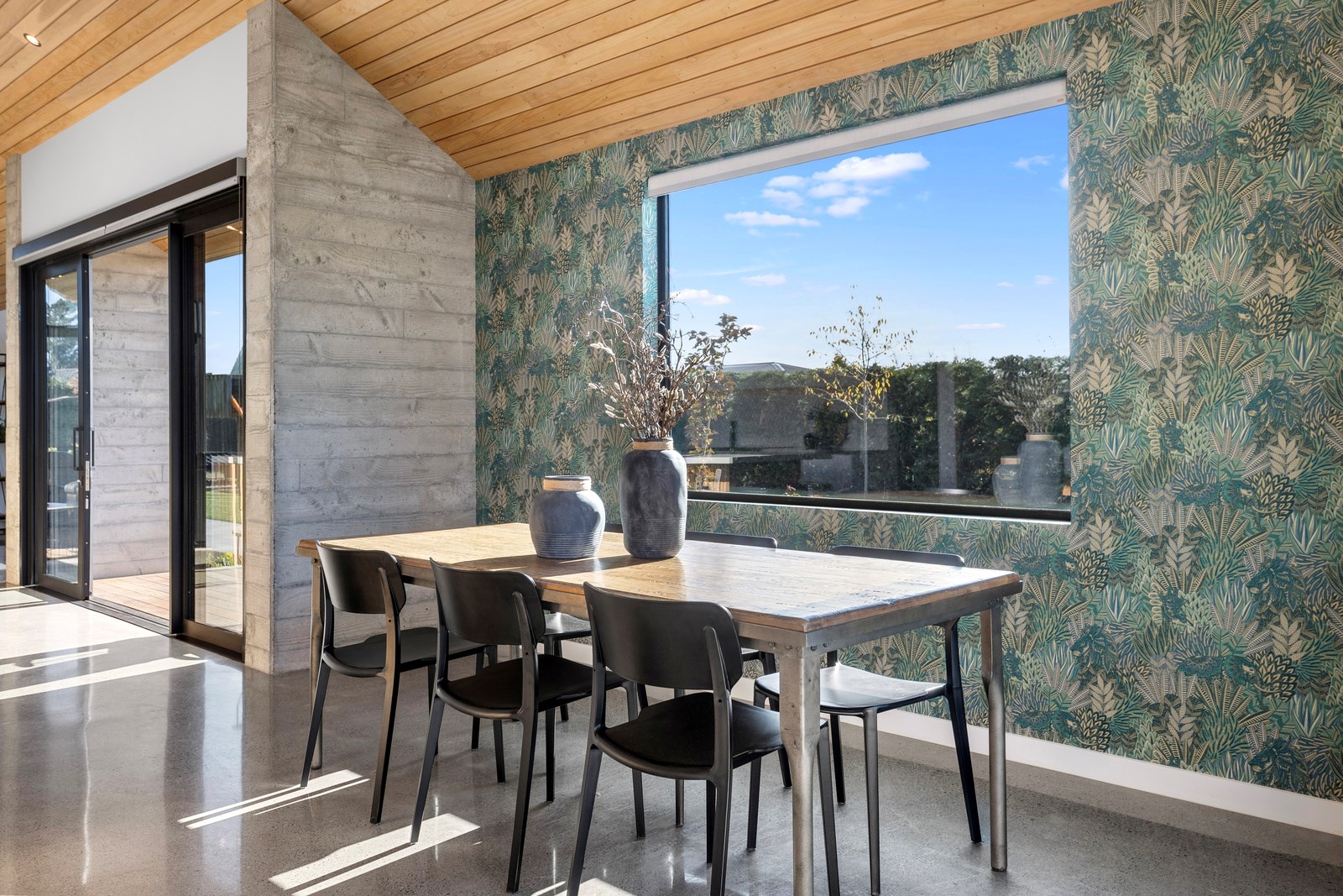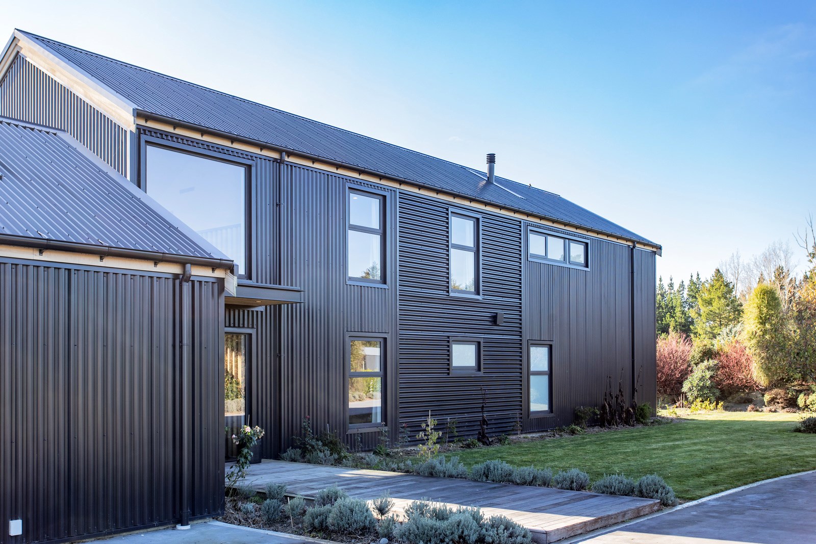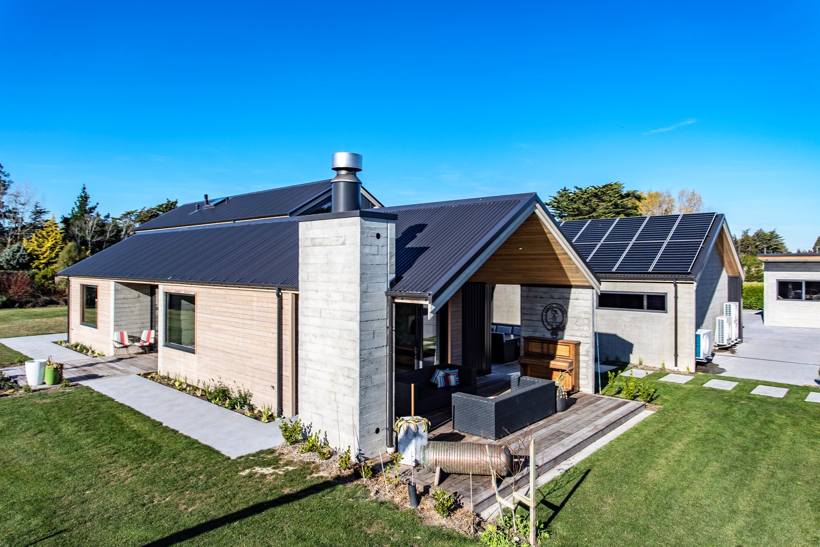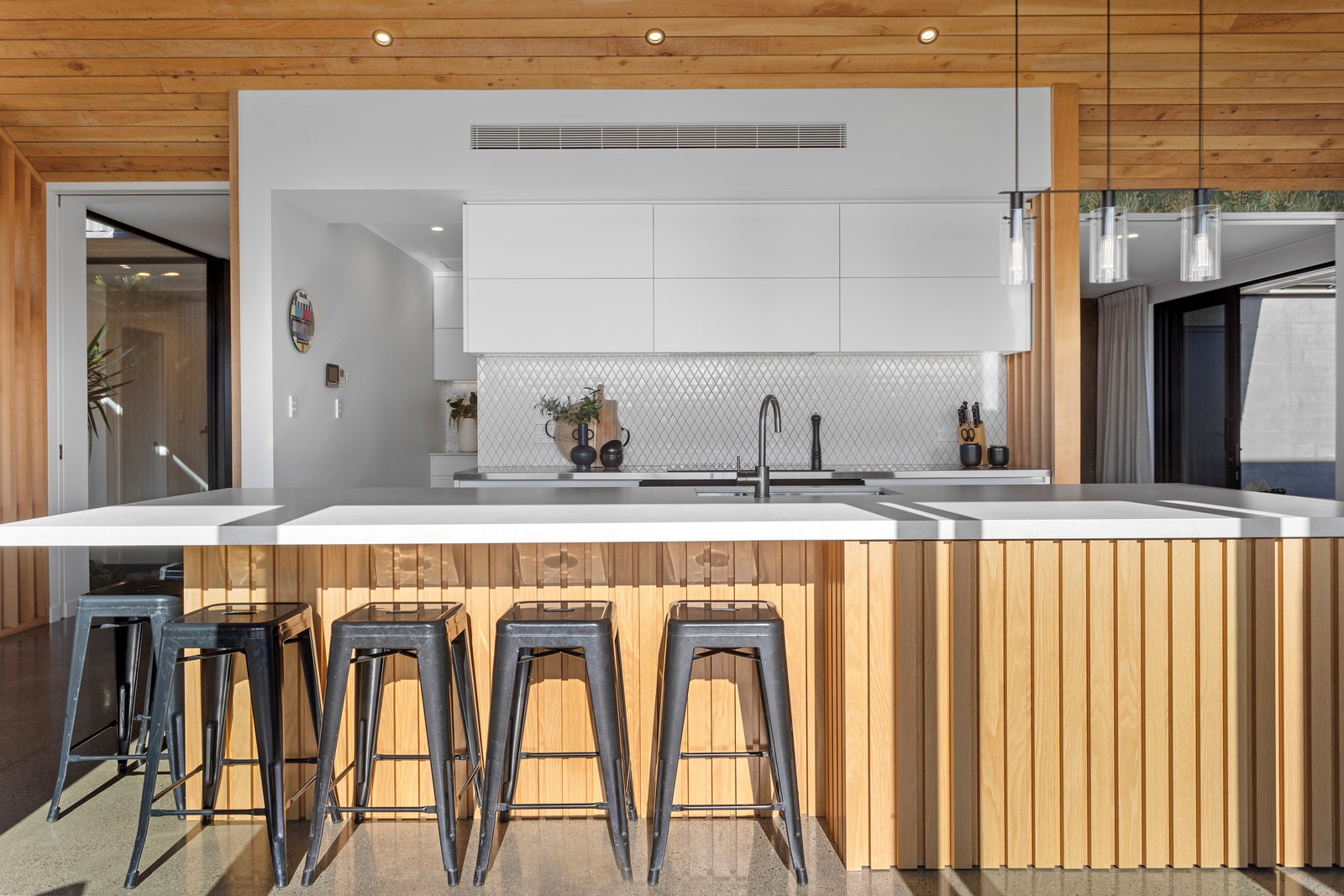 It would be very hard not to alight anywhere in the open-plan living spaces of this Christchurch home and gaze out through the timber framing to the trees beyond. Petrie Architects designed the floorplan to sit lightly on the land; Angus Chisholm Builders brought their soulful vision to life. The idea was to utilise New Zealand materials such as macrocarpa, along with concrete, the latter used on floors as well as both precast and in situ thermal walls. The concrete theme has even been continued in the study and powder room, both of which have polished-concrete benchtops.