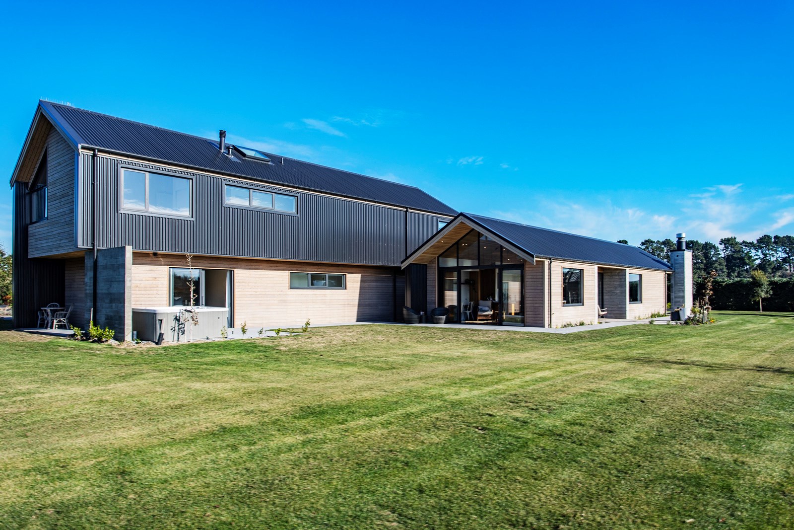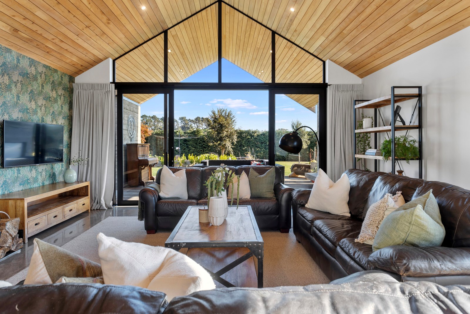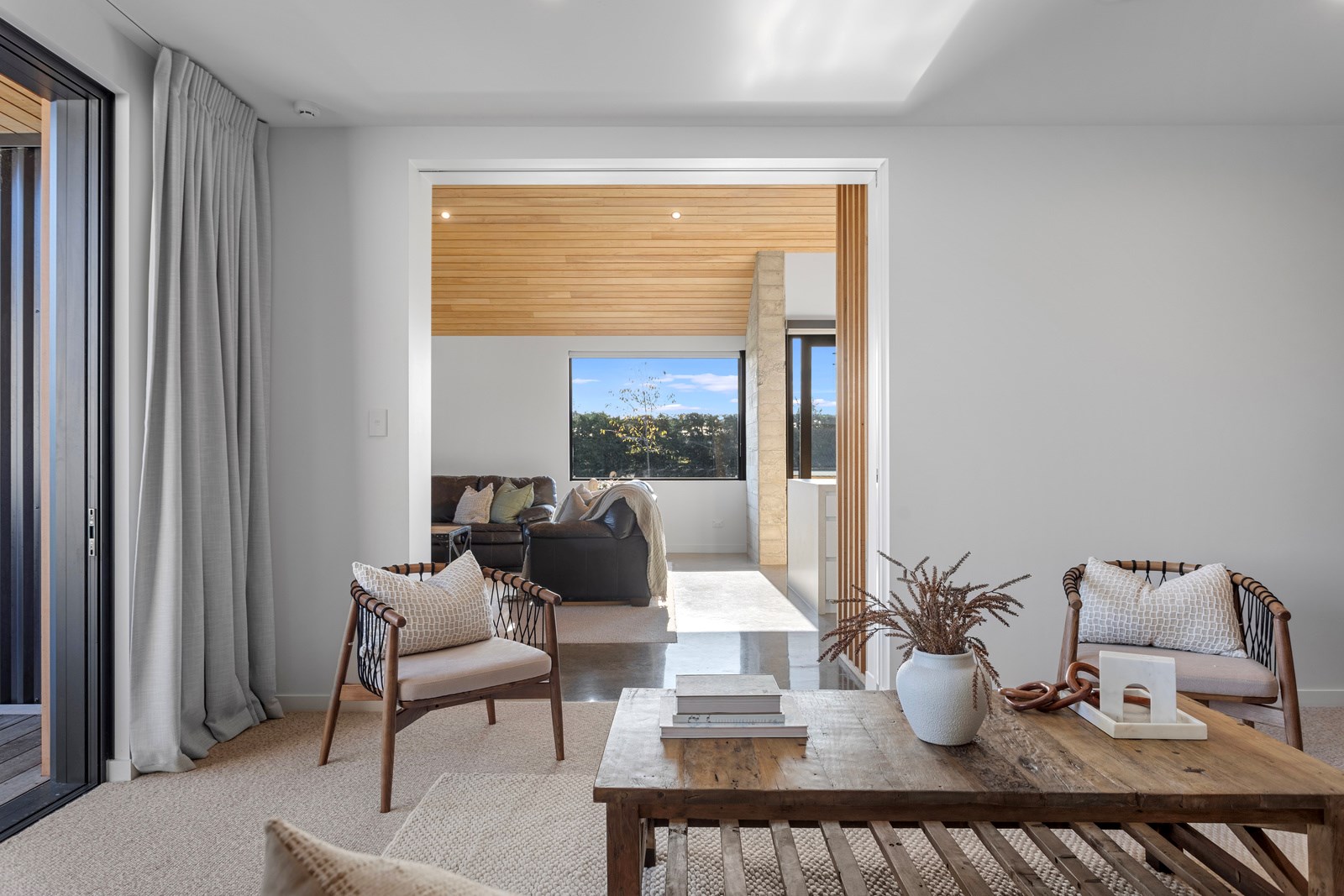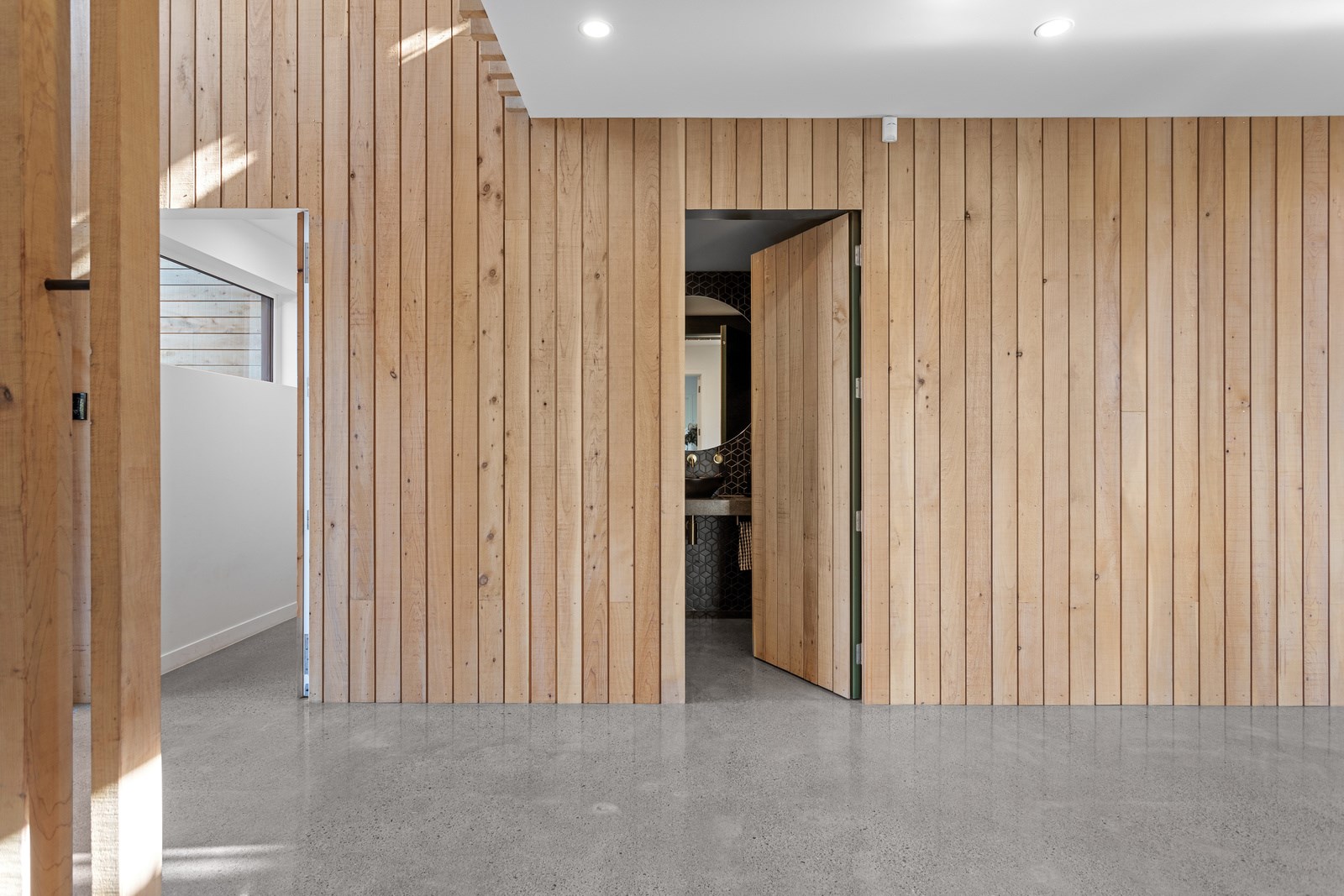 It would be very hard not to alight anywhere in the open-plan living spaces of this Christchurch home and gaze out through the timber framing to the trees beyond. Petrie Architects designed the floorplan to sit lightly on the land; Angus Chisholm Builders brought their soulful vision to life. The idea was to utilise New Zealand materials such as macrocarpa, along with concrete, the latter used on floors as well as both precast and in situ thermal walls. The concrete theme has even been continued in the study and powder room, both of which have polished-concrete benchtops.