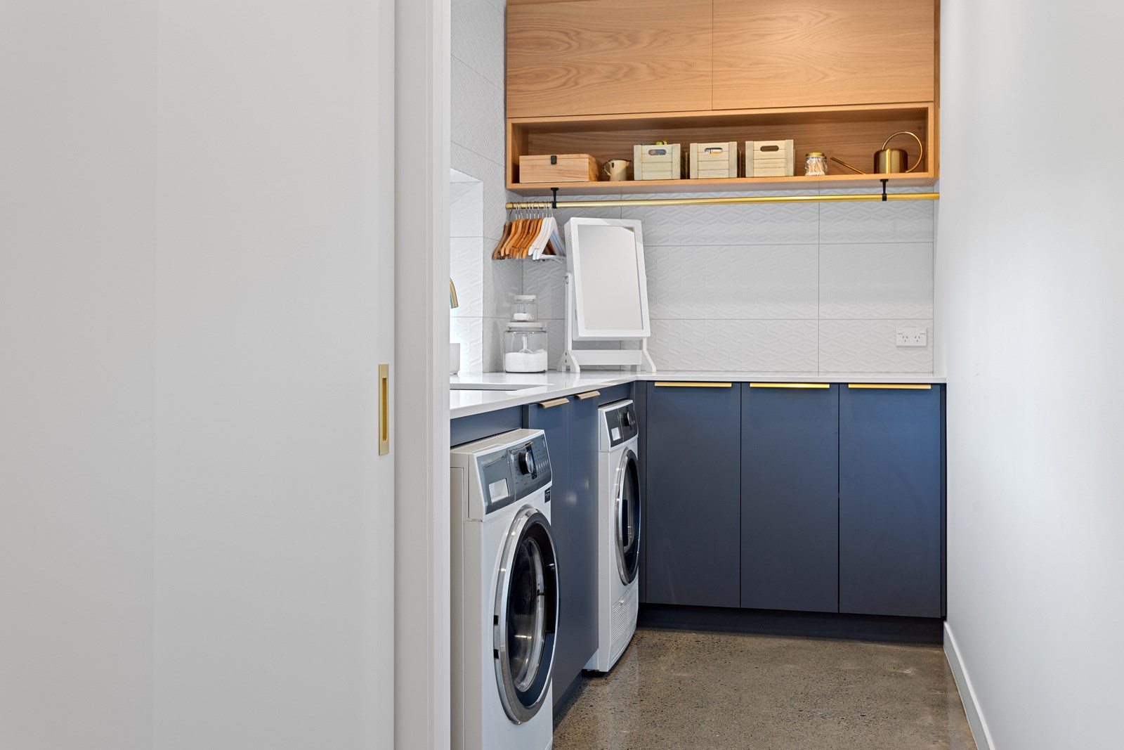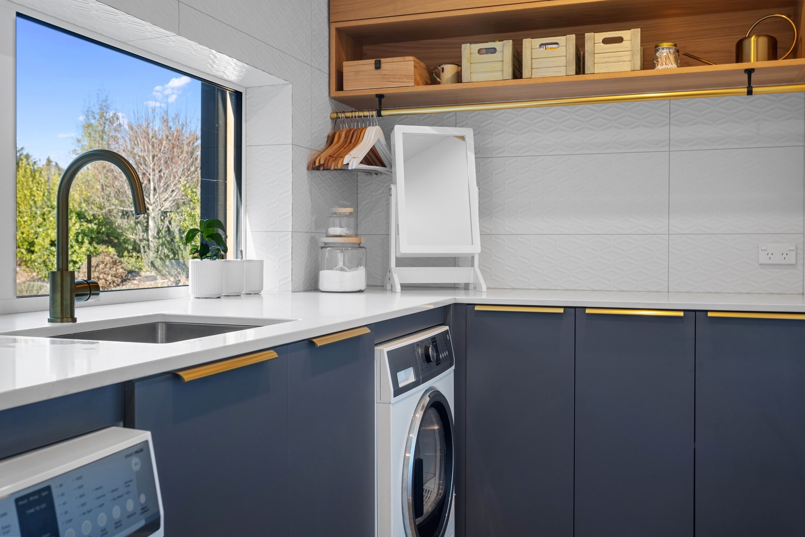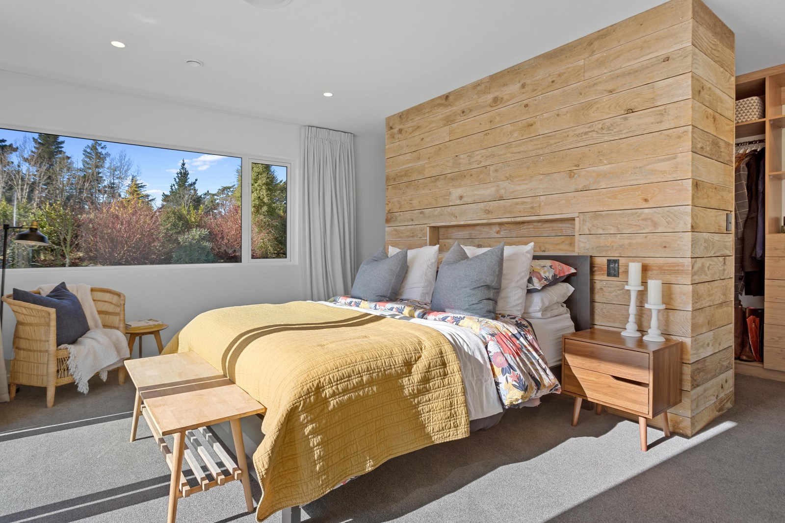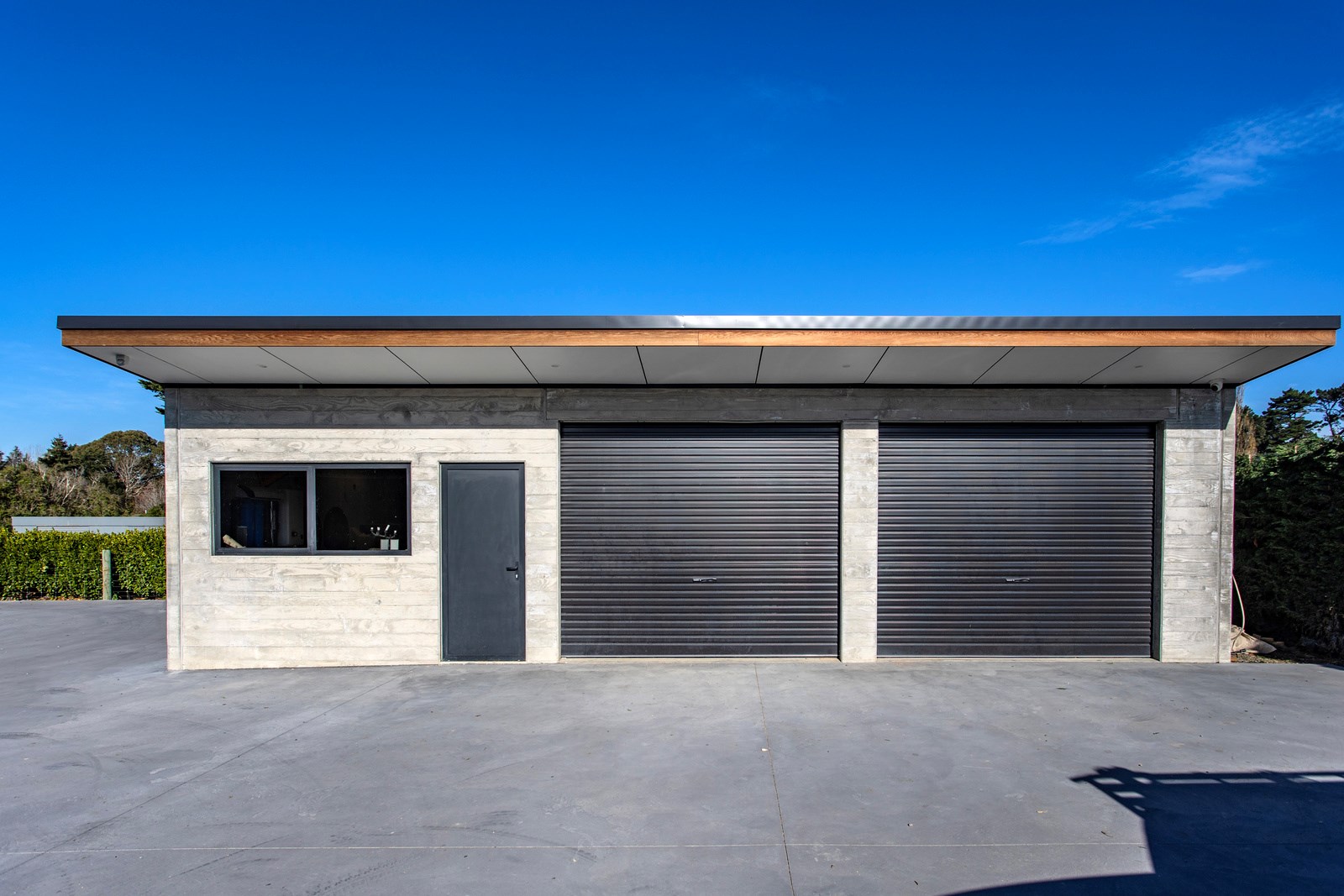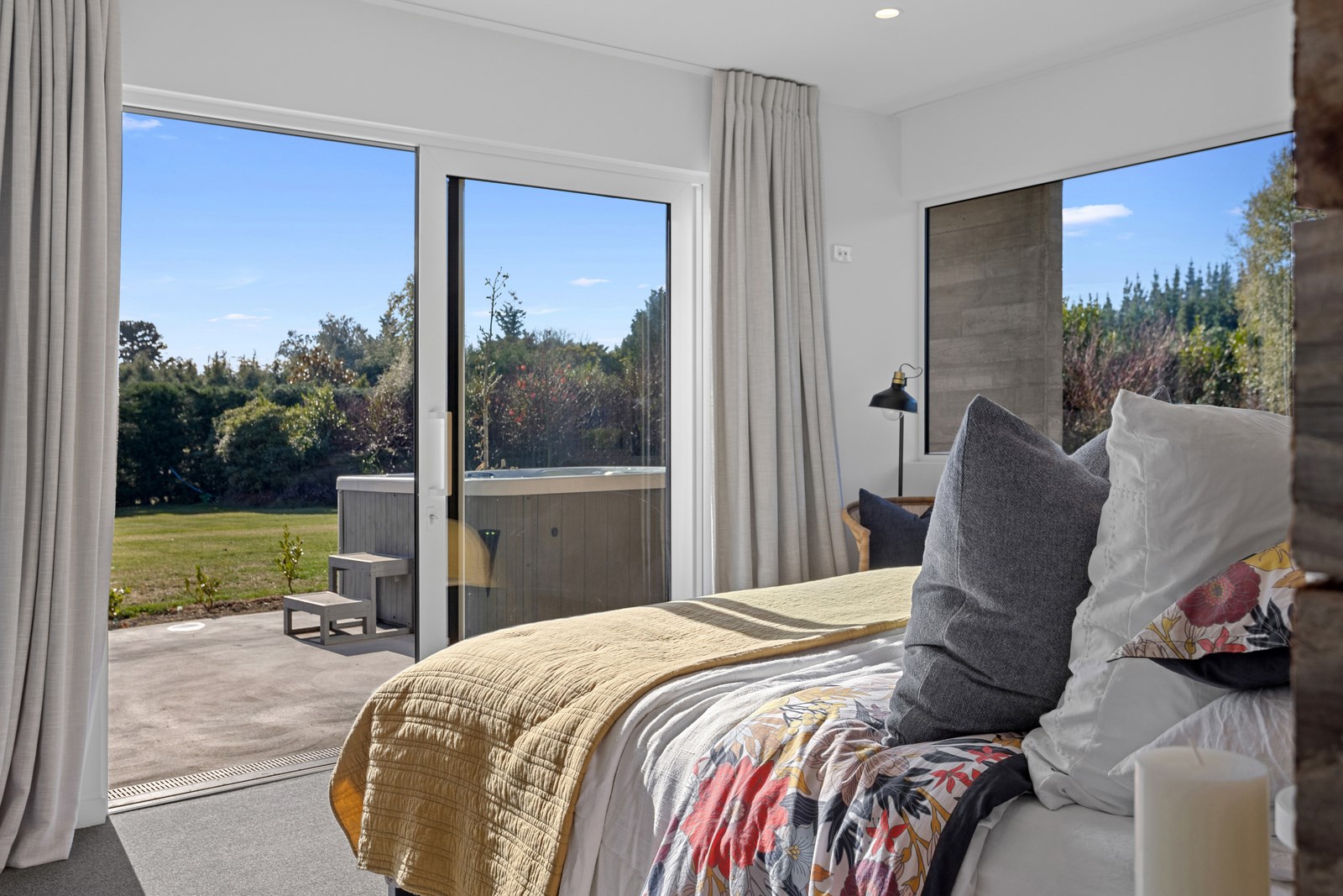 It would be very hard not to alight anywhere in the open-plan living spaces of this Christchurch home and gaze out through the timber framing to the trees beyond. Petrie Architects designed the floorplan to sit lightly on the land; Angus Chisholm Builders brought their soulful vision to life. The idea was to utilise New Zealand materials such as macrocarpa, along with concrete, the latter used on floors as well as both precast and in situ thermal walls. The concrete theme has even been continued in the study and powder room, both of which have polished-concrete benchtops.