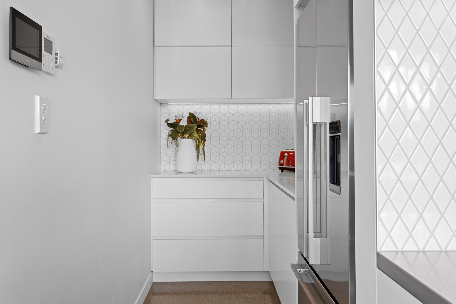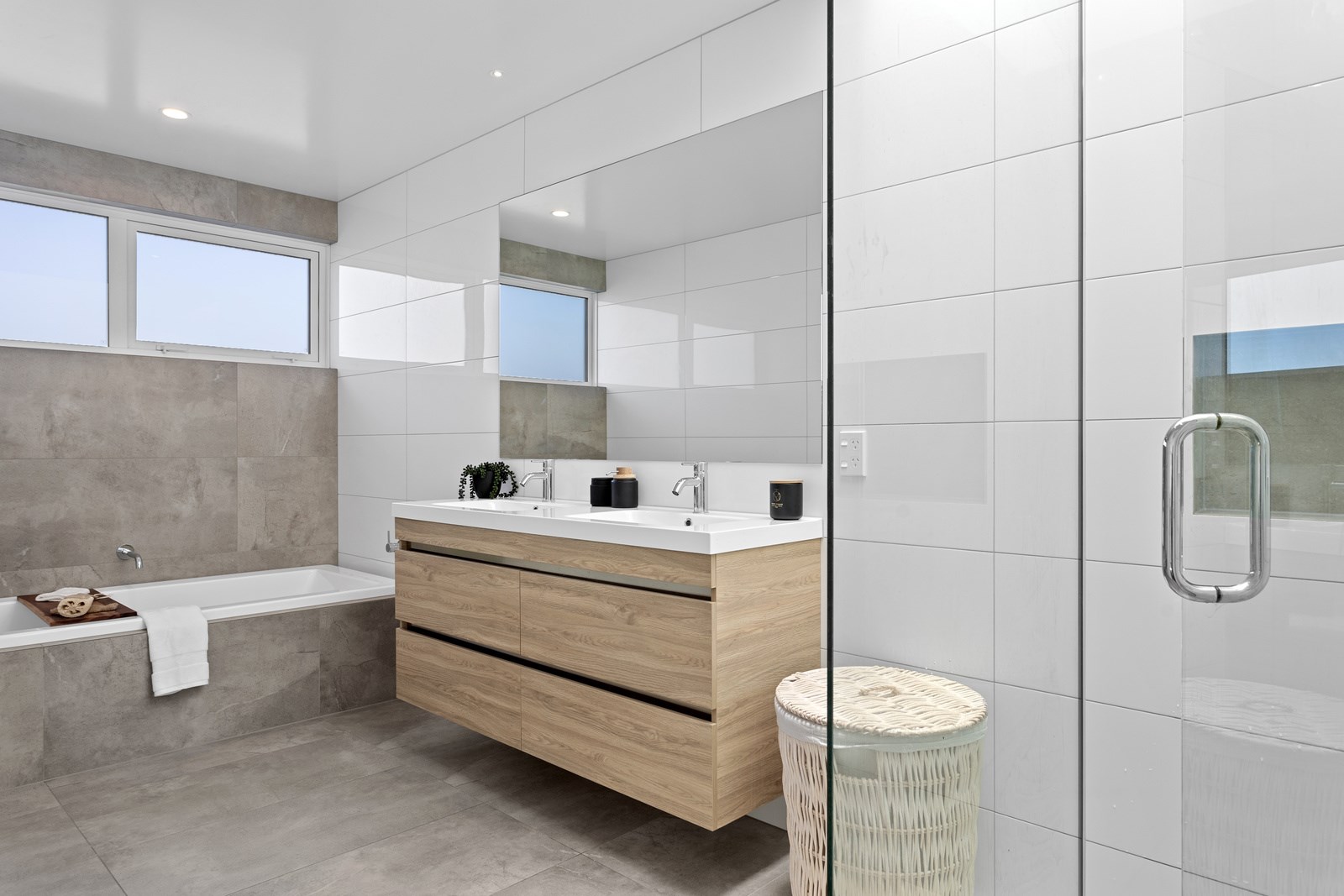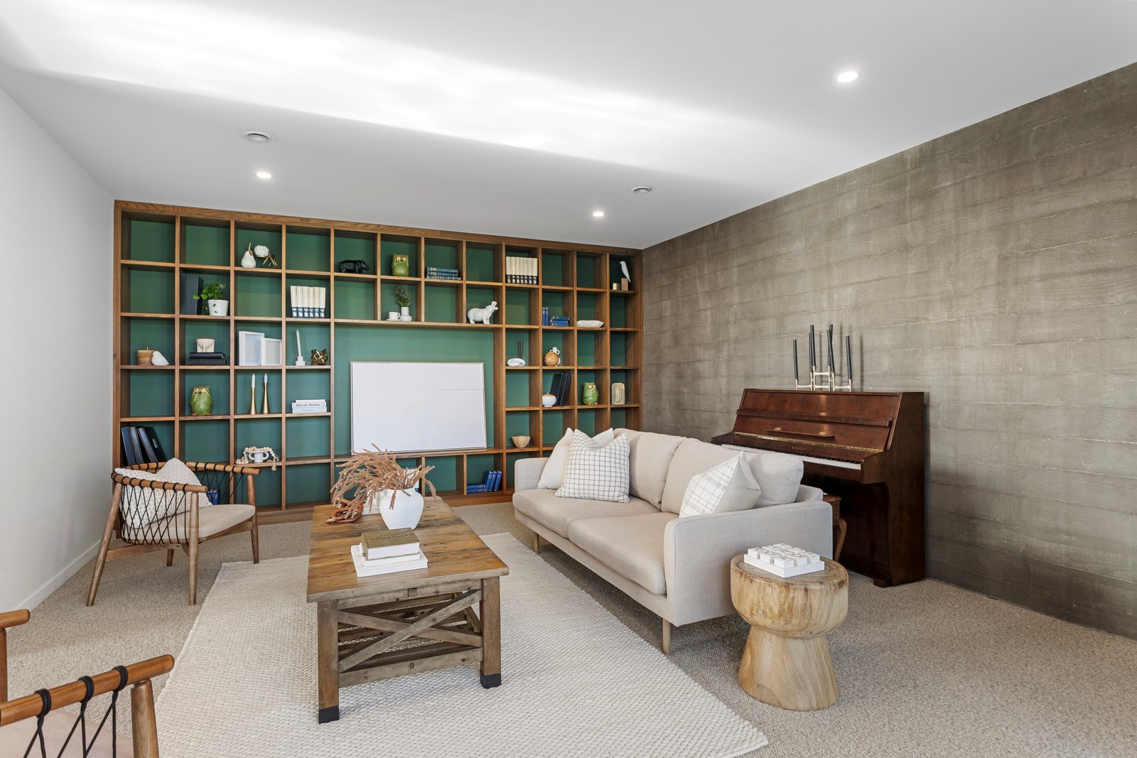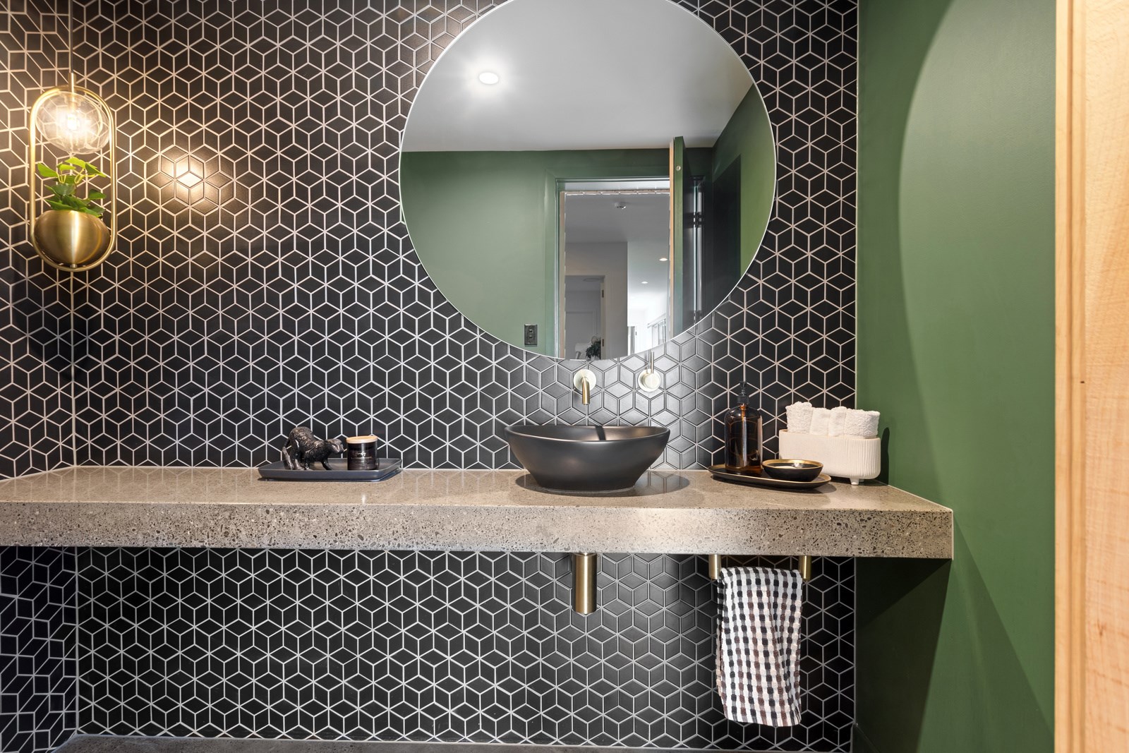 It would be very hard not to alight anywhere in the open-plan living spaces of this Christchurch home and gaze out through the timber framing to the trees beyond. Petrie Architects designed the floorplan to sit lightly on the land; Angus Chisholm Builders brought their soulful vision to life. The idea was to utilise New Zealand materials such as macrocarpa, along with concrete, the latter used on floors as well as both precast and in situ thermal walls. The concrete theme has even been continued in the study and powder room, both of which have polished-concrete benchtops.