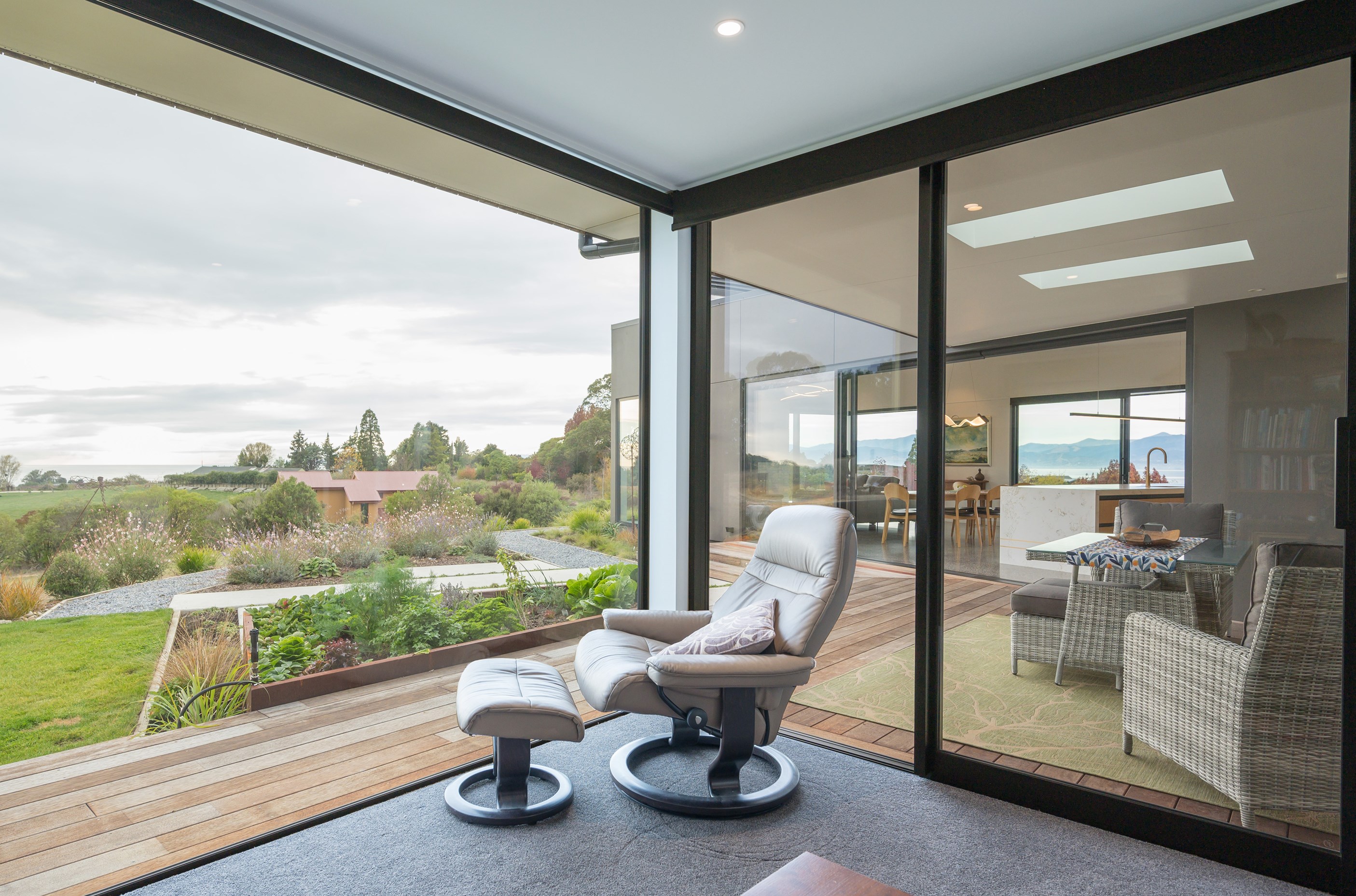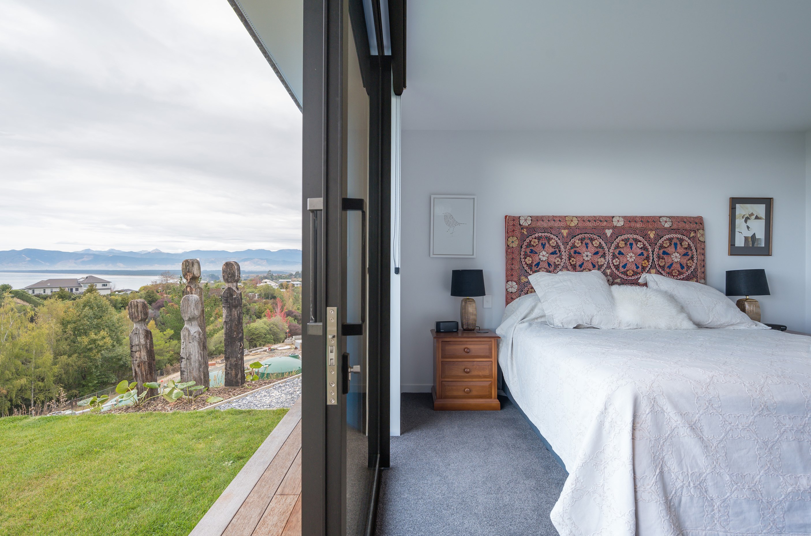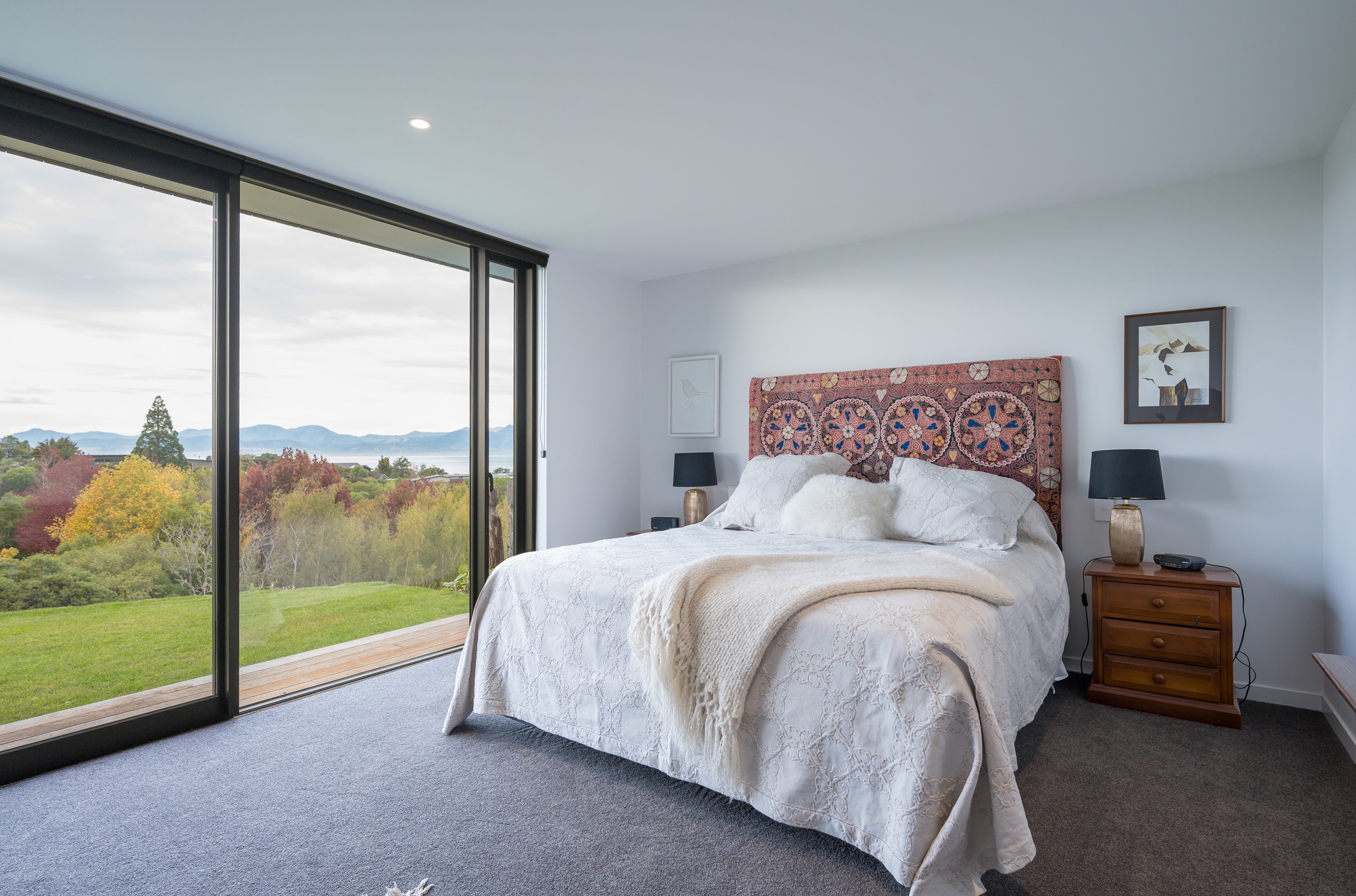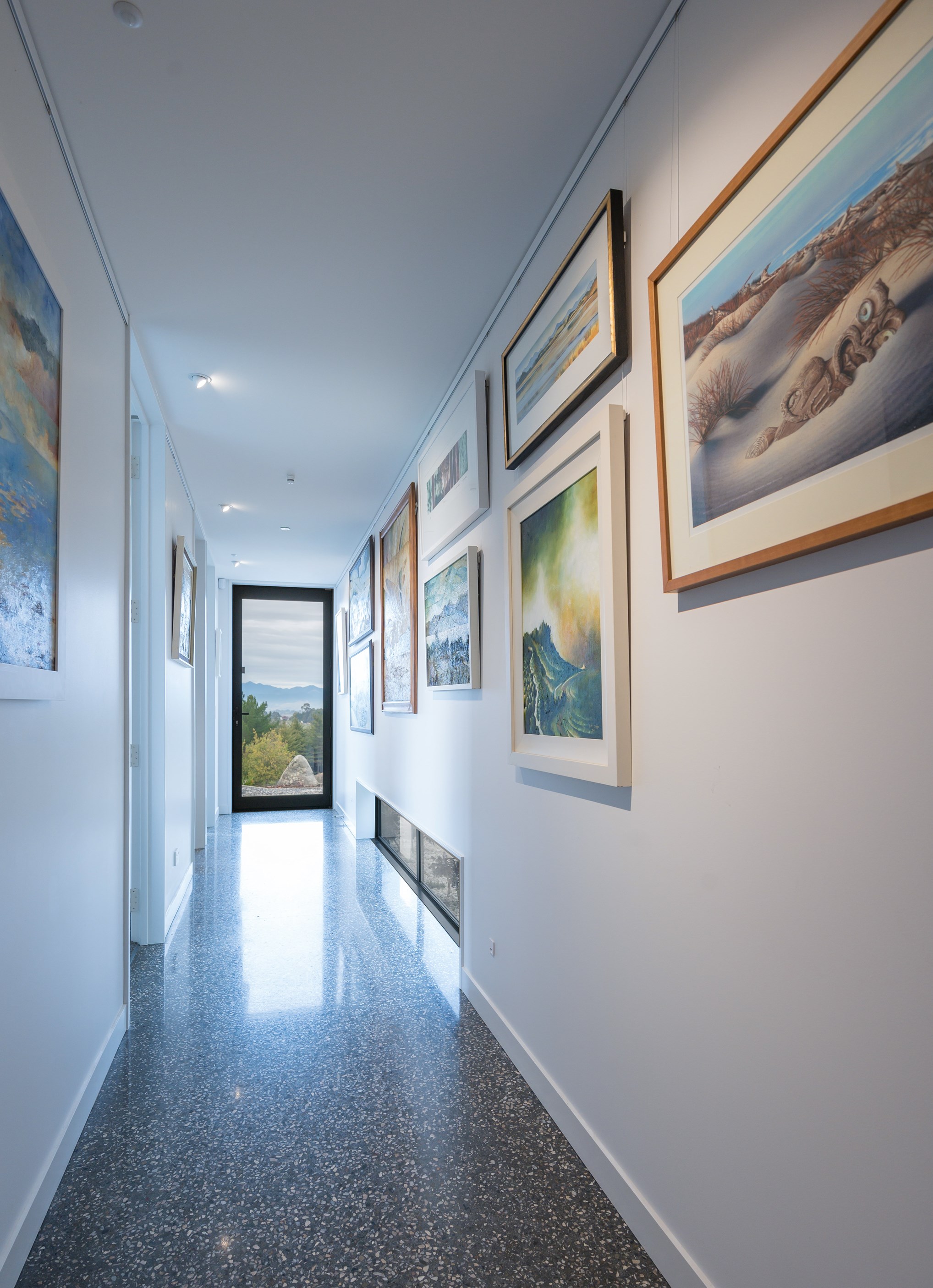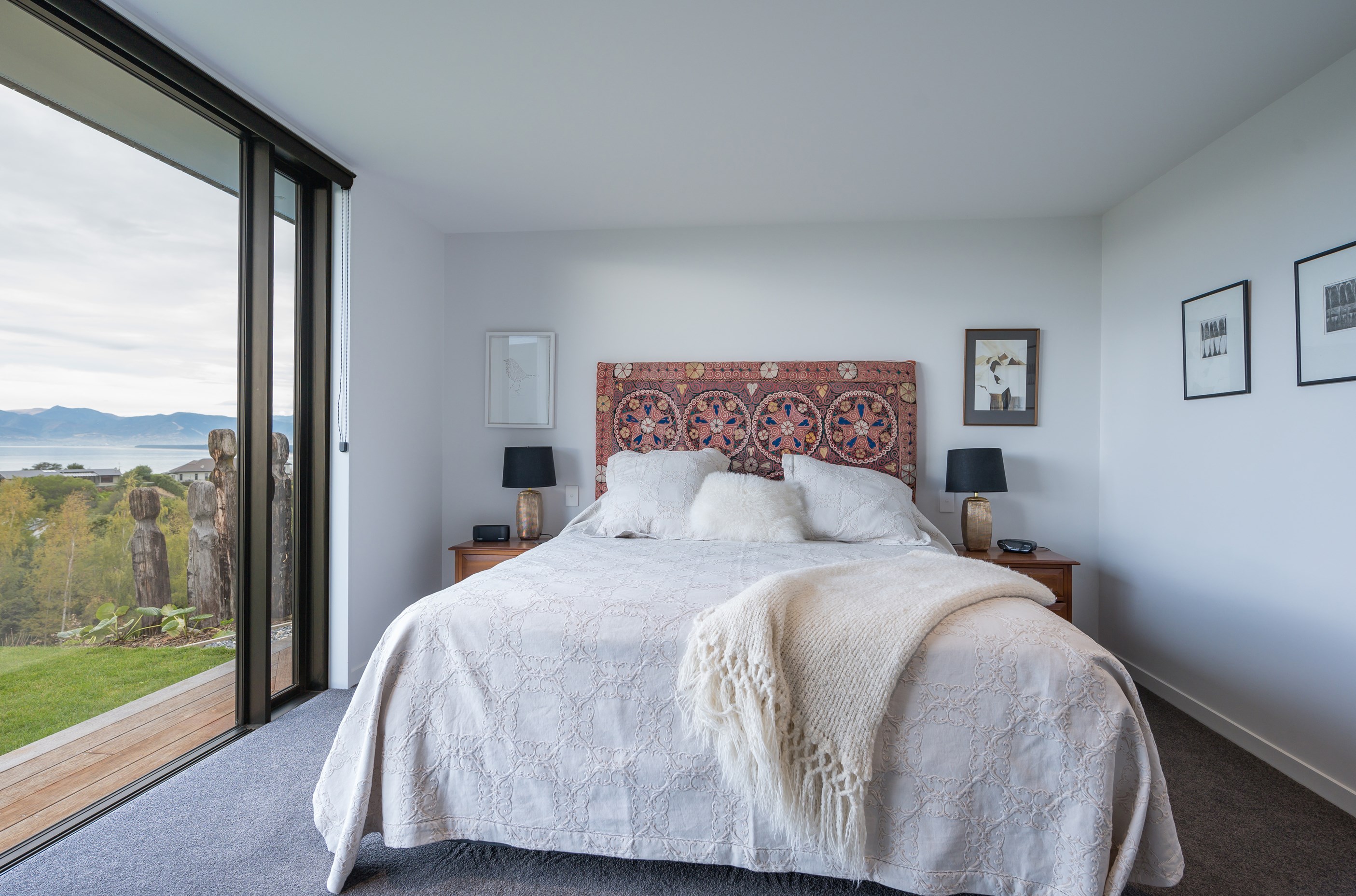 Designed to fit nicely to a re-claimed platform, this ultra-modern home has also been positioned to maximise extensive Ruby Bay views. The living area provides a long central spine with bedroom wings spanning out on either side taking the form of a plane or bird. The hand of the artist owner is evident throughout with blue and yellow panels adding colour to the otherwise black, white and timber exterior also visible from inside. The hallway which runs through the bedroom wing, with a window at floor level, becomes a gallery and art is hung on every wall that doesn’t have a large picture window.