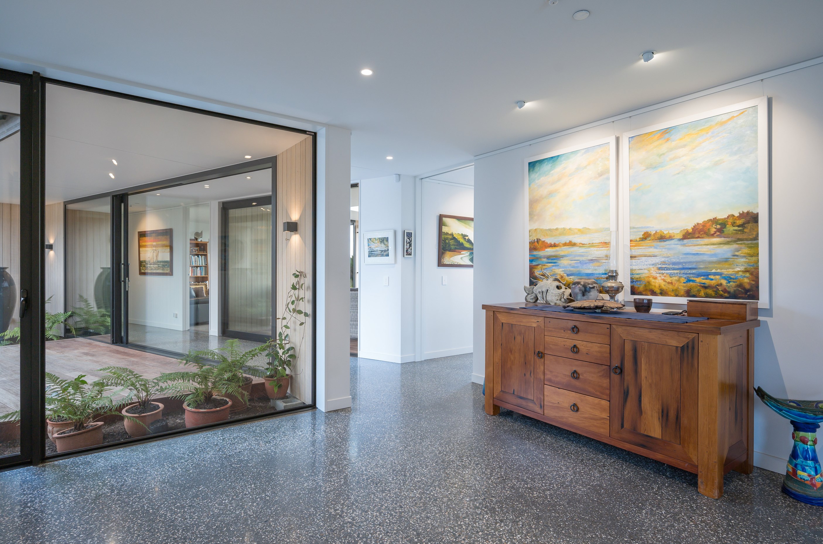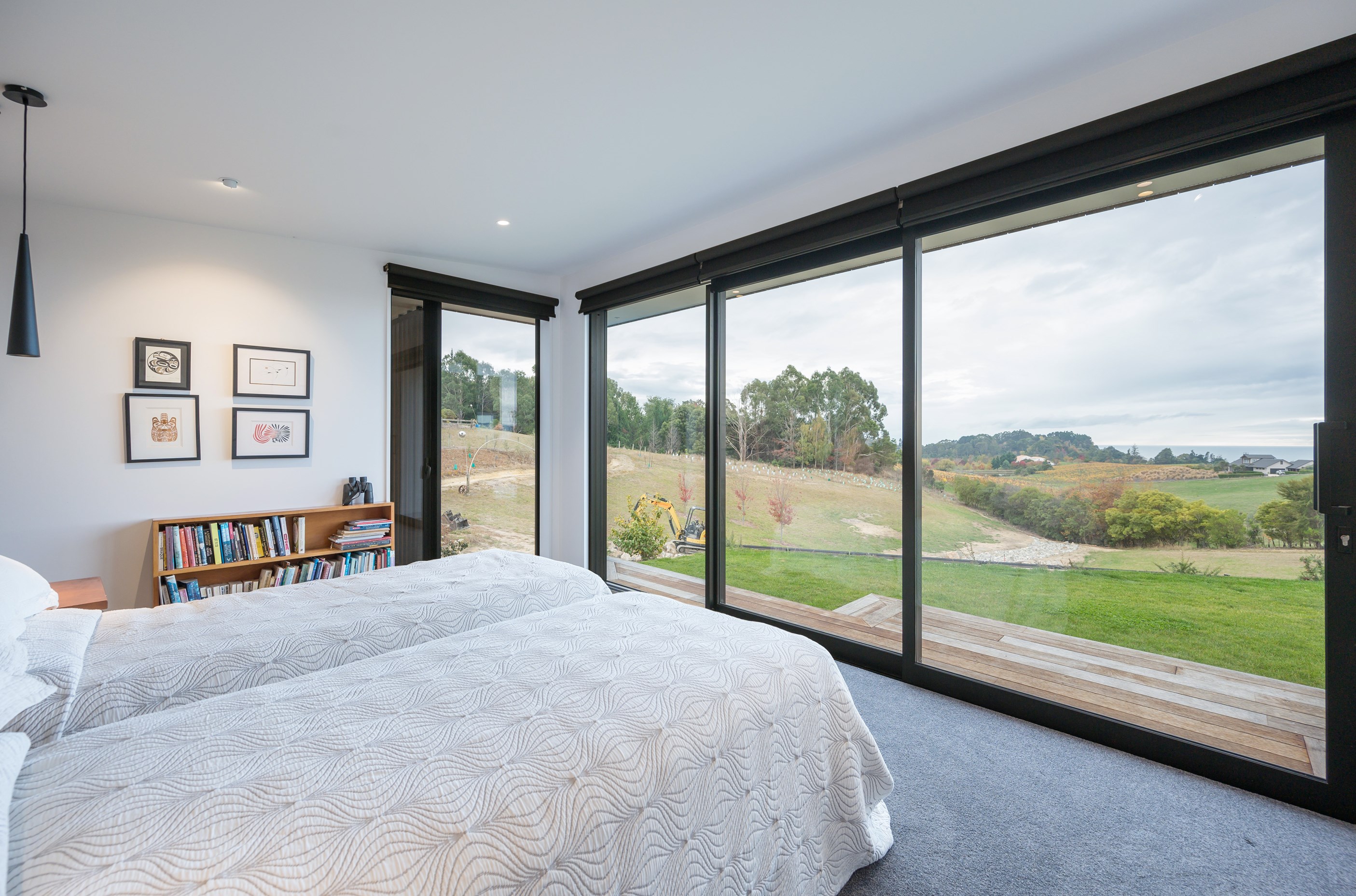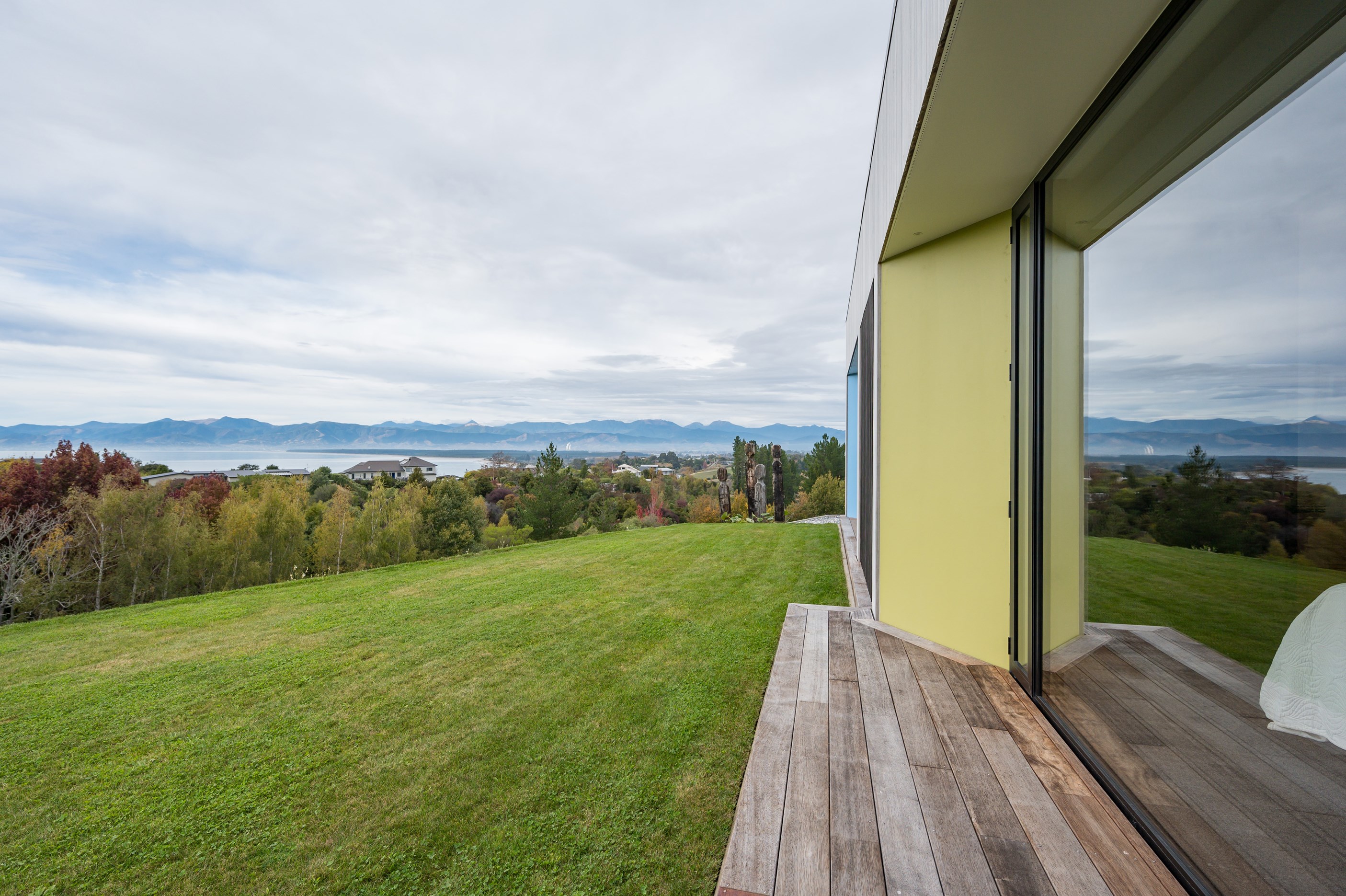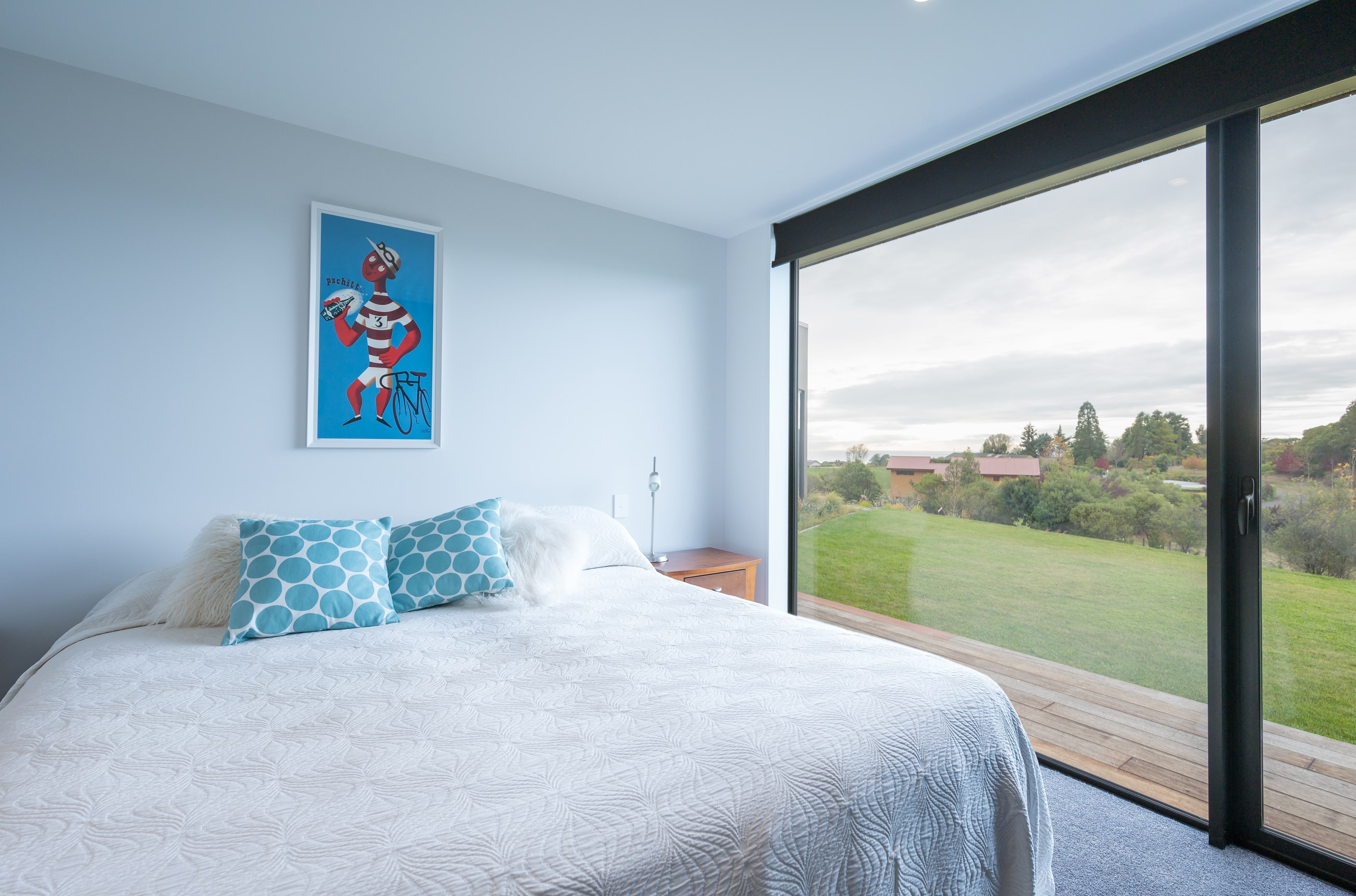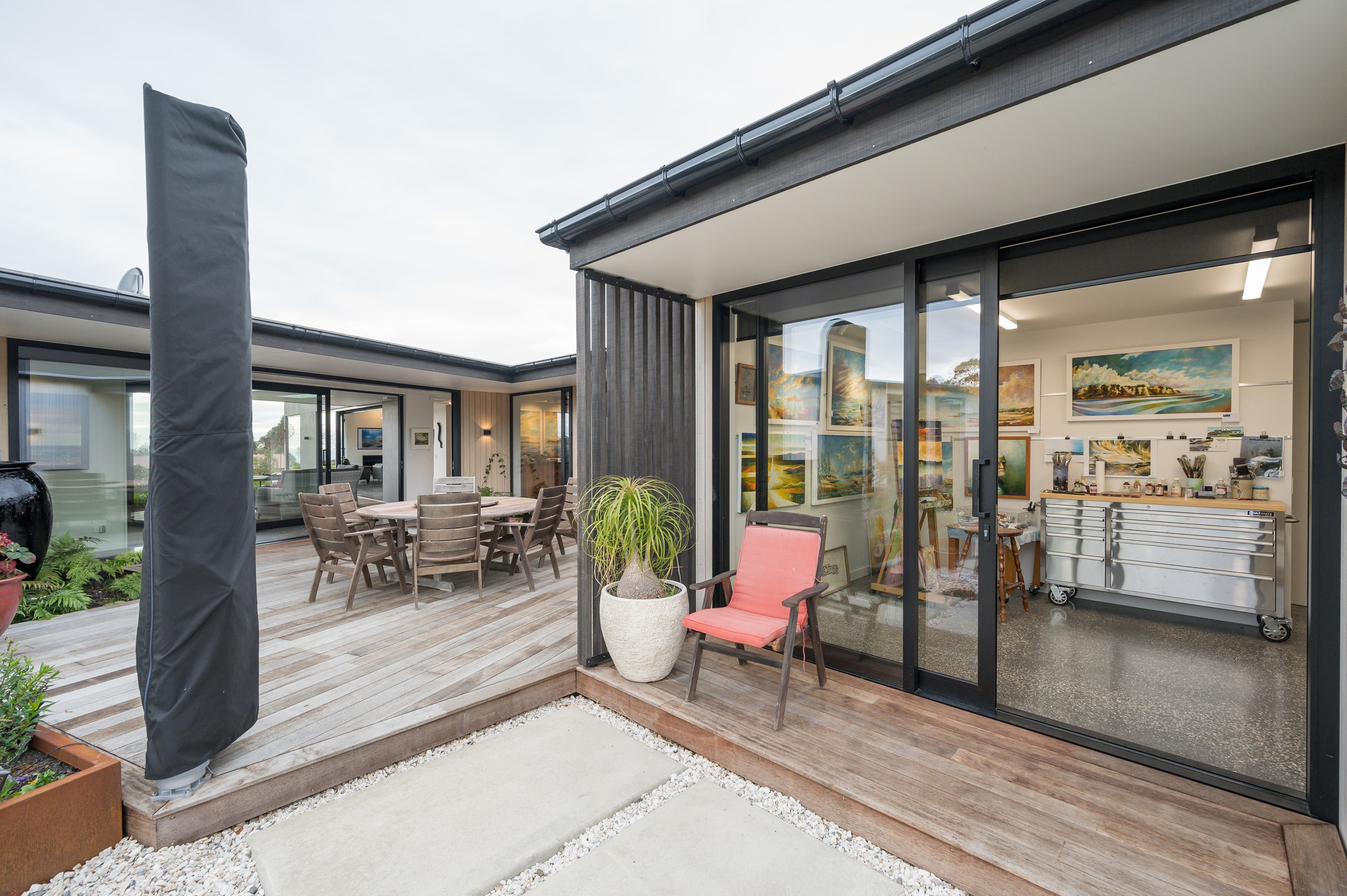 Designed to fit nicely to a re-claimed platform, this ultra-modern home has also been positioned to maximise extensive Ruby Bay views. The living area provides a long central spine with bedroom wings spanning out on either side taking the form of a plane or bird. The hand of the artist owner is evident throughout with blue and yellow panels adding colour to the otherwise black, white and timber exterior also visible from inside. The hallway which runs through the bedroom wing, with a window at floor level, becomes a gallery and art is hung on every wall that doesn’t have a large picture window.