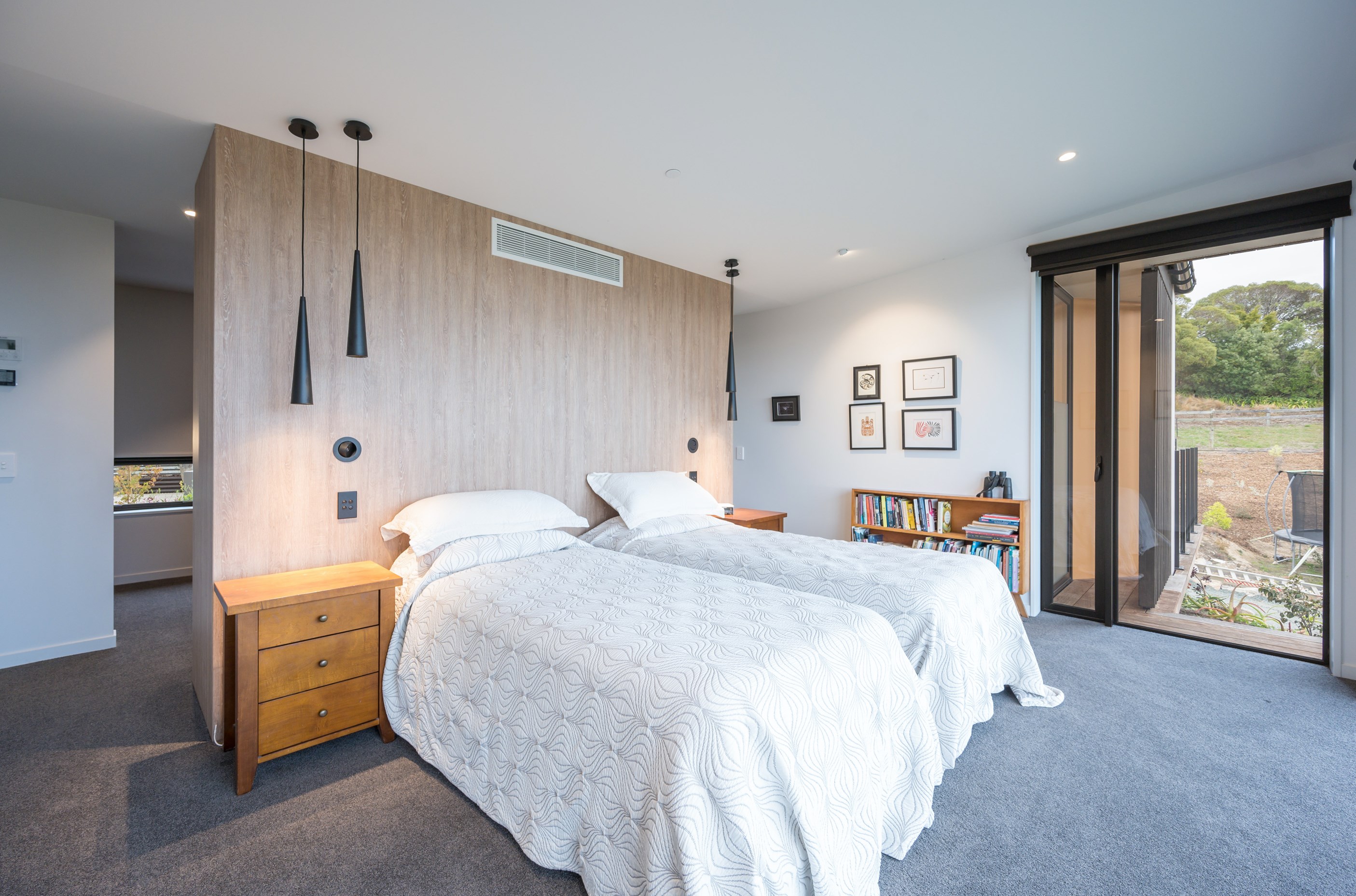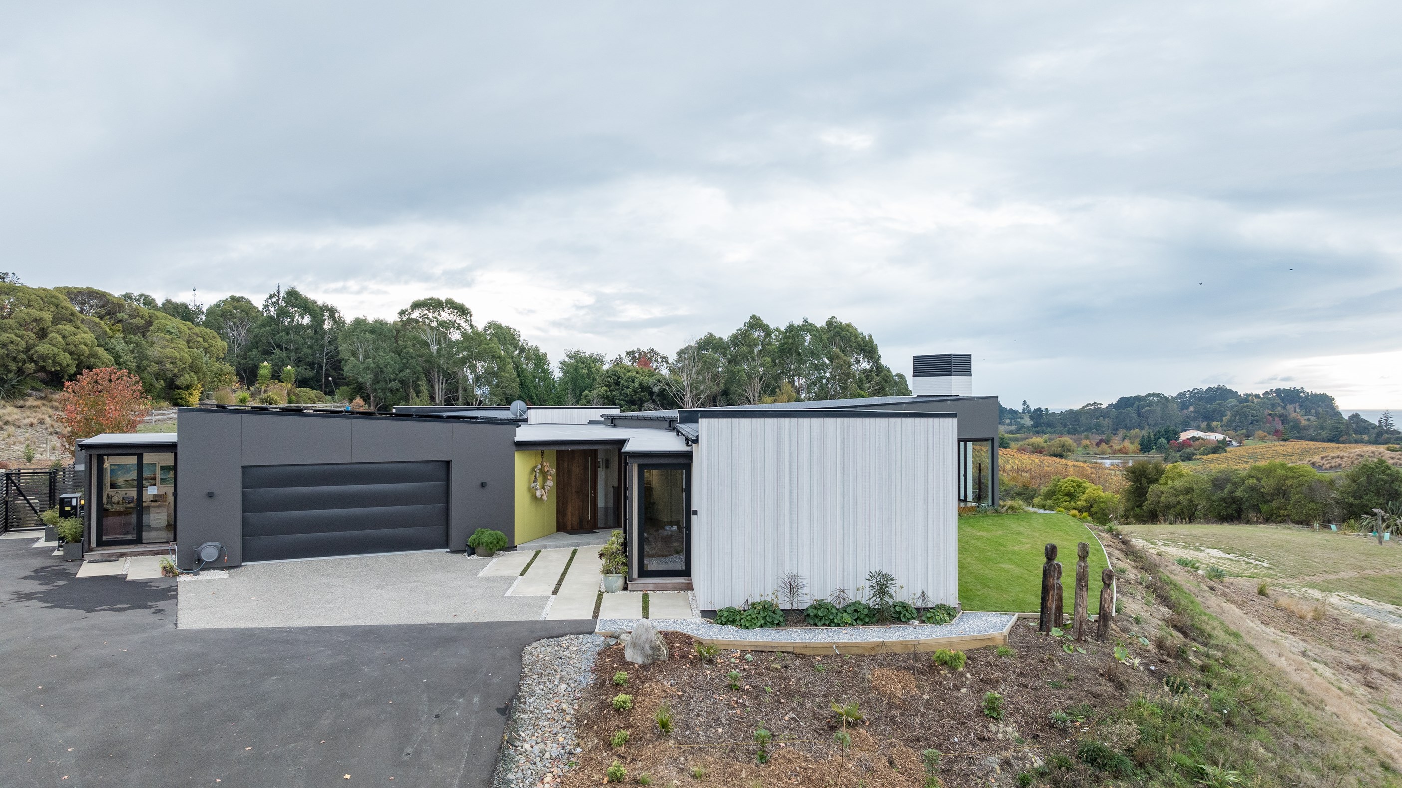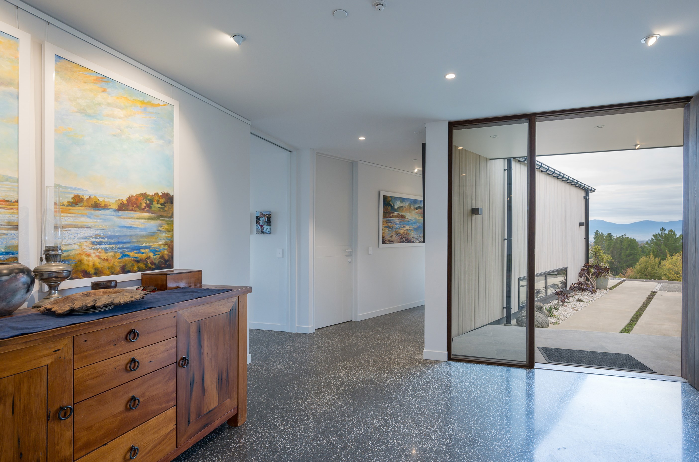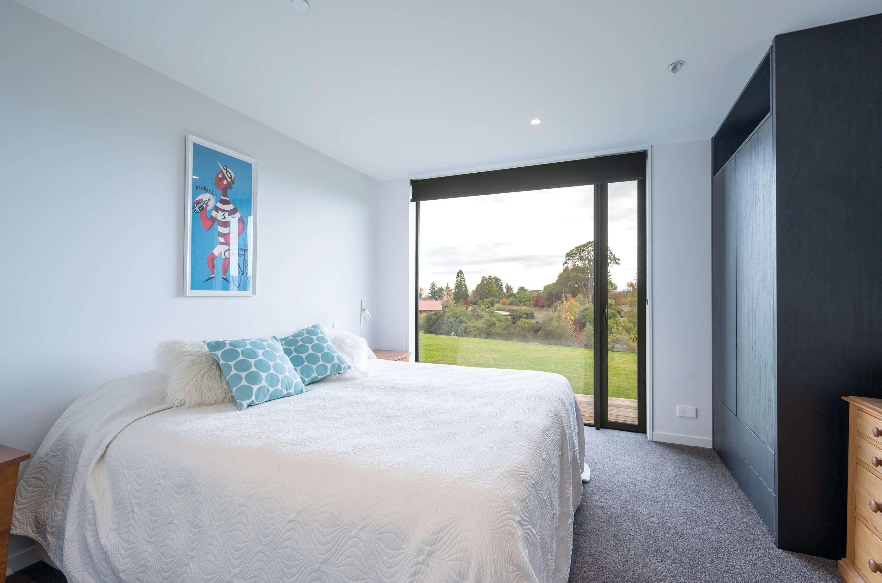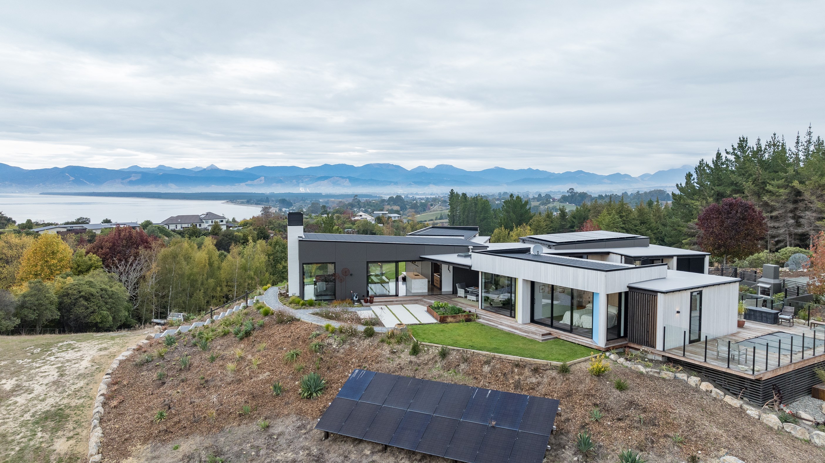 Designed to fit nicely to a re-claimed platform, this ultra-modern home has also been positioned to maximise extensive Ruby Bay views. The living area provides a long central spine with bedroom wings spanning out on either side taking the form of a plane or bird. The hand of the artist owner is evident throughout with blue and yellow panels adding colour to the otherwise black, white and timber exterior also visible from inside. The hallway which runs through the bedroom wing, with a window at floor level, becomes a gallery and art is hung on every wall that doesn’t have a large picture window.