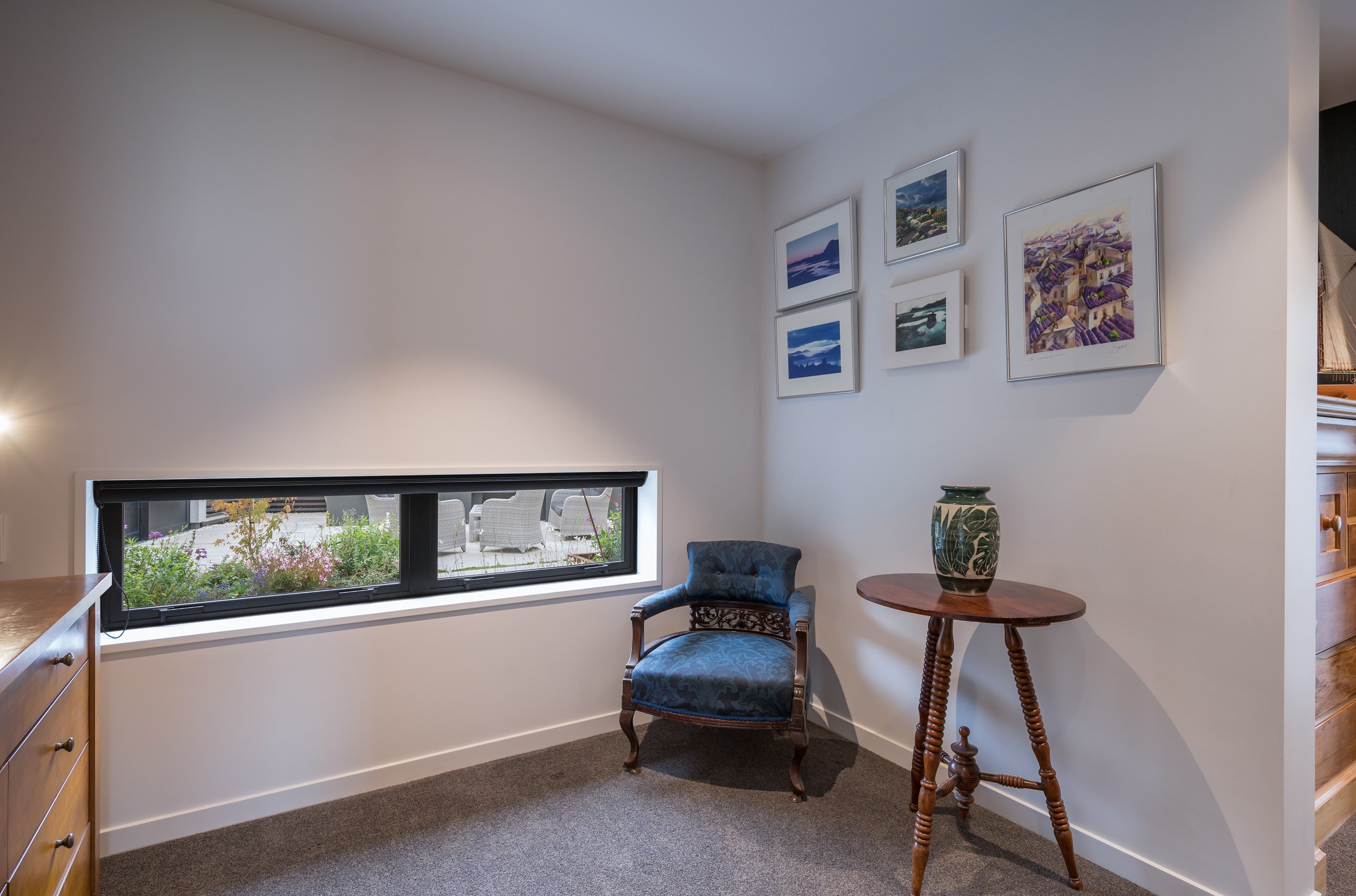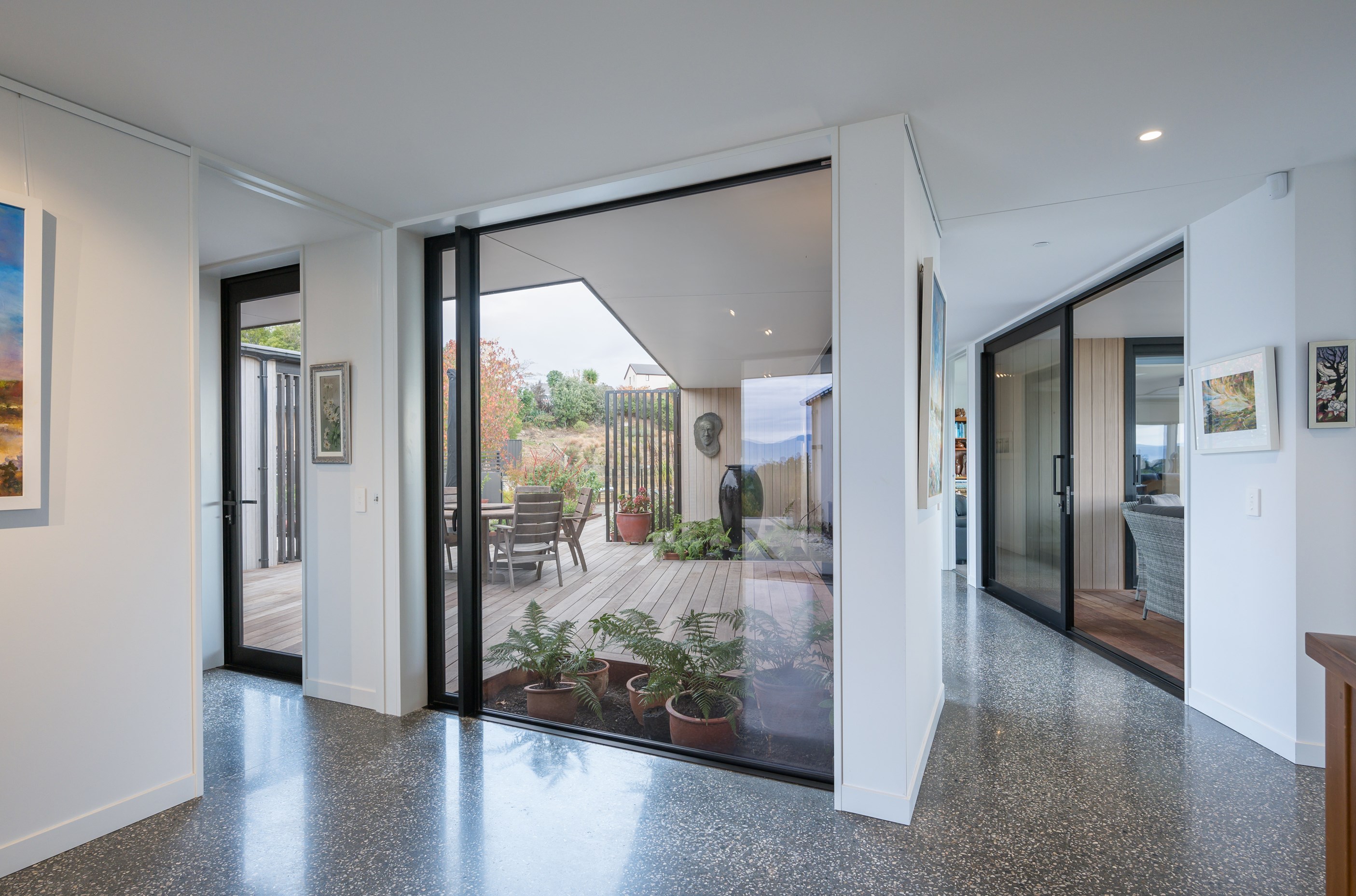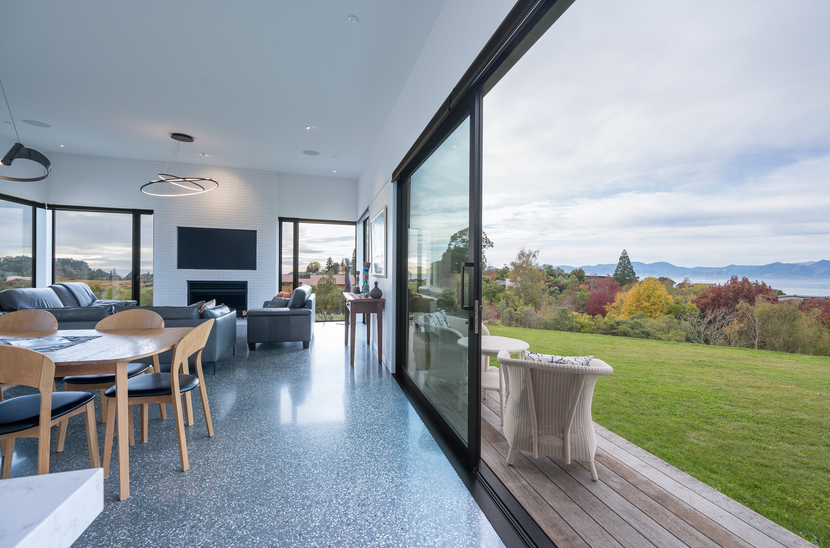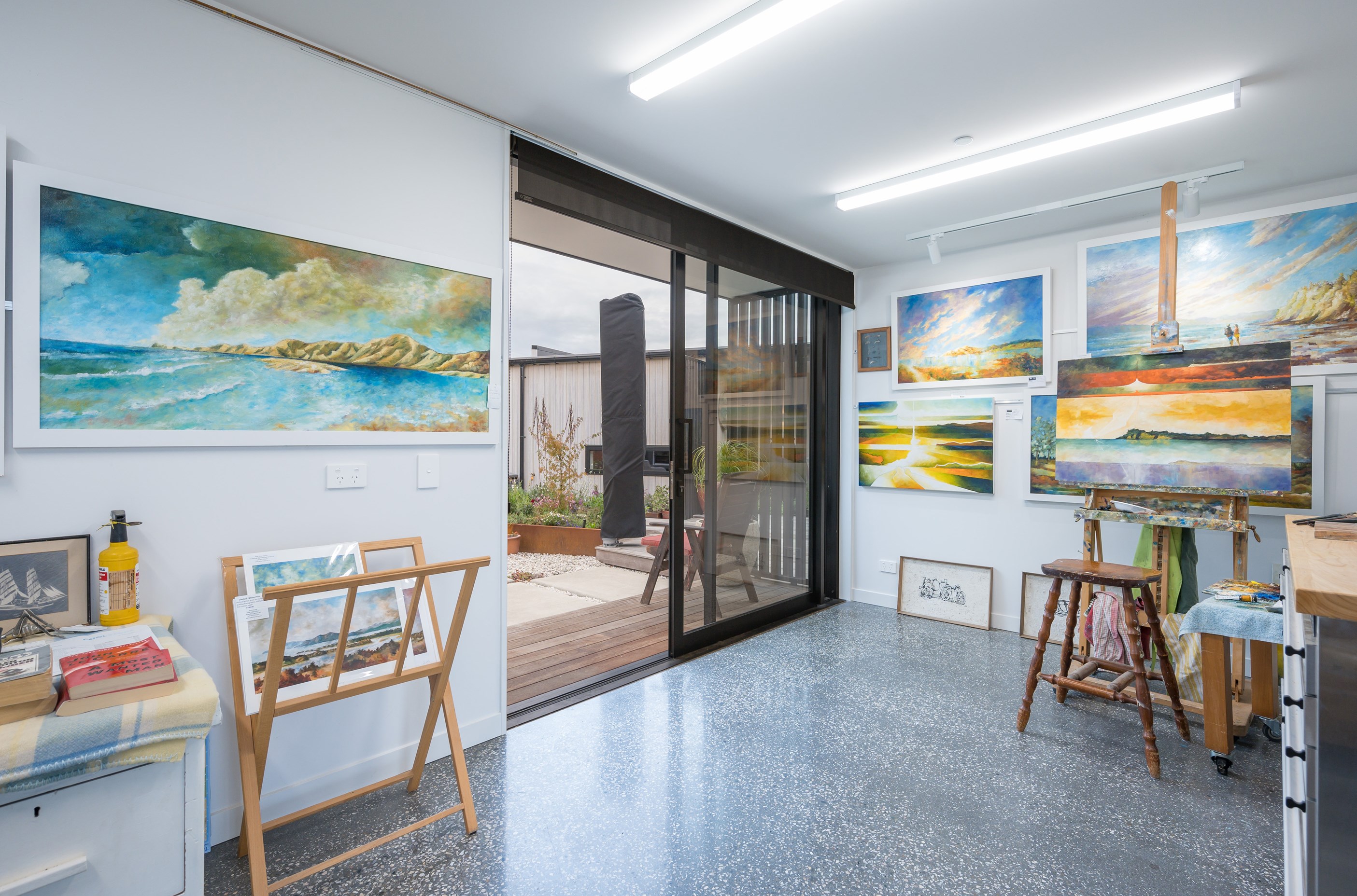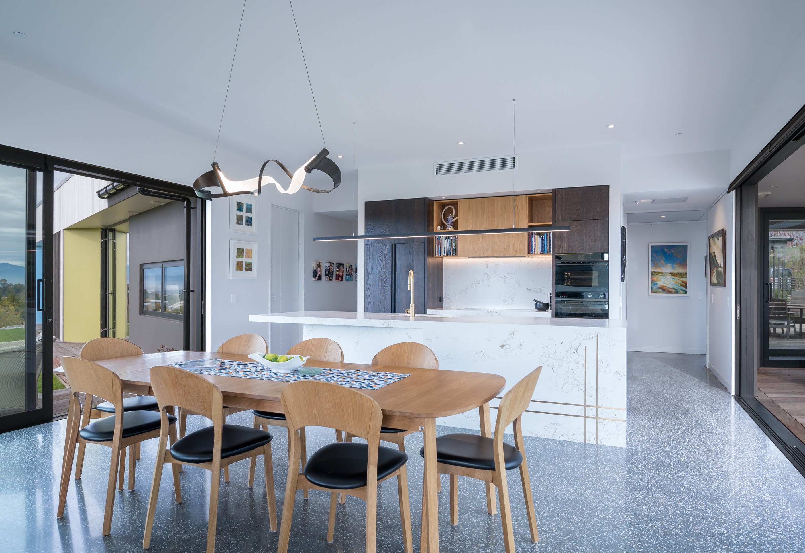 Designed to fit nicely to a re-claimed platform, this ultra-modern home has also been positioned to maximise extensive Ruby Bay views. The living area provides a long central spine with bedroom wings spanning out on either side taking the form of a plane or bird. The hand of the artist owner is evident throughout with blue and yellow panels adding colour to the otherwise black, white and timber exterior also visible from inside. The hallway which runs through the bedroom wing, with a window at floor level, becomes a gallery and art is hung on every wall that doesn’t have a large picture window.