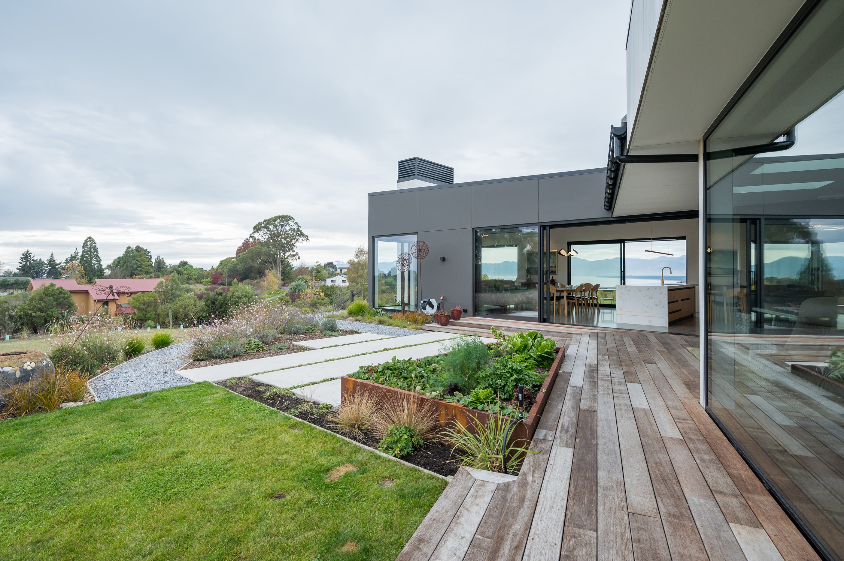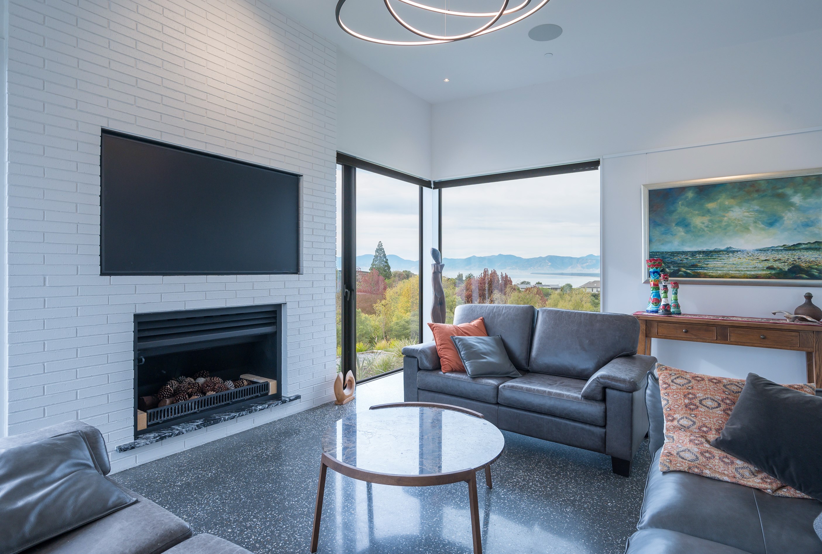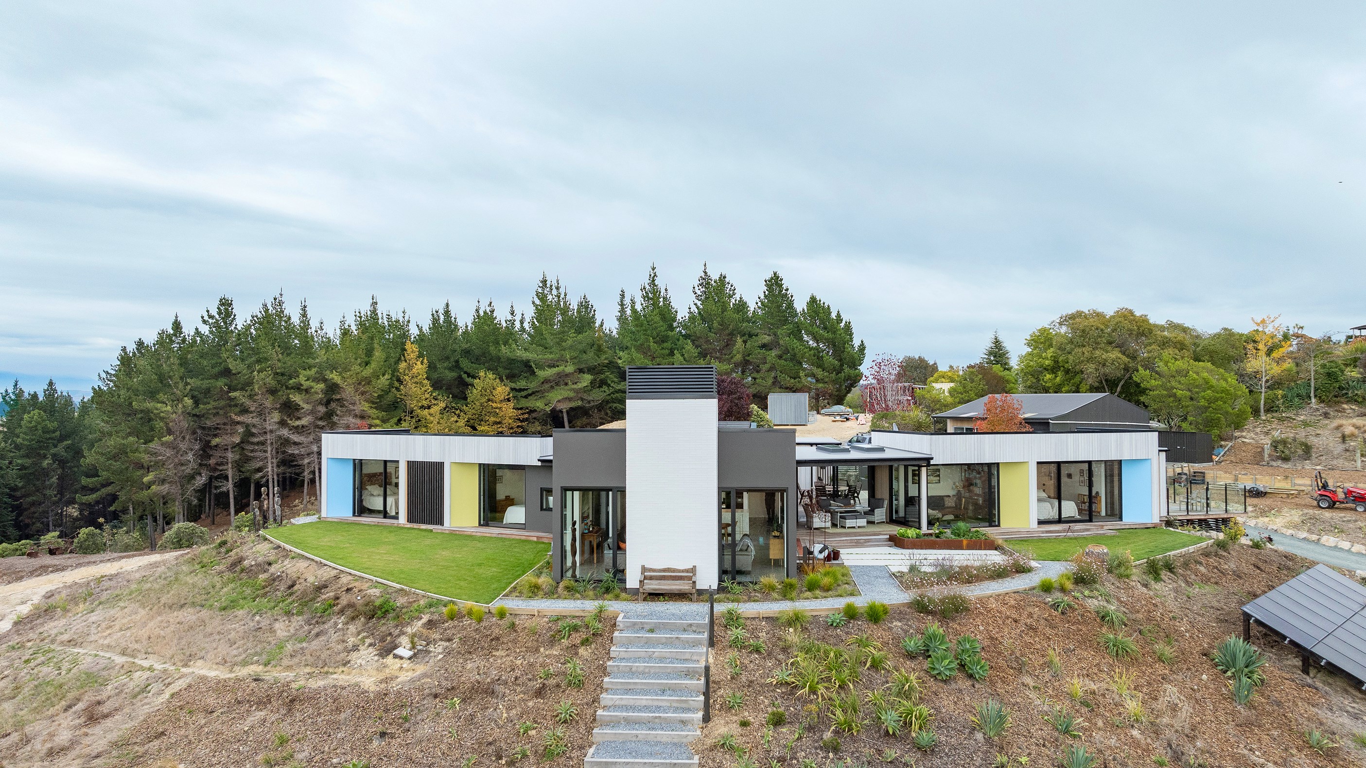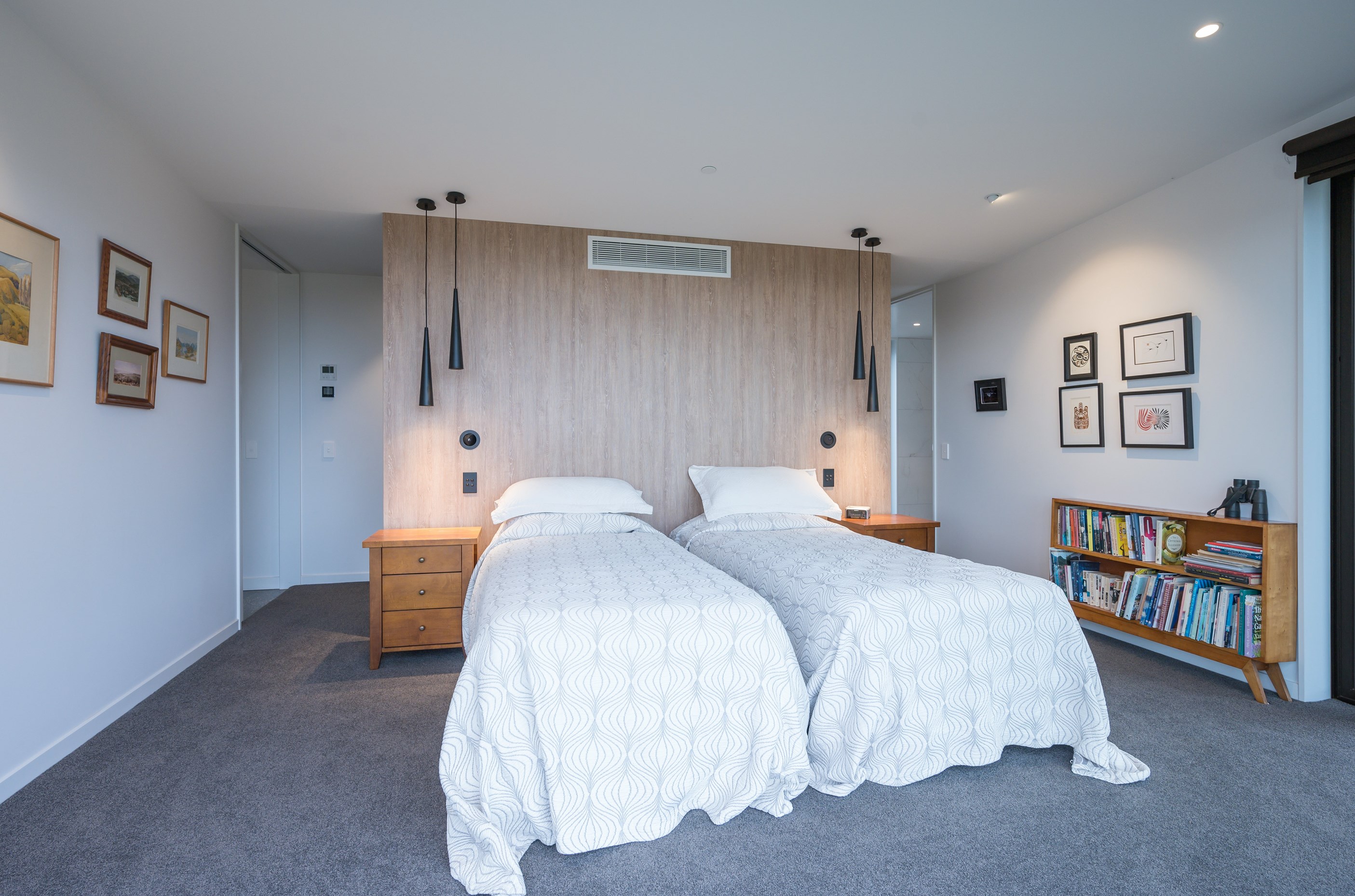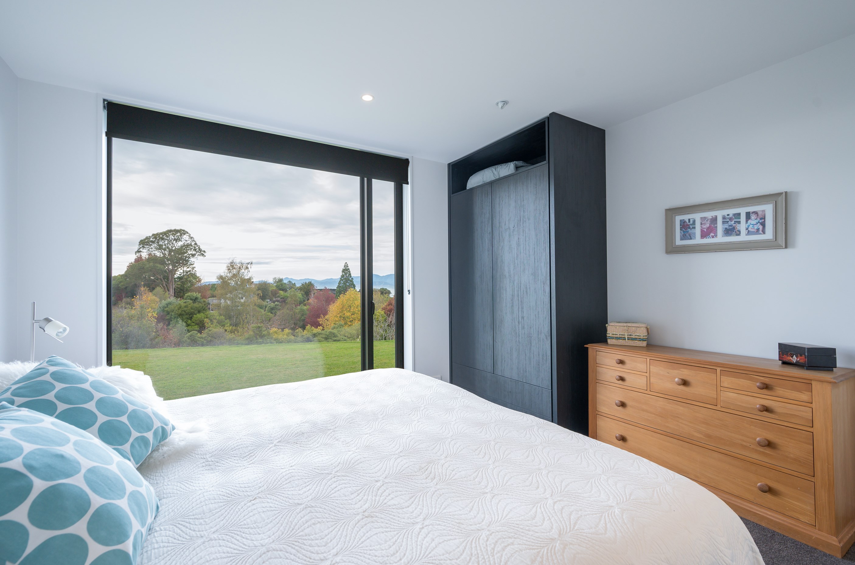 Designed to fit nicely to a re-claimed platform, this ultra-modern home has also been positioned to maximise extensive Ruby Bay views. The living area provides a long central spine with bedroom wings spanning out on either side taking the form of a plane or bird. The hand of the artist owner is evident throughout with blue and yellow panels adding colour to the otherwise black, white and timber exterior also visible from inside. The hallway which runs through the bedroom wing, with a window at floor level, becomes a gallery and art is hung on every wall that doesn’t have a large picture window.