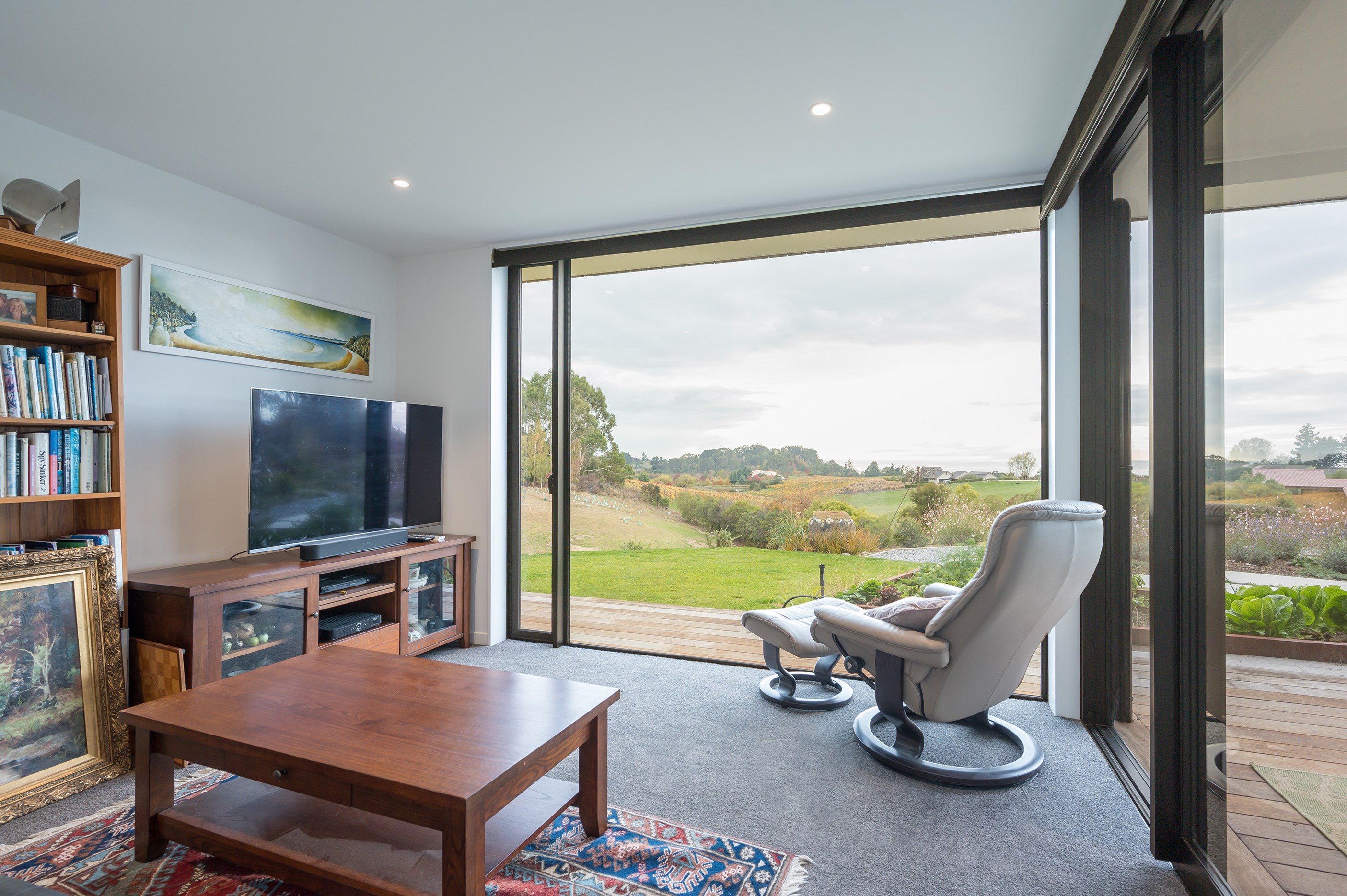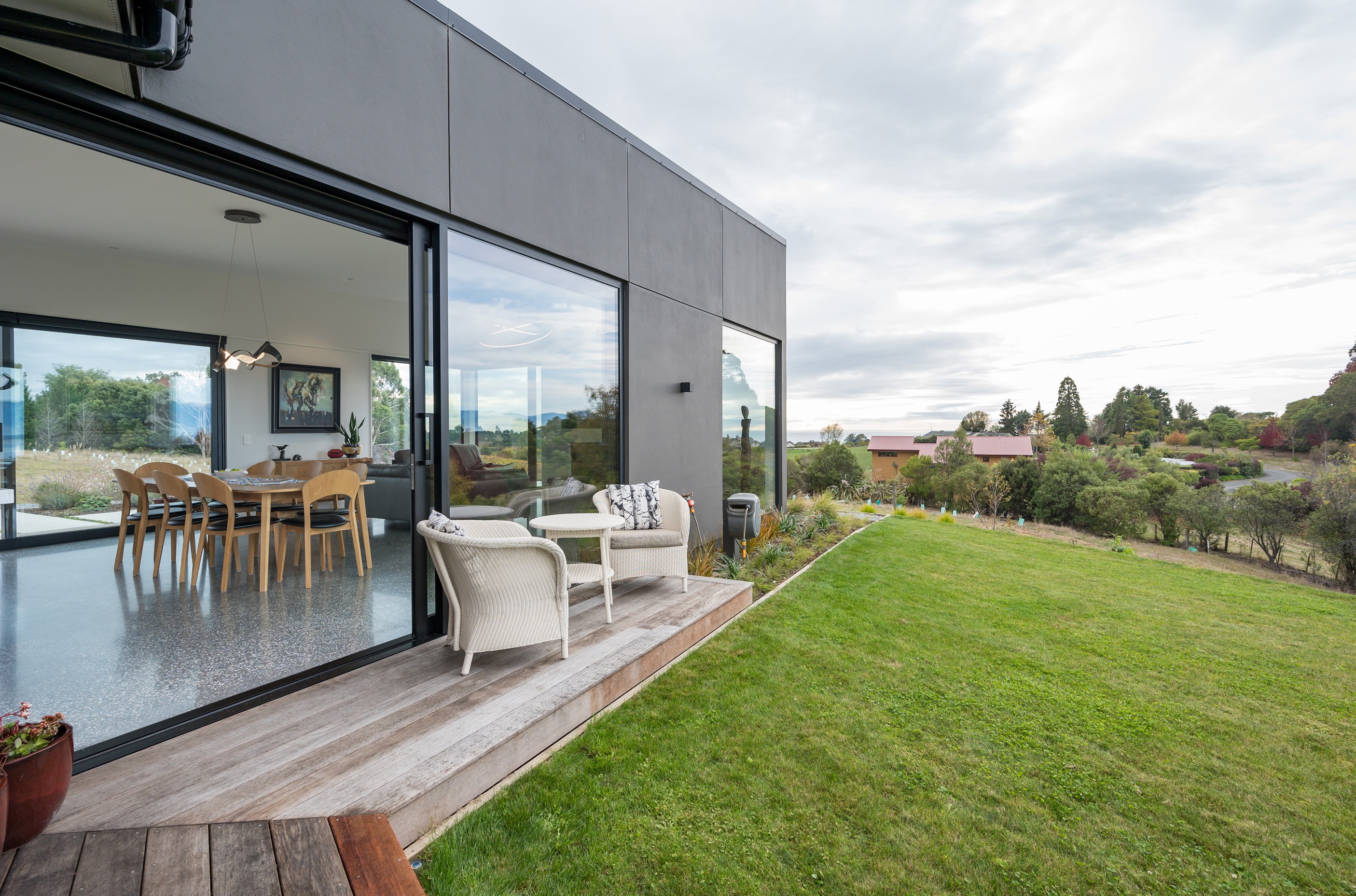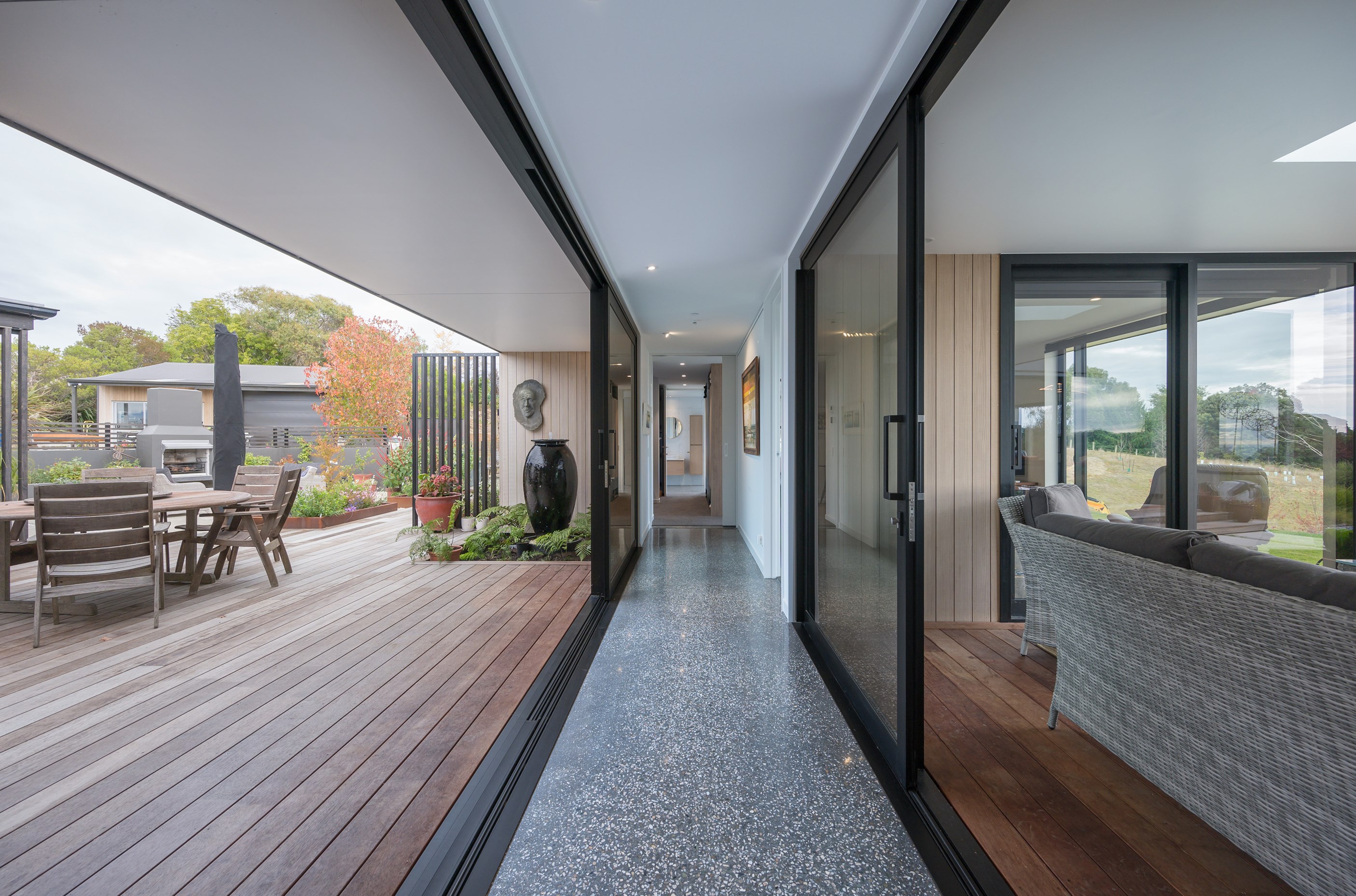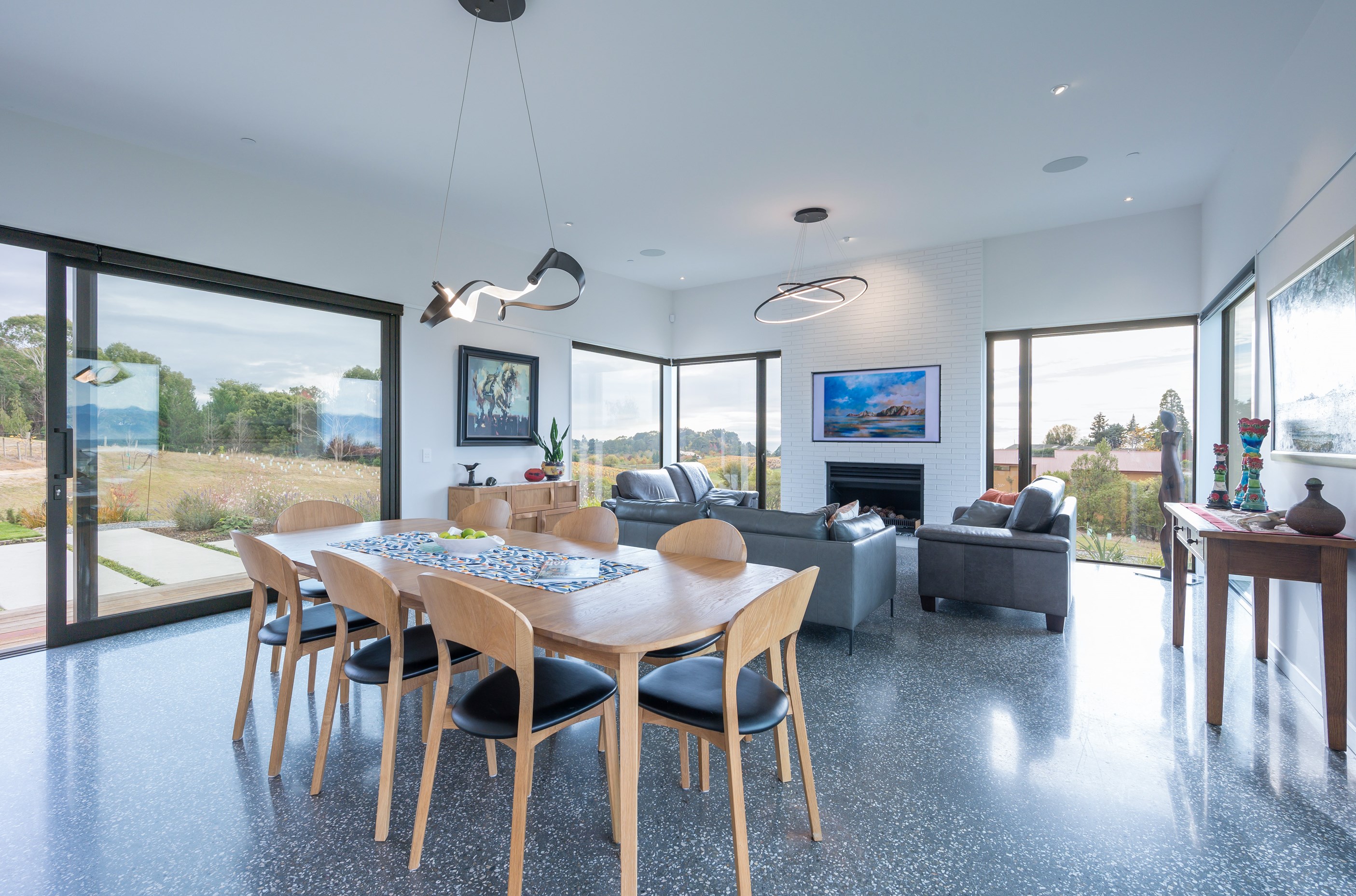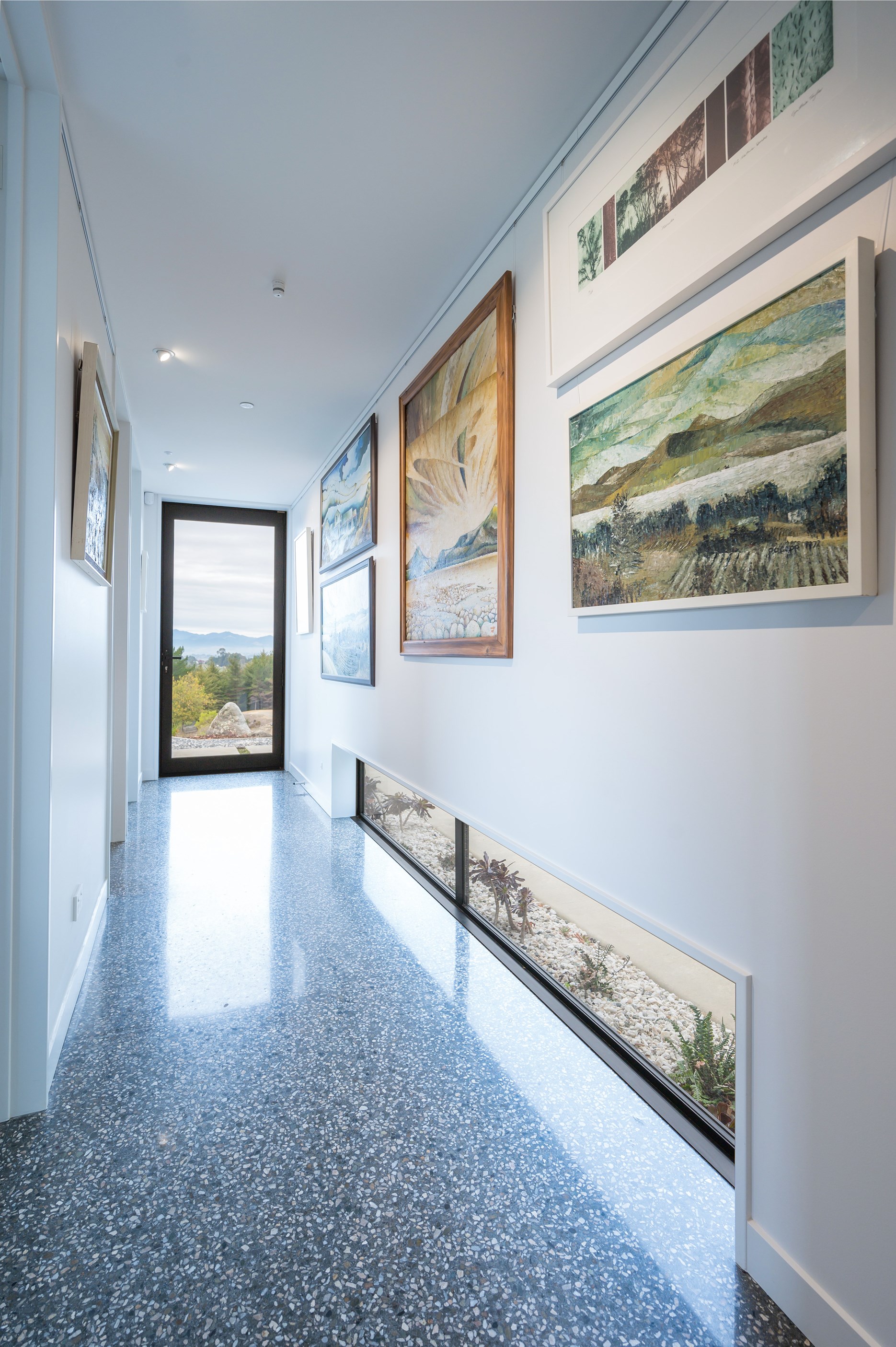 Designed to fit nicely to a re-claimed platform, this ultra-modern home has also been positioned to maximise extensive Ruby Bay views. The living area provides a long central spine with bedroom wings spanning out on either side taking the form of a plane or bird. The hand of the artist owner is evident throughout with blue and yellow panels adding colour to the otherwise black, white and timber exterior also visible from inside. The hallway which runs through the bedroom wing, with a window at floor level, becomes a gallery and art is hung on every wall that doesn’t have a large picture window.