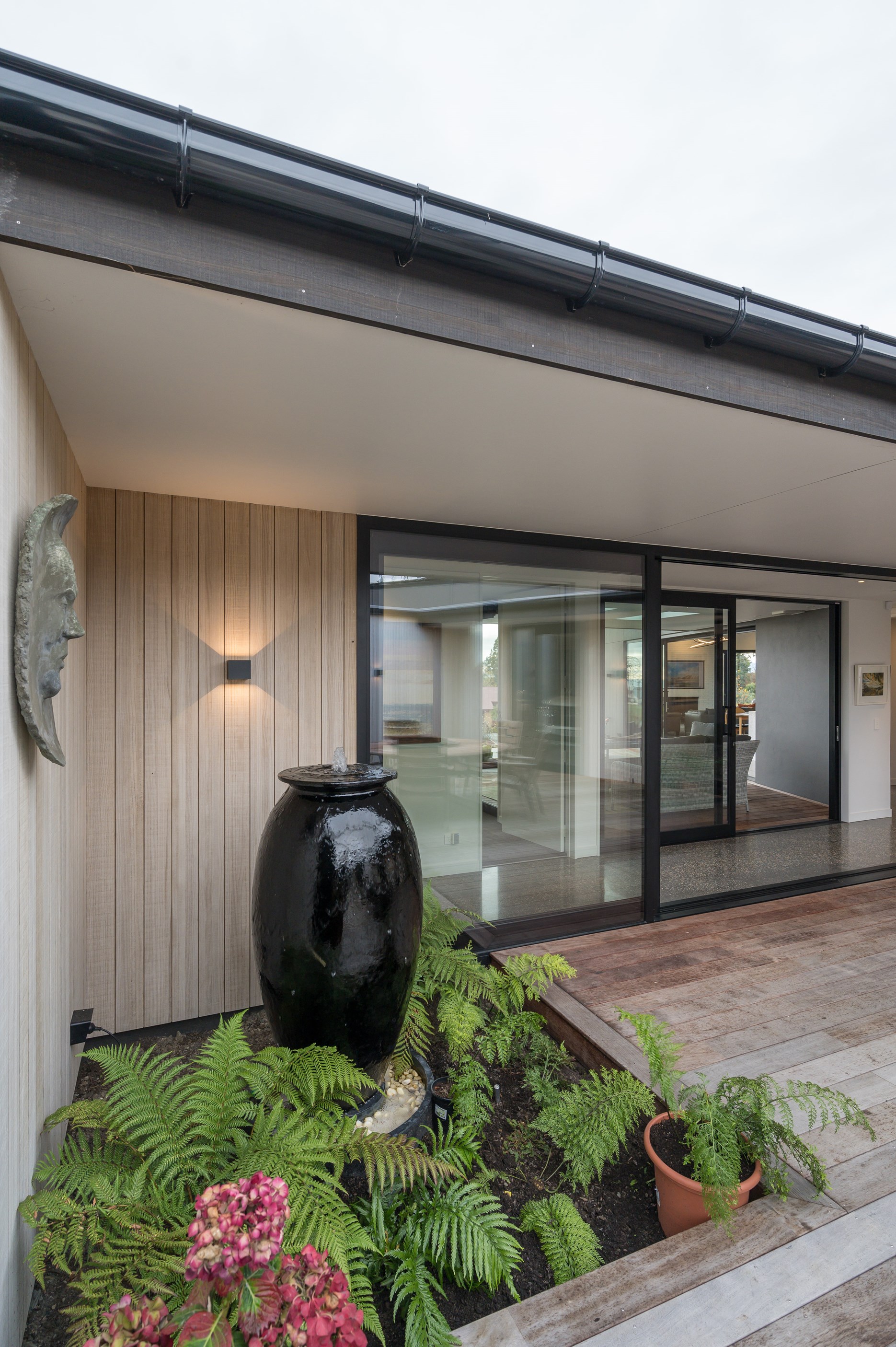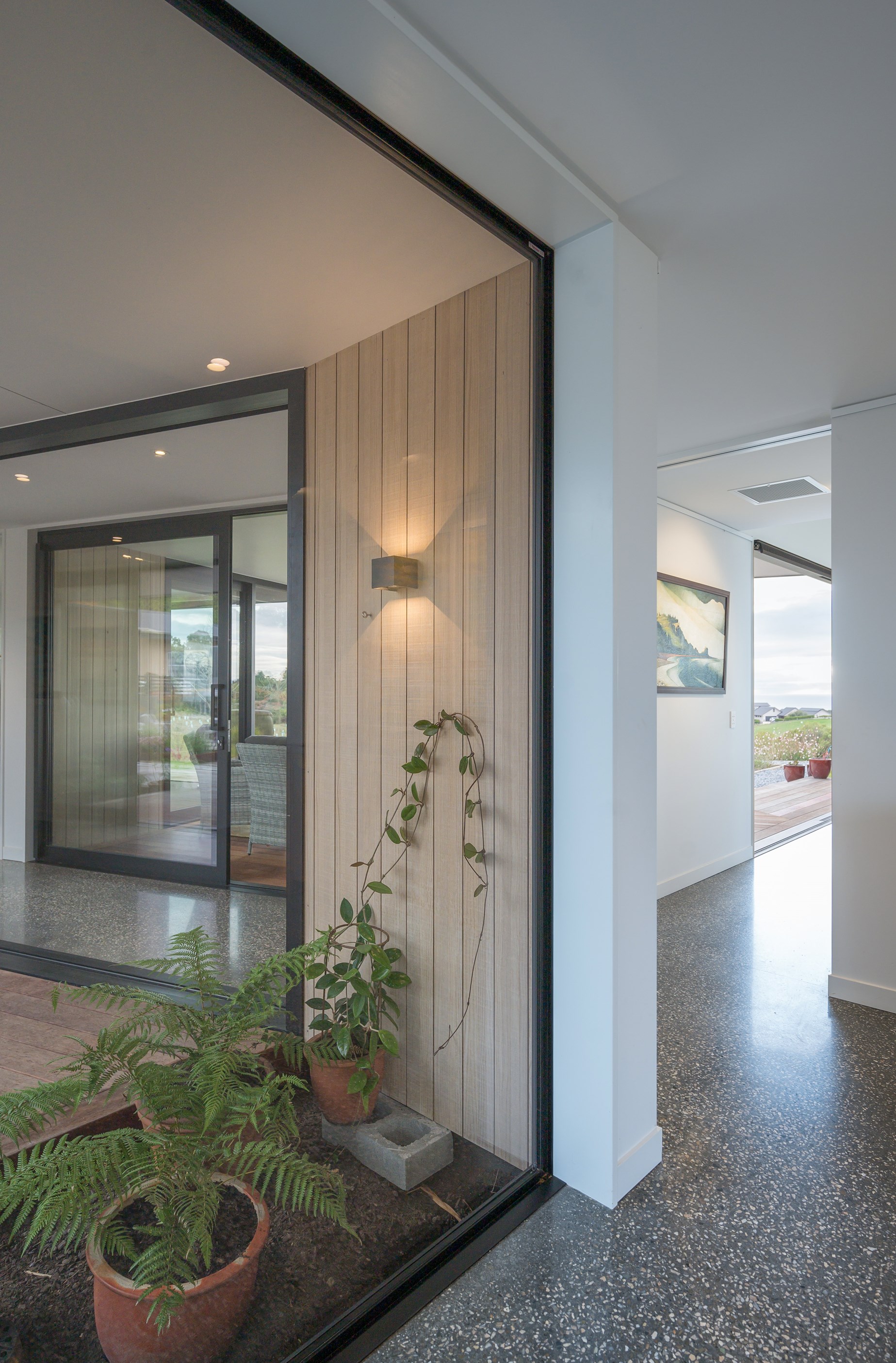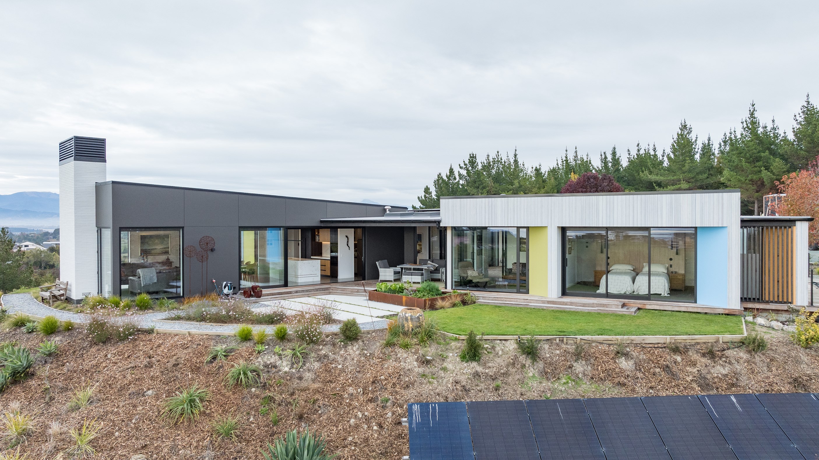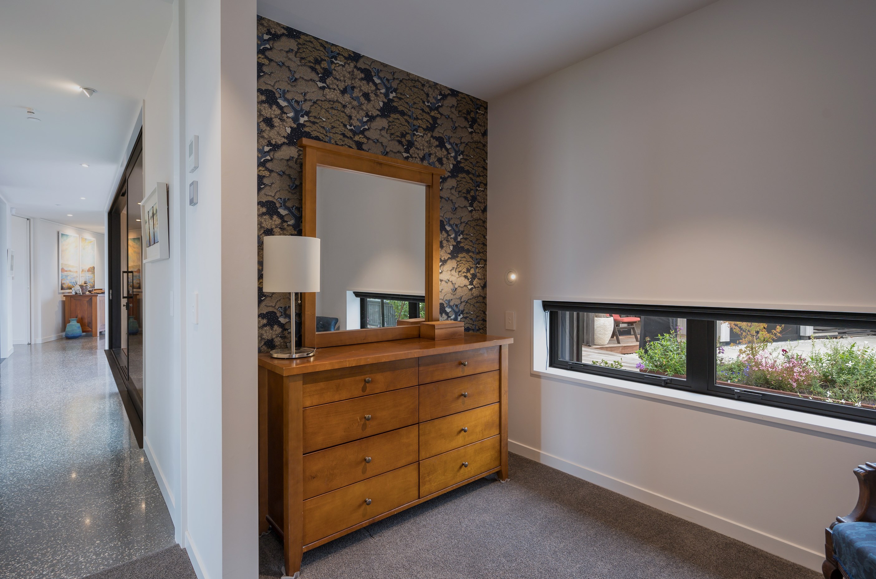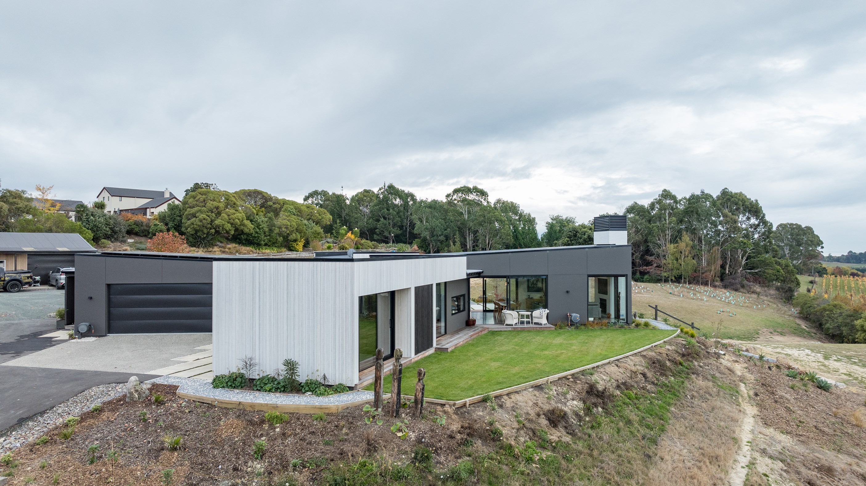 Designed to fit nicely to a re-claimed platform, this ultra-modern home has also been positioned to maximise extensive Ruby Bay views. The living area provides a long central spine with bedroom wings spanning out on either side taking the form of a plane or bird. The hand of the artist owner is evident throughout with blue and yellow panels adding colour to the otherwise black, white and timber exterior also visible from inside. The hallway which runs through the bedroom wing, with a window at floor level, becomes a gallery and art is hung on every wall that doesn’t have a large picture window.