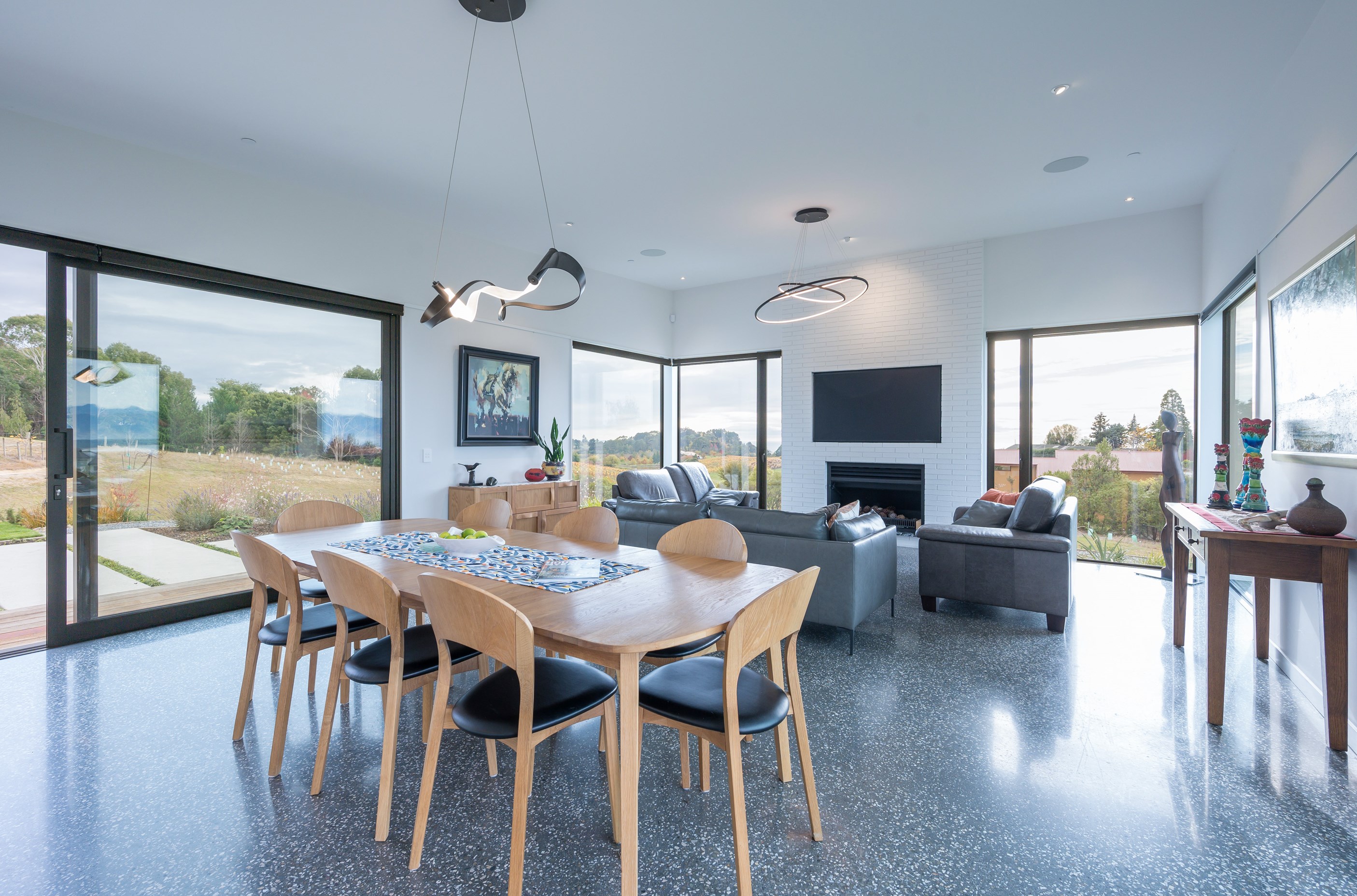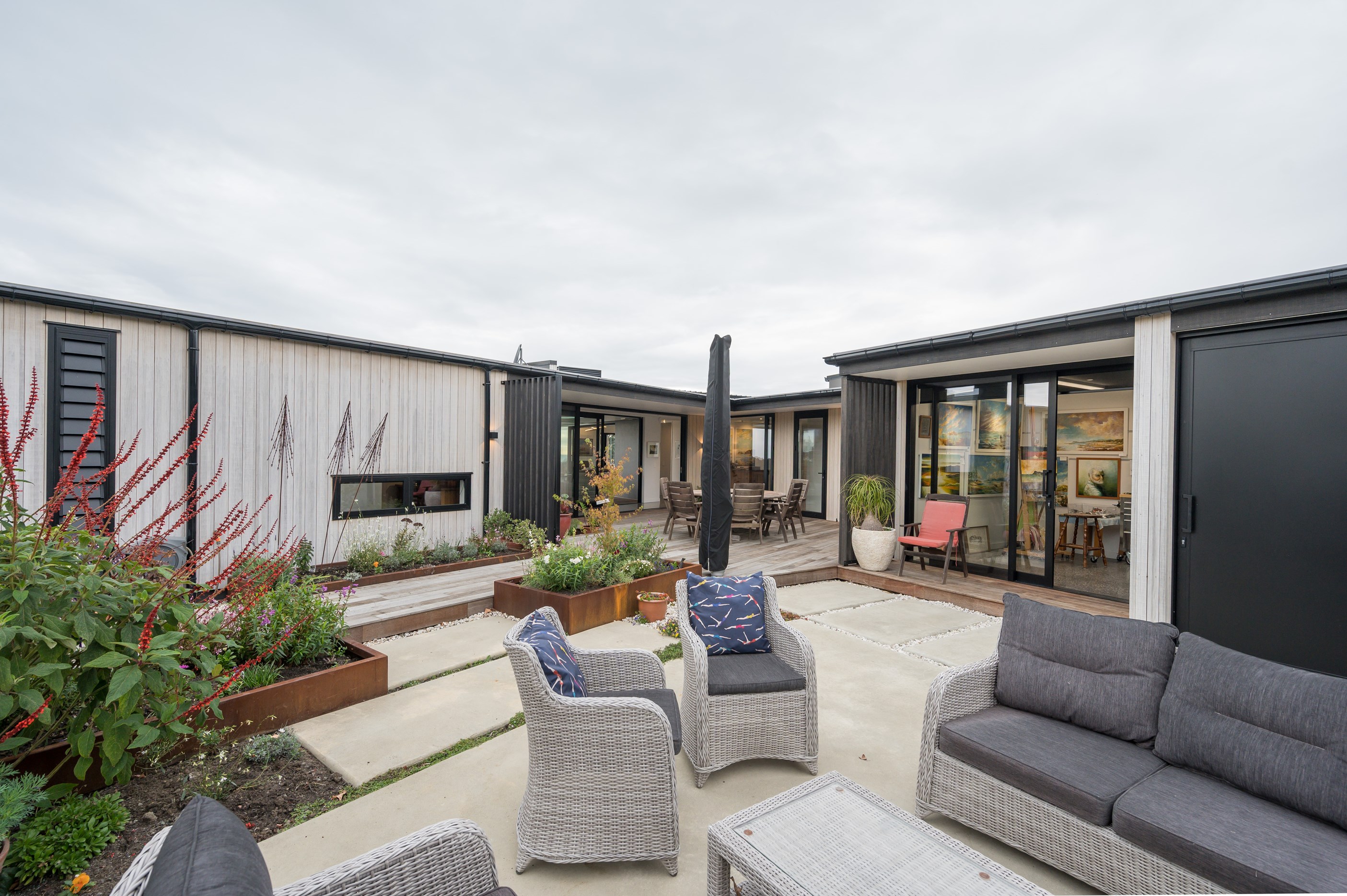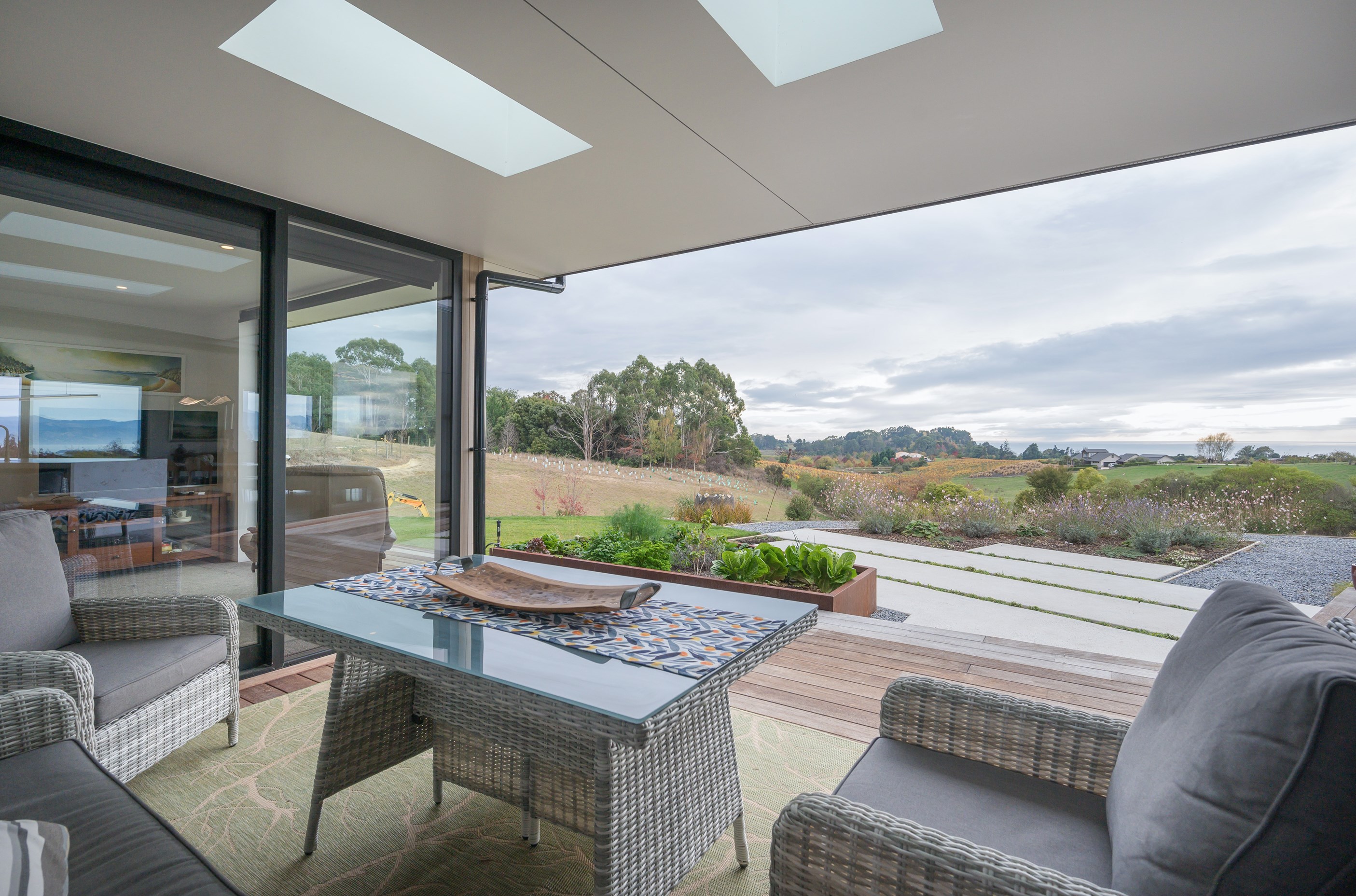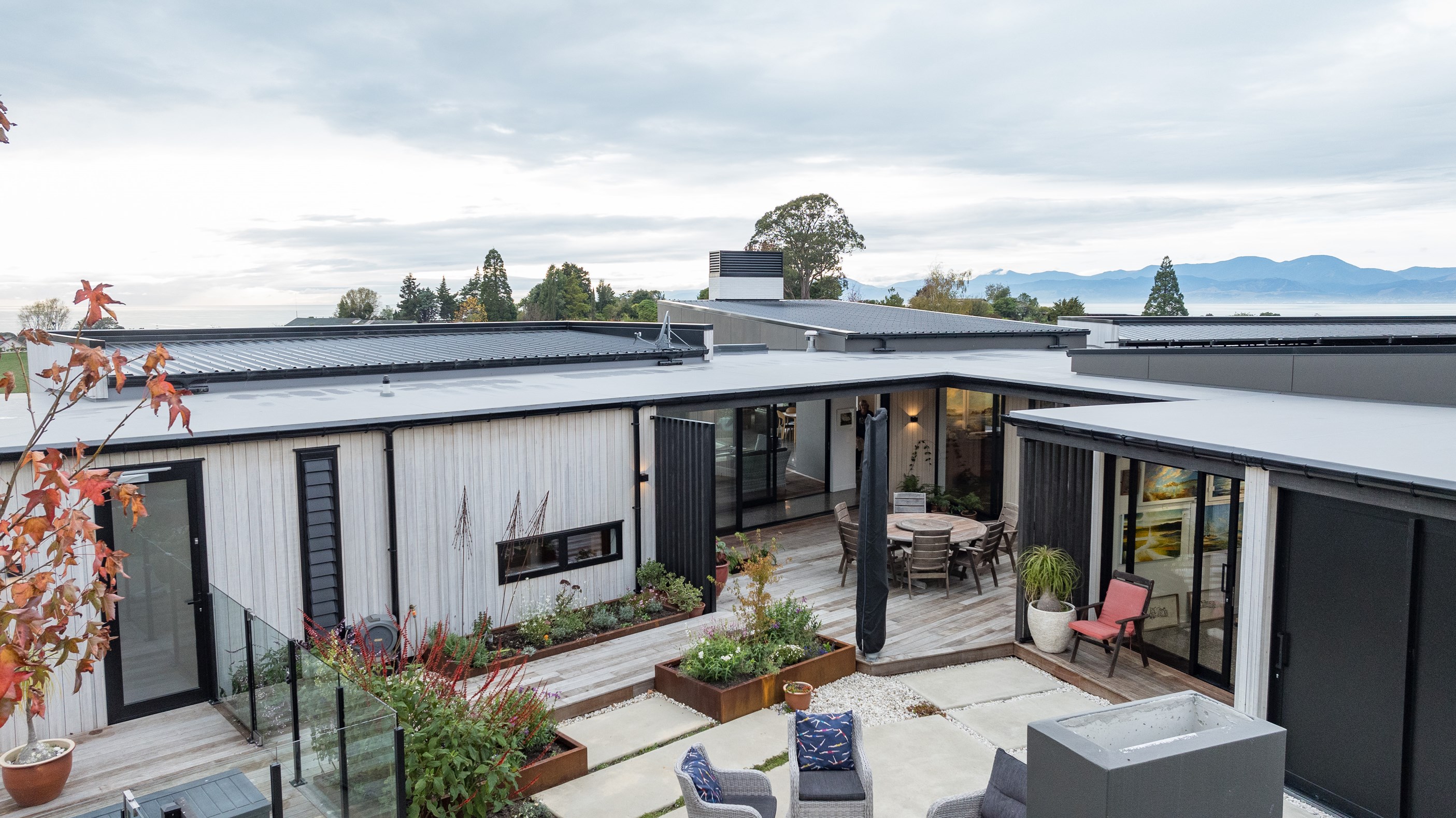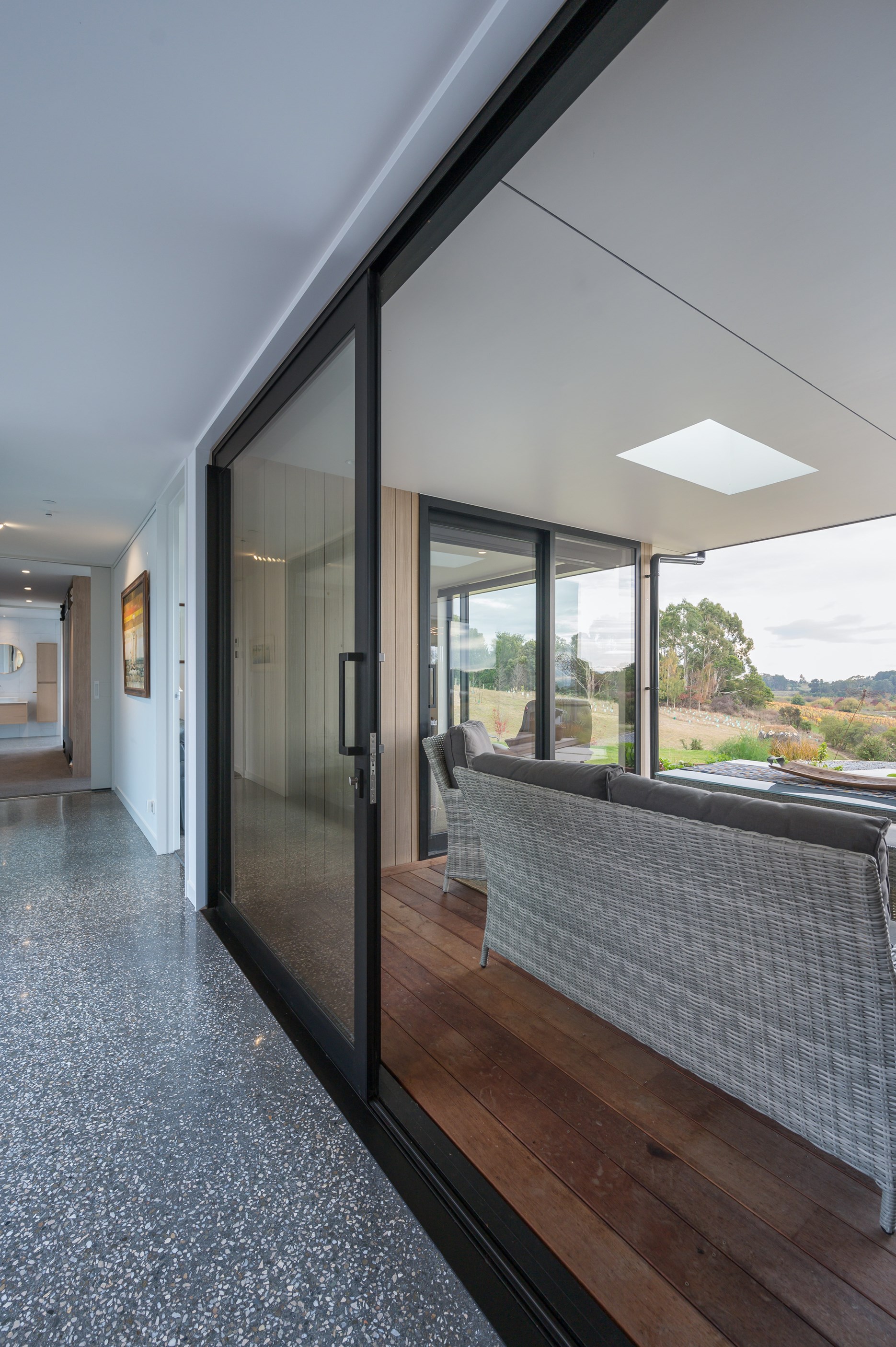 Designed to fit nicely to a re-claimed platform, this ultra-modern home has also been positioned to maximise extensive Ruby Bay views. The living area provides a long central spine with bedroom wings spanning out on either side taking the form of a plane or bird. The hand of the artist owner is evident throughout with blue and yellow panels adding colour to the otherwise black, white and timber exterior also visible from inside. The hallway which runs through the bedroom wing, with a window at floor level, becomes a gallery and art is hung on every wall that doesn’t have a large picture window.