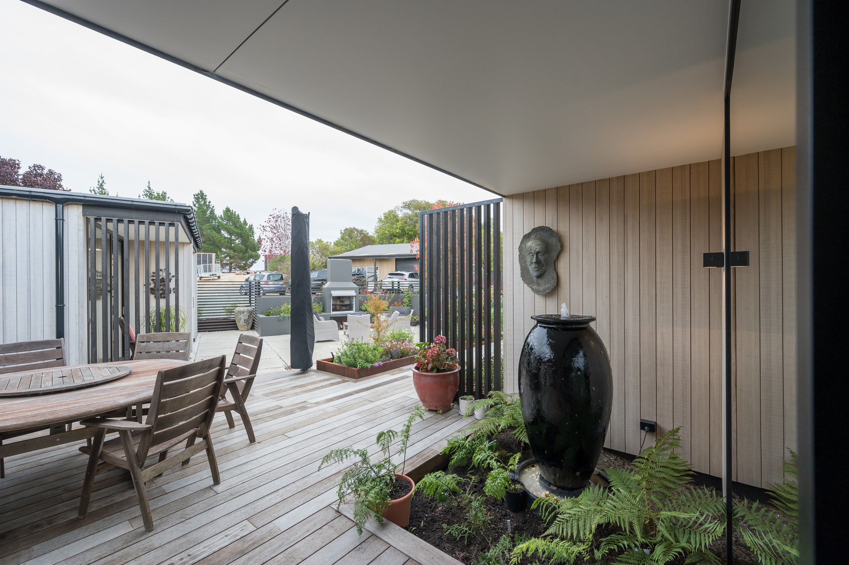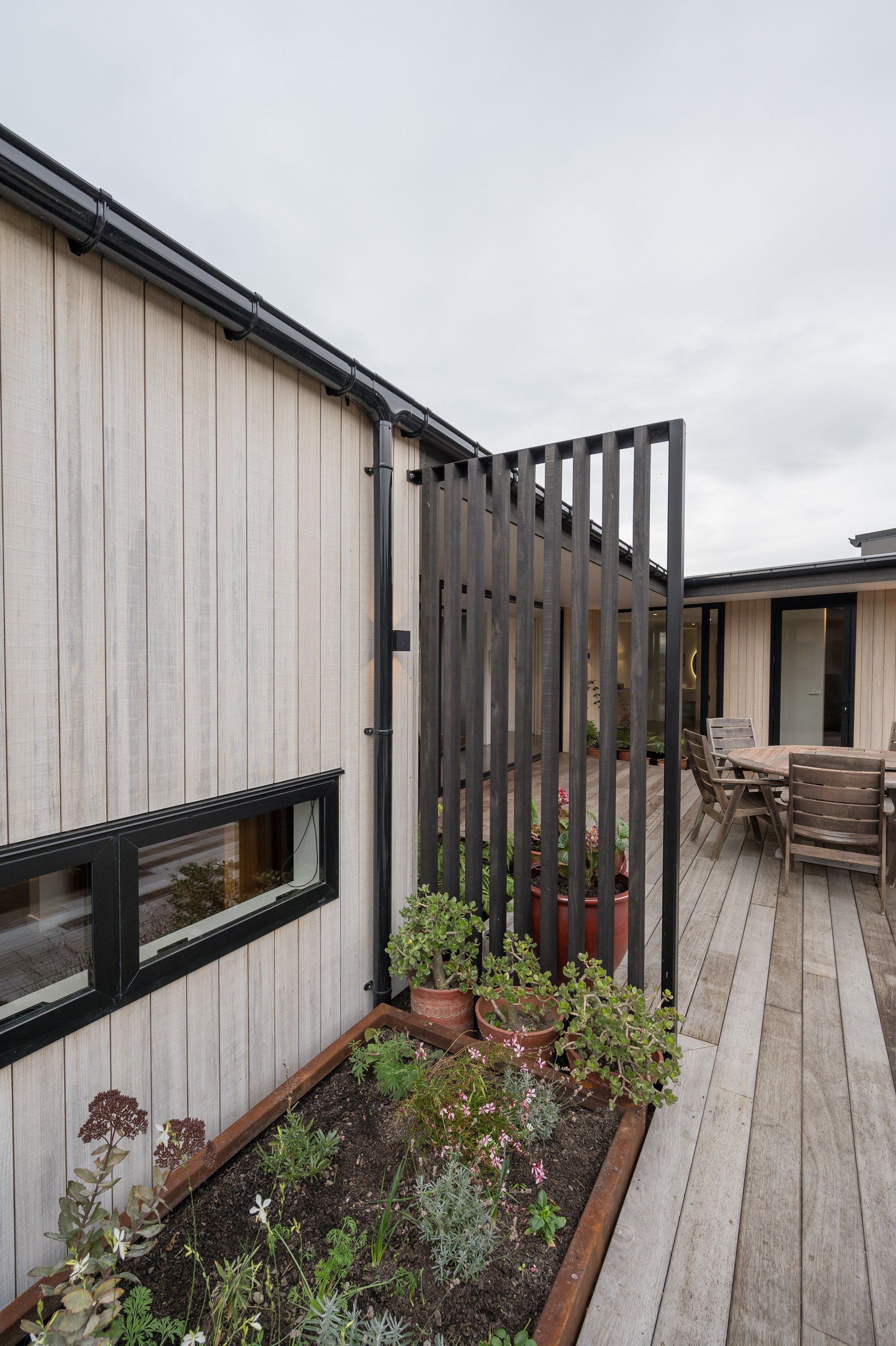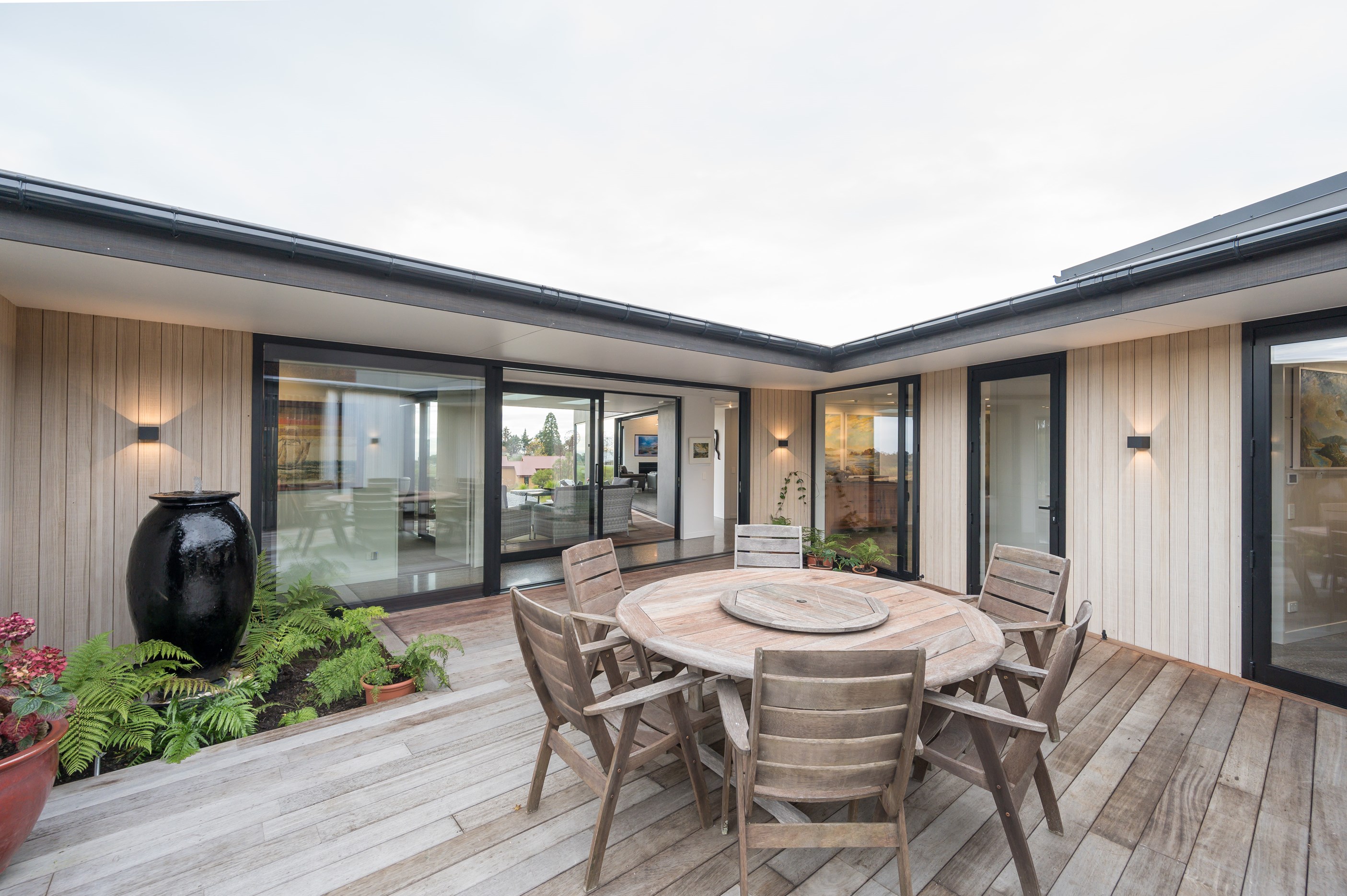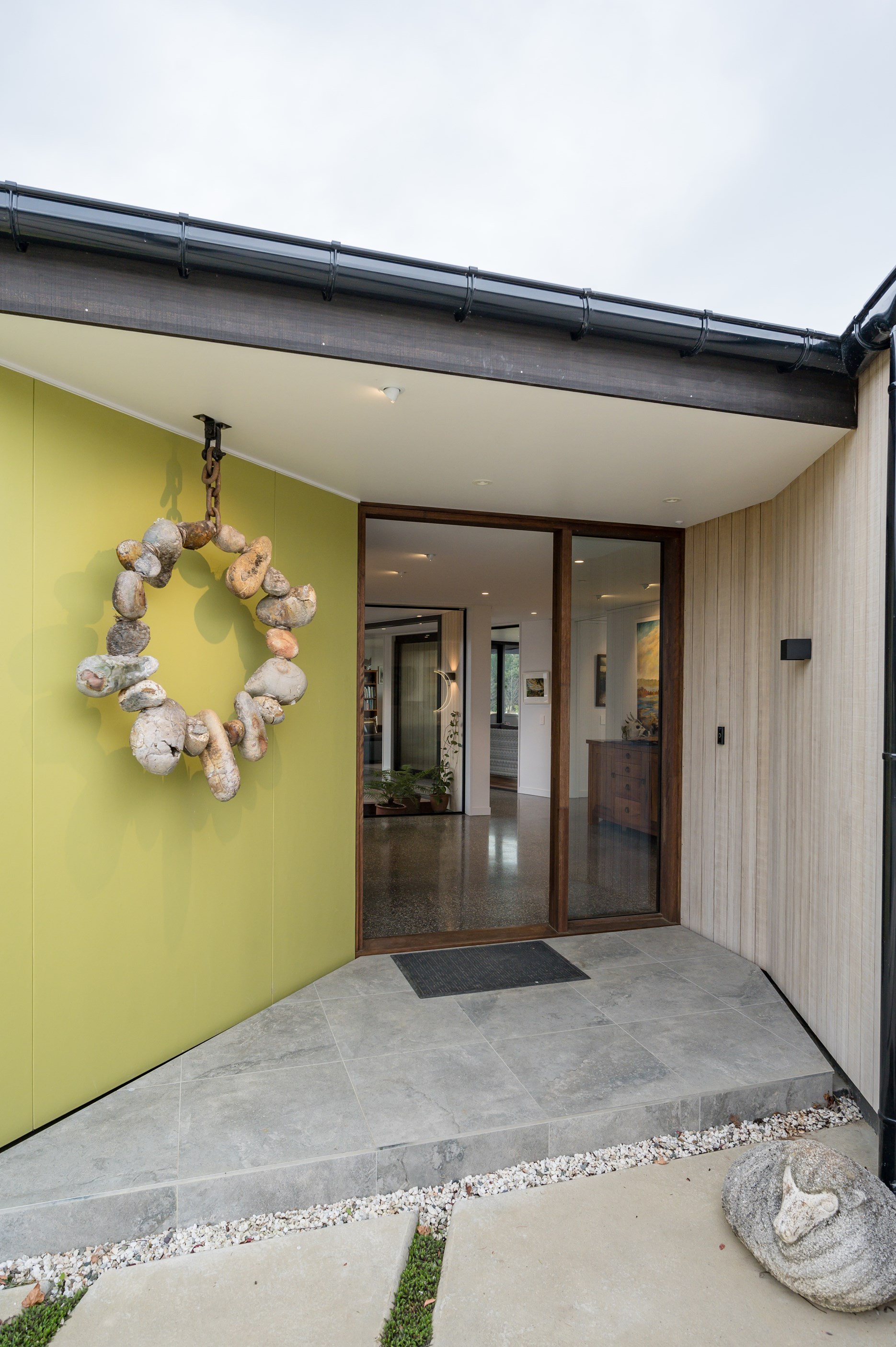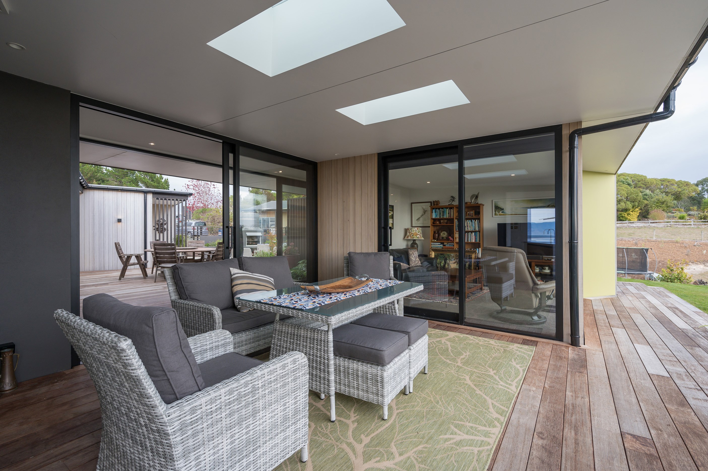 Designed to fit nicely to a re-claimed platform, this ultra-modern home has also been positioned to maximise extensive Ruby Bay views. The living area provides a long central spine with bedroom wings spanning out on either side taking the form of a plane or bird. The hand of the artist owner is evident throughout with blue and yellow panels adding colour to the otherwise black, white and timber exterior also visible from inside. The hallway which runs through the bedroom wing, with a window at floor level, becomes a gallery and art is hung on every wall that doesn’t have a large picture window.