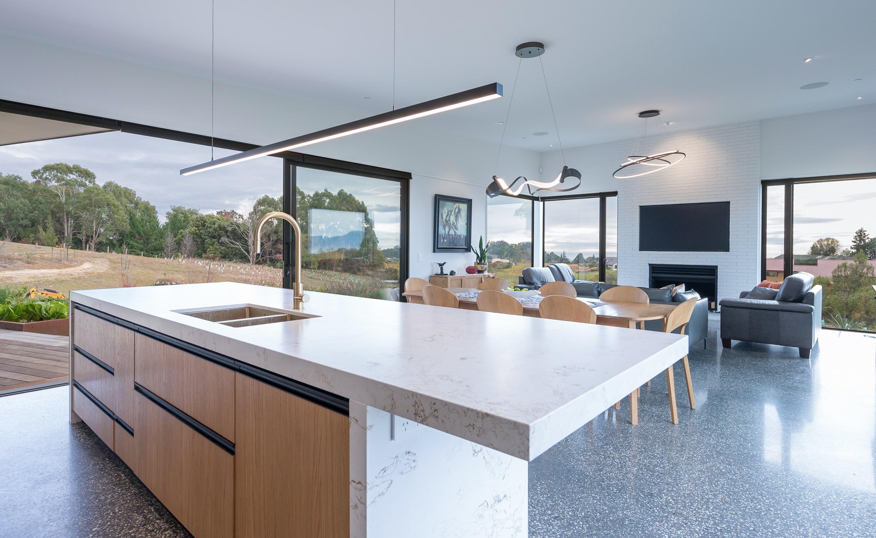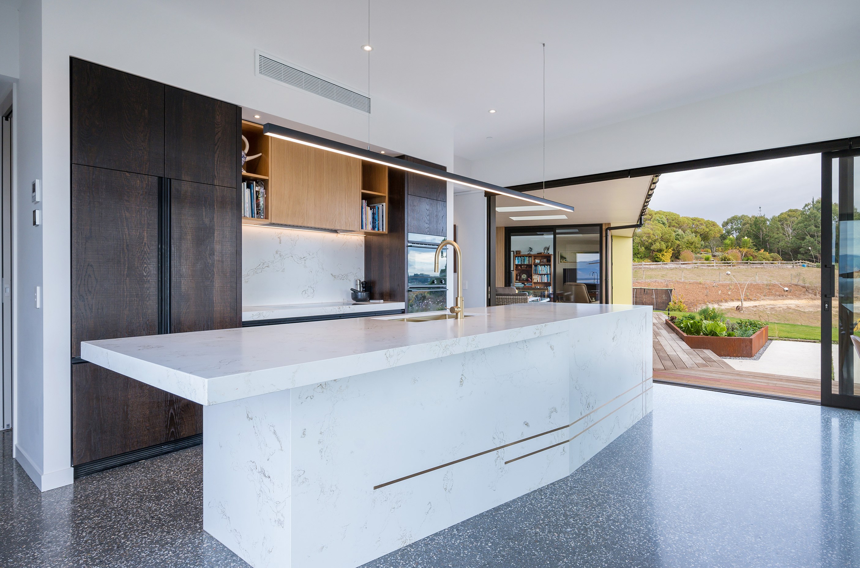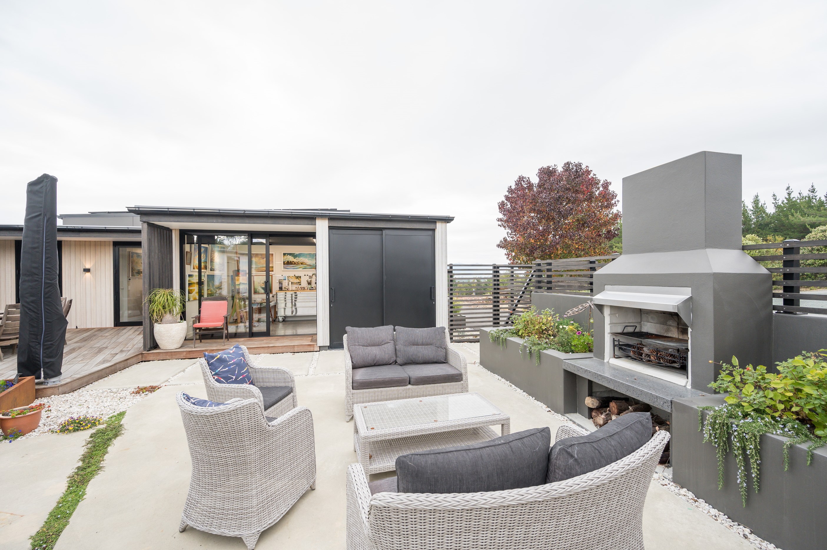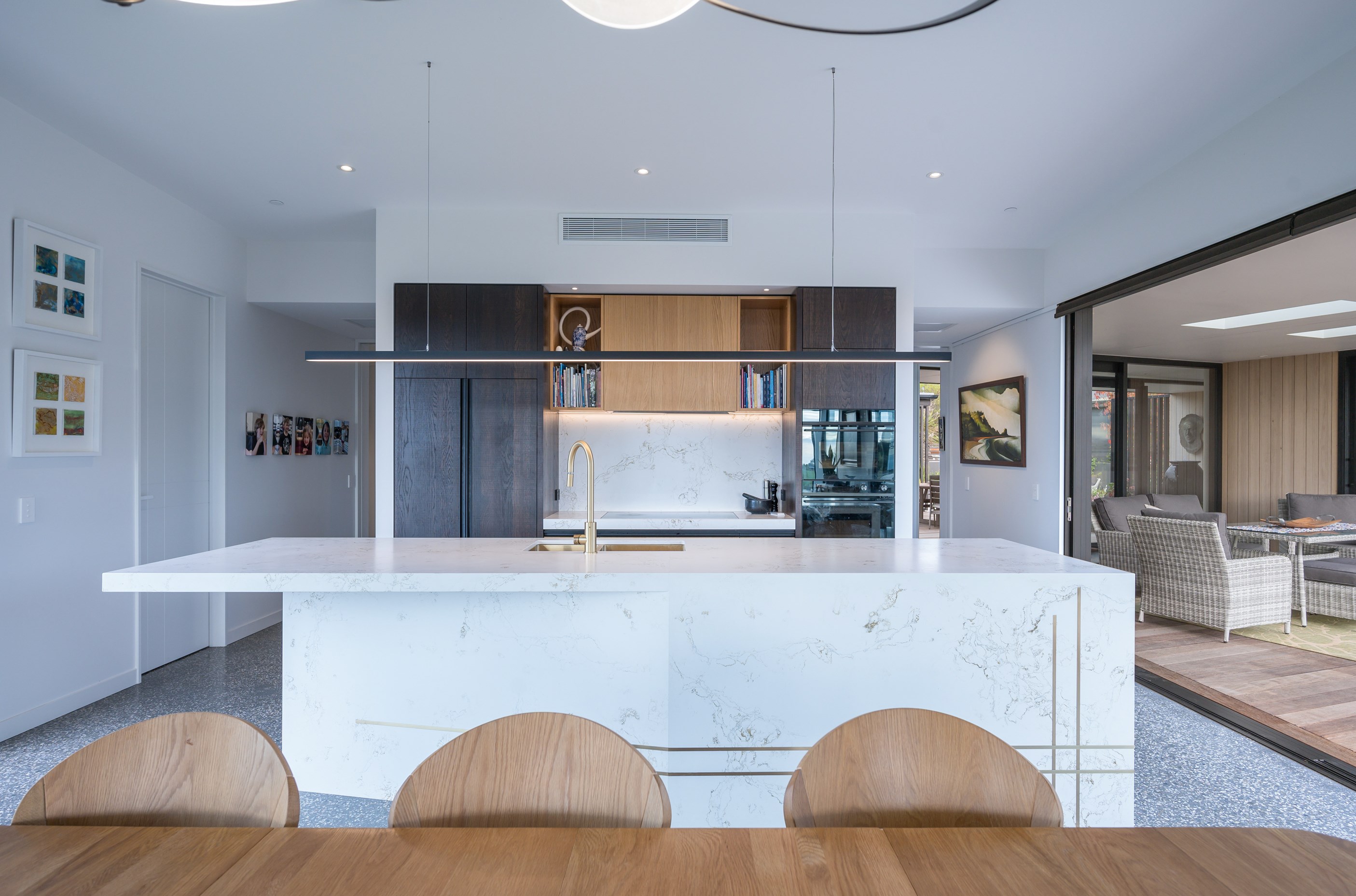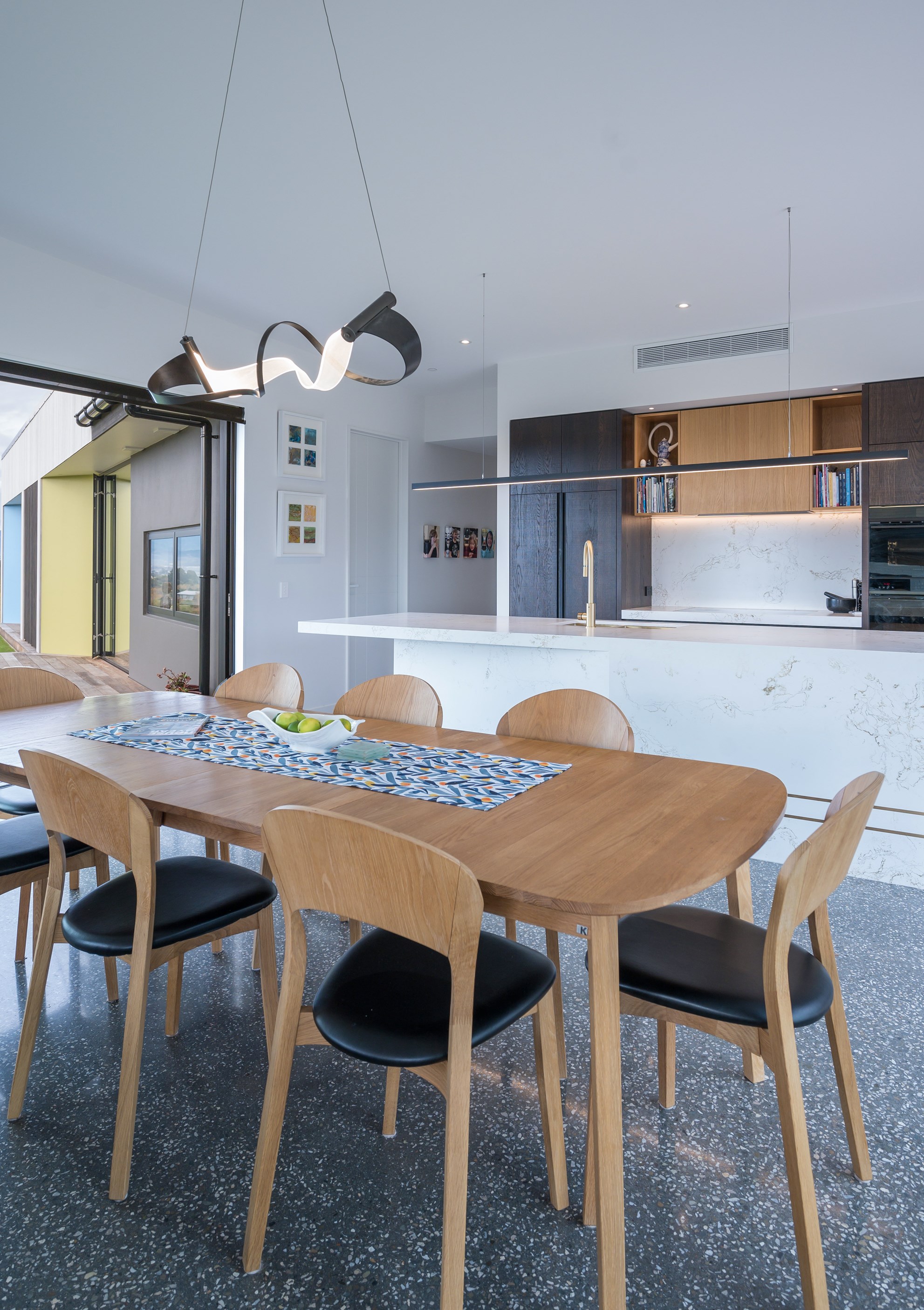 Graphic wallpaper works to lift a couple of corners, a brick fireplace features at the end of the living room and timber cabinetry adds to what is mostly a neutral palette with exposed aggregate concrete floors. Everything is thermally efficient with solar panels and battery storage making the home power neutral. Spaces have been designed to specific requirements with AM and PM alfresco decks, an office, a snug adjacent to the main suite (which leads out to the pool and spa) and an artist’s studio. A large, angled island defines the kitchen. Floor-to-ceiling cupboards line the laundry and bathrooms have generous proportions.