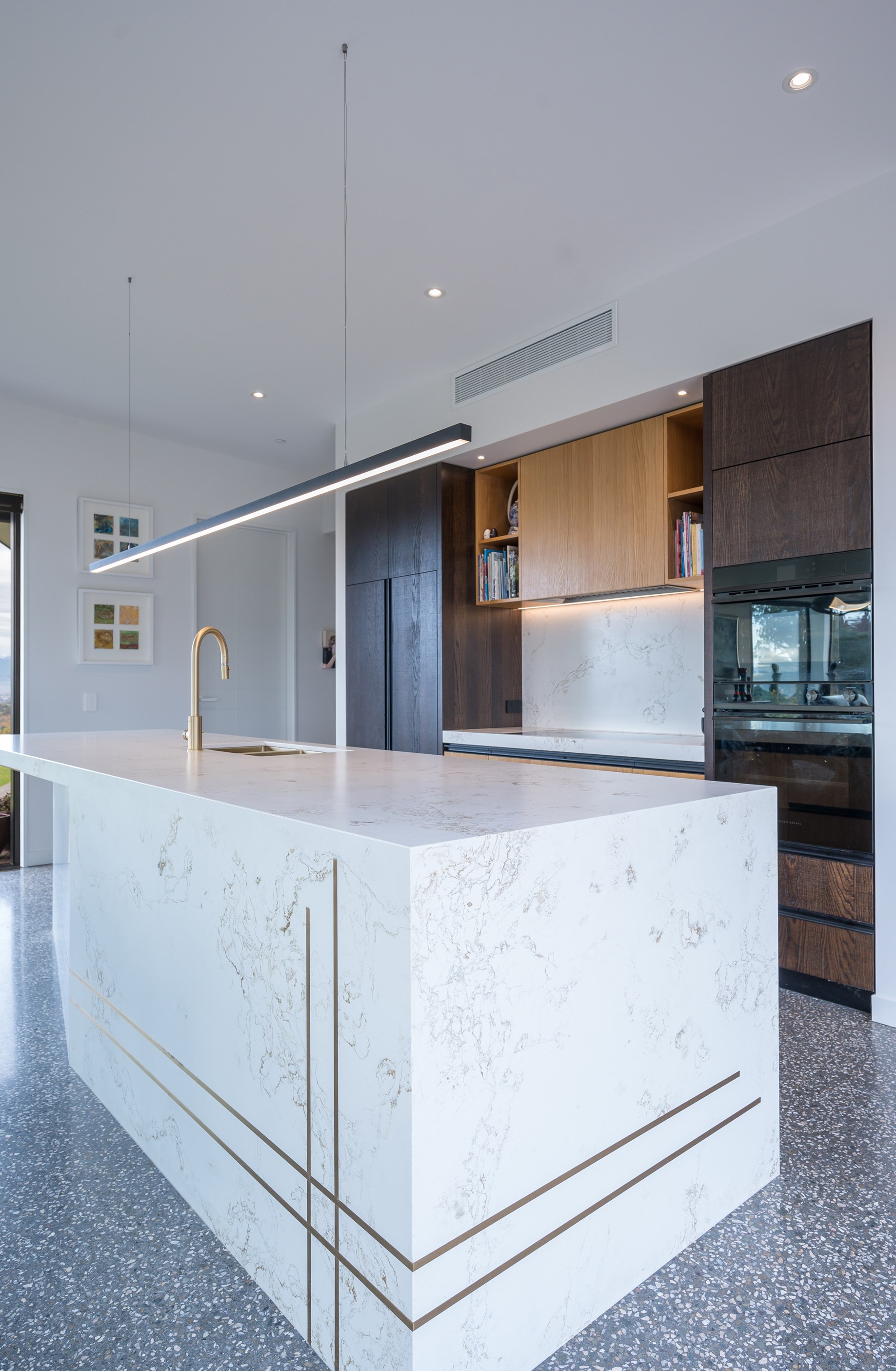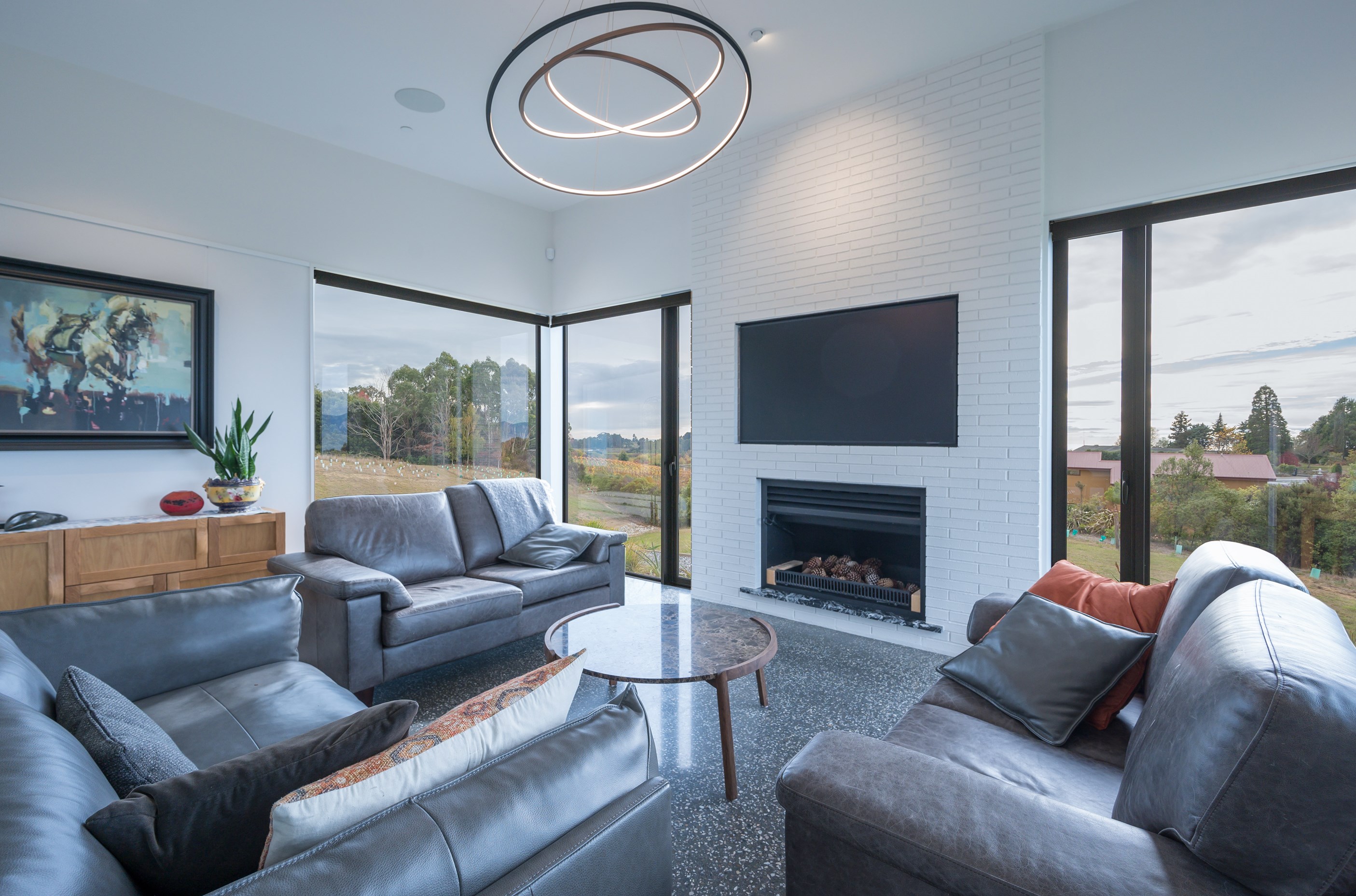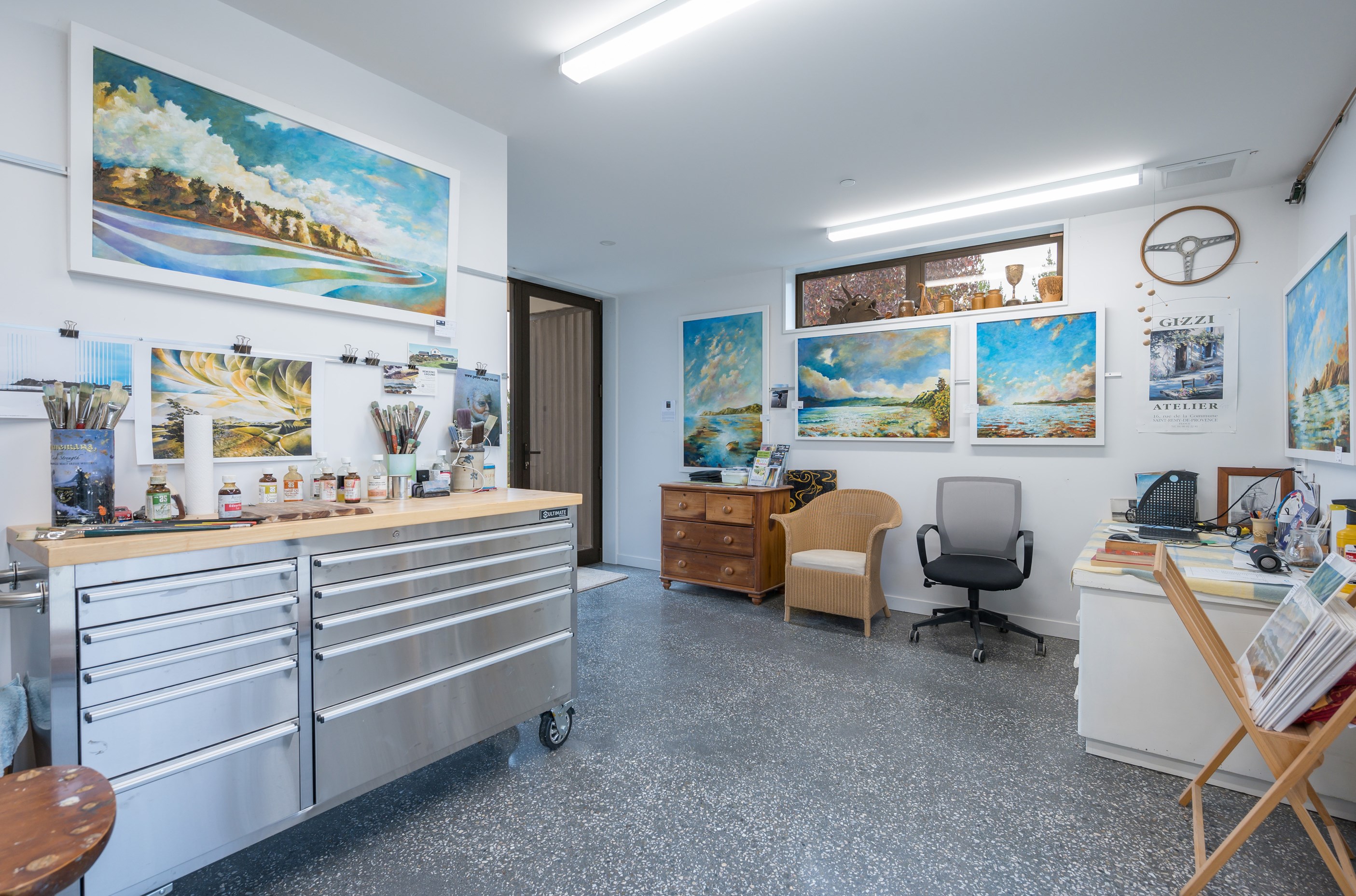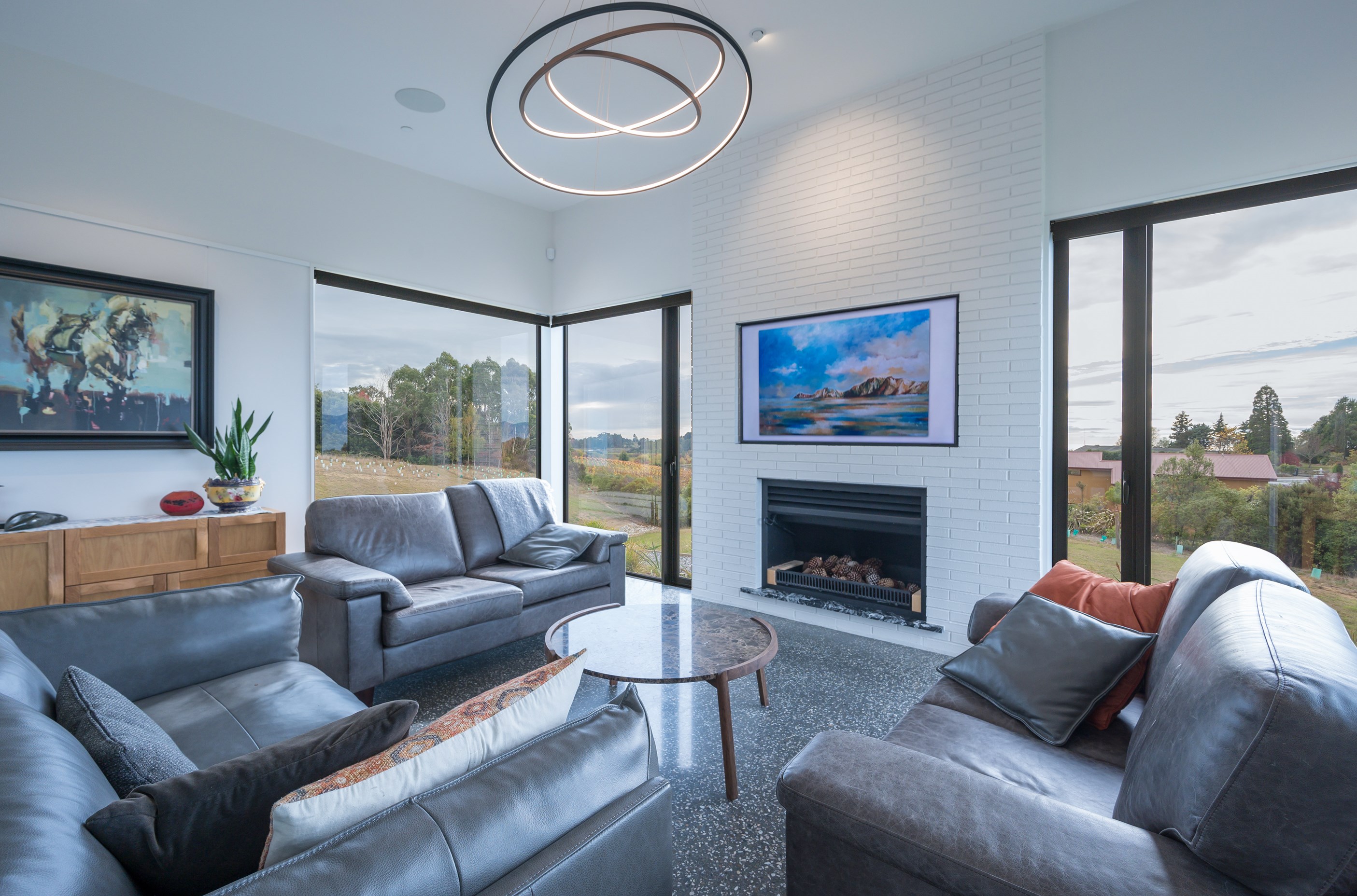 Graphic wallpaper works to lift a couple of corners, a brick fireplace features at the end of the living room and timber cabinetry adds to what is mostly a neutral palette with exposed aggregate concrete floors. Everything is thermally efficient with solar panels and battery storage making the home power neutral. Spaces have been designed to specific requirements with AM and PM alfresco decks, an office, a snug adjacent to the main suite (which leads out to the pool and spa) and an artist’s studio. A large, angled island defines the kitchen. Floor-to-ceiling cupboards line the laundry and bathrooms have generous proportions.
