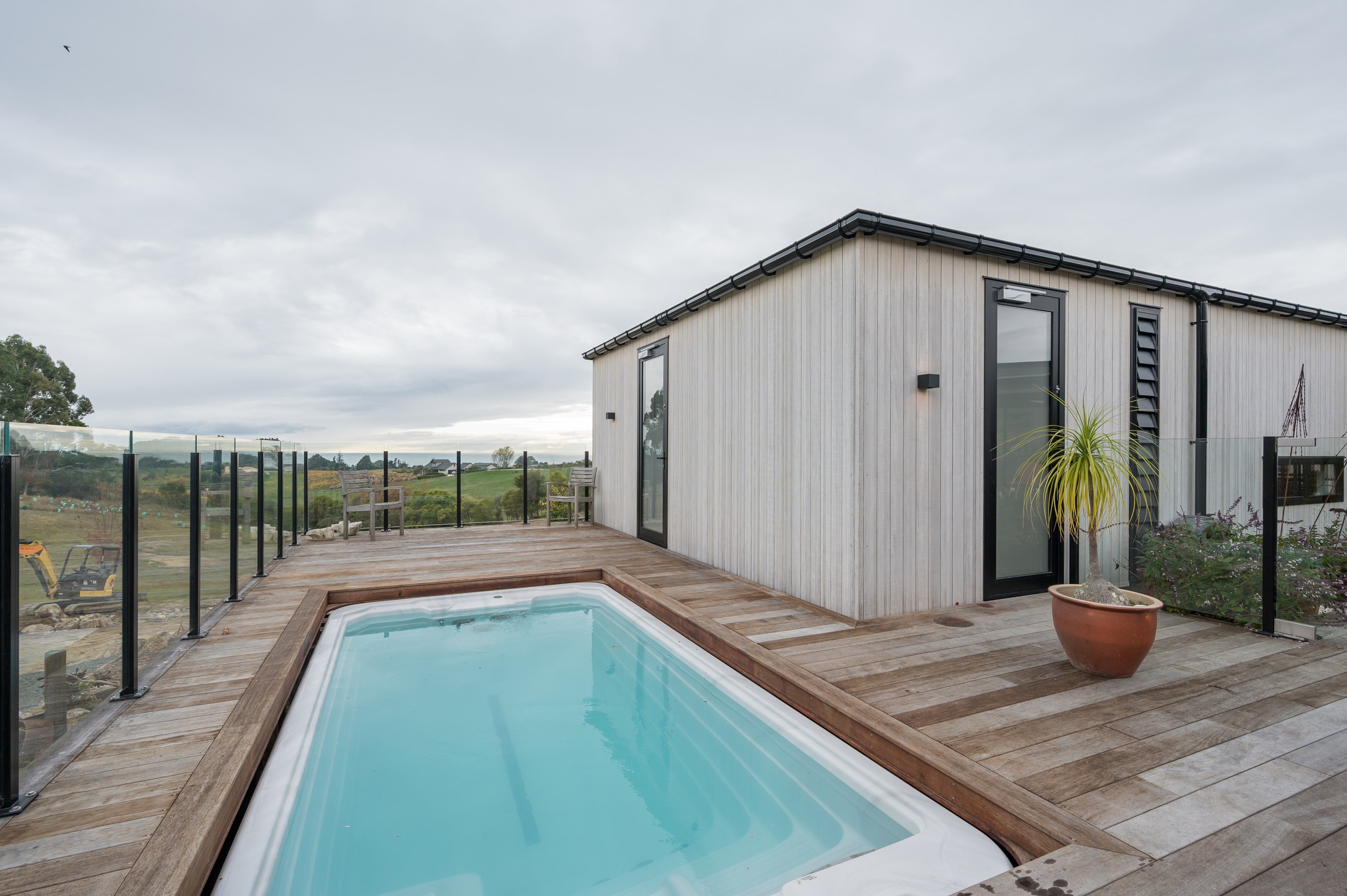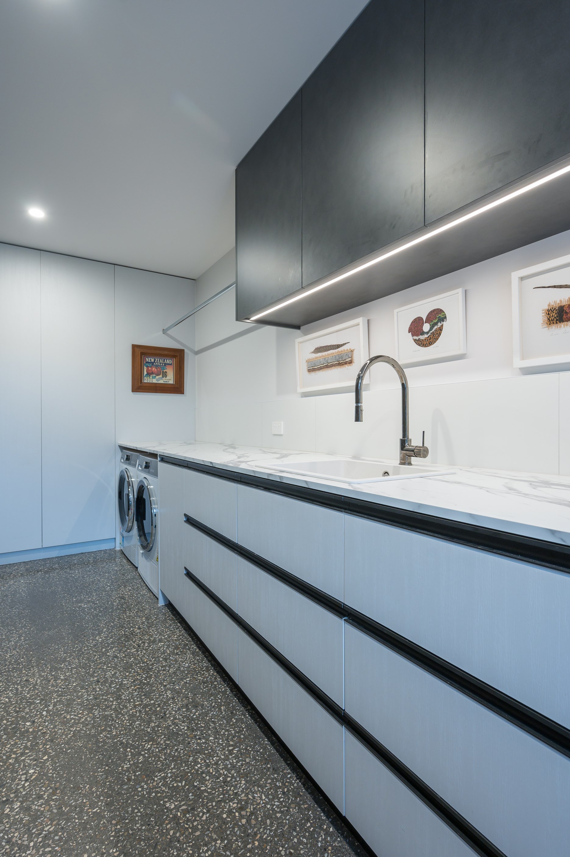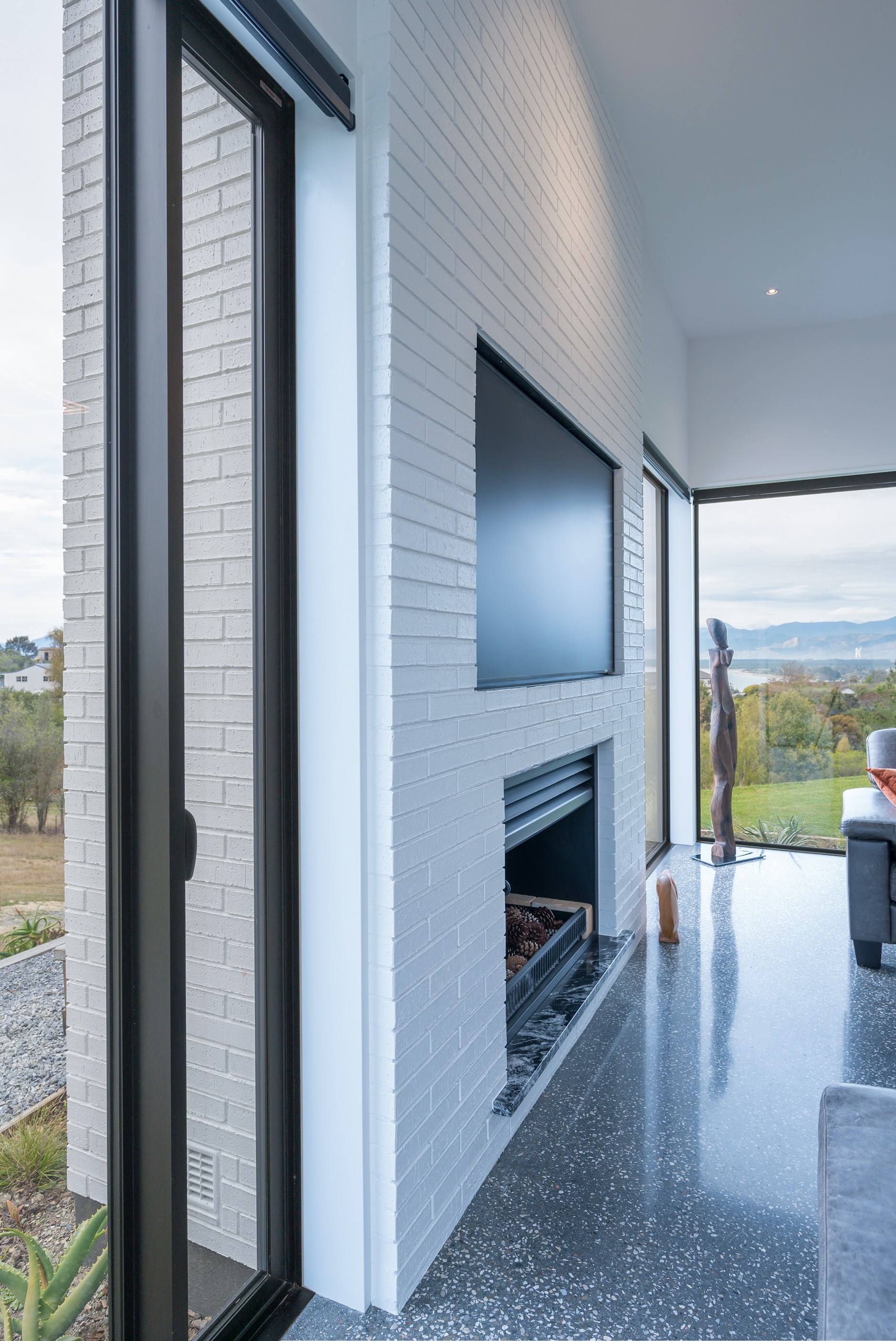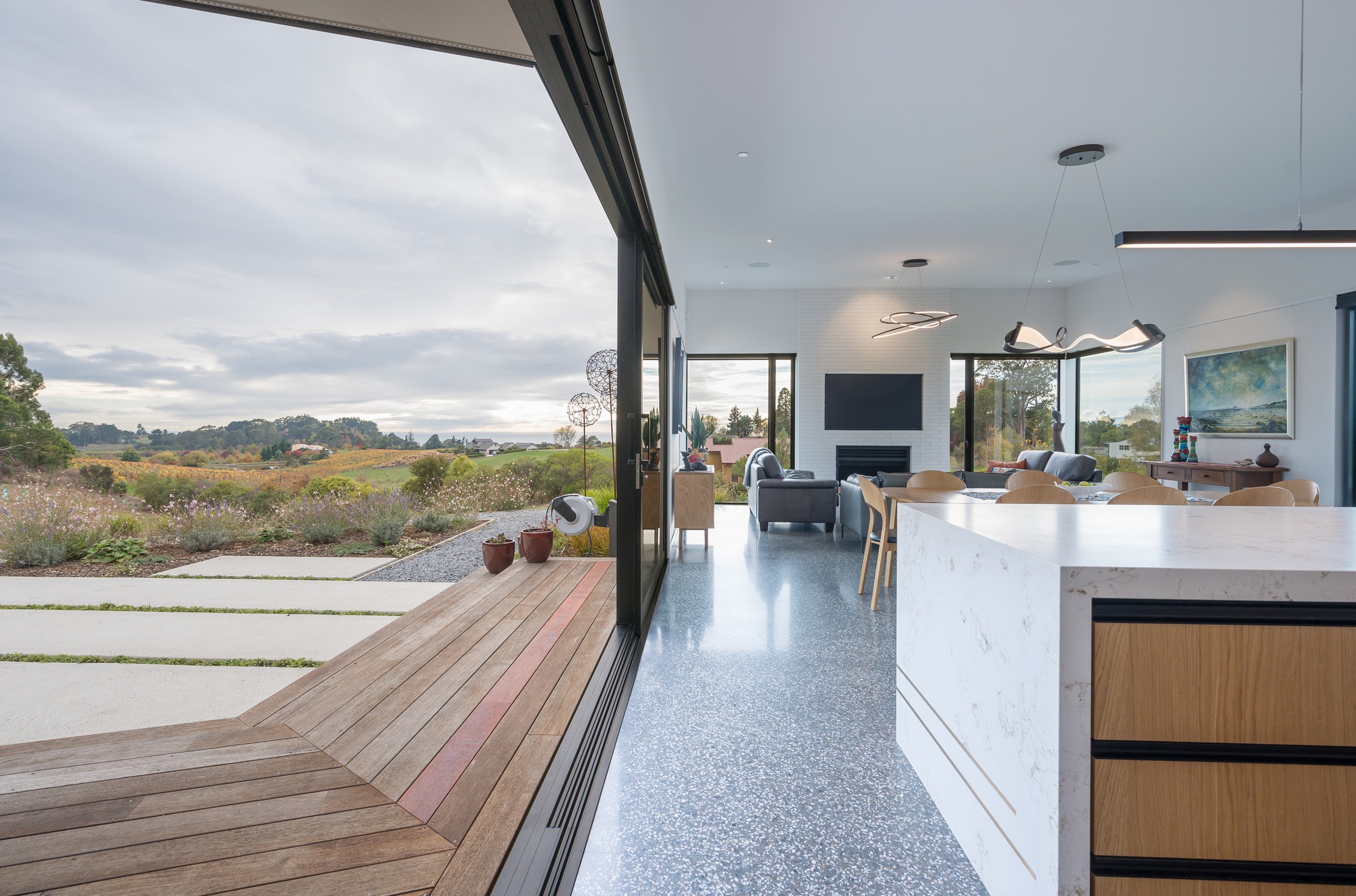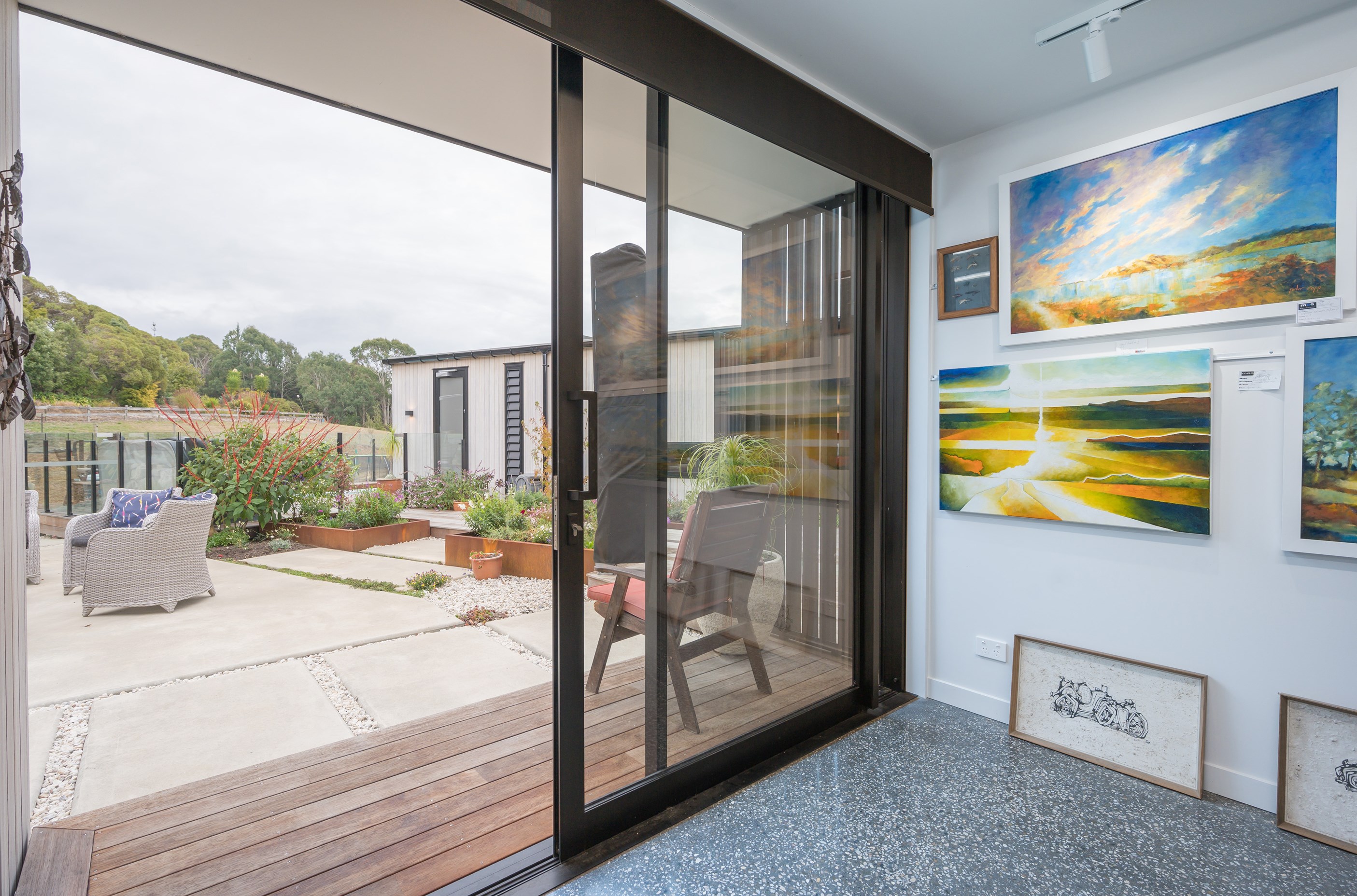 Graphic wallpaper works to lift a couple of corners, a brick fireplace features at the end of the living room and timber cabinetry adds to what is mostly a neutral palette with exposed aggregate concrete floors. Everything is thermally efficient with solar panels and battery storage making the home power neutral. Spaces have been designed to specific requirements with AM and PM alfresco decks, an office, a snug adjacent to the main suite (which leads out to the pool and spa) and an artist’s studio. A large, angled island defines the kitchen. Floor-to-ceiling cupboards line the laundry and bathrooms have generous proportions.