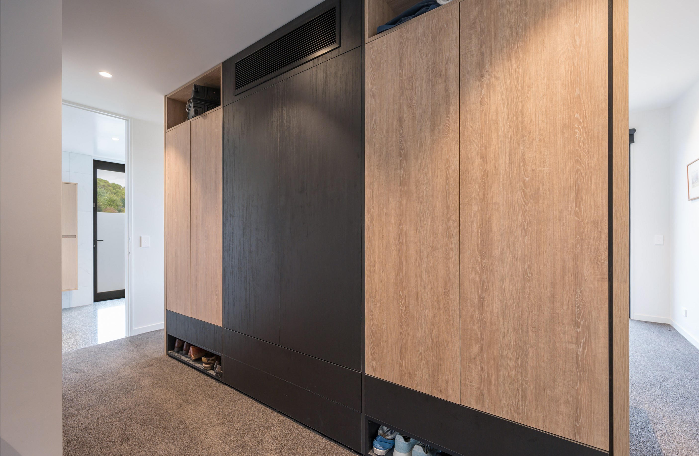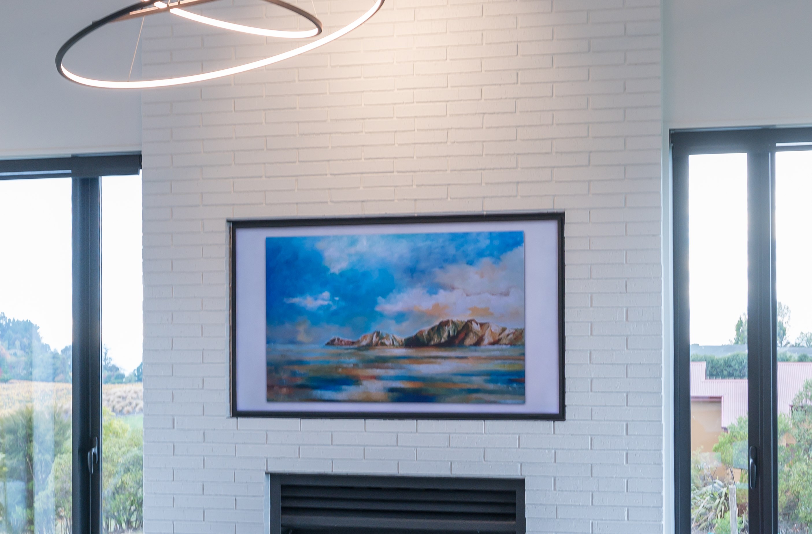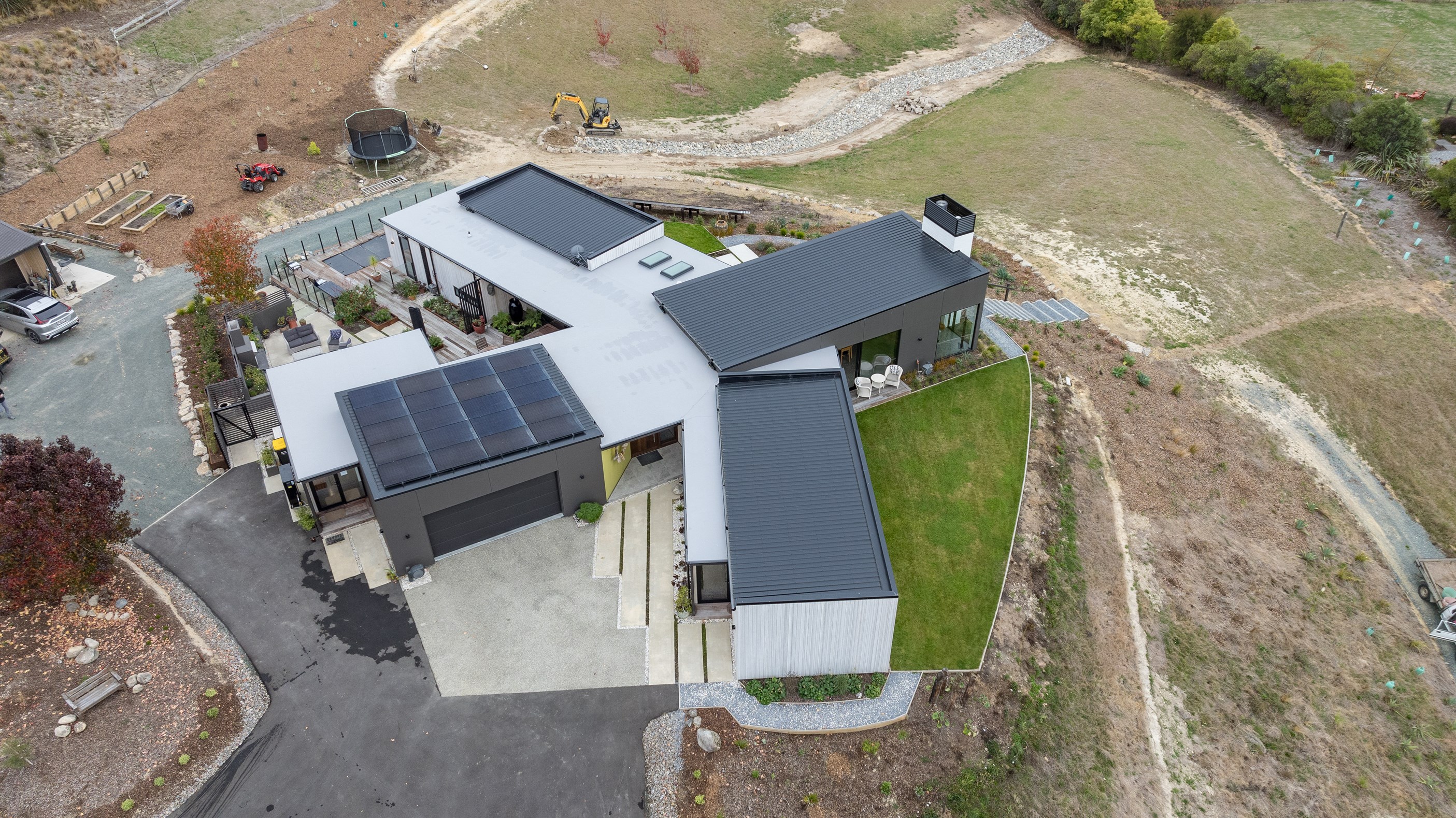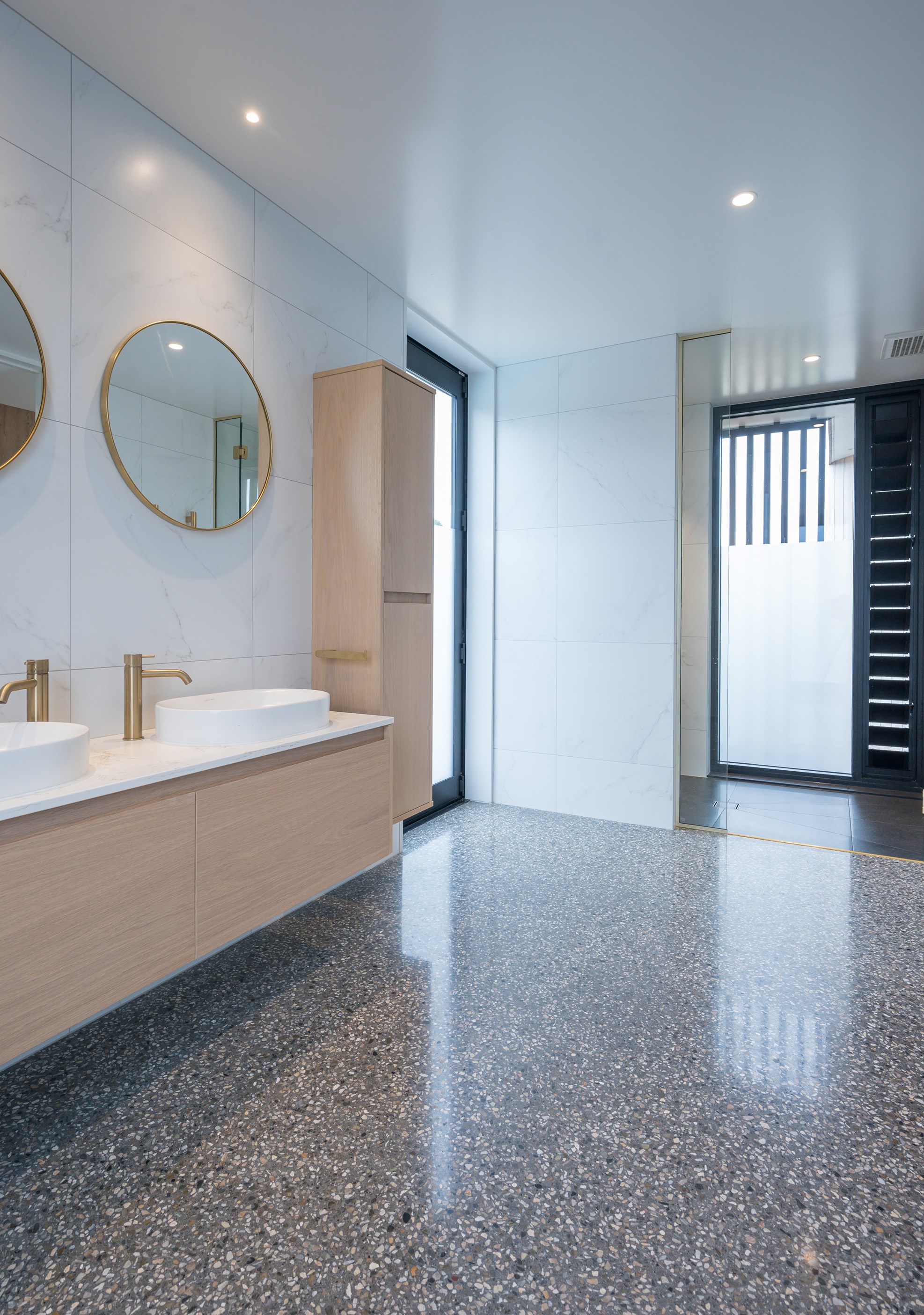 Graphic wallpaper works to lift a couple of corners, a brick fireplace features at the end of the living room and timber cabinetry adds to what is mostly a neutral palette with exposed aggregate concrete floors. Everything is thermally efficient with solar panels and battery storage making the home power neutral. Spaces have been designed to specific requirements with AM and PM alfresco decks, an office, a snug adjacent to the main suite (which leads out to the pool and spa) and an artist’s studio. A large, angled island defines the kitchen. Floor-to-ceiling cupboards line the laundry and bathrooms have generous proportions.