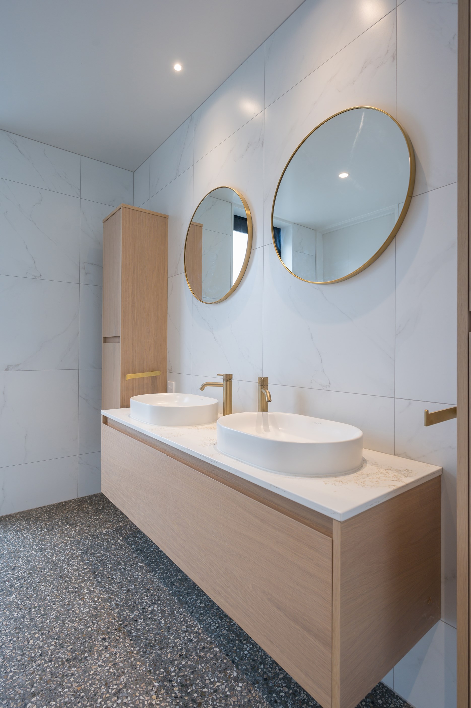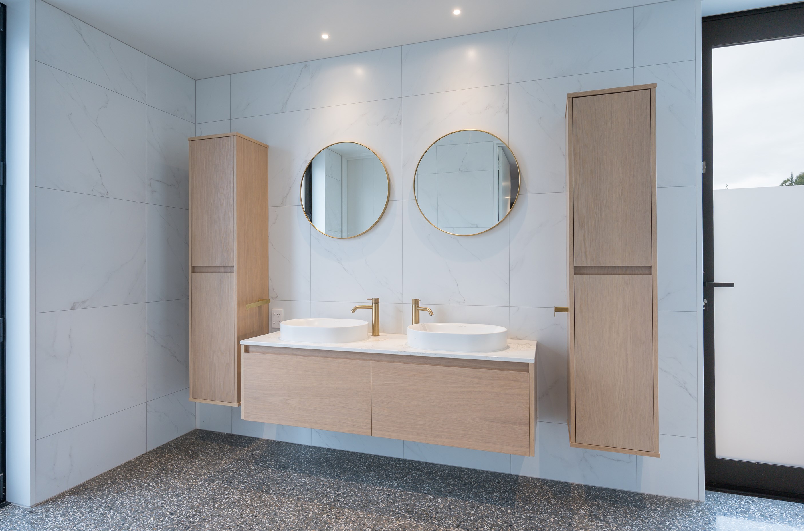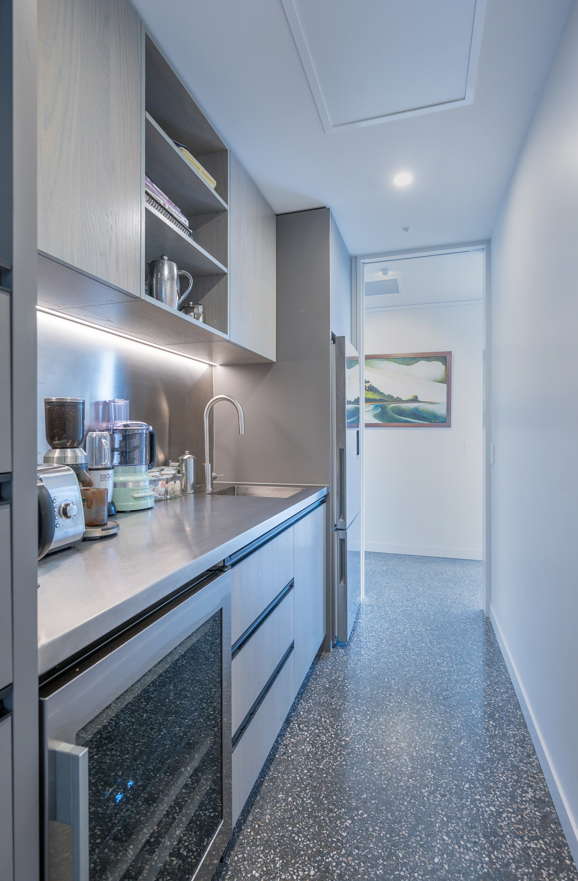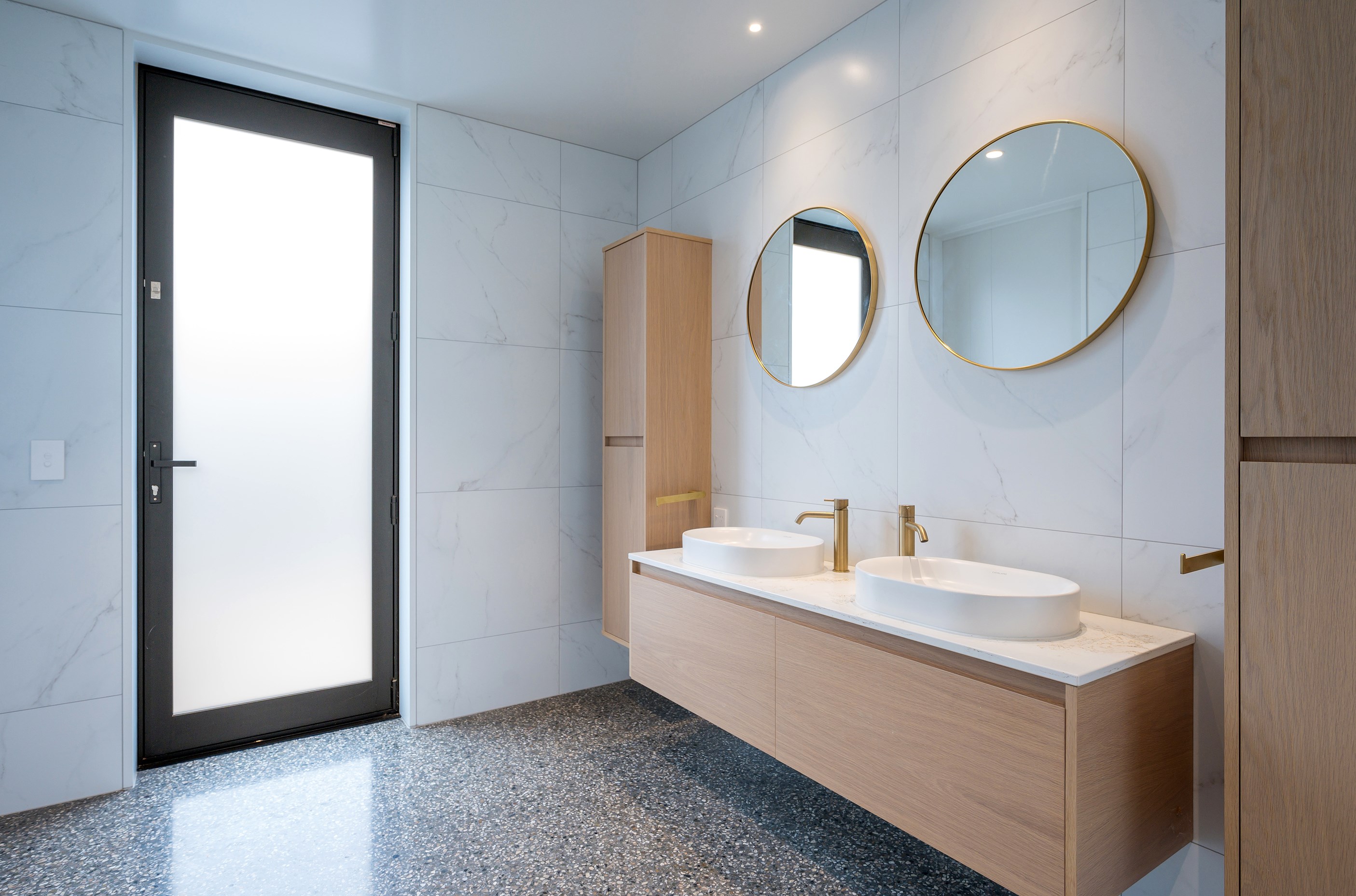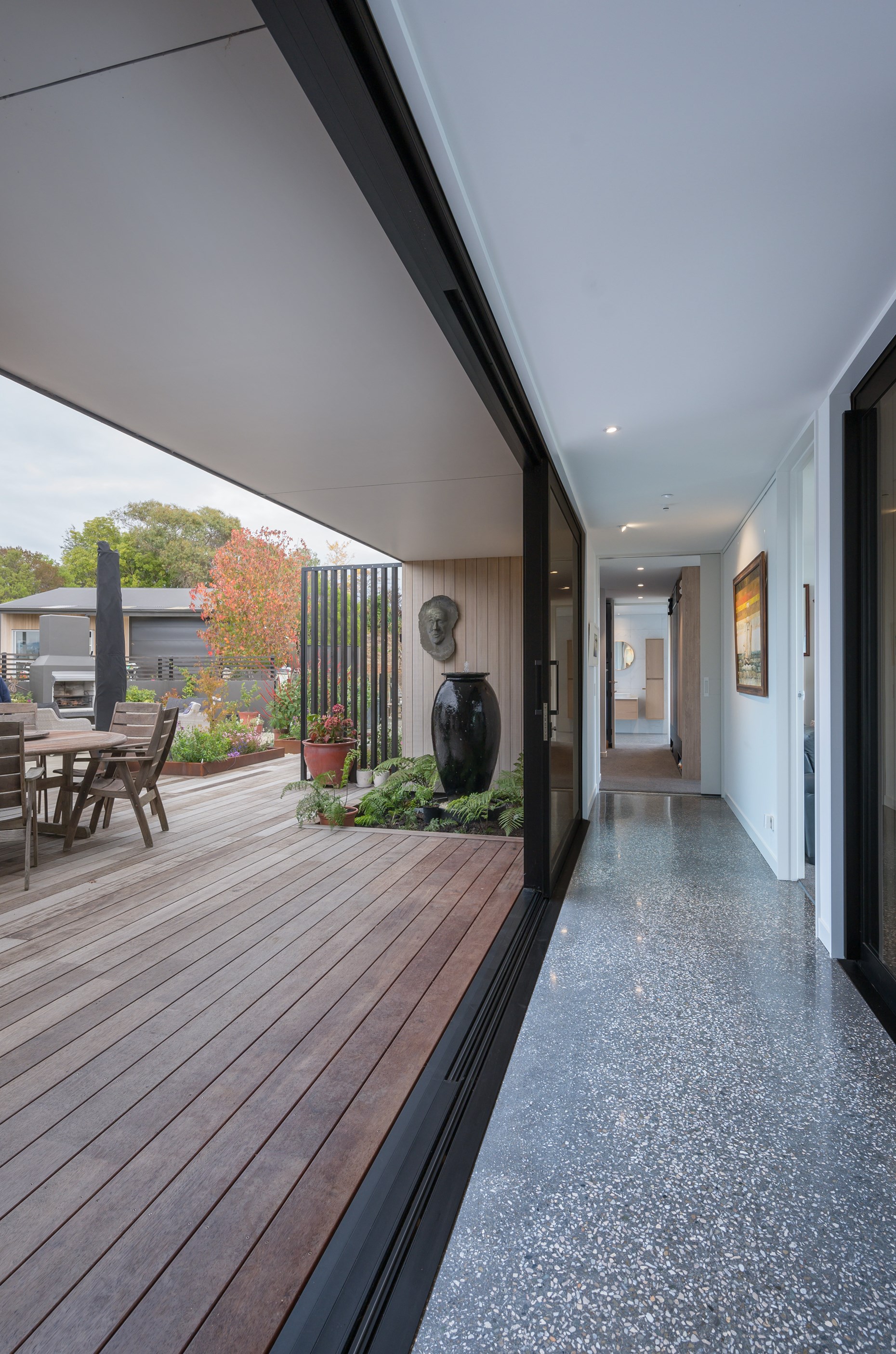 Graphic wallpaper works to lift a couple of corners, a brick fireplace features at the end of the living room and timber cabinetry adds to what is mostly a neutral palette with exposed aggregate concrete floors. Everything is thermally efficient with solar panels and battery storage making the home power neutral. Spaces have been designed to specific requirements with AM and PM alfresco decks, an office, a snug adjacent to the main suite (which leads out to the pool and spa) and an artist’s studio. A large, angled island defines the kitchen. Floor-to-ceiling cupboards line the laundry and bathrooms have generous proportions.