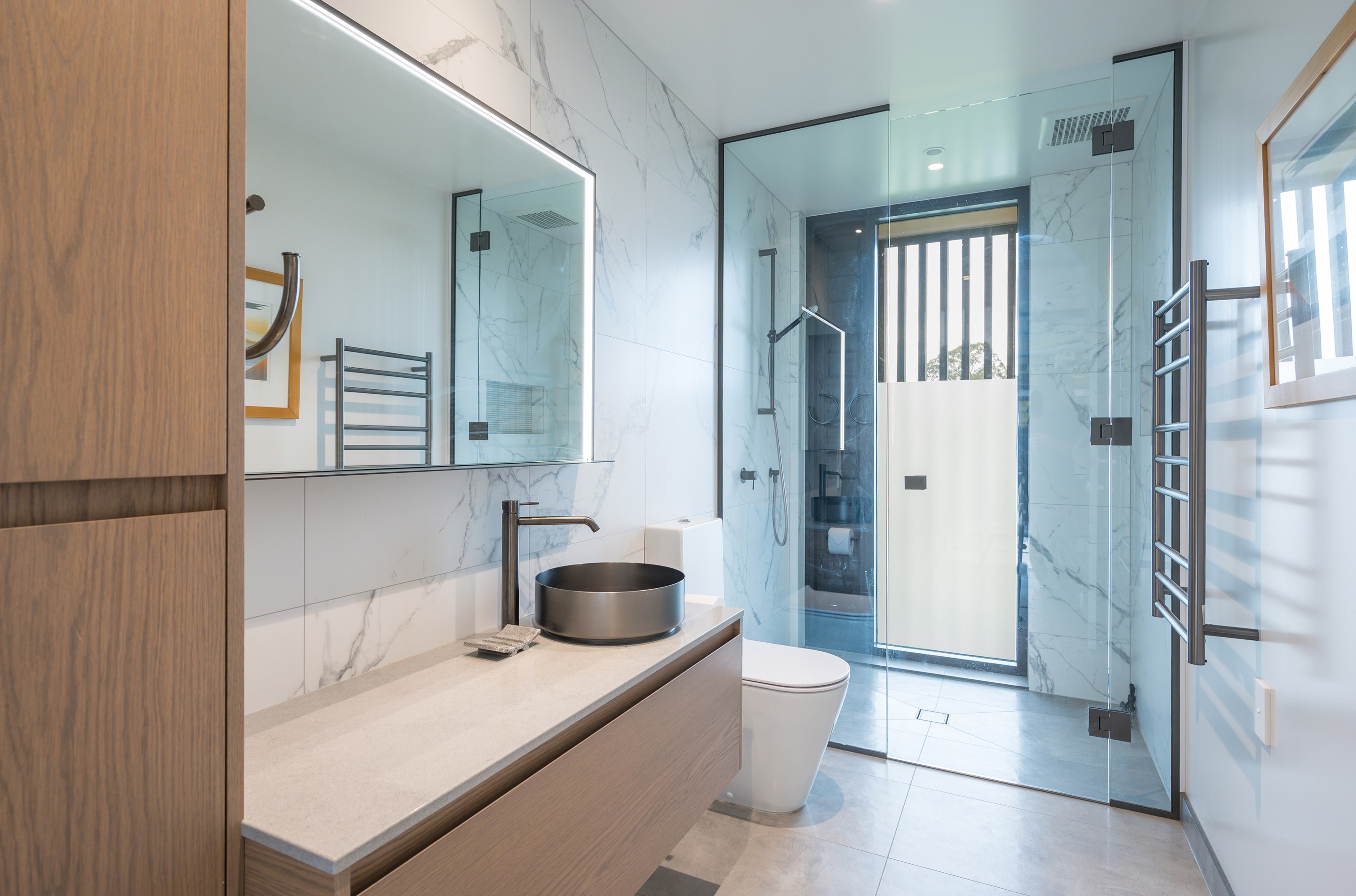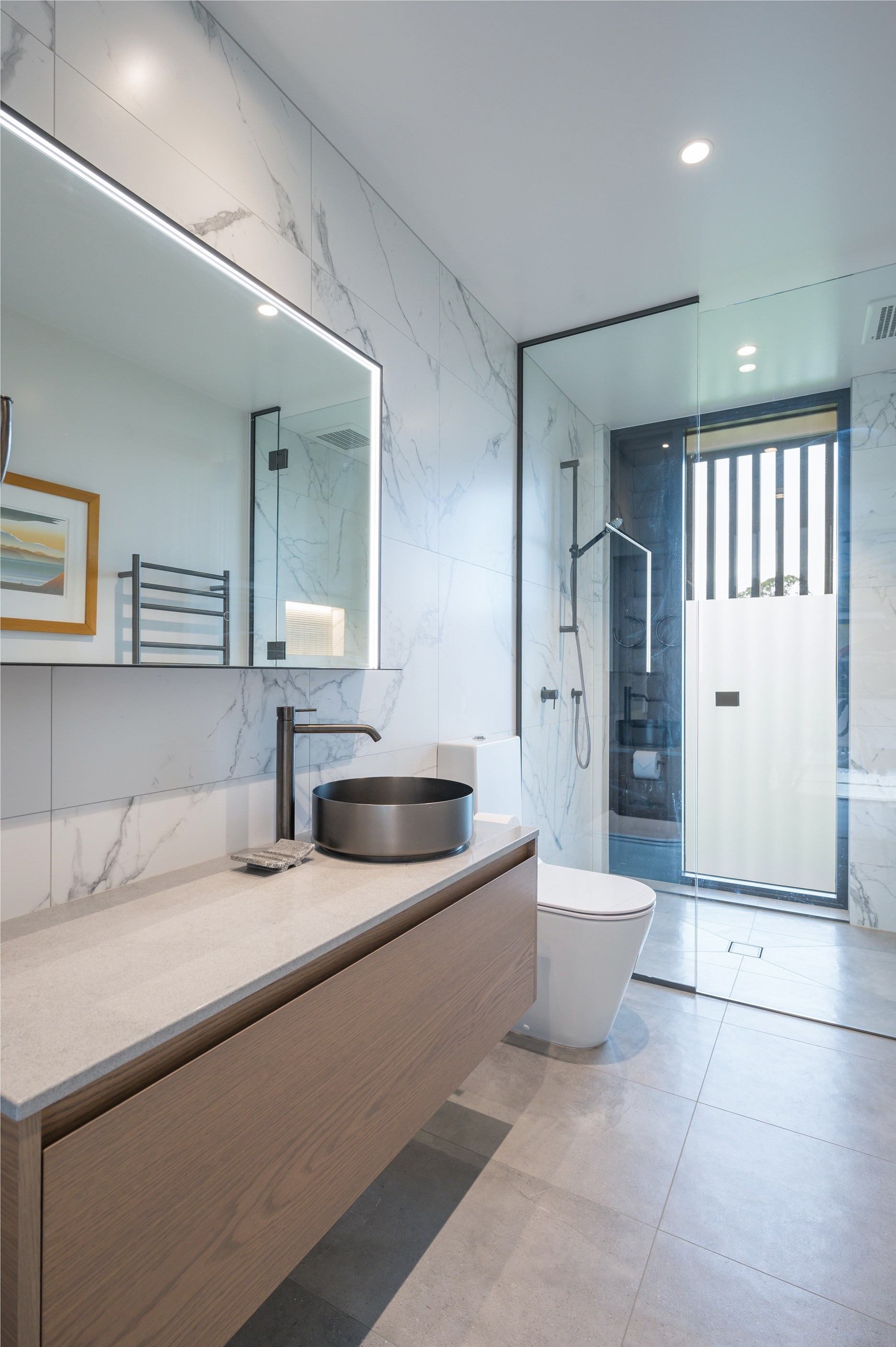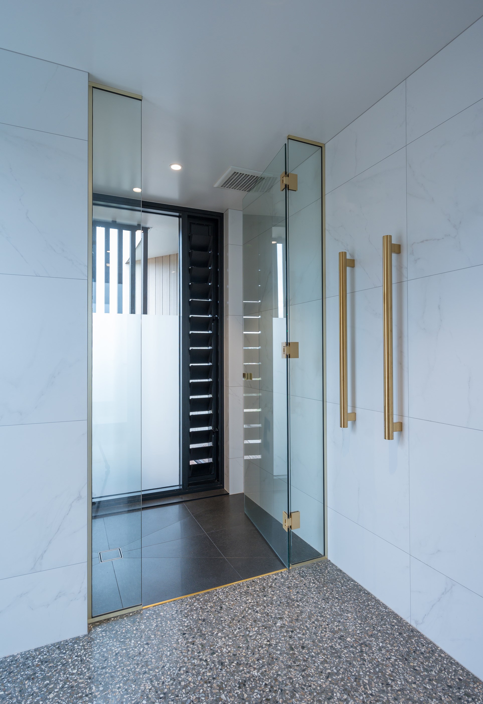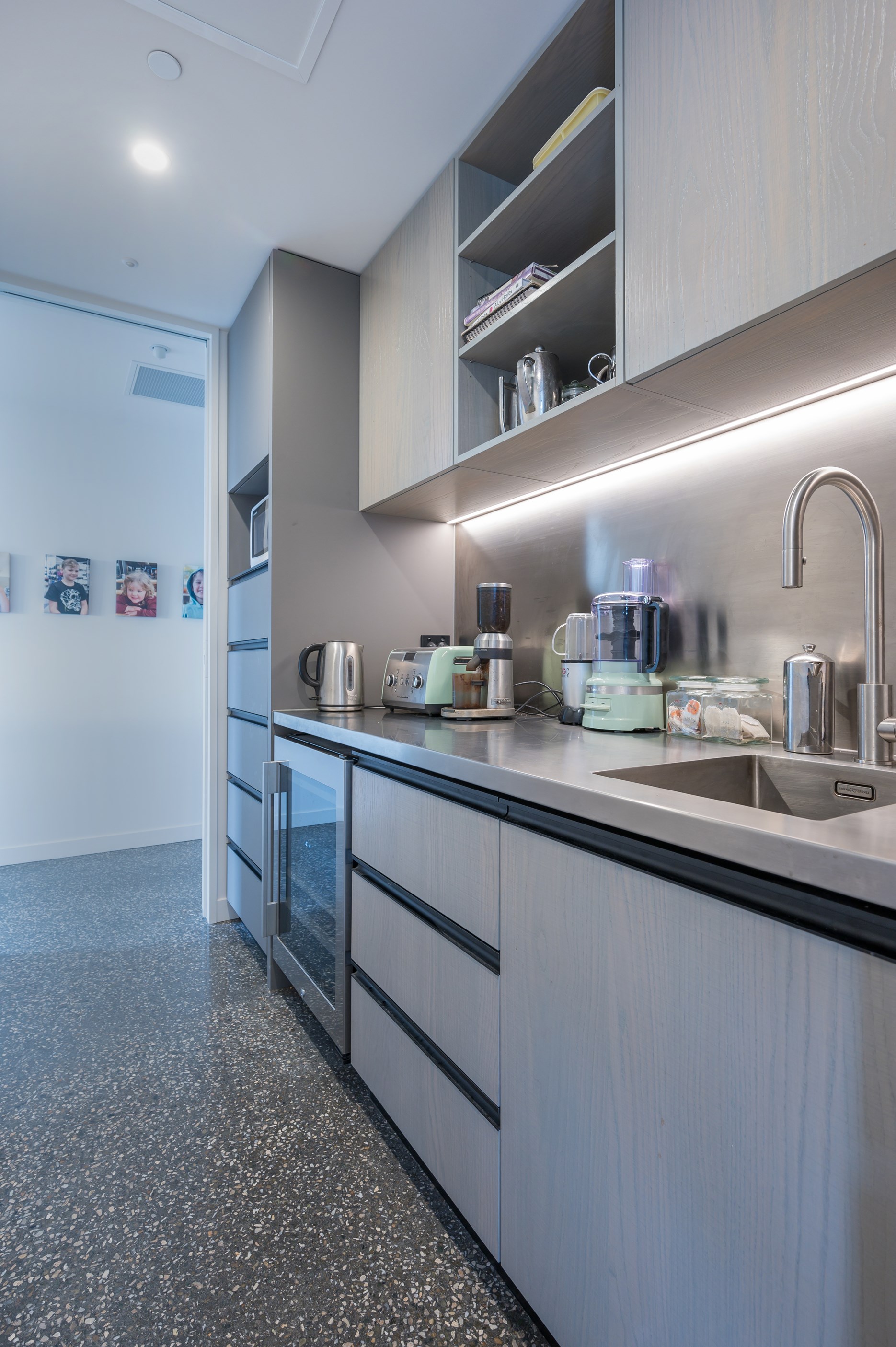 Graphic wallpaper works to lift a couple of corners, a brick fireplace features at the end of the living room and timber cabinetry adds to what is mostly a neutral palette with exposed aggregate concrete floors. Everything is thermally efficient with solar panels and battery storage making the home power neutral. Spaces have been designed to specific requirements with AM and PM alfresco decks, an office, a snug adjacent to the main suite (which leads out to the pool and spa) and an artist’s studio. A large, angled island defines the kitchen. Floor-to-ceiling cupboards line the laundry and bathrooms have generous proportions.