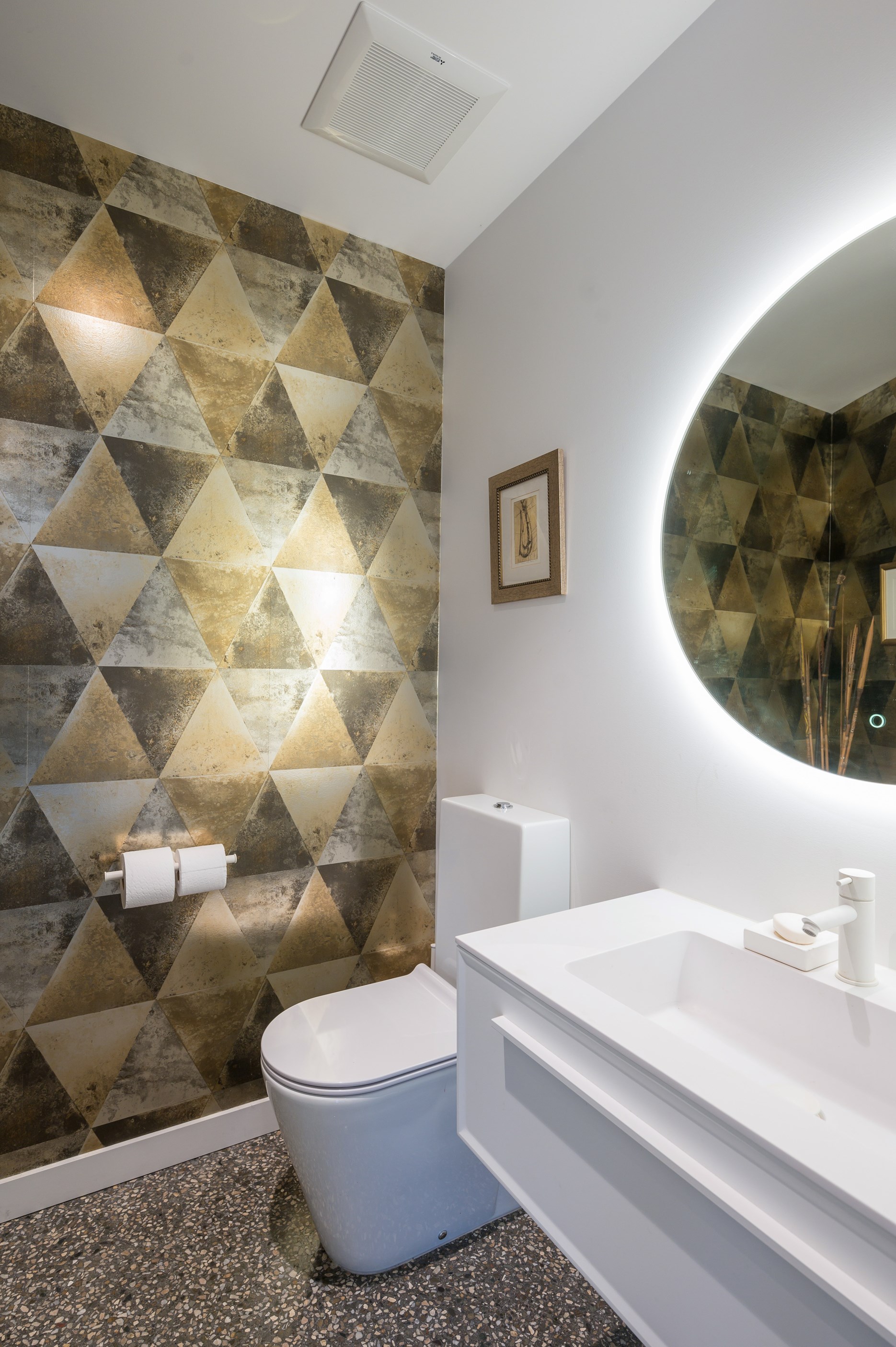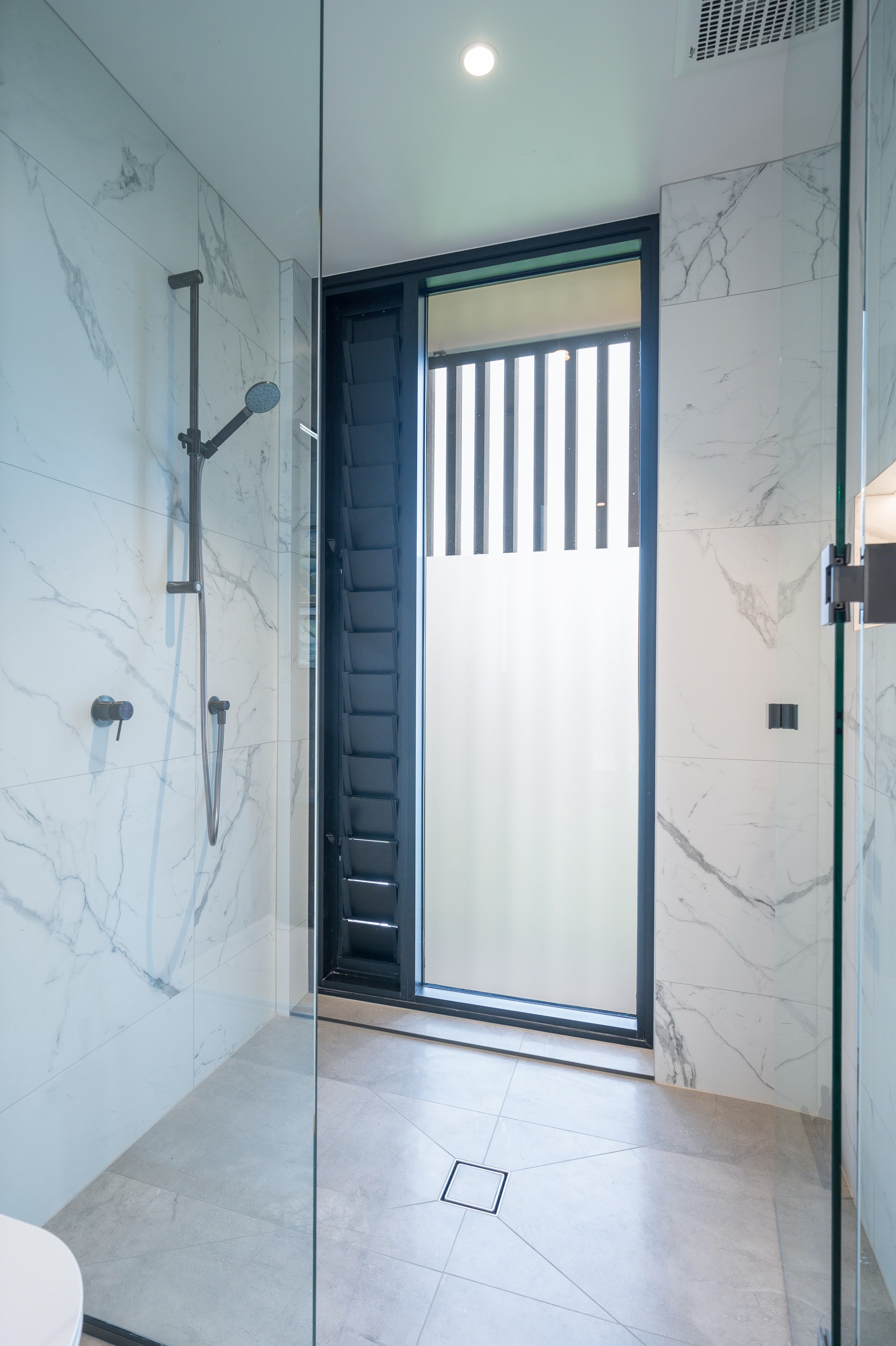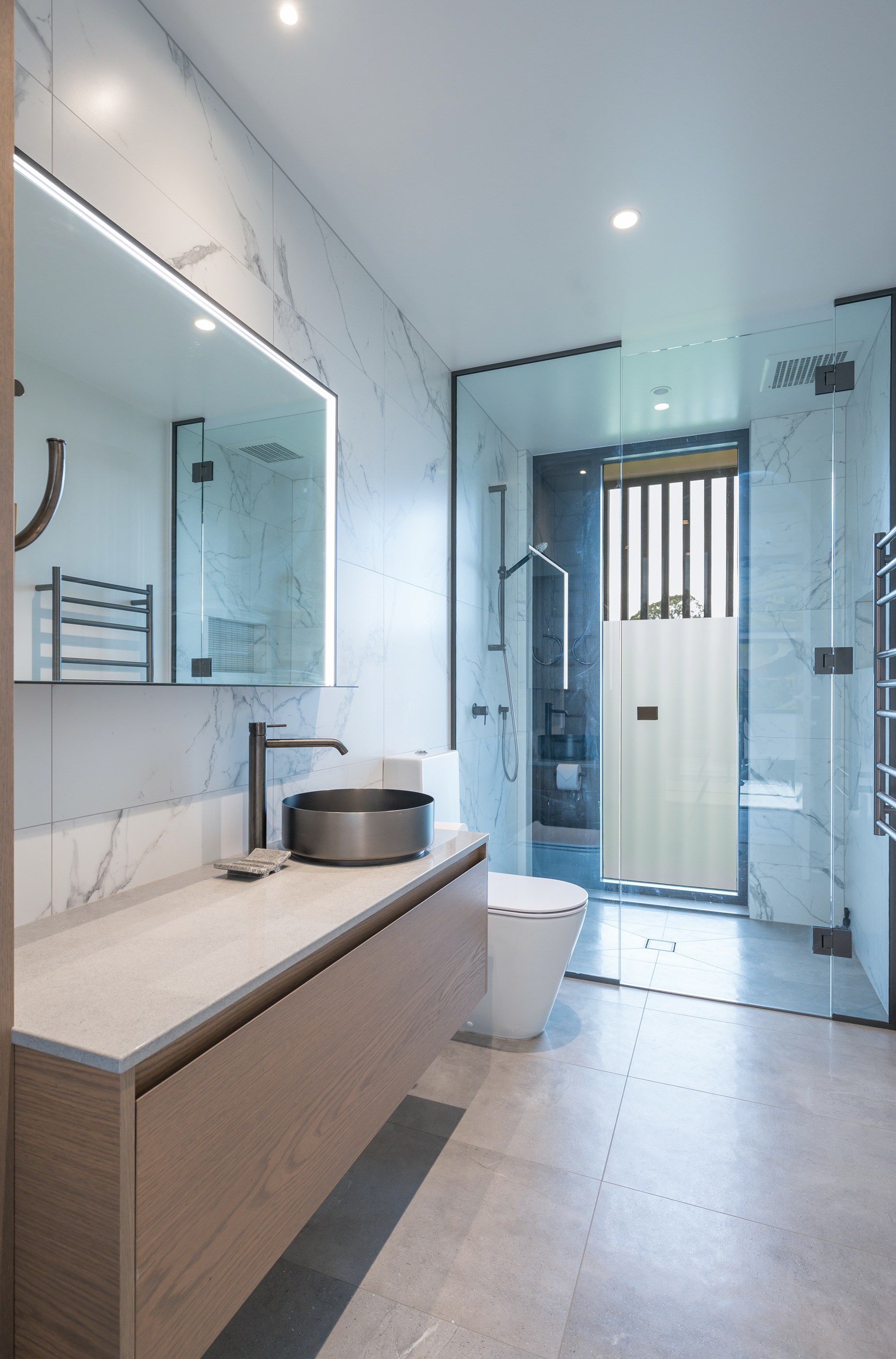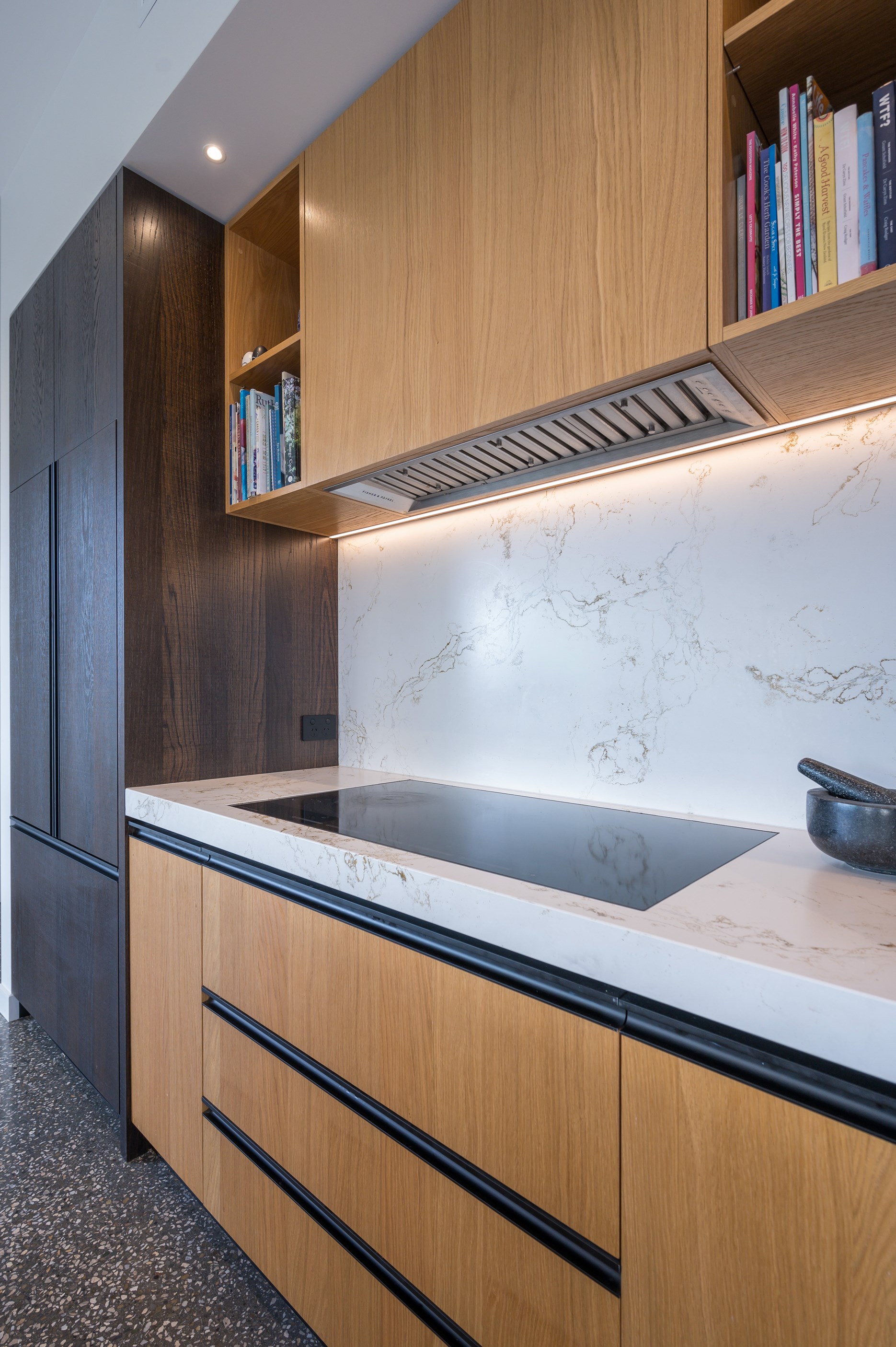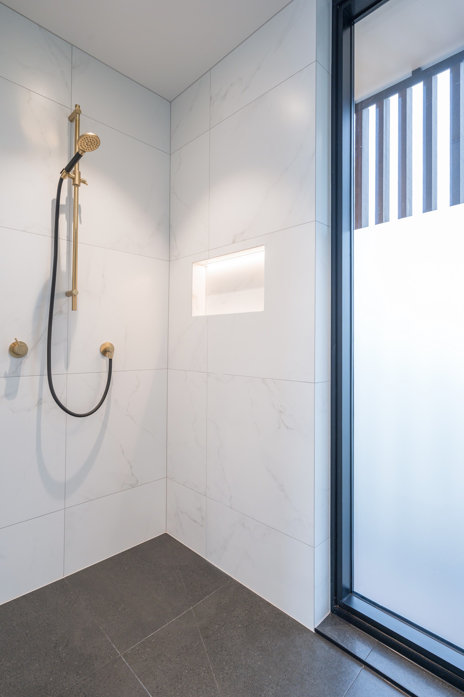 Graphic wallpaper works to lift a couple of corners, a brick fireplace features at the end of the living room and timber cabinetry adds to what is mostly a neutral palette with exposed aggregate concrete floors. Everything is thermally efficient with solar panels and battery storage making the home power neutral. Spaces have been designed to specific requirements with AM and PM alfresco decks, an office, a snug adjacent to the main suite (which leads out to the pool and spa) and an artist’s studio. A large, angled island defines the kitchen. Floor-to-ceiling cupboards line the laundry and bathrooms have generous proportions.