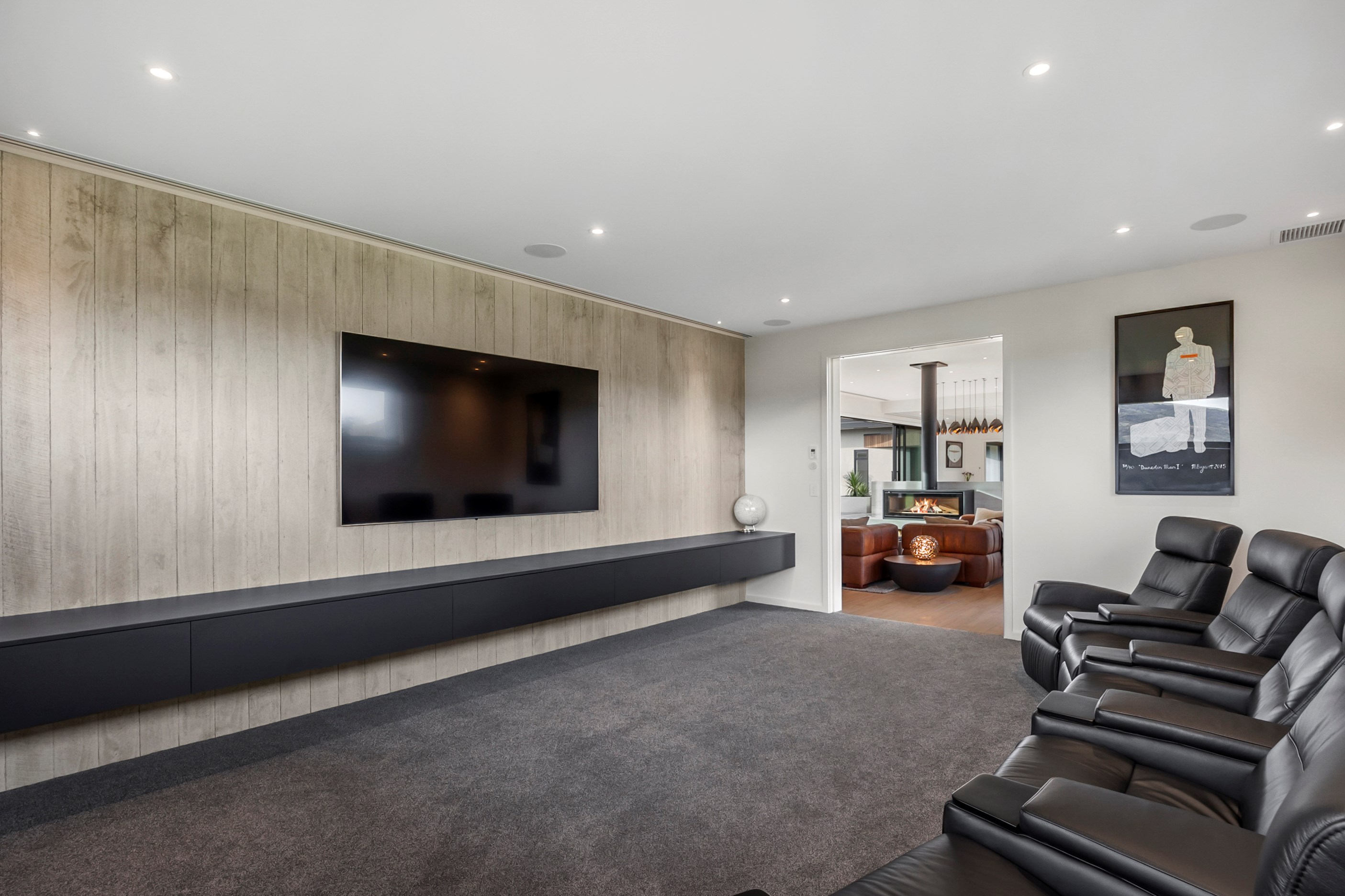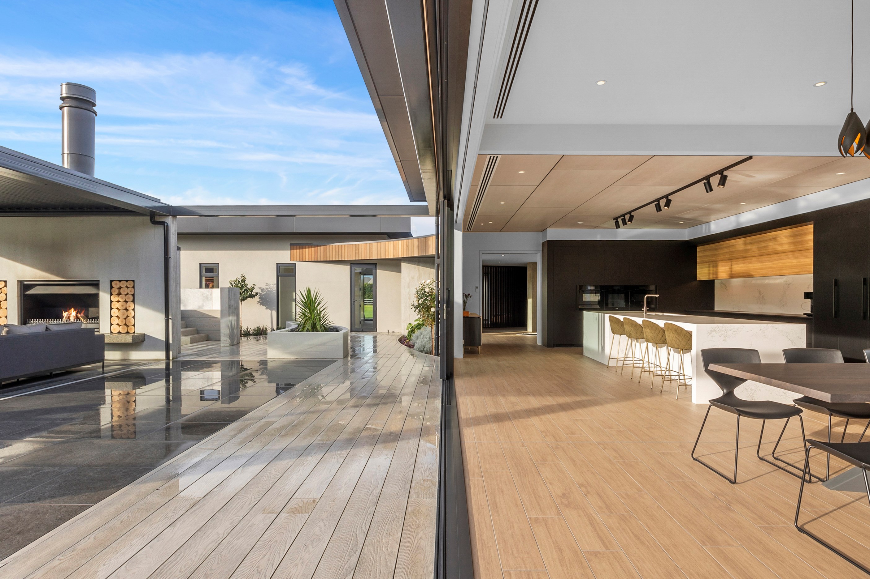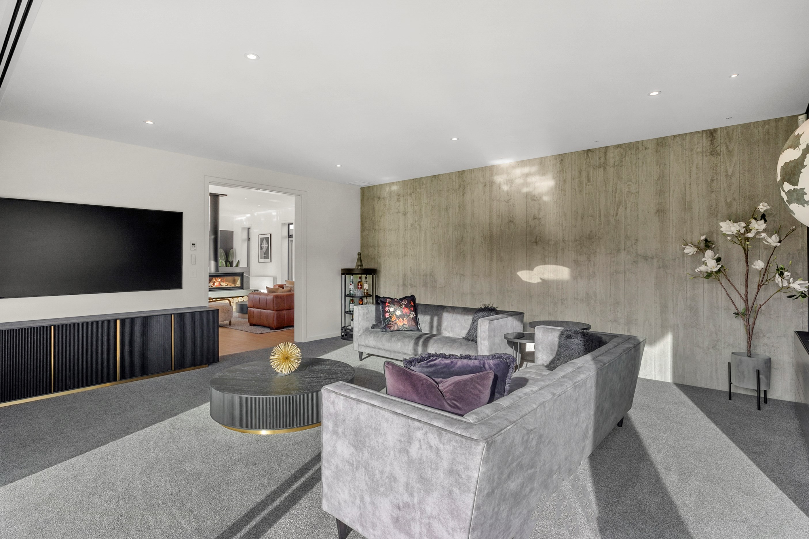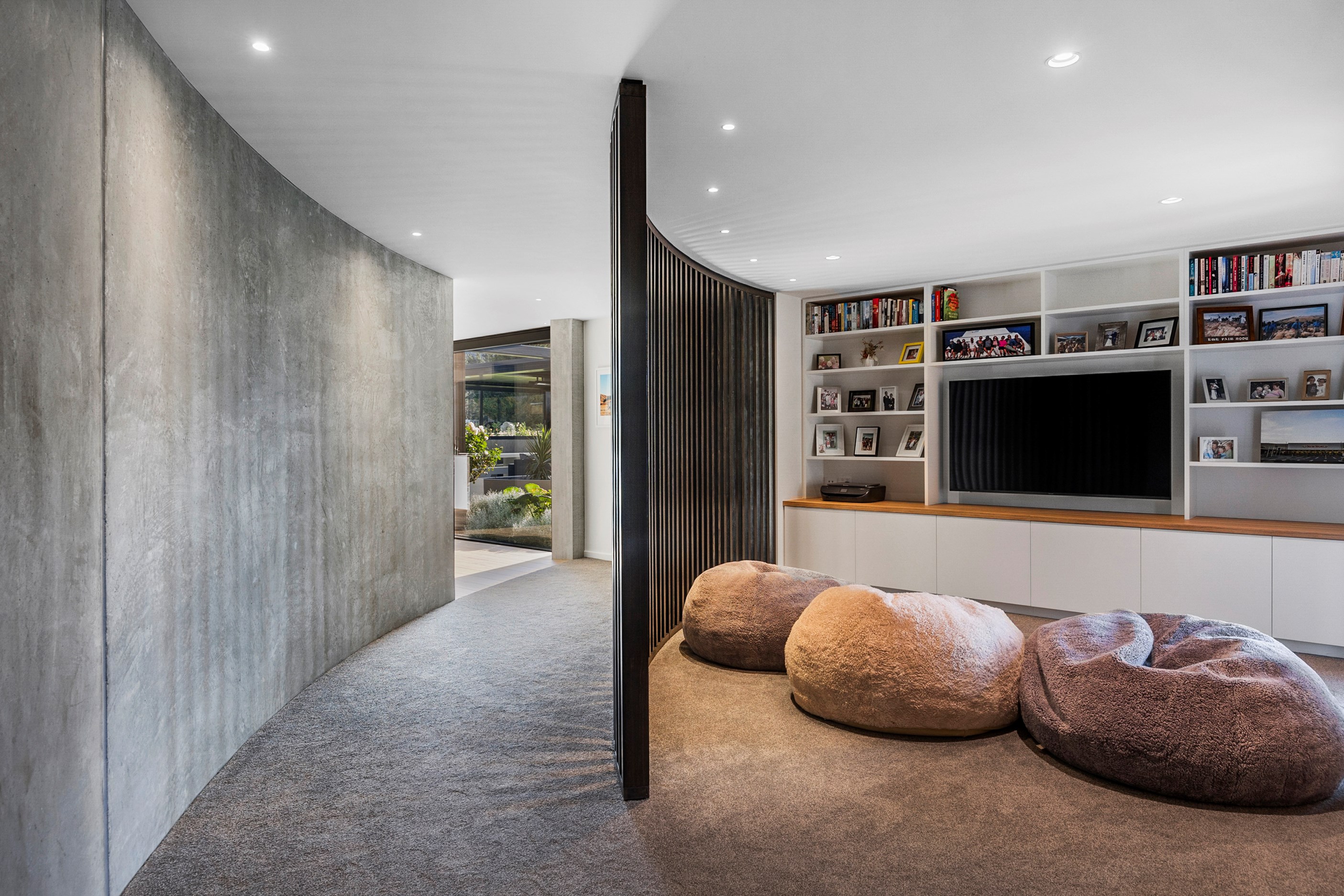 Inside, curated materials (ply, timber and more of that precast concrete) and high-end features lend the house its sense of laidback grandeur. It’s evident the minute you walk in the door where curved concrete and vertical timber screening set the scene for the drama to come. The communal wing starts with the designer kitchen. In one direction, it spills into dining, living, lounge and media rooms. Dividing the dining and living is a freestanding fireplace. In another direction, the kitchen flows to a deck and patio leading to a stunning outdoor room with fireplace, barbecue and furniture for dining and relaxing. Among many more pluses here: passive design, CCTV security and top-drawer moody decor.