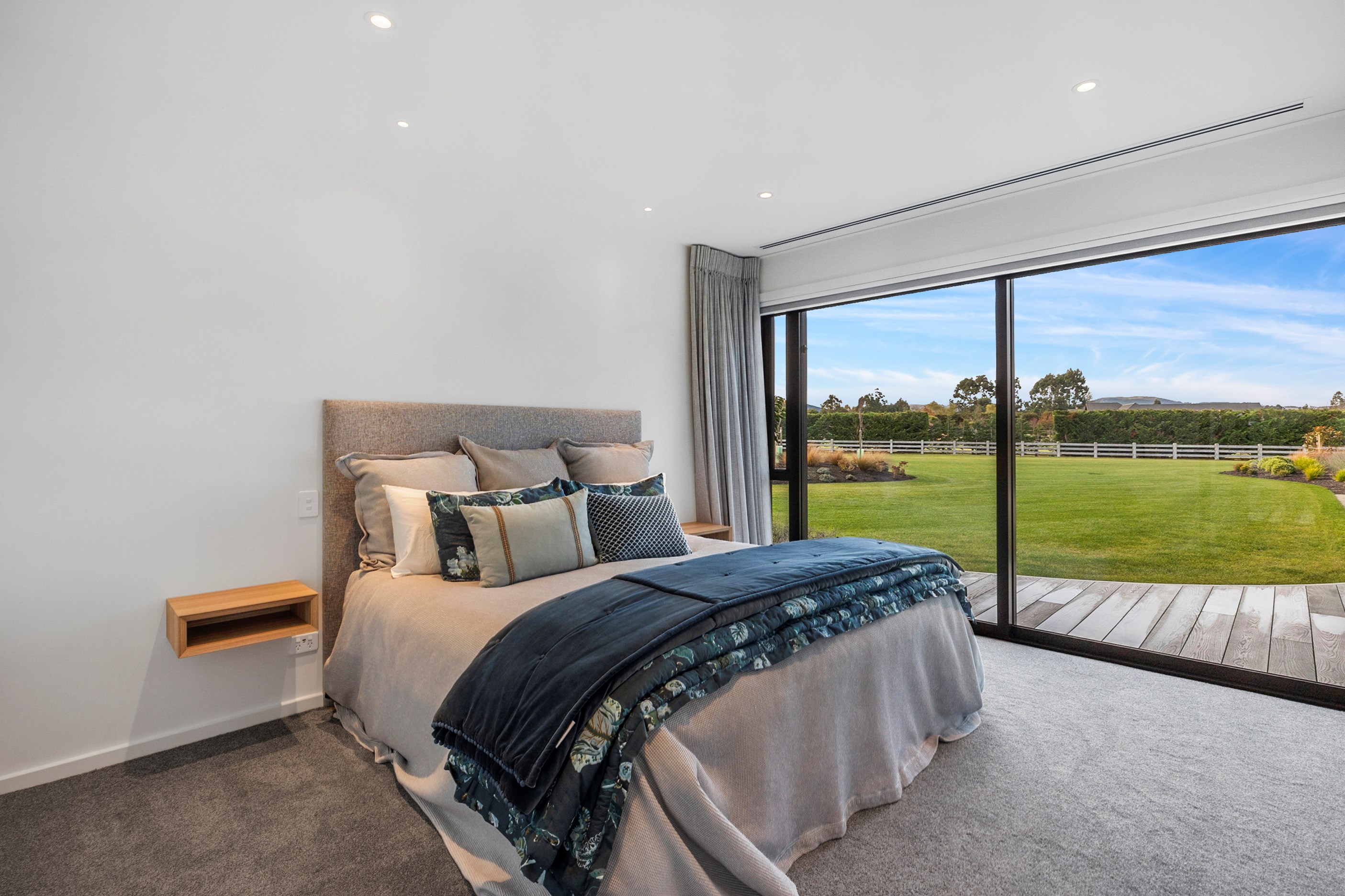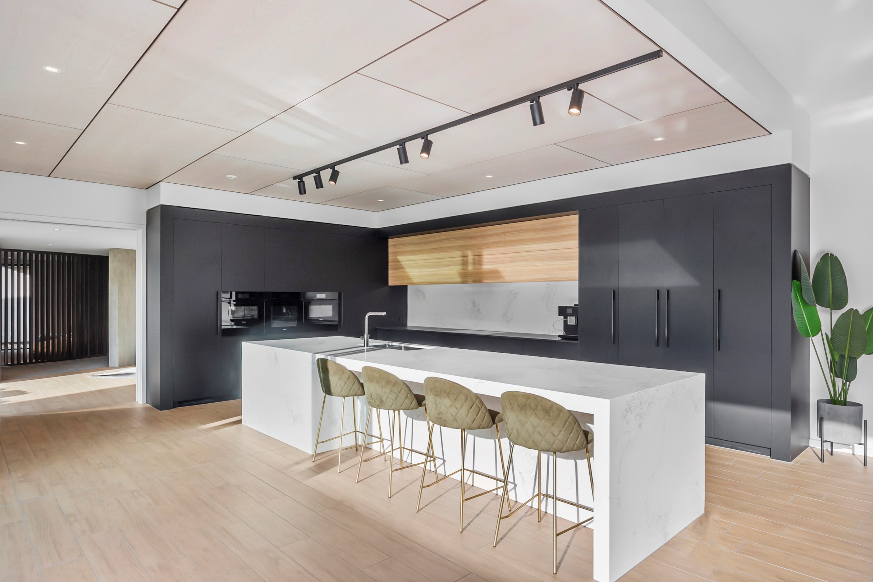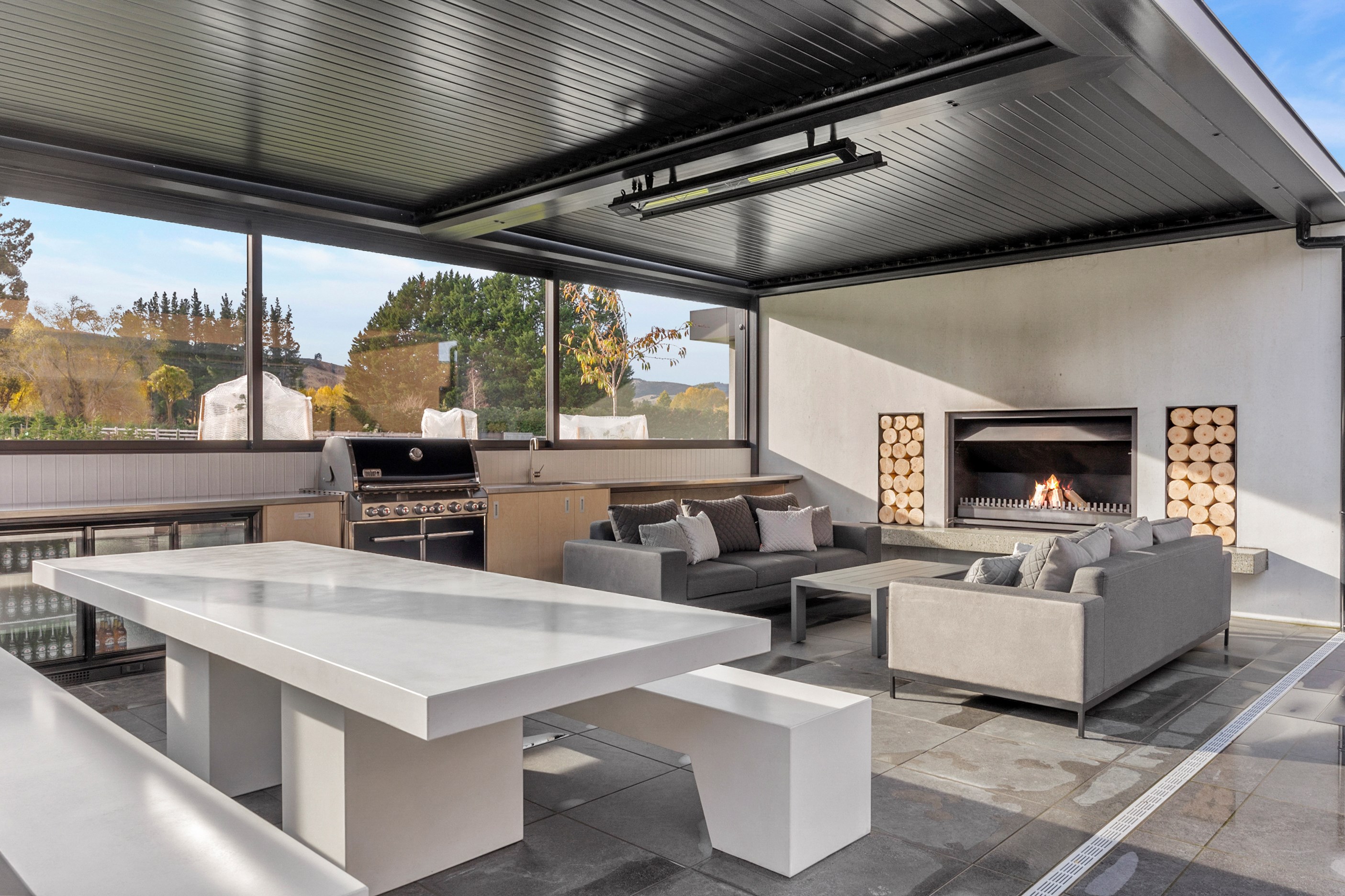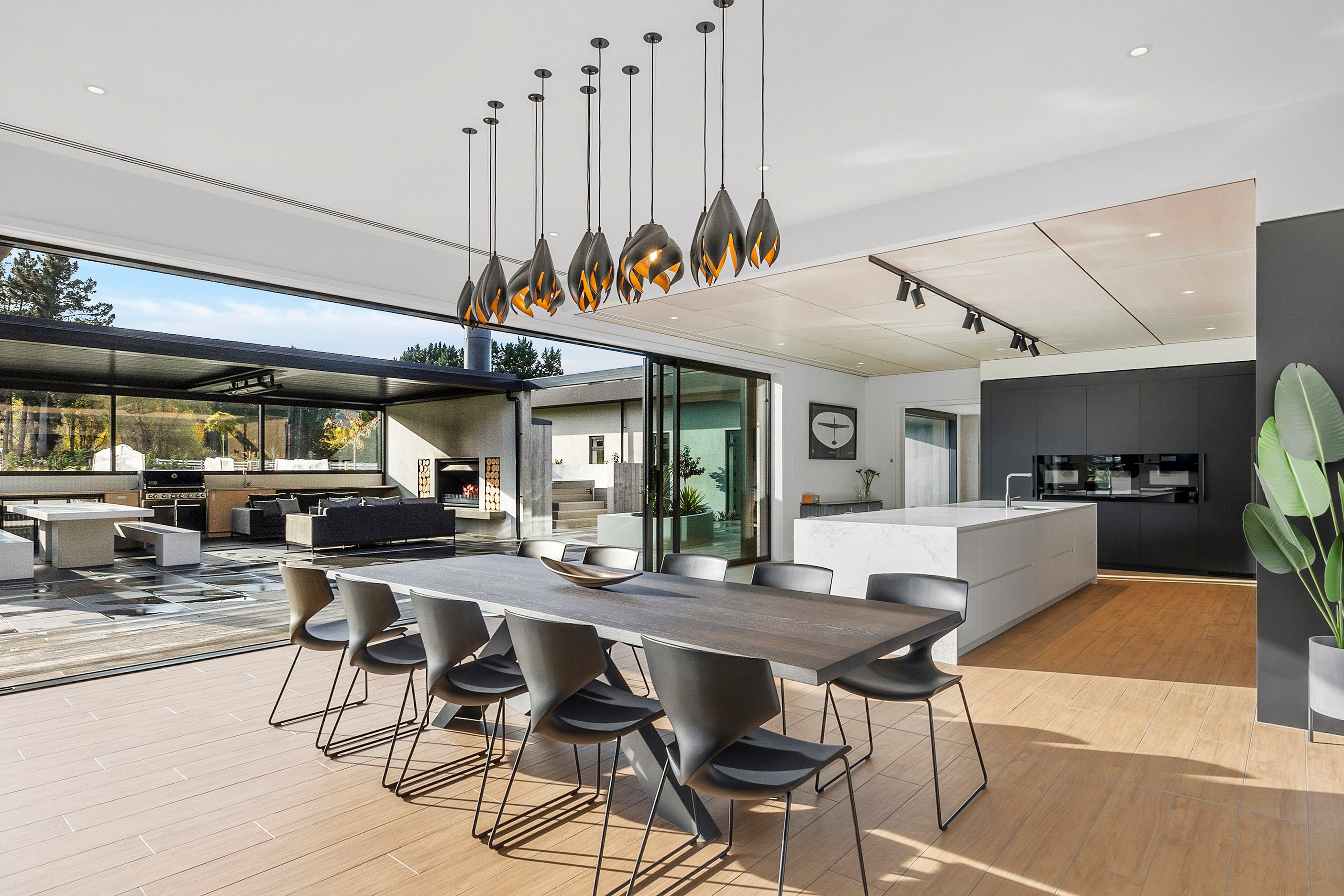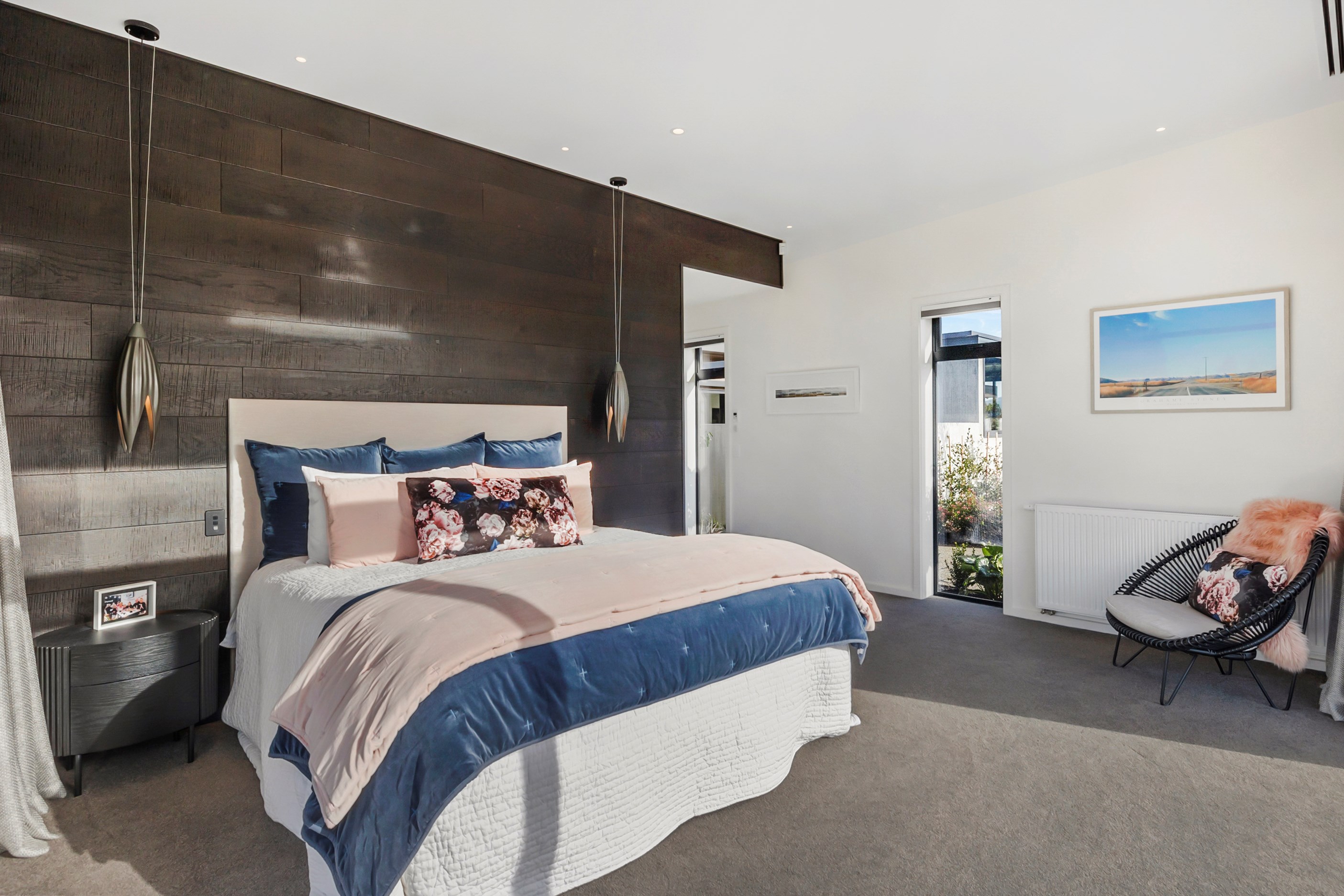 Inside, curated materials (ply, timber and more of that precast concrete) and high-end features lend the house its sense of laidback grandeur. It’s evident the minute you walk in the door where curved concrete and vertical timber screening set the scene for the drama to come. The communal wing starts with the designer kitchen. In one direction, it spills into dining, living, lounge and media rooms. Dividing the dining and living is a freestanding fireplace. In another direction, the kitchen flows to a deck and patio leading to a stunning outdoor room with fireplace, barbecue and furniture for dining and relaxing. Among many more pluses here: passive design, CCTV security and top-drawer moody decor.