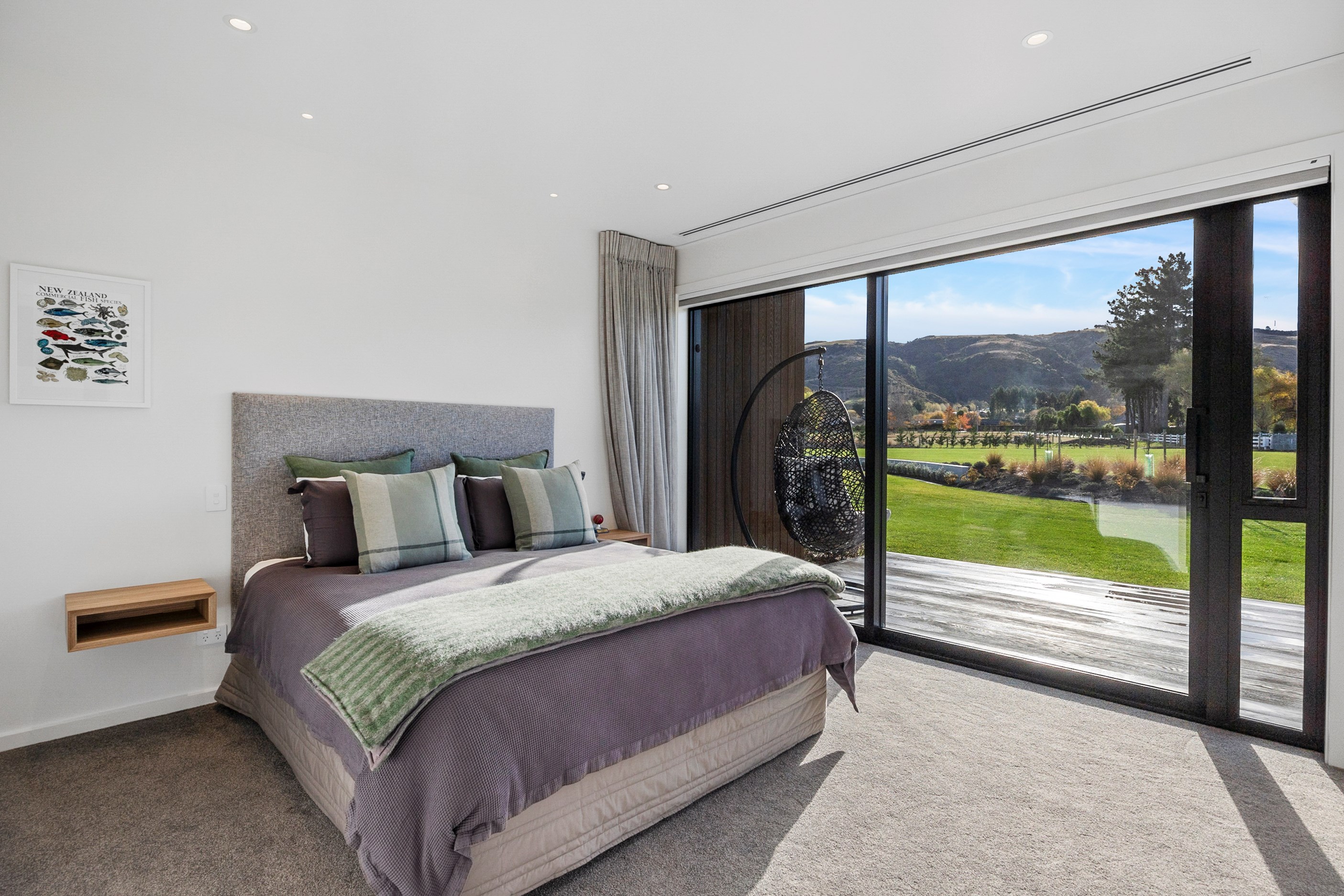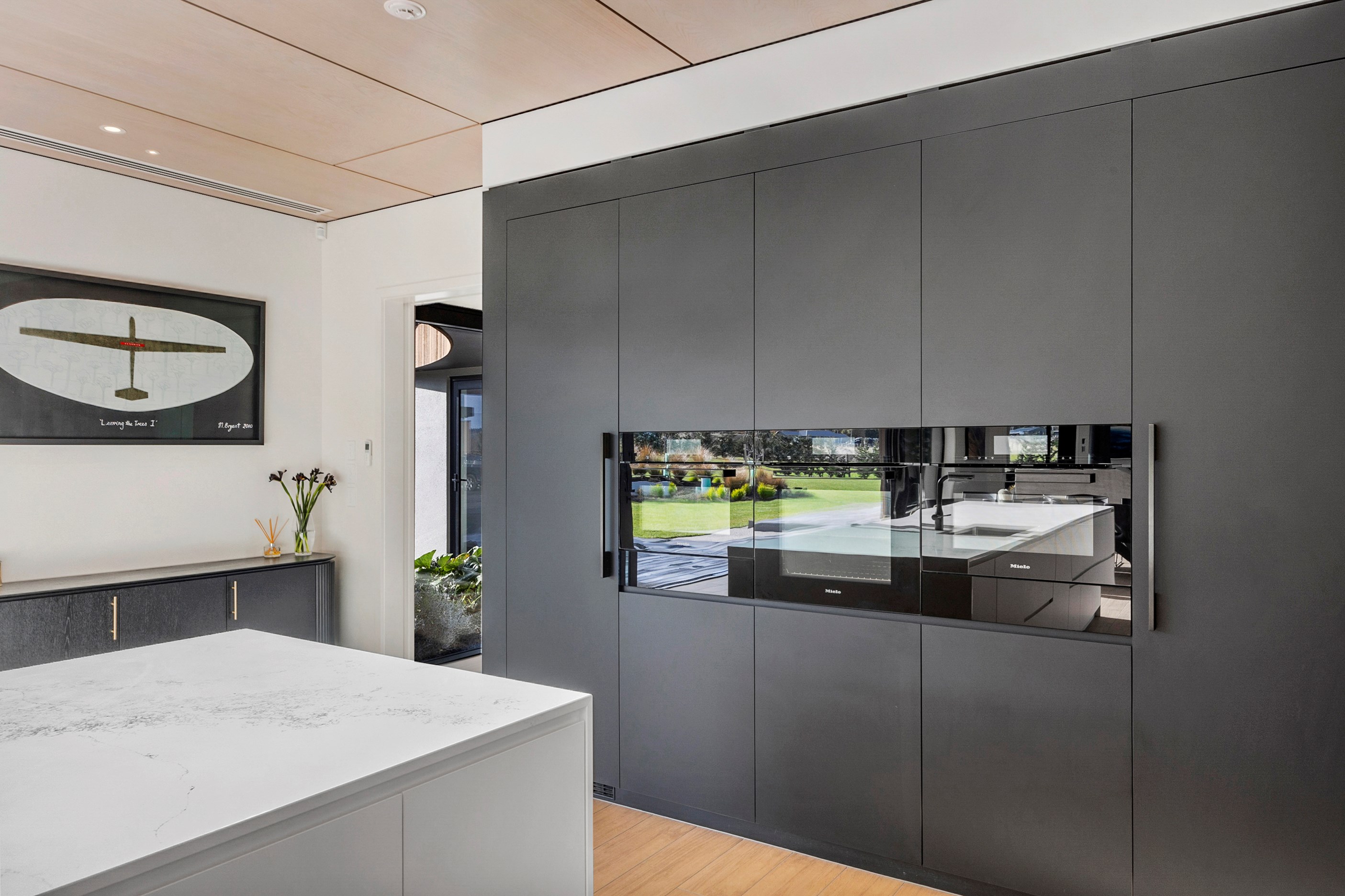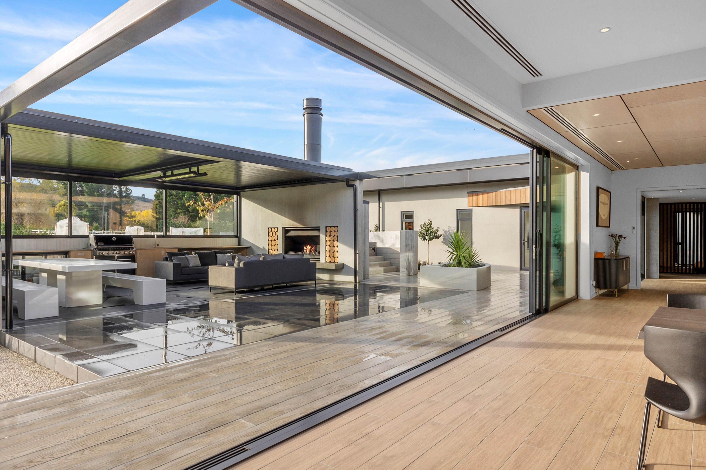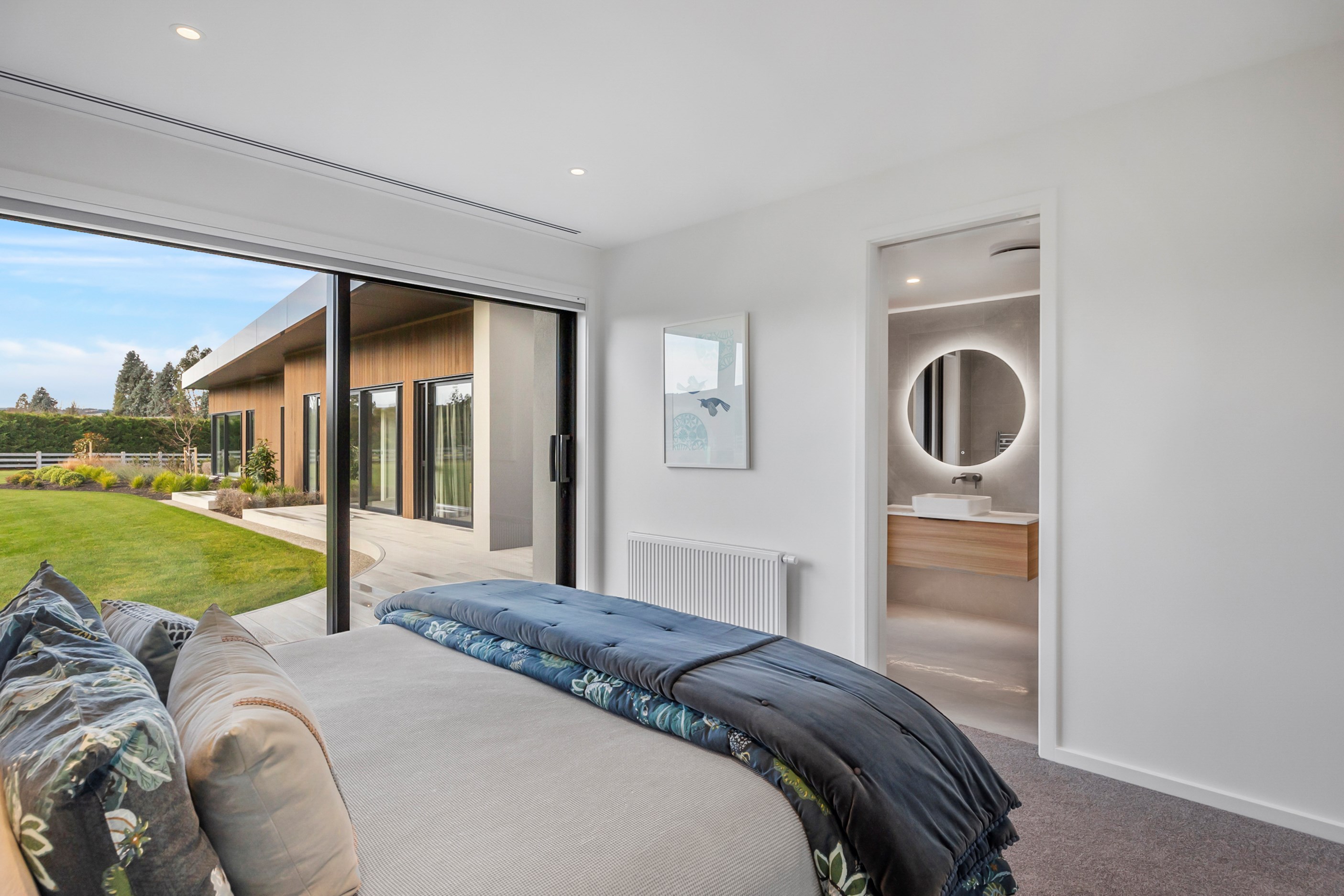 Inside, curated materials (ply, timber and more of that precast concrete) and high-end features lend the house its sense of laidback grandeur. It’s evident the minute you walk in the door where curved concrete and vertical timber screening set the scene for the drama to come. The communal wing starts with the designer kitchen. In one direction, it spills into dining, living, lounge and media rooms. Dividing the dining and living is a freestanding fireplace. In another direction, the kitchen flows to a deck and patio leading to a stunning outdoor room with fireplace, barbecue and furniture for dining and relaxing. Among many more pluses here: passive design, CCTV security and top-drawer moody decor.