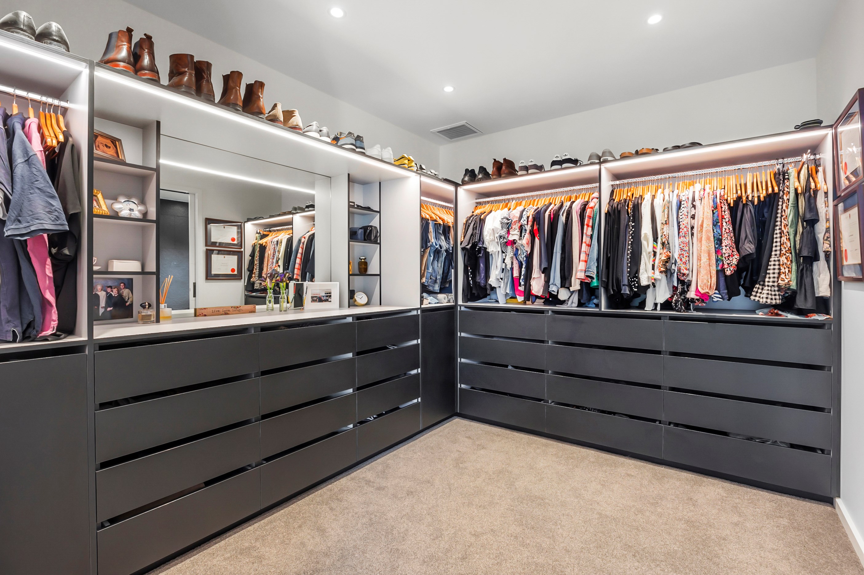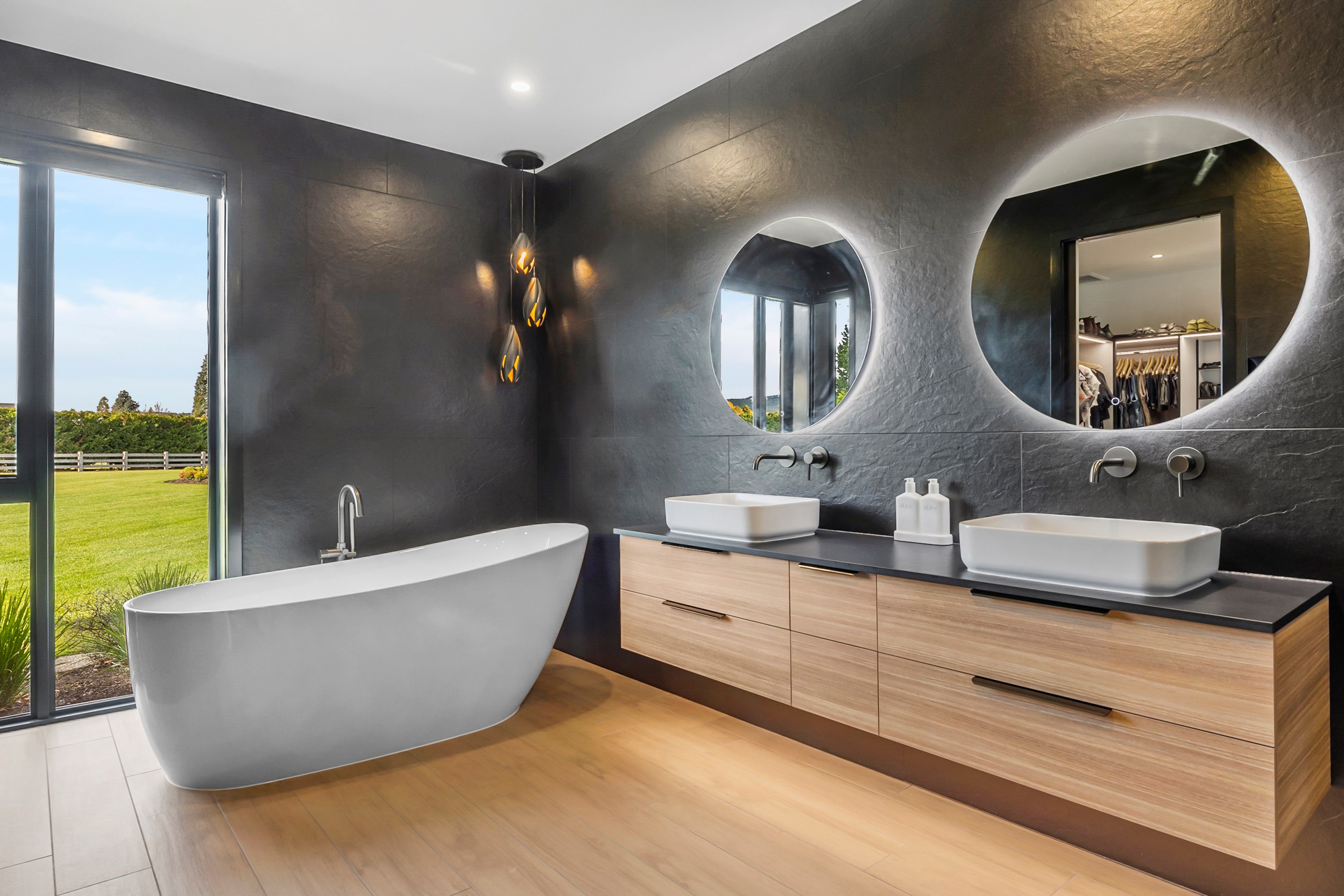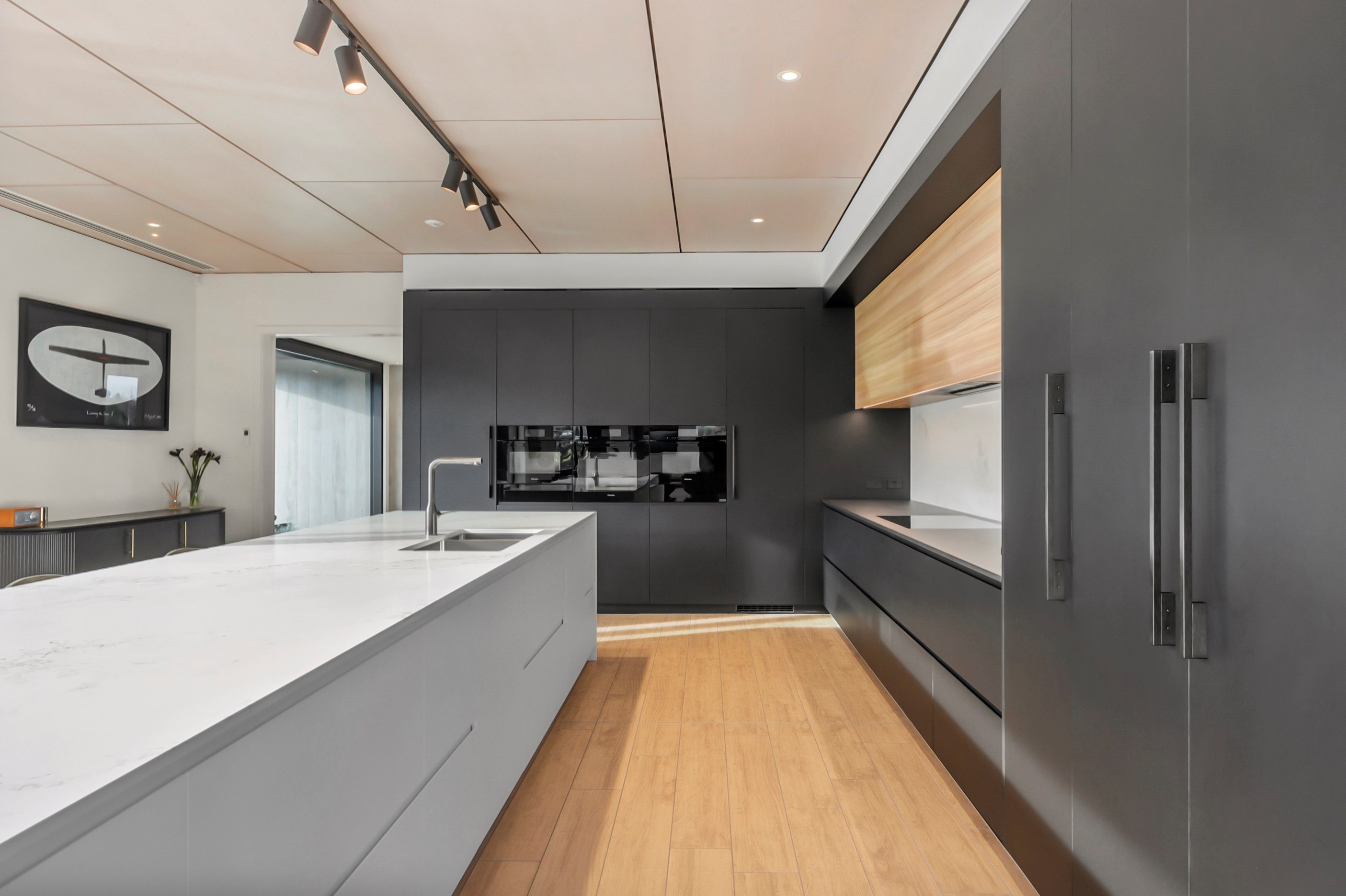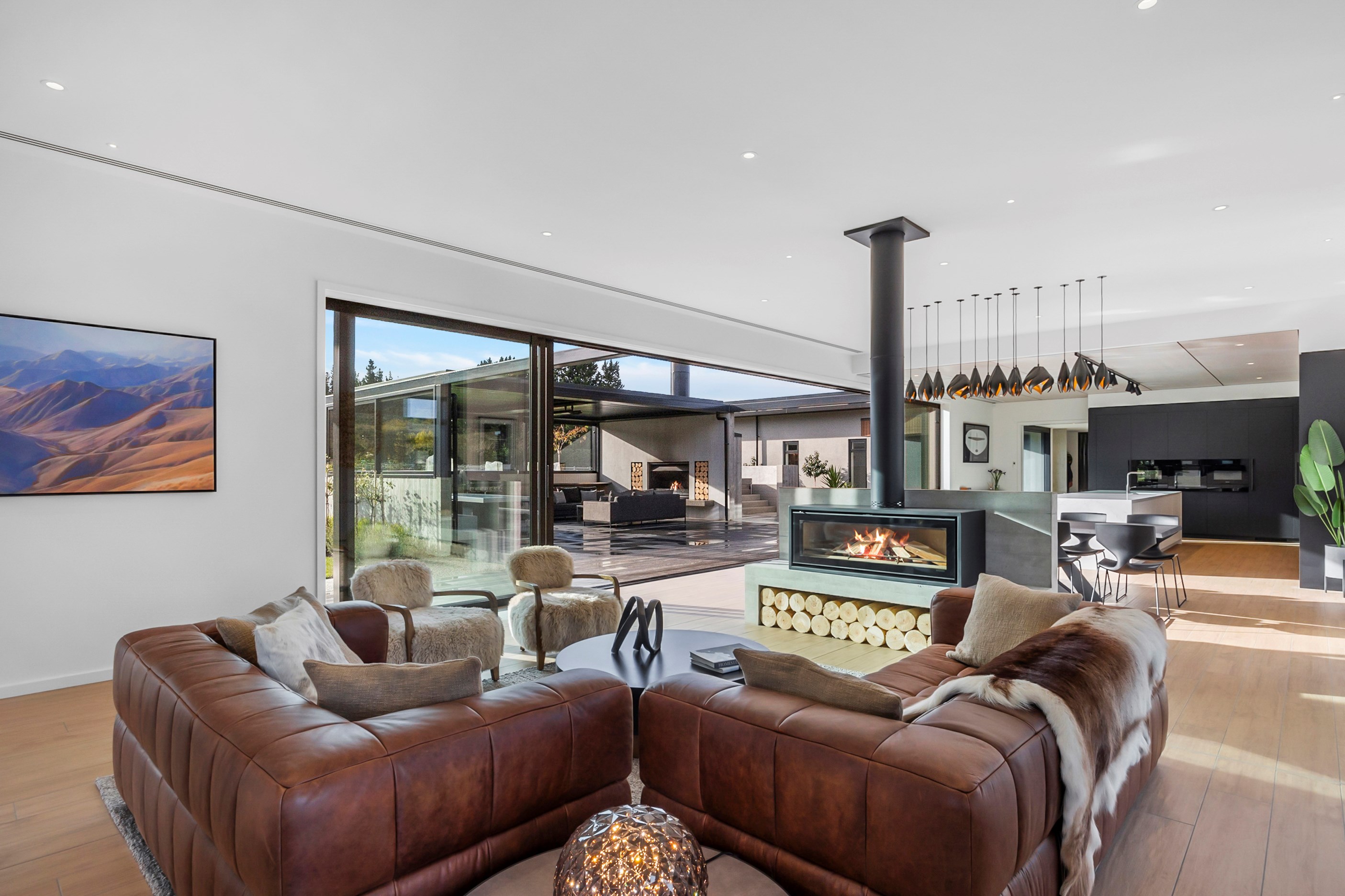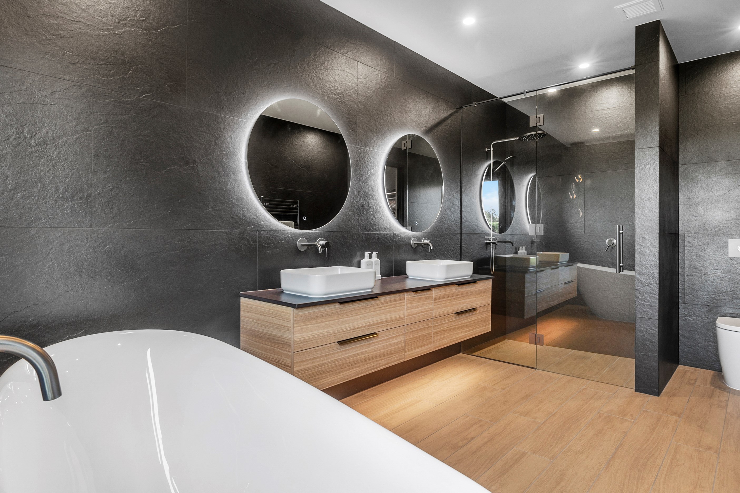 Inside, curated materials (ply, timber and more of that precast concrete) and high-end features lend the house its sense of laidback grandeur. It’s evident the minute you walk in the door where curved concrete and vertical timber screening set the scene for the drama to come. The communal wing starts with the designer kitchen. In one direction, it spills into dining, living, lounge and media rooms. Dividing the dining and living is a freestanding fireplace. In another direction, the kitchen flows to a deck and patio leading to a stunning outdoor room with fireplace, barbecue and furniture for dining and relaxing. Among many more pluses here: passive design, CCTV security and top-drawer moody decor.