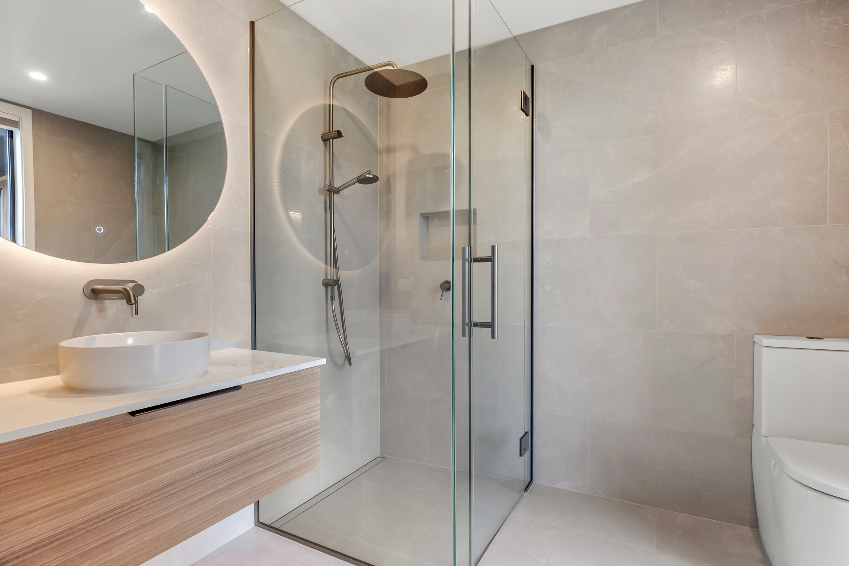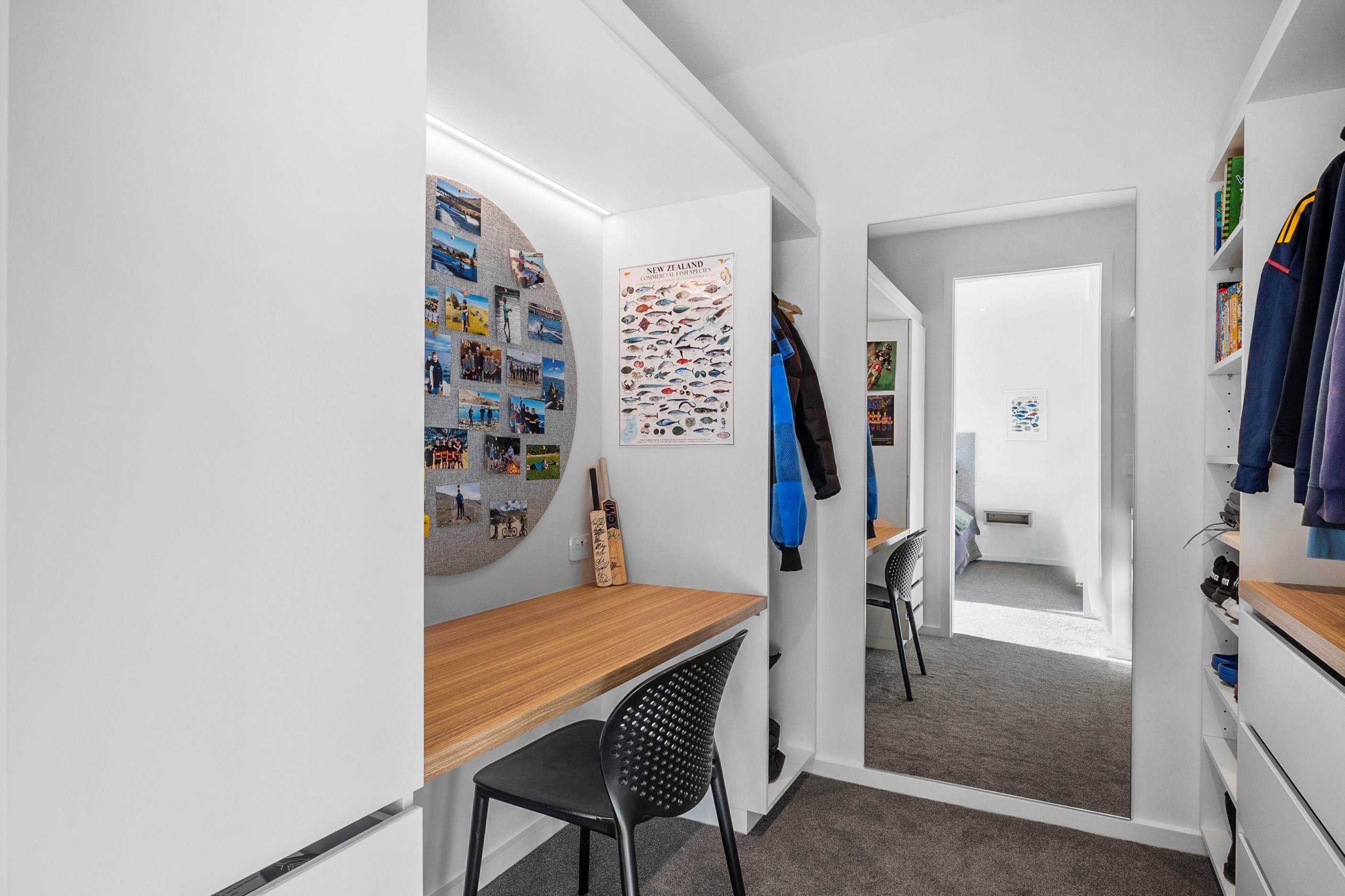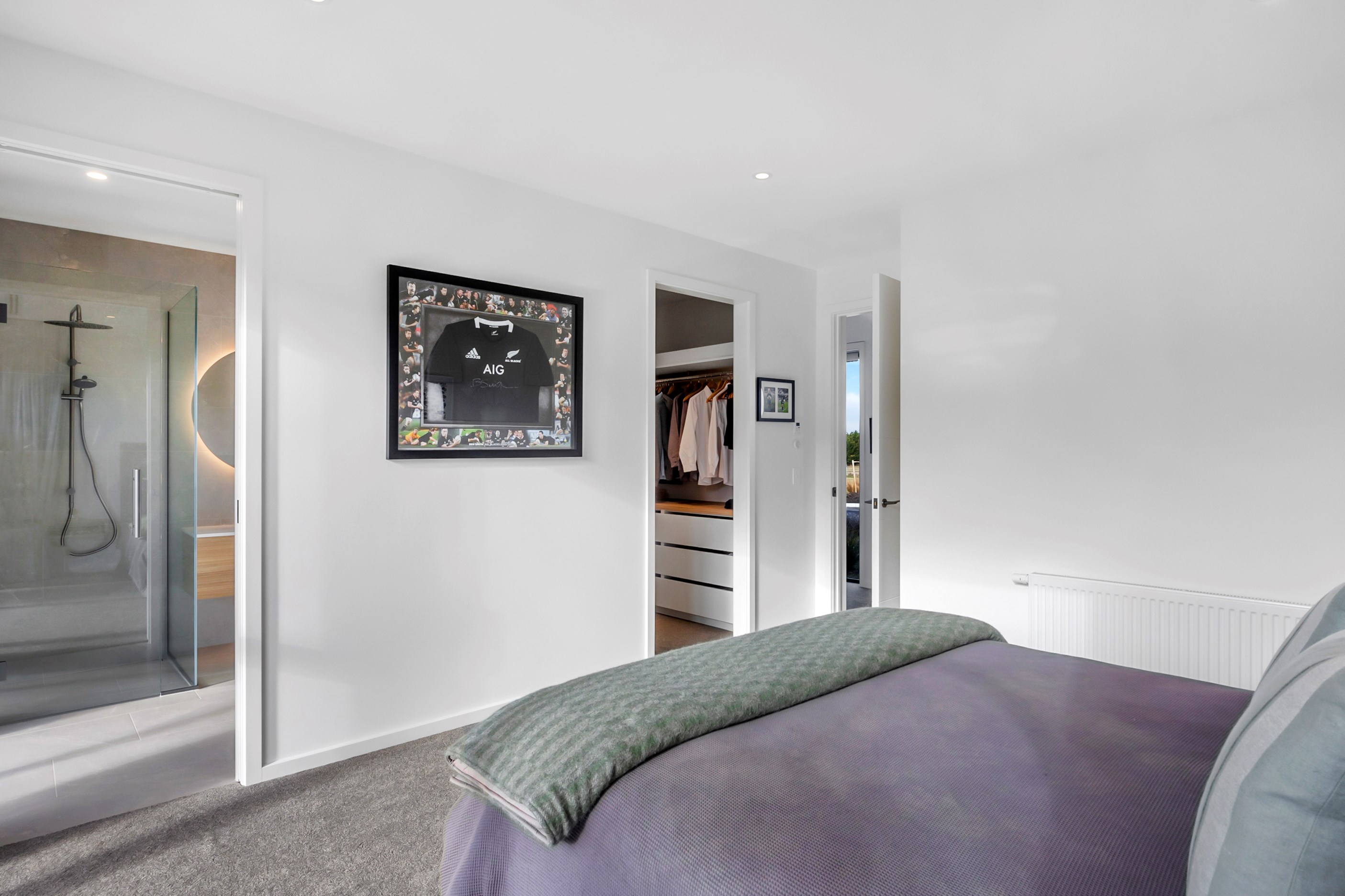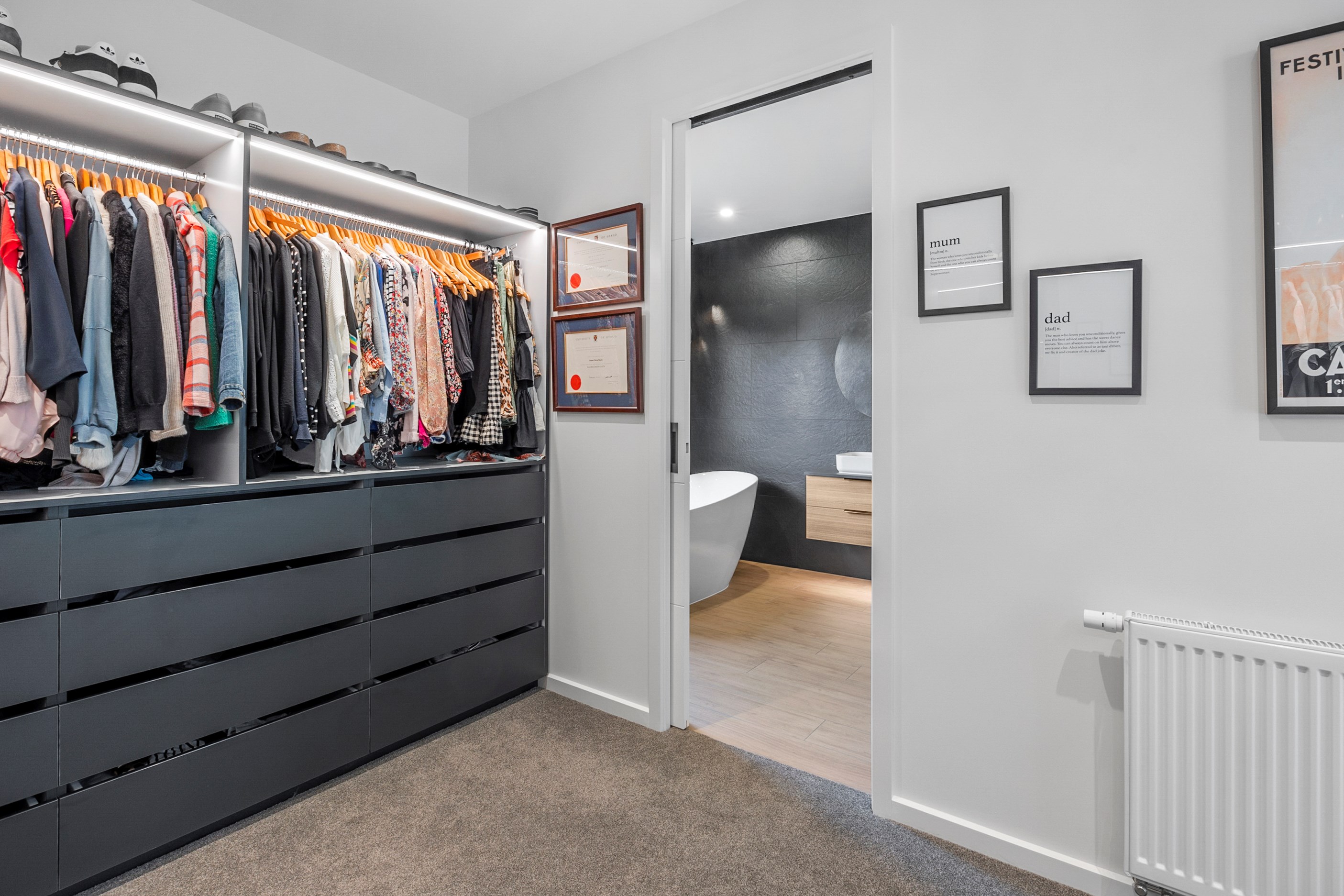 Inside, curated materials (ply, timber and more of that precast concrete) and high-end features lend the house its sense of laidback grandeur. It’s evident the minute you walk in the door where curved concrete and vertical timber screening set the scene for the drama to come. The communal wing starts with the designer kitchen. In one direction, it spills into dining, living, lounge and media rooms. Dividing the dining and living is a freestanding fireplace. In another direction, the kitchen flows to a deck and patio leading to a stunning outdoor room with fireplace, barbecue and furniture for dining and relaxing. Among many more pluses here: passive design, CCTV security and top-drawer moody decor.