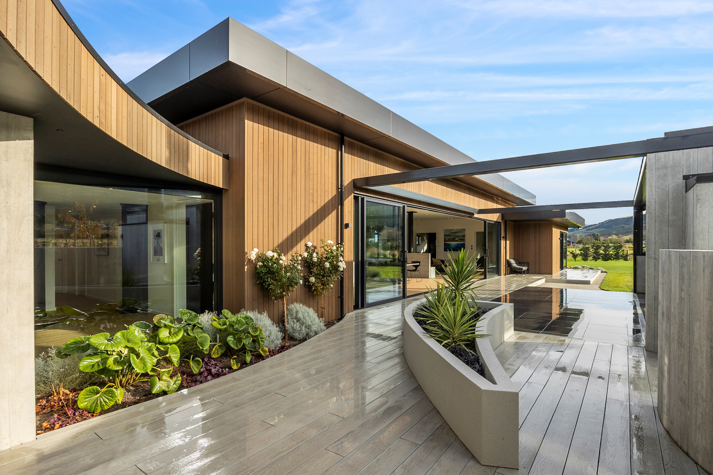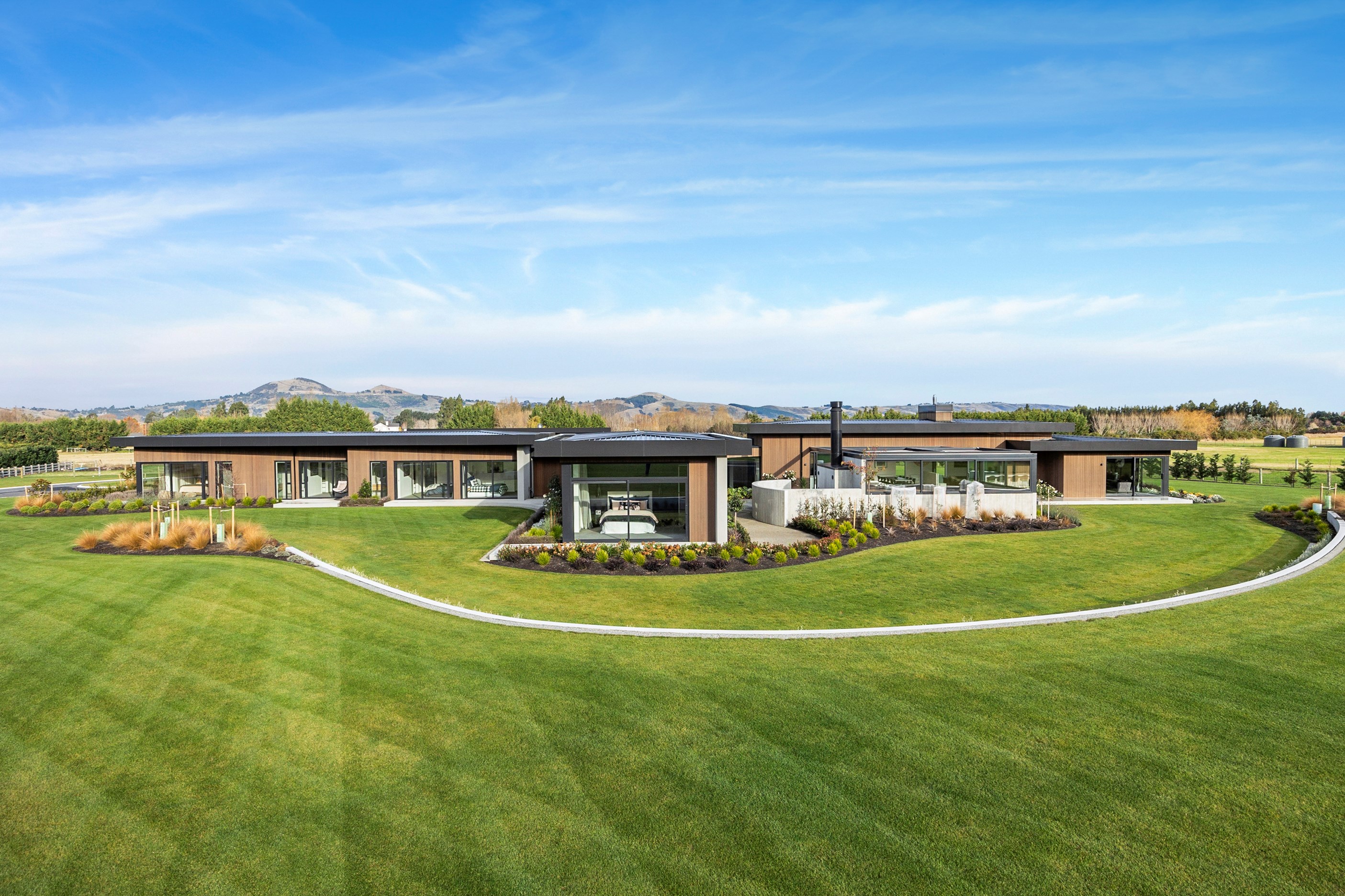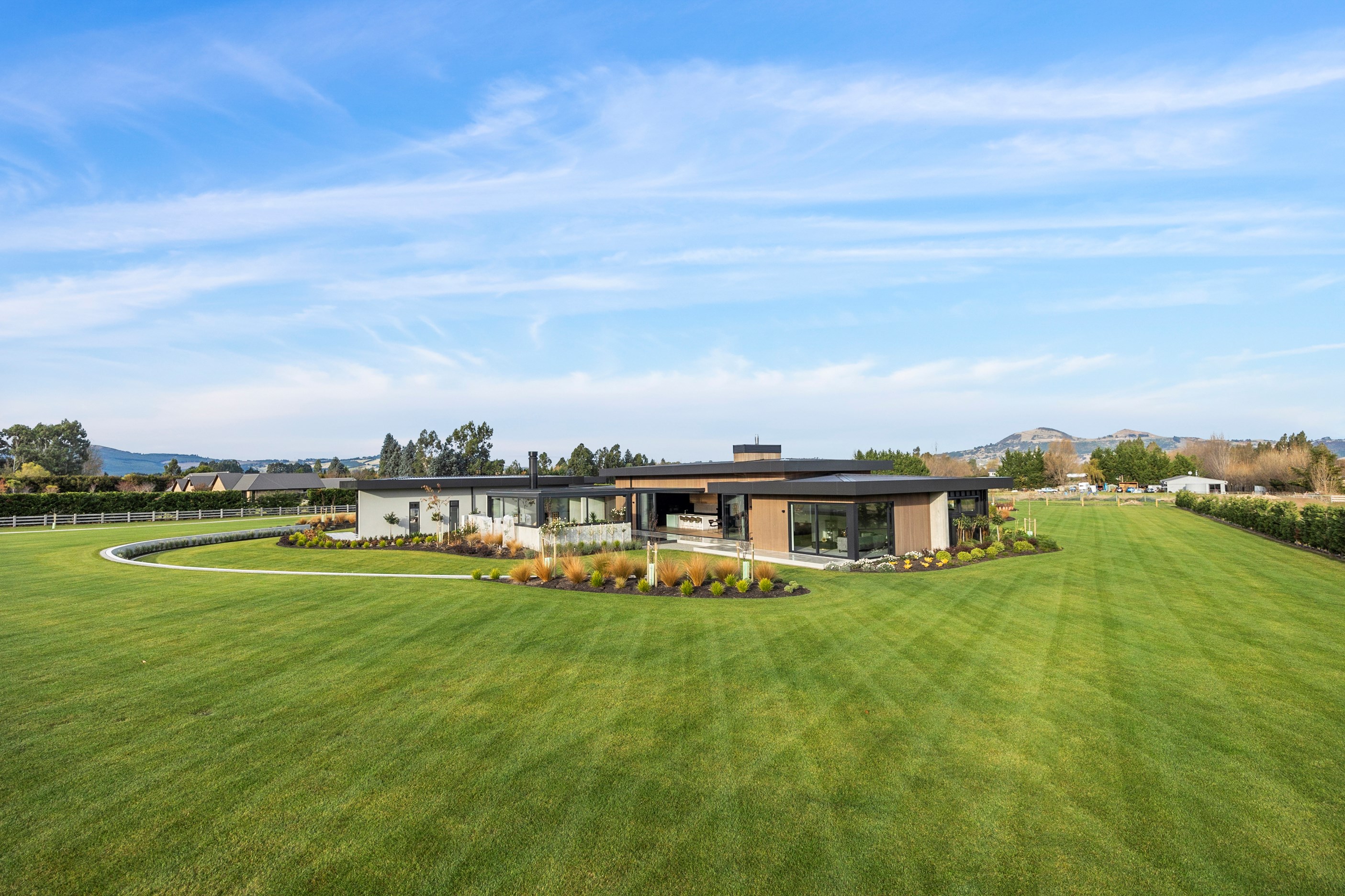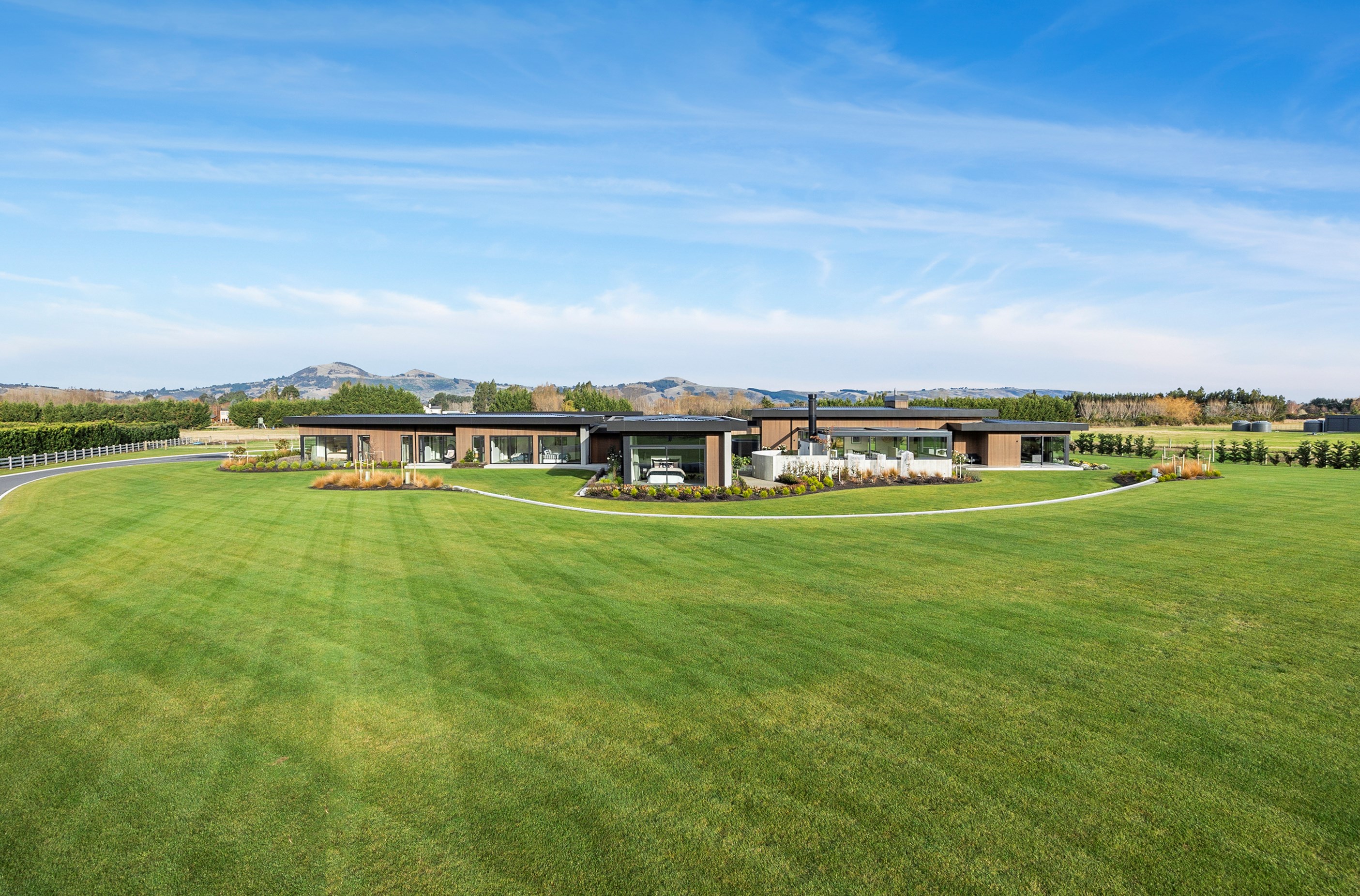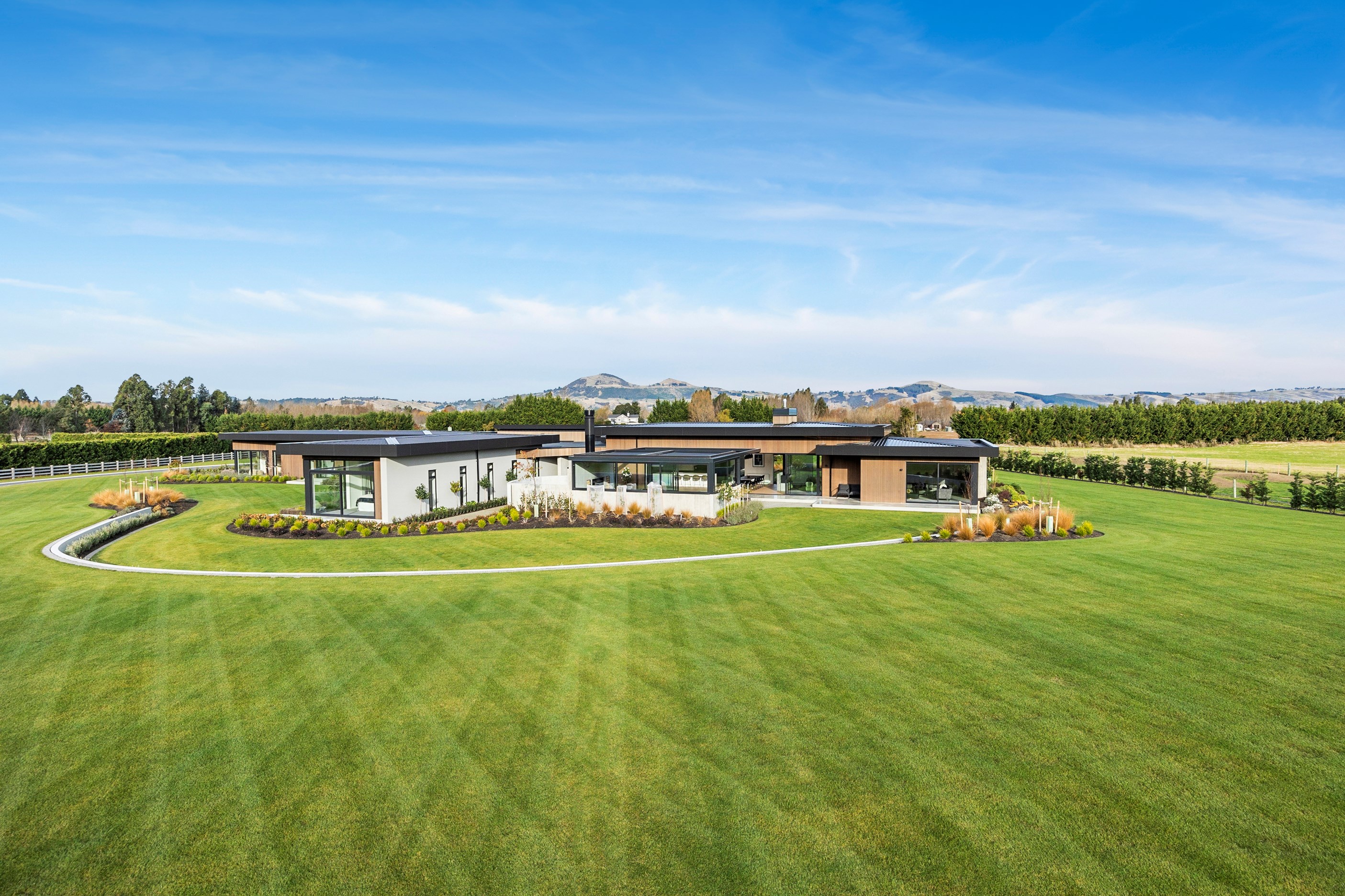 Large-scale luxury comes to the rural outskirts of Dunedin in this sprawling, low-lying masterpiece. With more than 600sqm of floor slab and about 900sqm of timber-framed roofed zones, this was a mammoth carpentry project. Enter Stevenson & Williams who approached the six-bedroom, six ensuites project, configured in a cross shape, with relish. It isn’t every day that builders get to craft projects of this epic size and with this level of opulent detail. Where to begin? The semi-rural house, with claddings of cedar shiplap, precast-concrete wall panels, plaster and metal, combines strong angles and sweeping curves in one striking development.