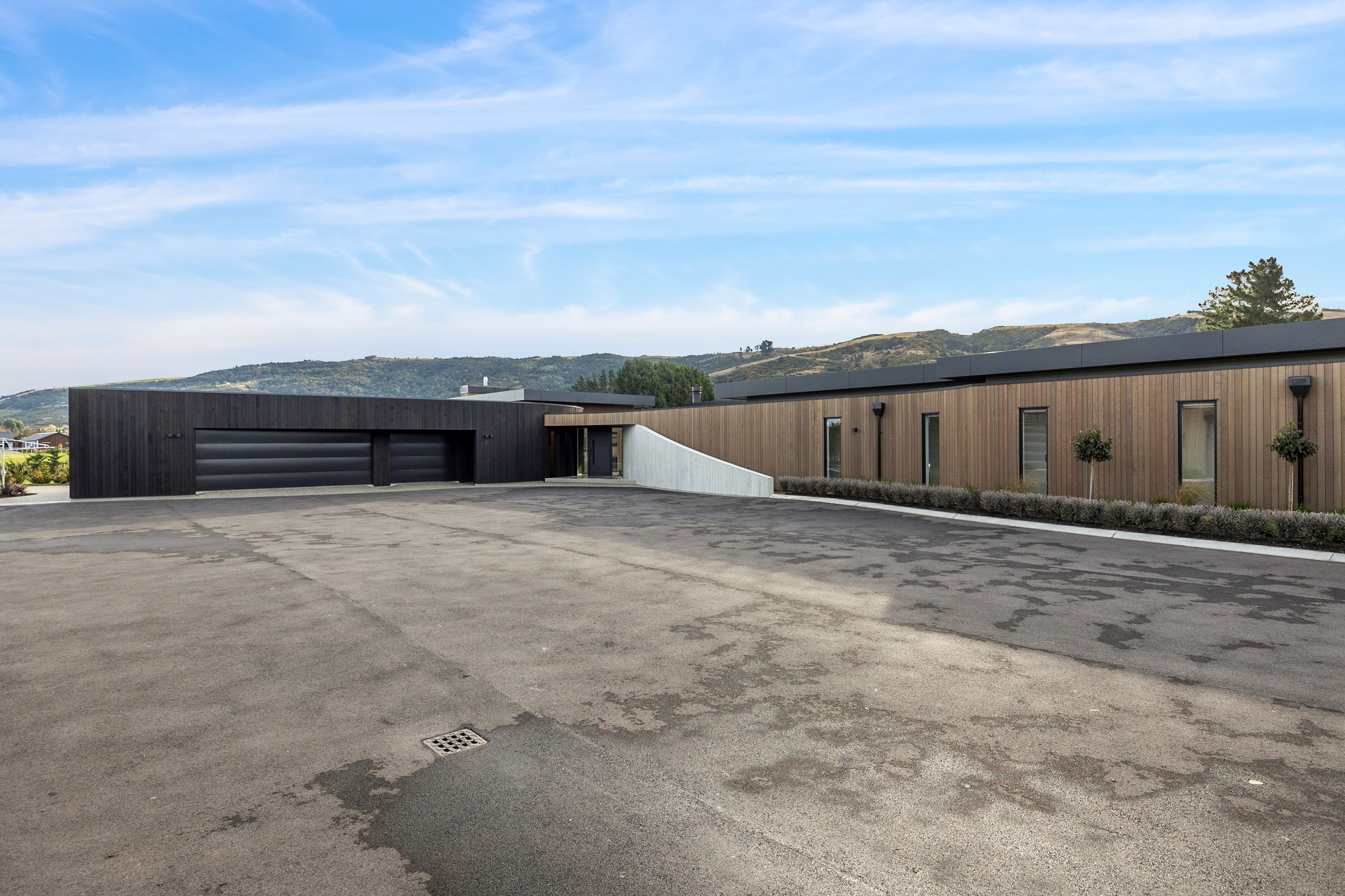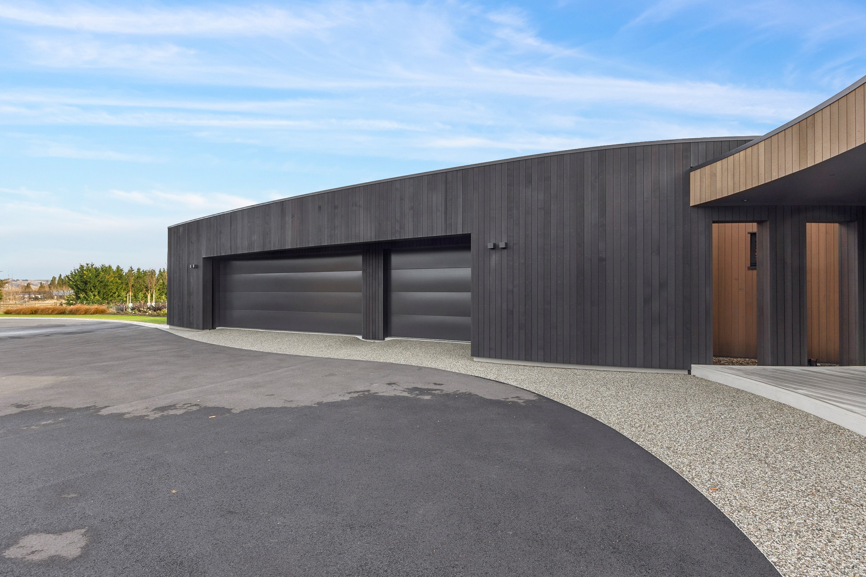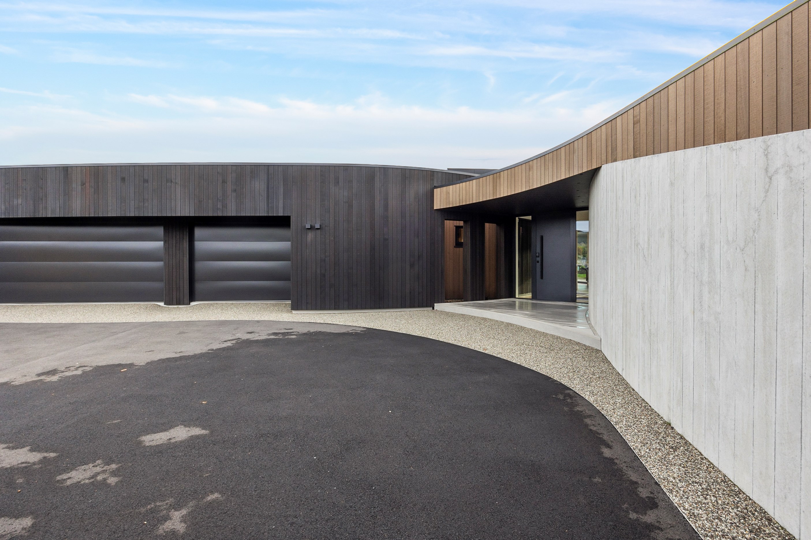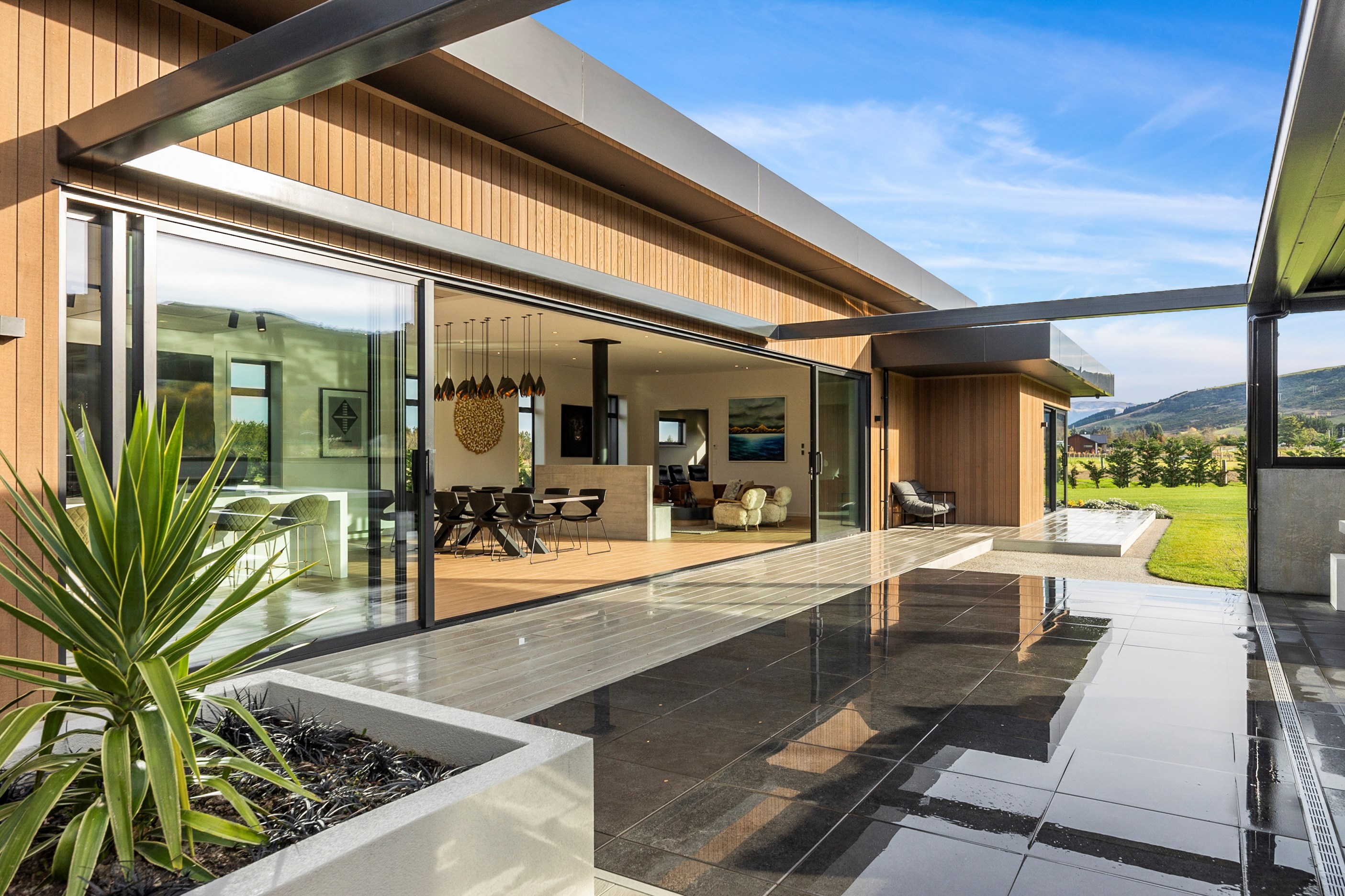 Large-scale luxury comes to the rural outskirts of Dunedin in this sprawling, low-lying masterpiece. With more than 600sqm of floor slab and about 900sqm of timber-framed roofed zones, this was a mammoth carpentry project. Enter Stevenson & Williams who approached the six-bedroom, six ensuites project, configured in a cross shape, with relish. It isn’t every day that builders get to craft projects of this epic size and with this level of opulent detail. Where to begin? The semi-rural house, with claddings of cedar shiplap, precast-concrete wall panels, plaster and metal, combines strong angles and sweeping curves in one striking development.