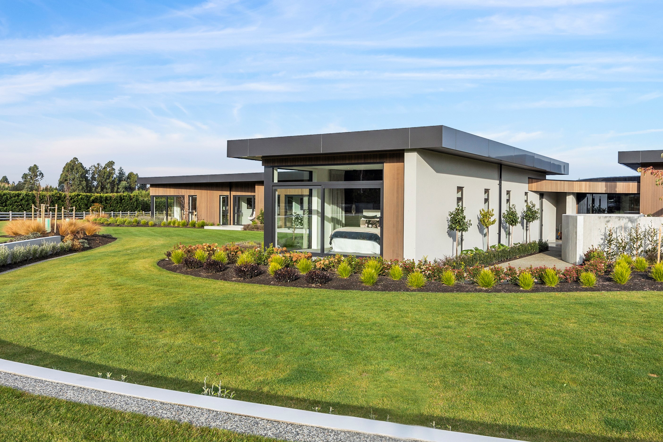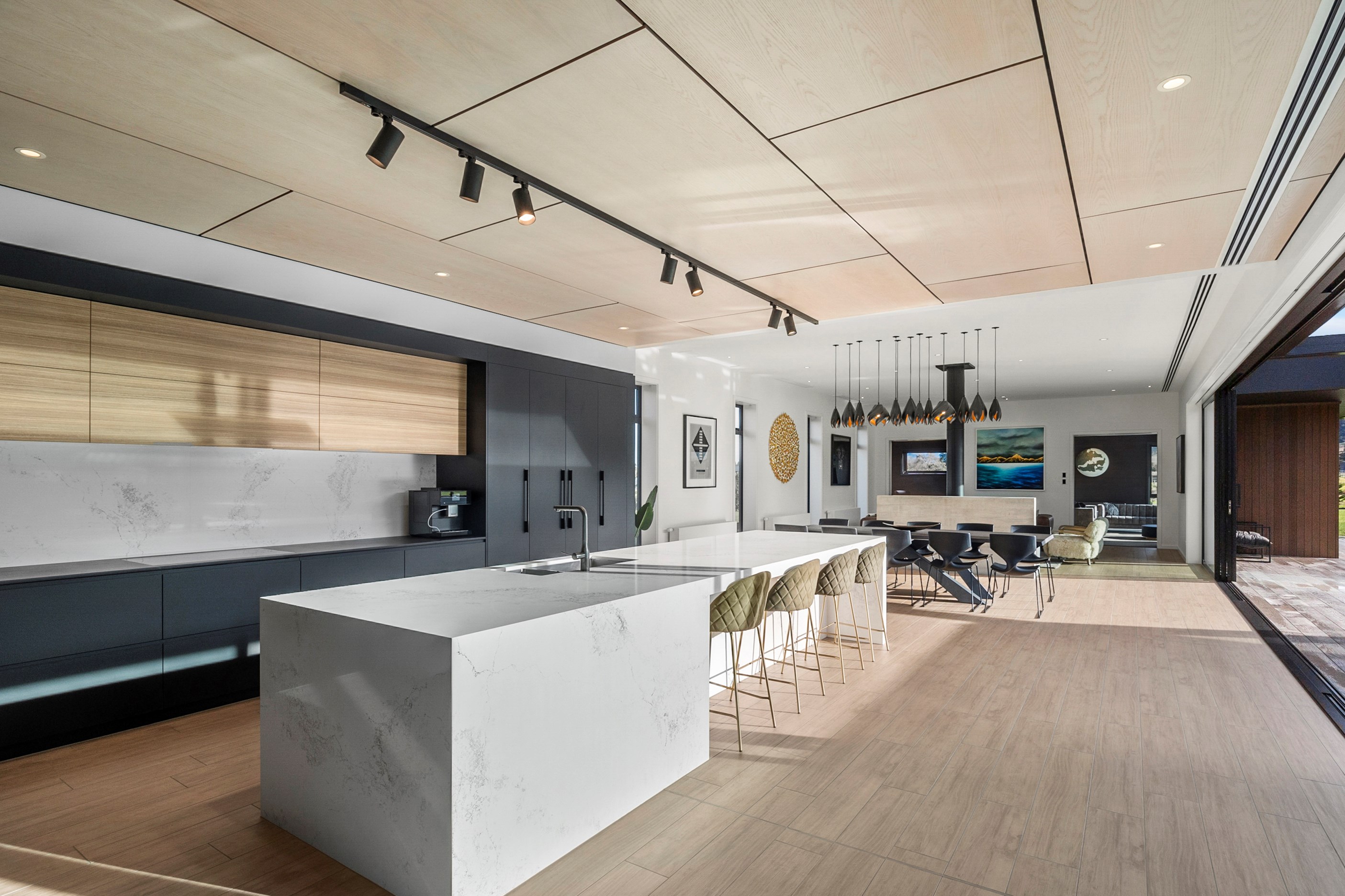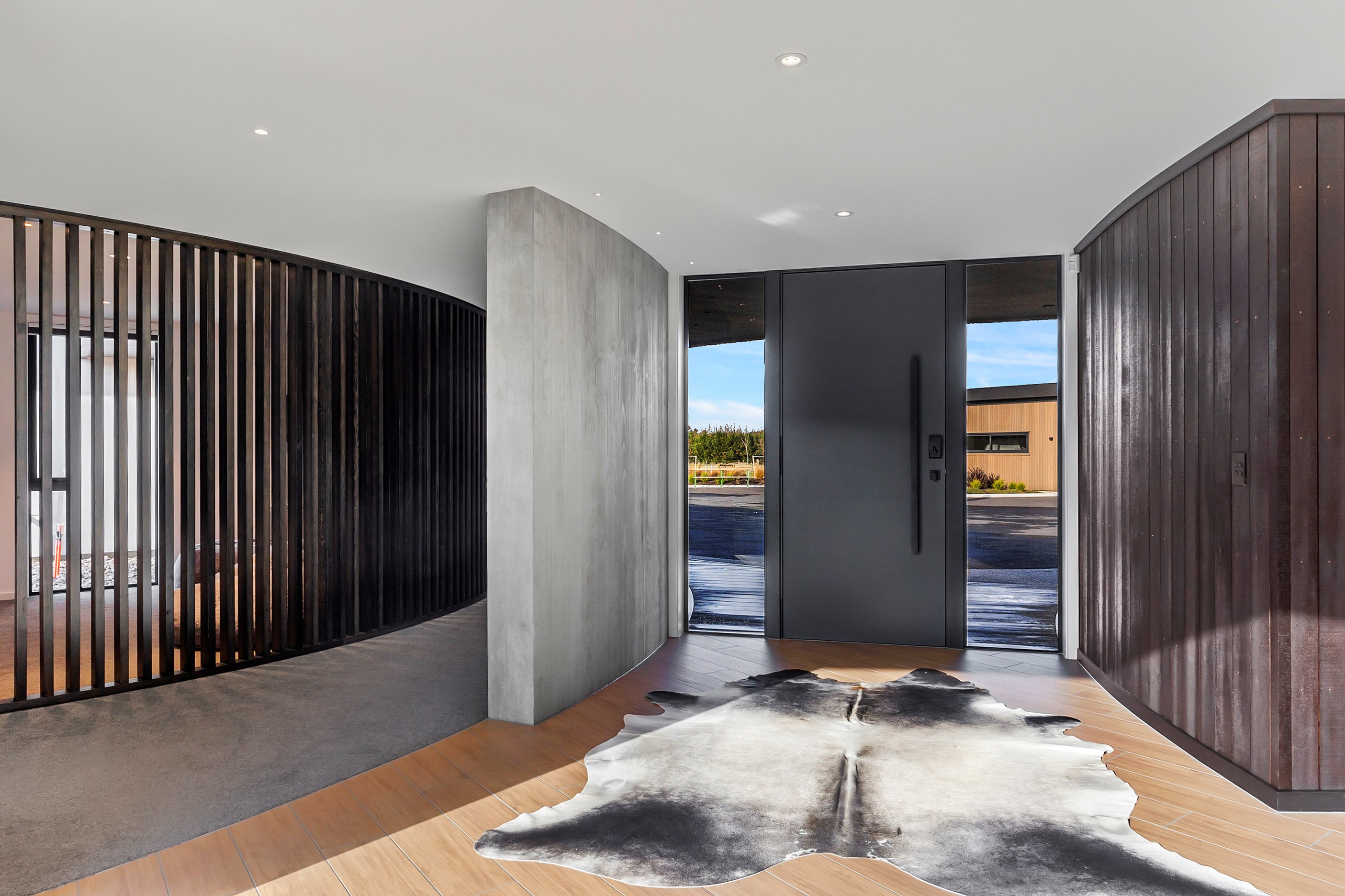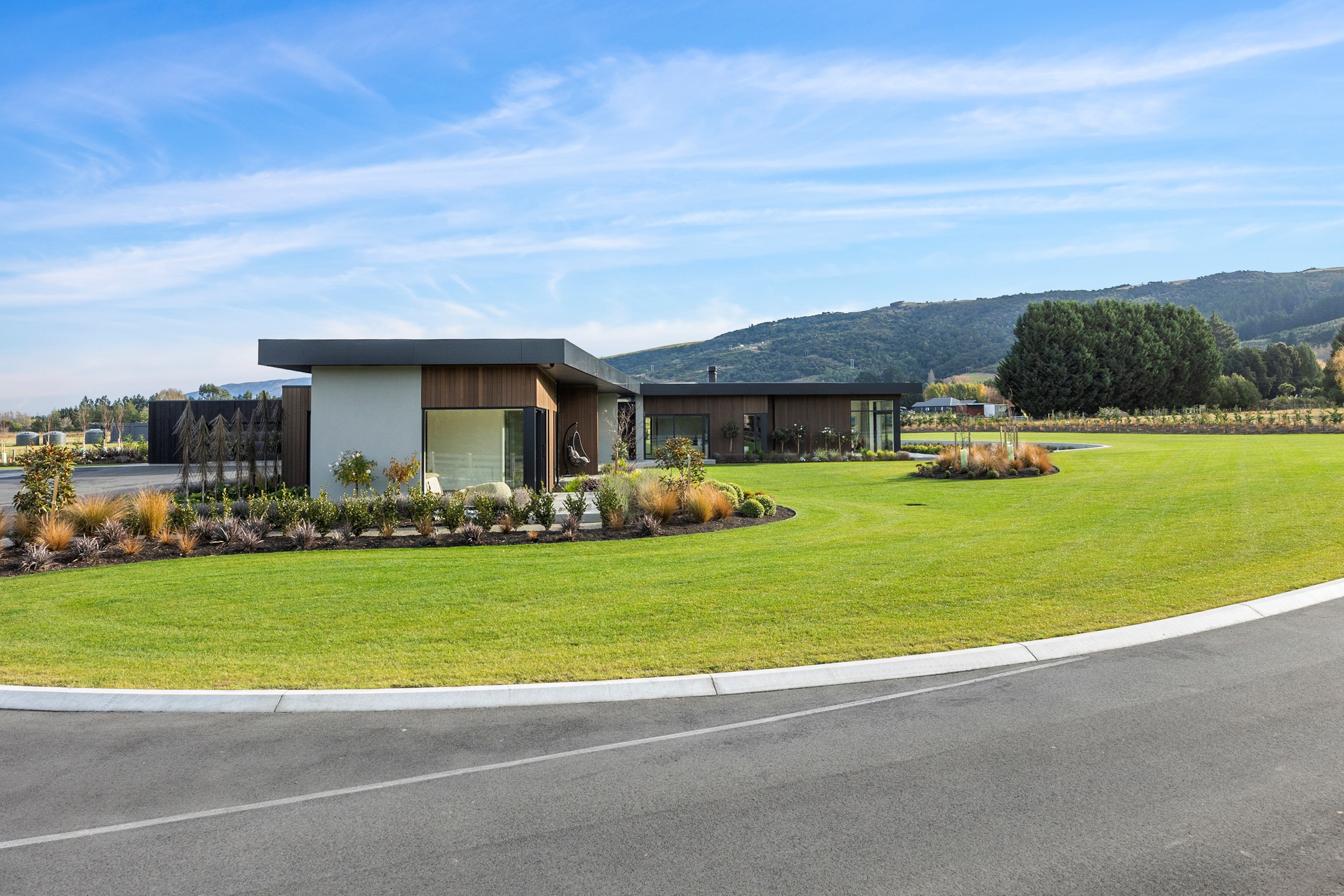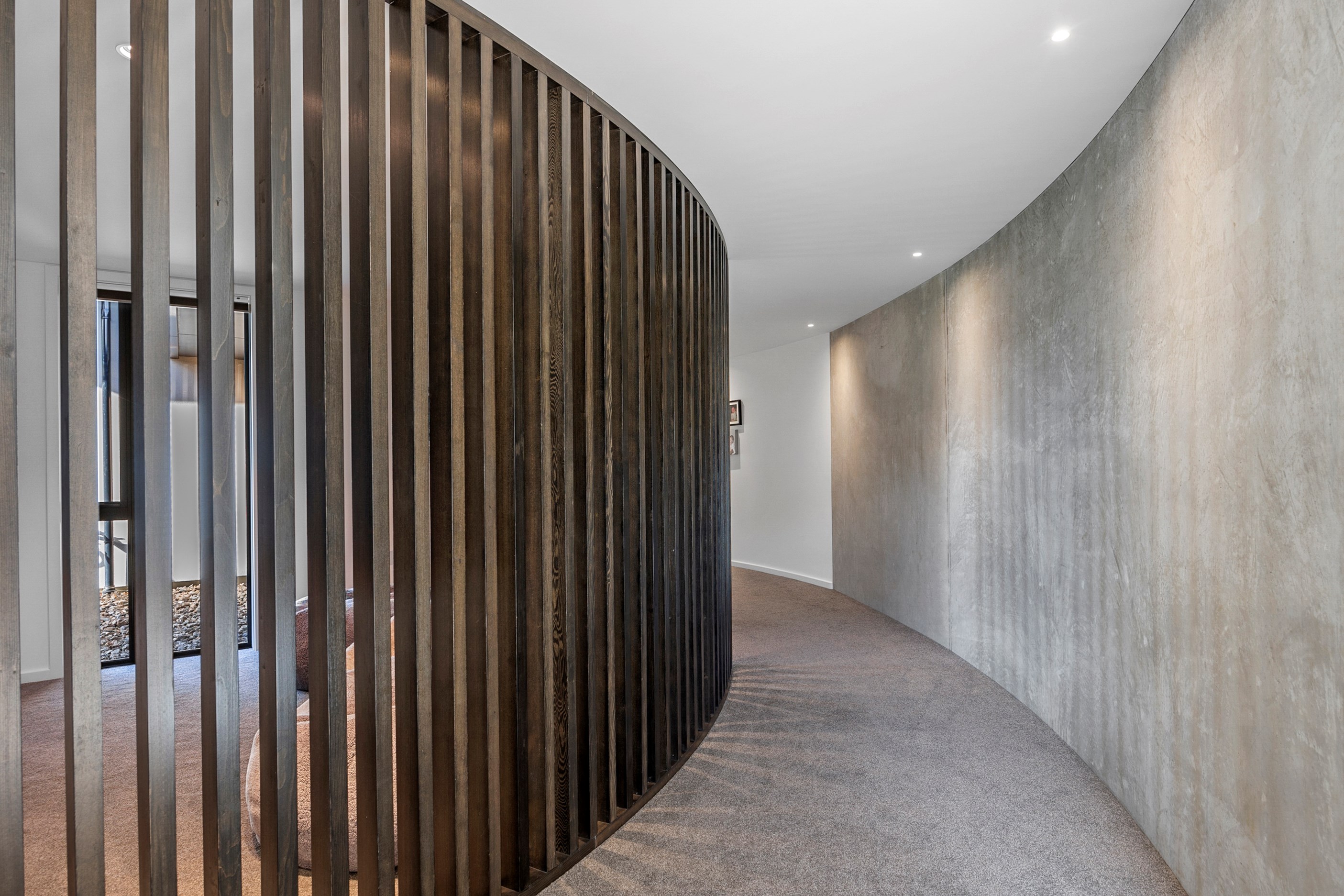 Large-scale luxury comes to the rural outskirts of Dunedin in this sprawling, low-lying masterpiece. With more than 600sqm of floor slab and about 900sqm of timber-framed roofed zones, this was a mammoth carpentry project. Enter Stevenson & Williams who approached the six-bedroom, six ensuites project, configured in a cross shape, with relish. It isn’t every day that builders get to craft projects of this epic size and with this level of opulent detail. Where to begin? The semi-rural house, with claddings of cedar shiplap, precast-concrete wall panels, plaster and metal, combines strong angles and sweeping curves in one striking development.