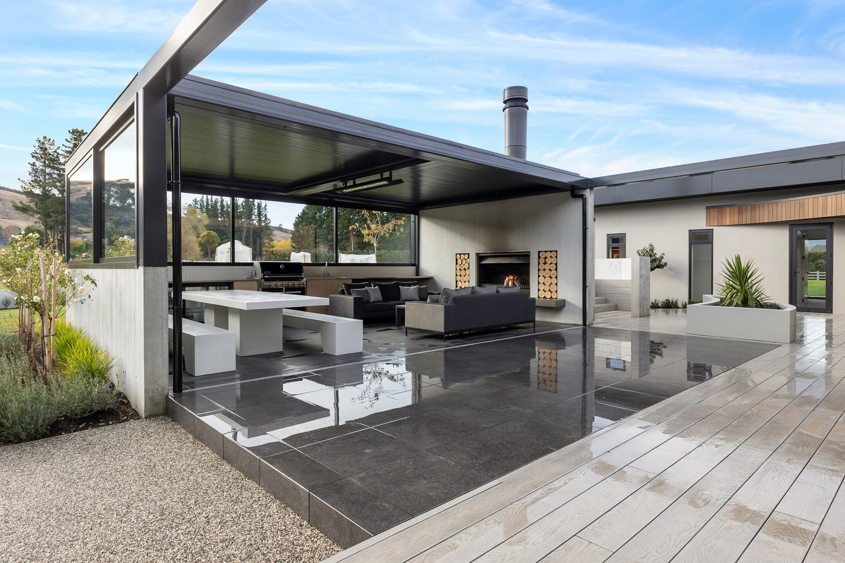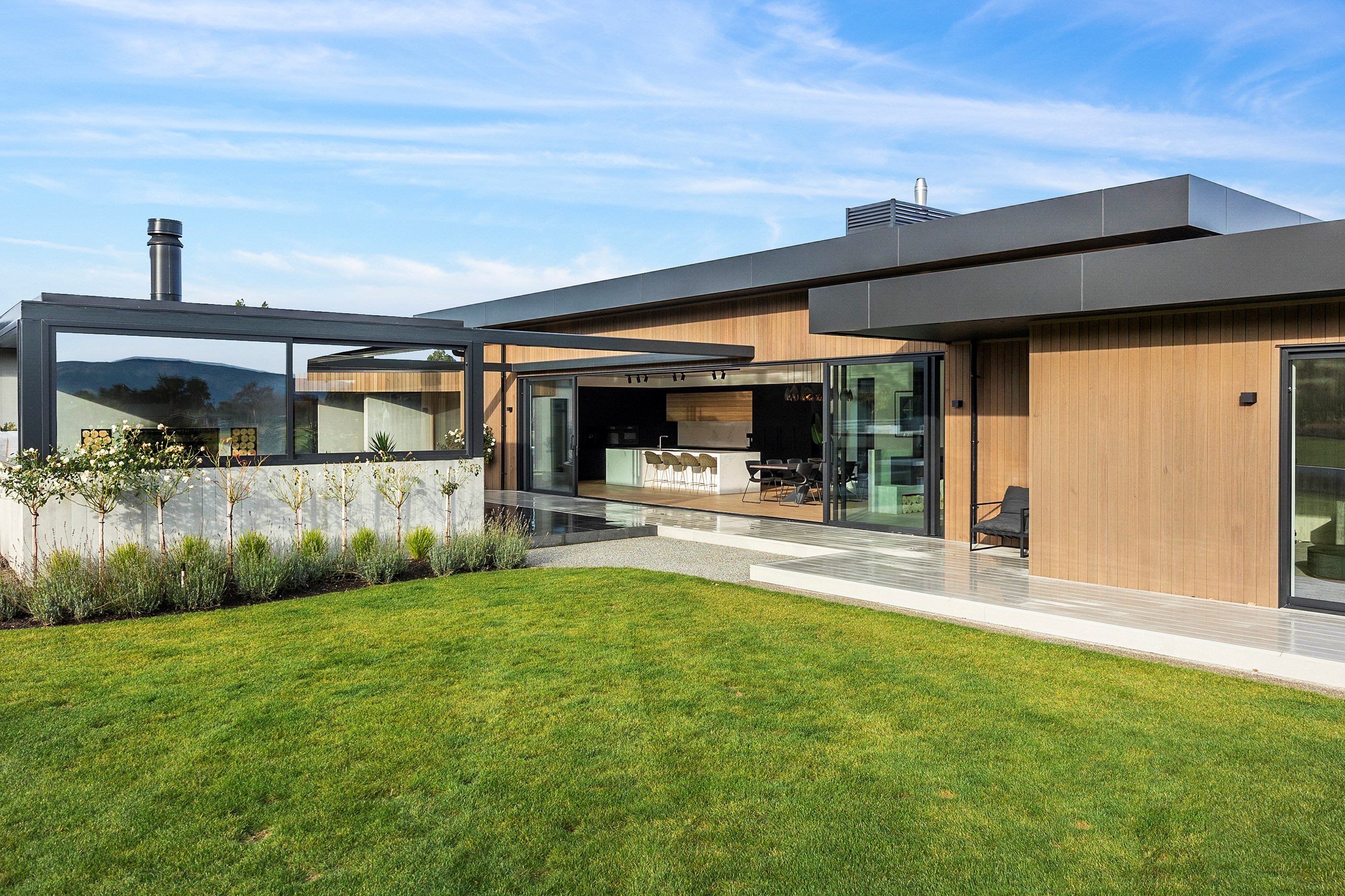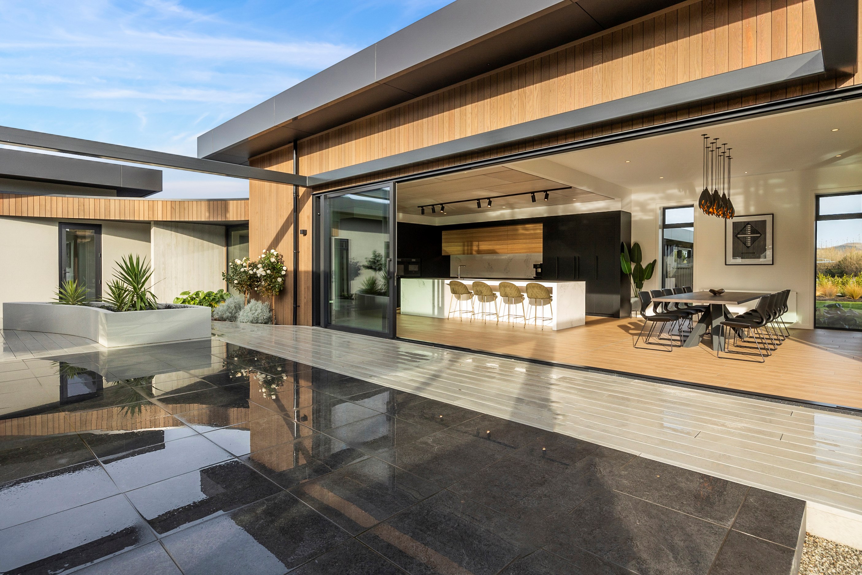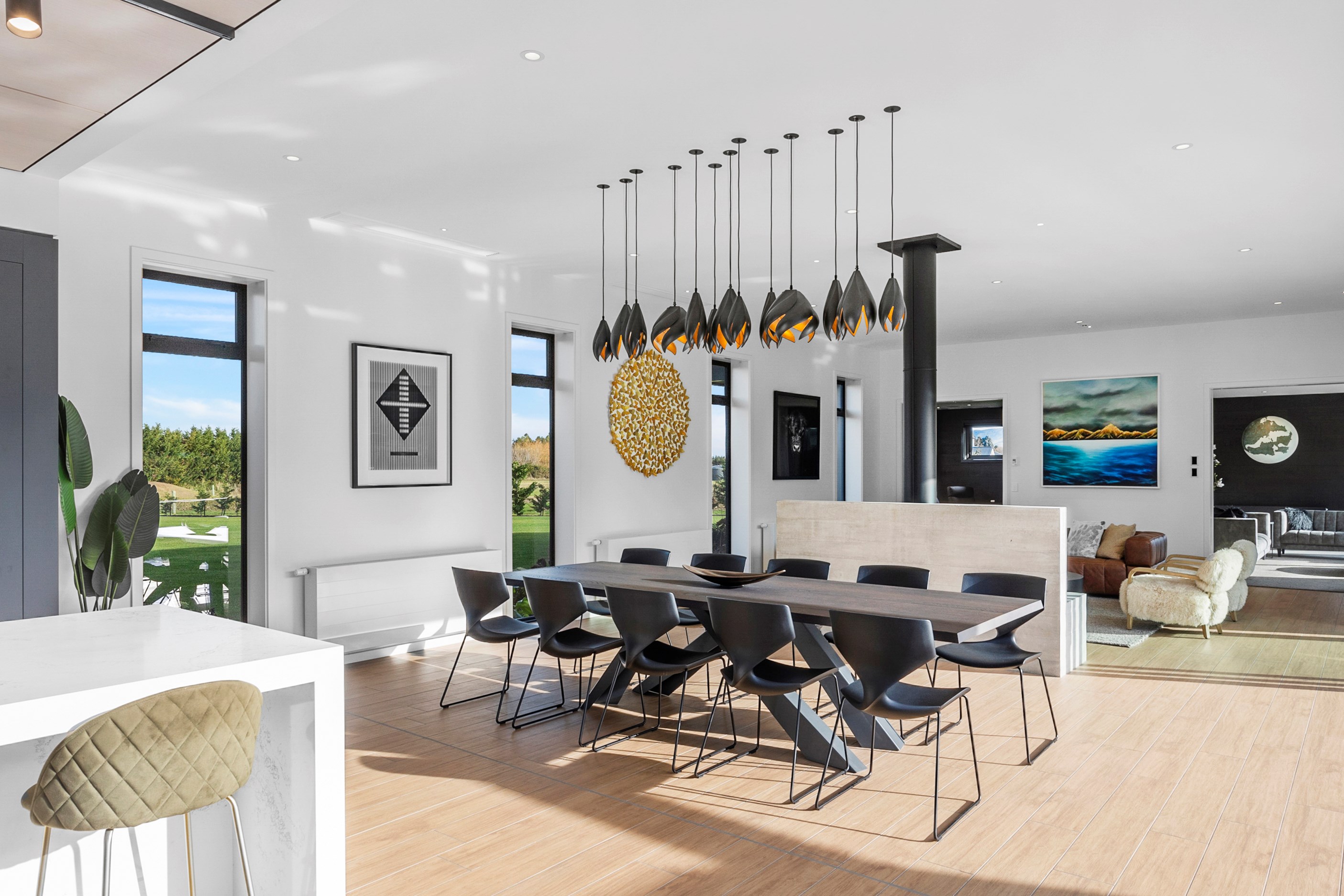Large-scale luxury comes to the rural outskirts of Dunedin in this sprawling, low-lying masterpiece. With more than 600sqm of floor slab and about 900sqm of timber-framed roofed zones, this was a mammoth carpentry project. Enter Stevenson & Williams who approached the six-bedroom, six ensuites project, configured in a cross shape, with relish. It isn’t every day that builders get to craft projects of this epic size and with this level of opulent detail. Where to begin? The semi-rural house, with claddings of cedar shiplap, precast-concrete wall panels, plaster and metal, combines strong angles and sweeping curves in one striking development.
