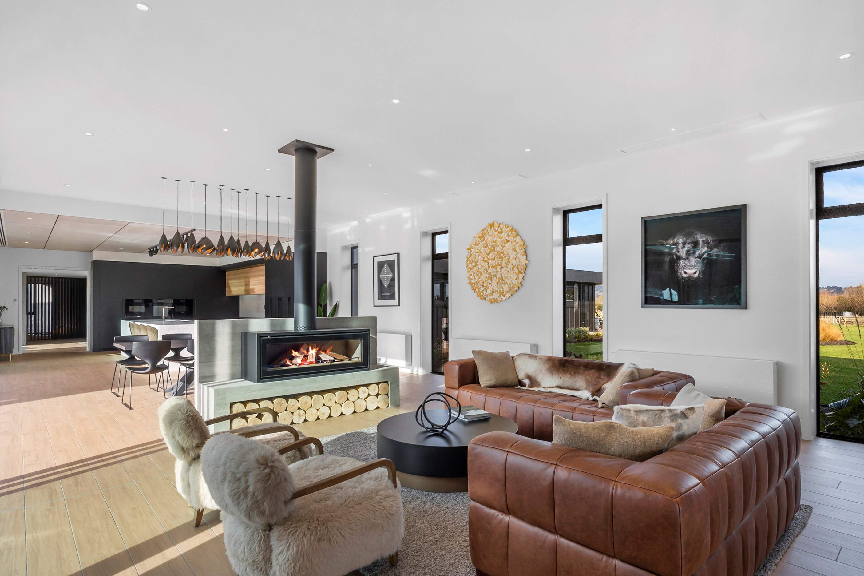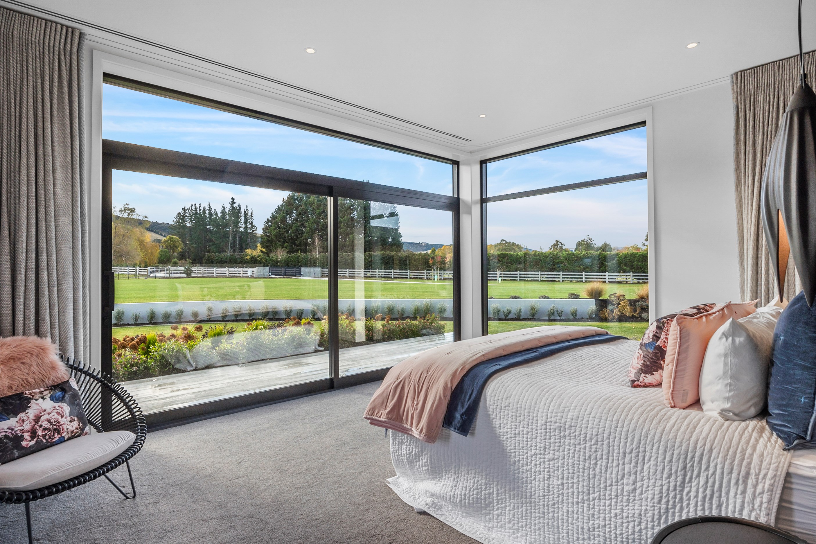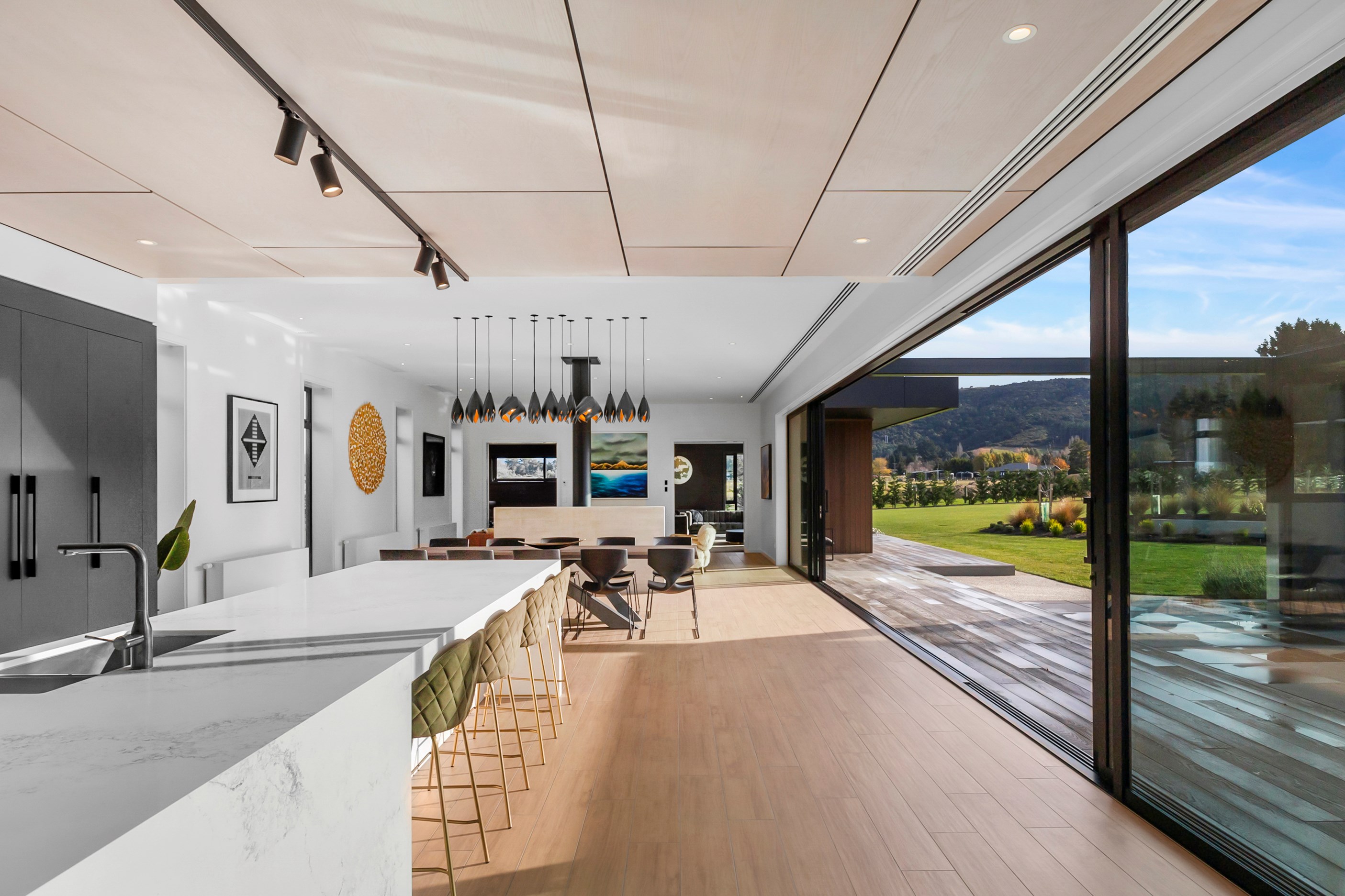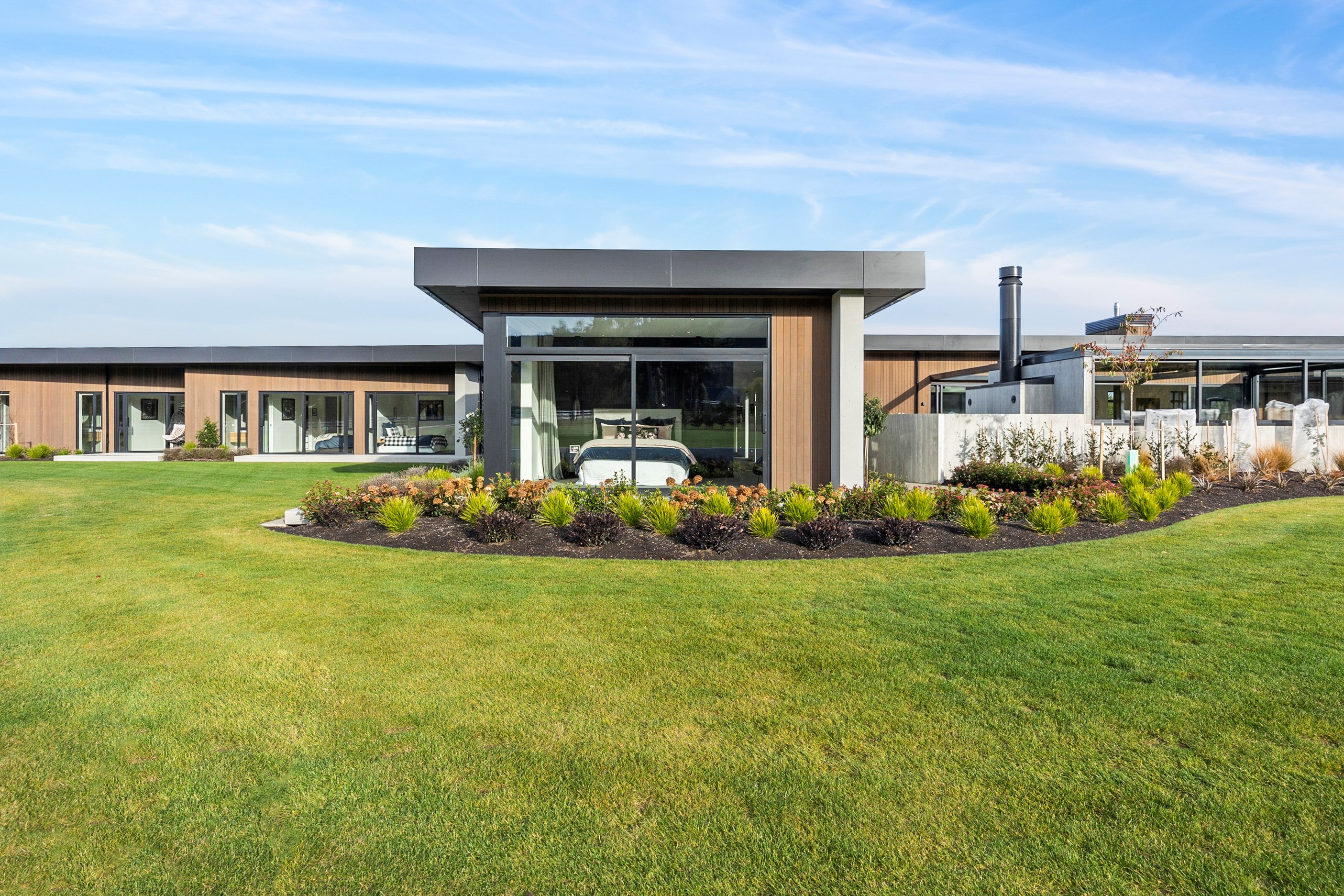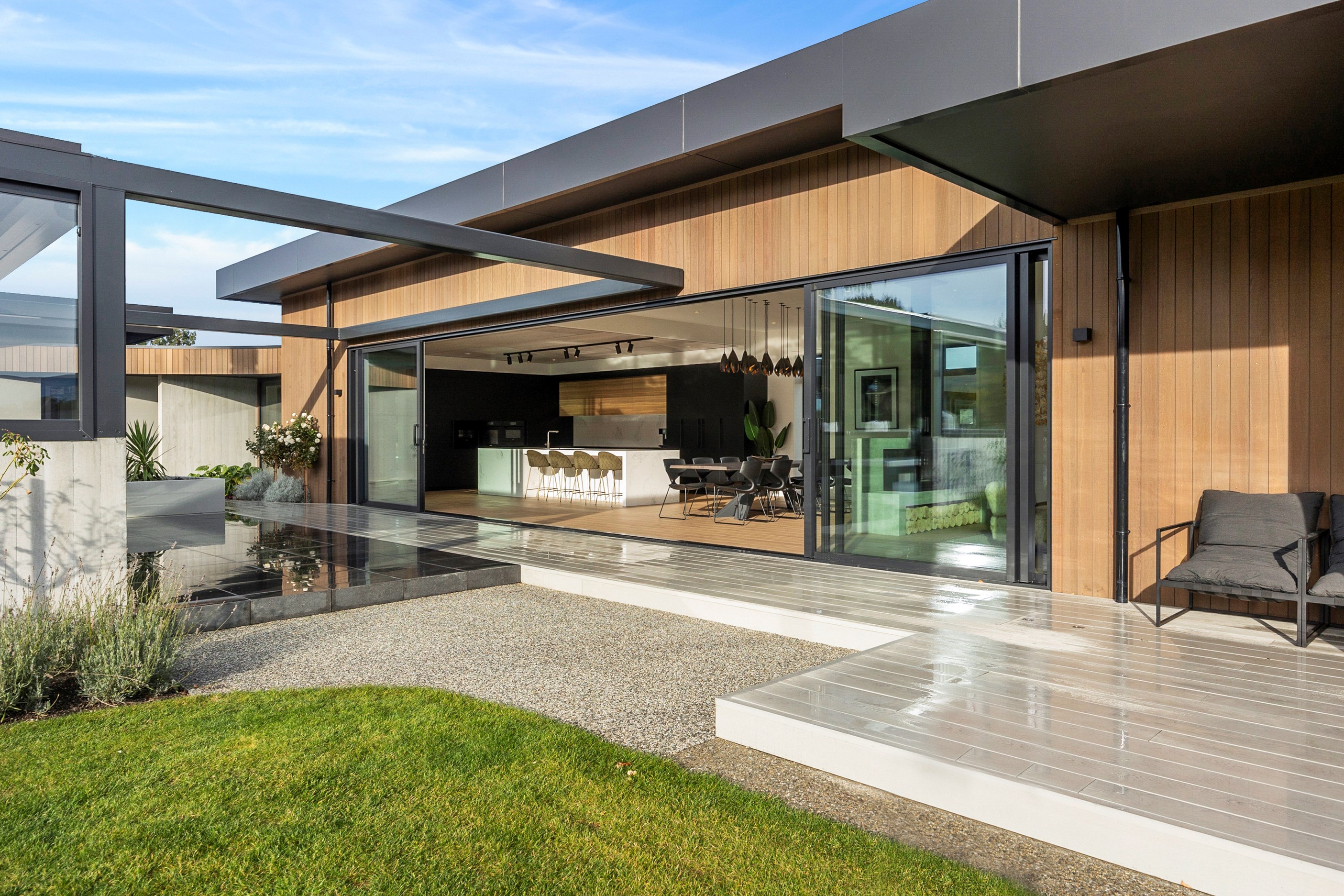Large-scale luxury comes to the rural outskirts of Dunedin in this sprawling, low-lying masterpiece. With more than 600sqm of floor slab and about 900sqm of timber-framed roofed zones, this was a mammoth carpentry project. Enter Stevenson & Williams who approached the six-bedroom, six ensuites project, configured in a cross shape, with relish. It isn’t every day that builders get to craft projects of this epic size and with this level of opulent detail. Where to begin? The semi-rural house, with claddings of cedar shiplap, precast-concrete wall panels, plaster and metal, combines strong angles and sweeping curves in one striking development.
