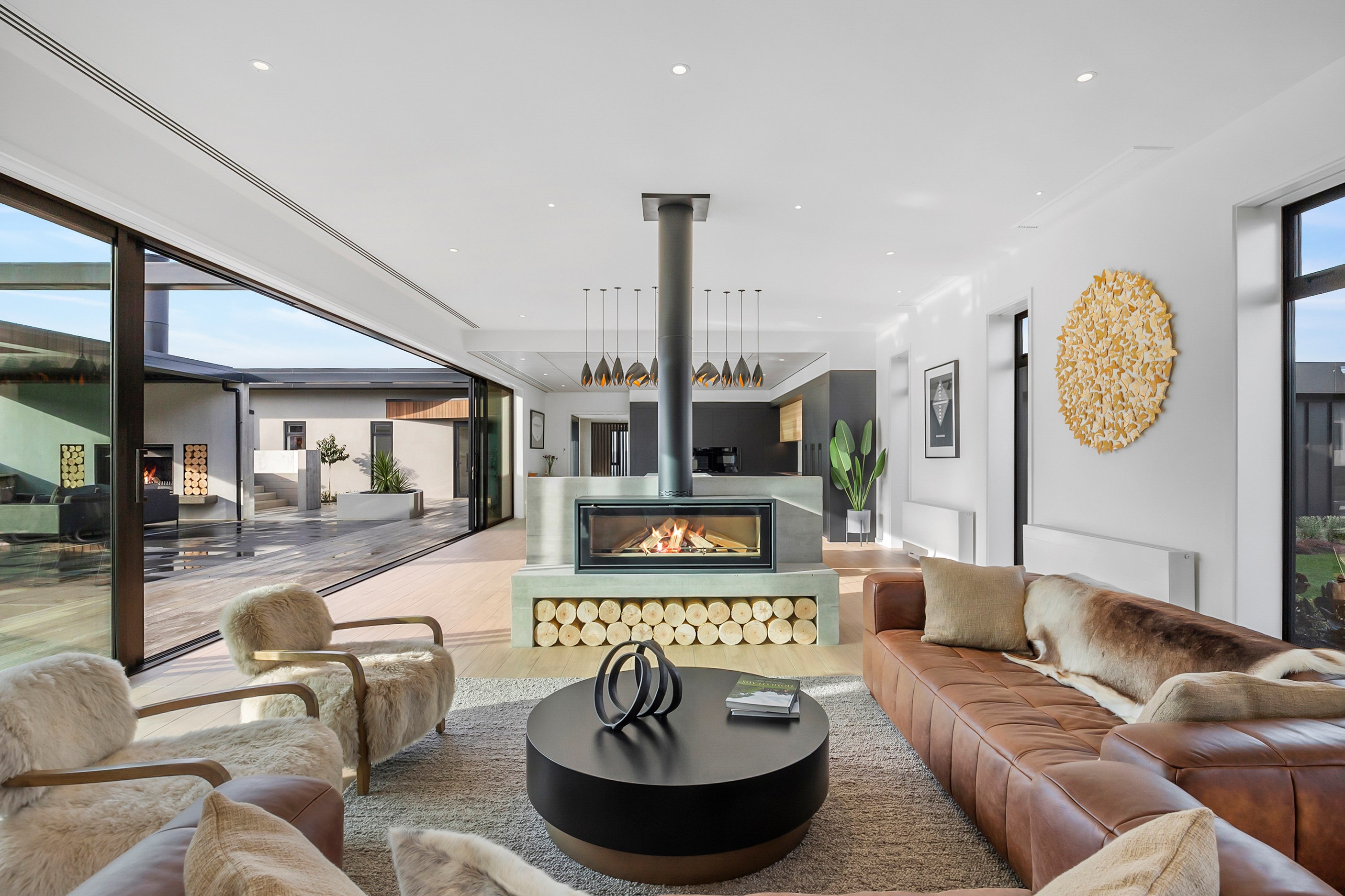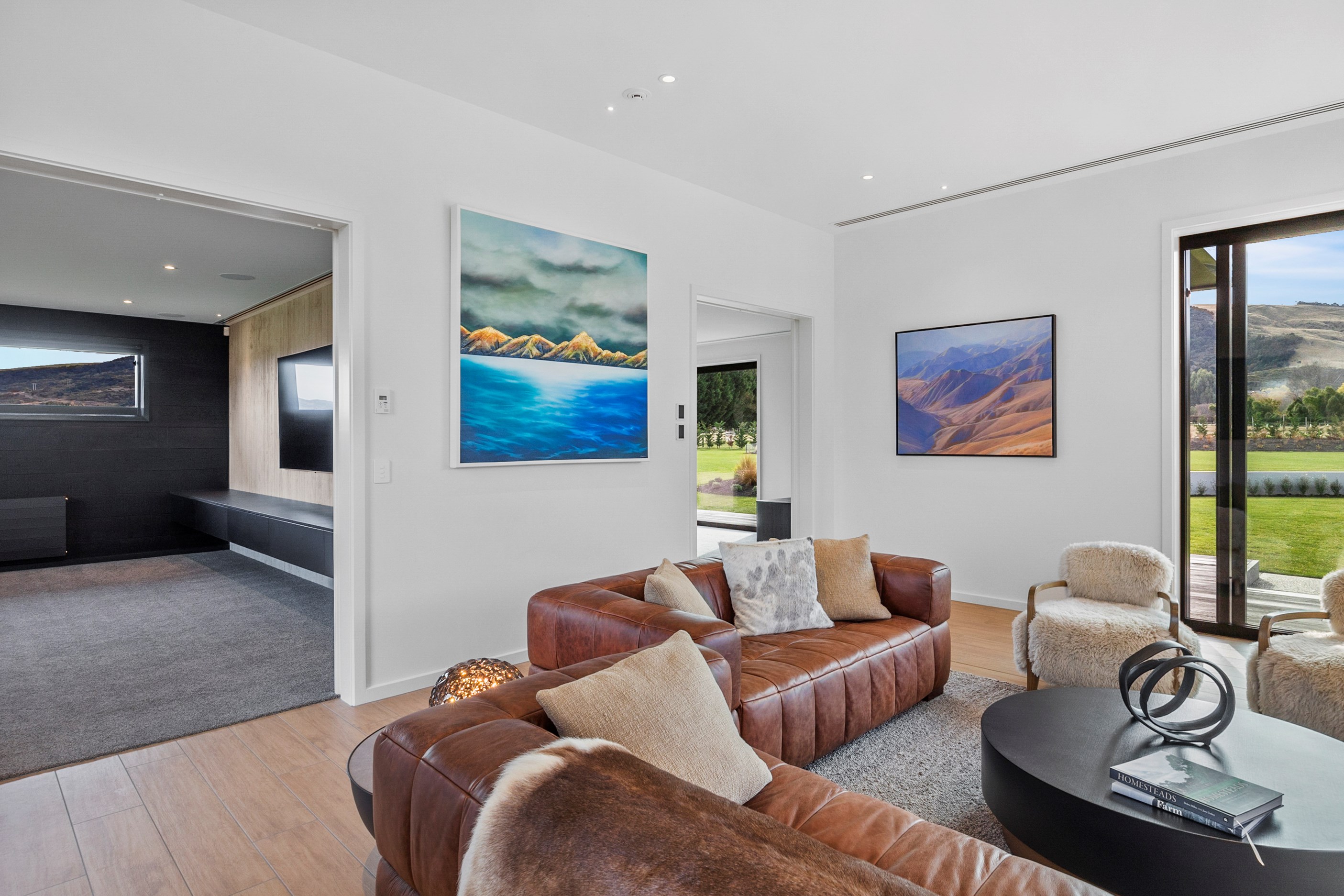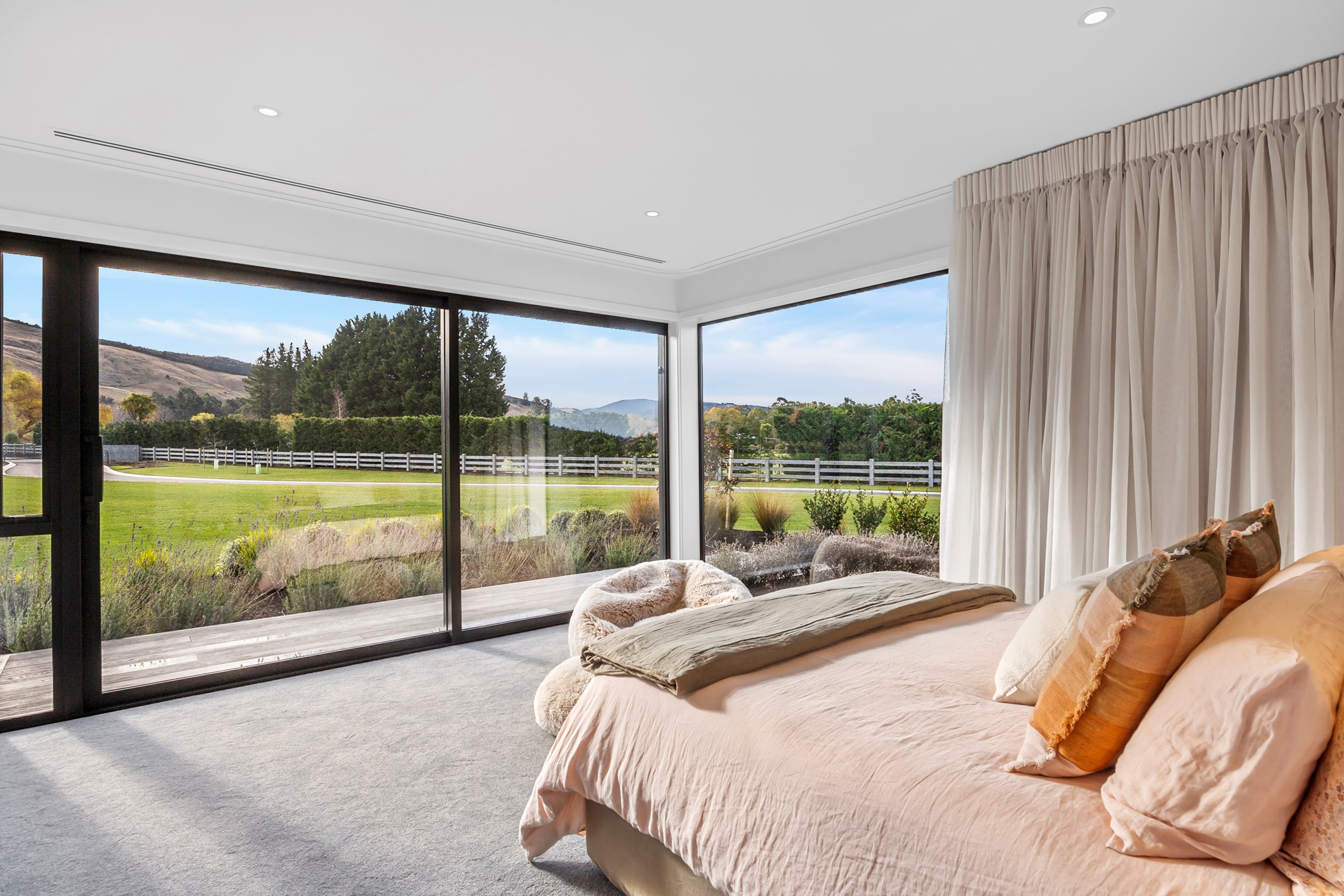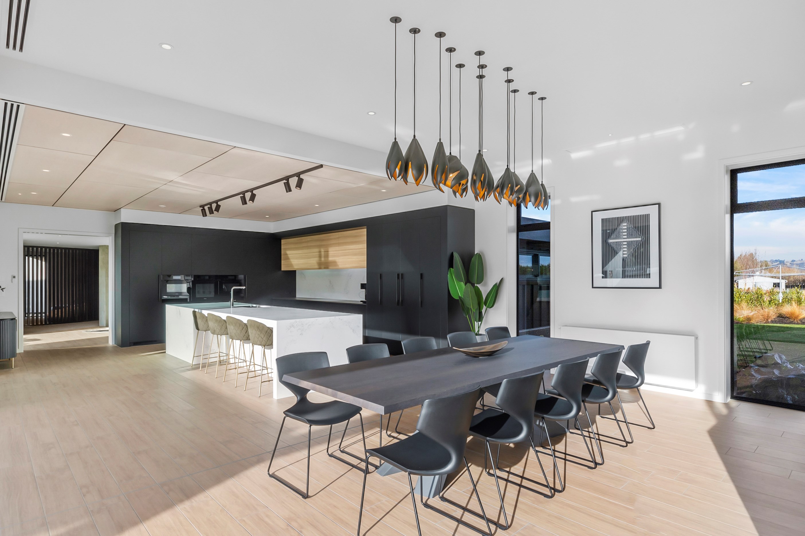 Large-scale luxury comes to the rural outskirts of Dunedin in this sprawling, low-lying masterpiece. With more than 600sqm of floor slab and about 900sqm of timber-framed roofed zones, this was a mammoth carpentry project. Enter Stevenson & Williams who approached the six-bedroom, six ensuites project, configured in a cross shape, with relish. It isn’t every day that builders get to craft projects of this epic size and with this level of opulent detail. Where to begin? The semi-rural house, with claddings of cedar shiplap, precast-concrete wall panels, plaster and metal, combines strong angles and sweeping curves in one striking development.