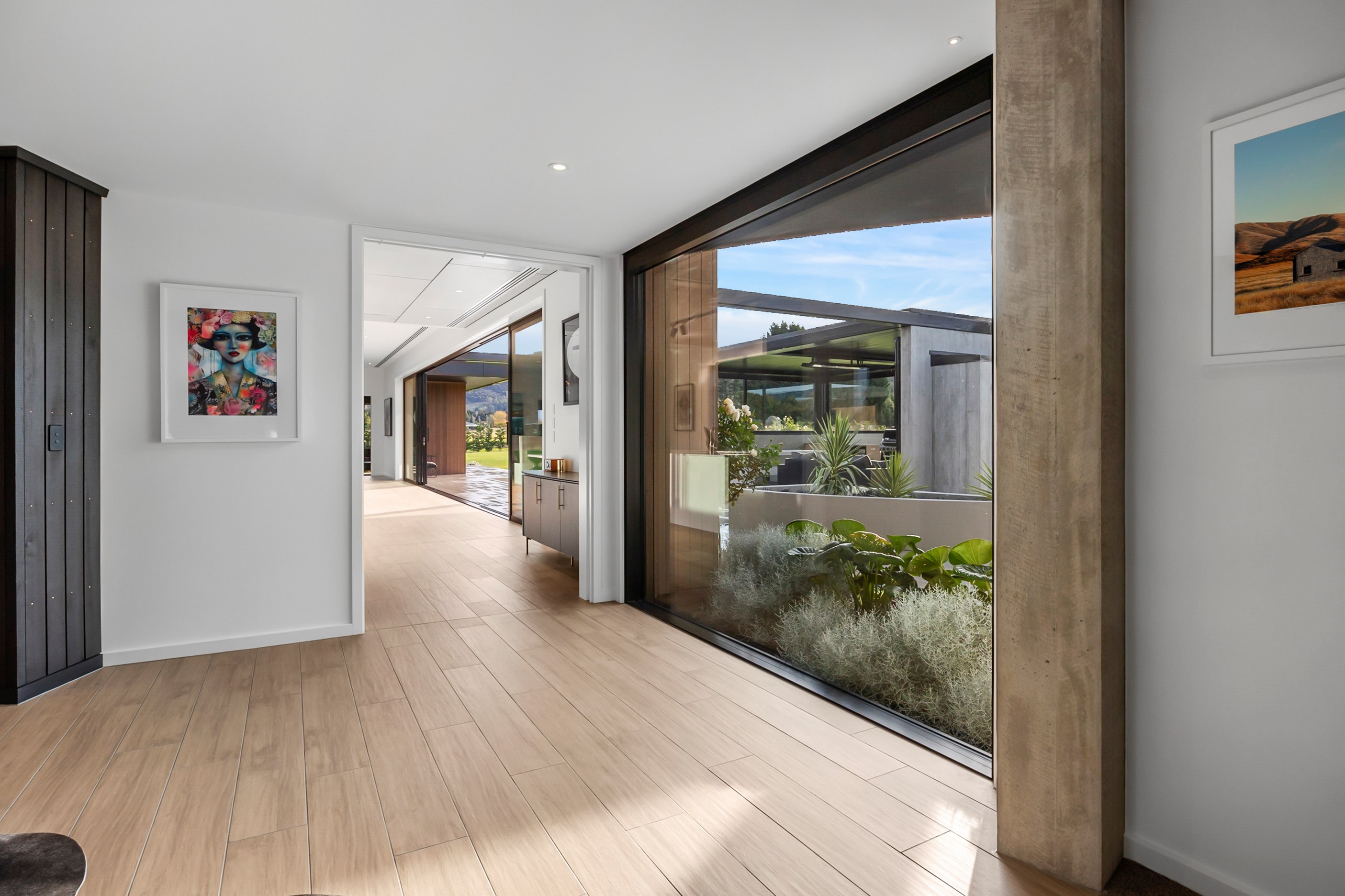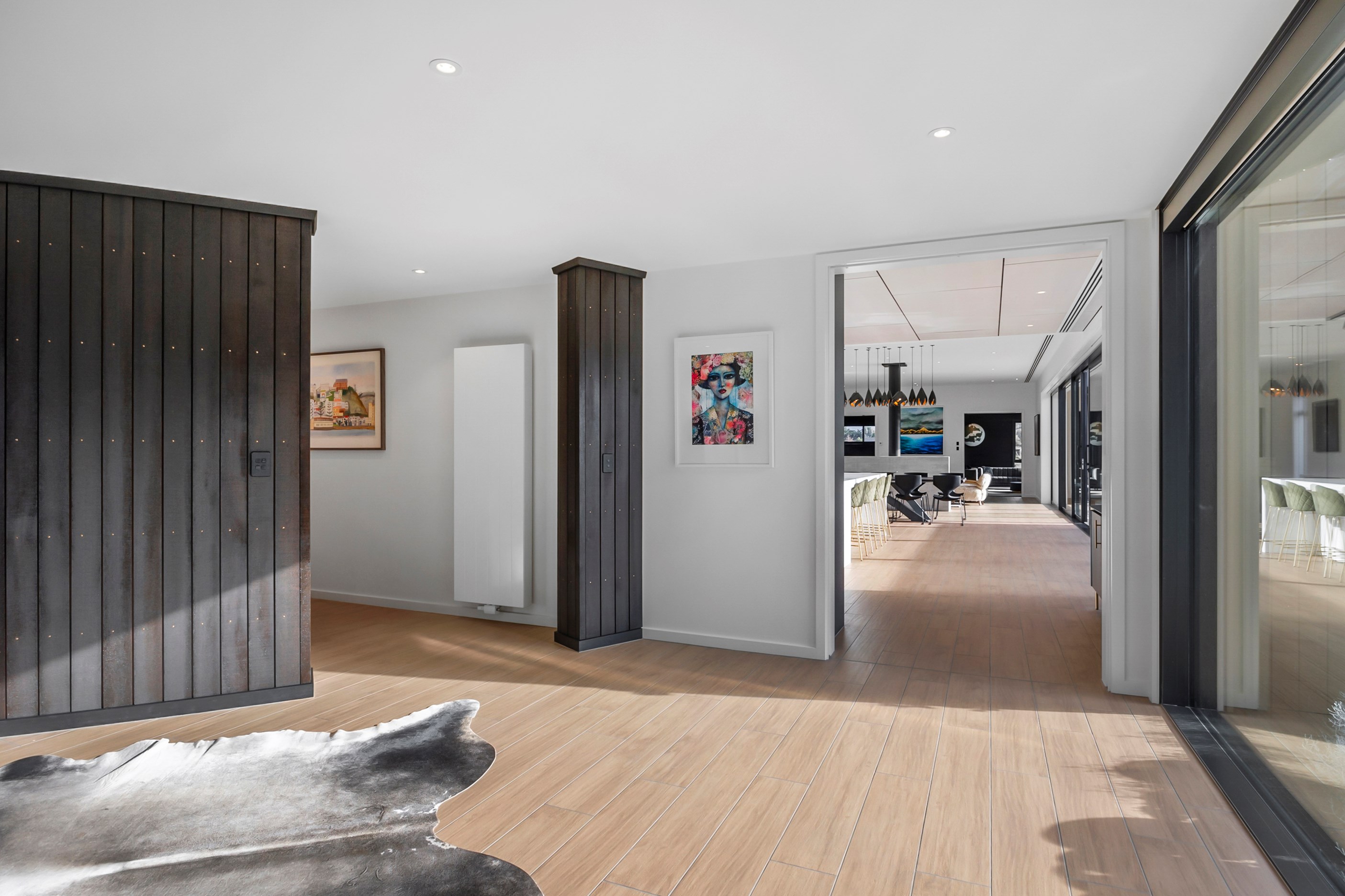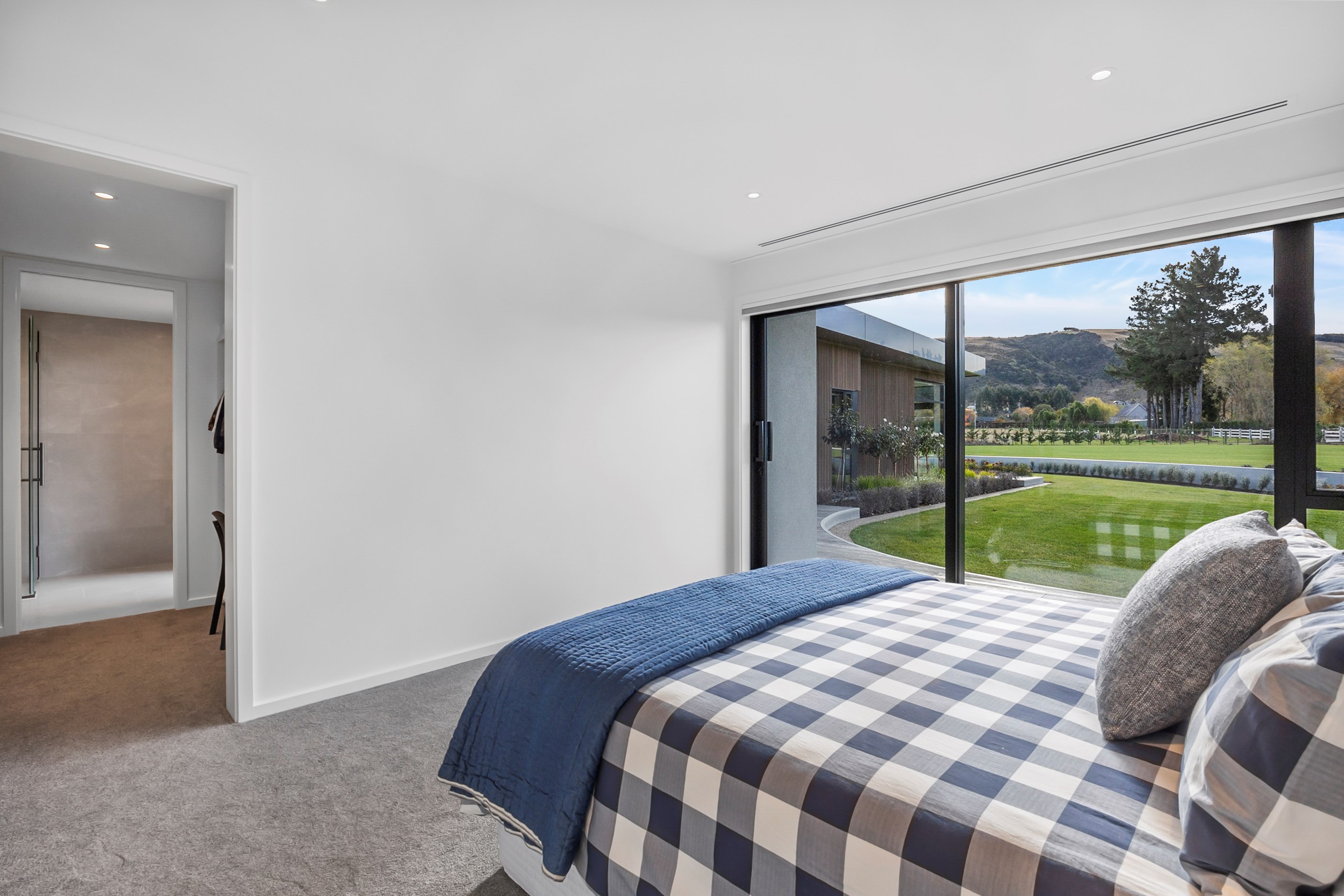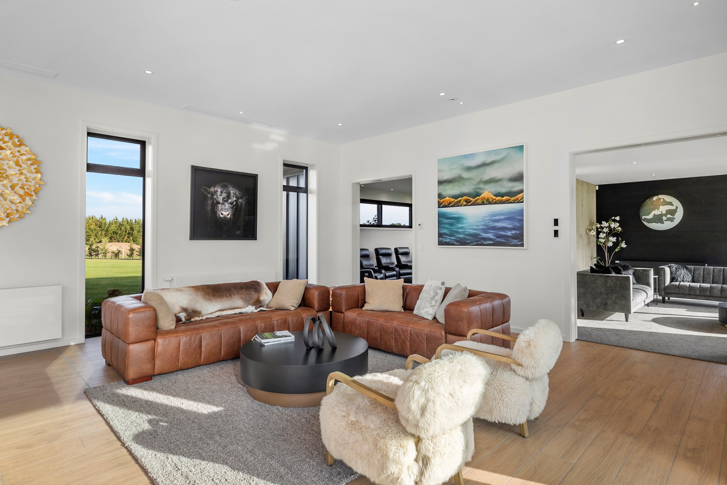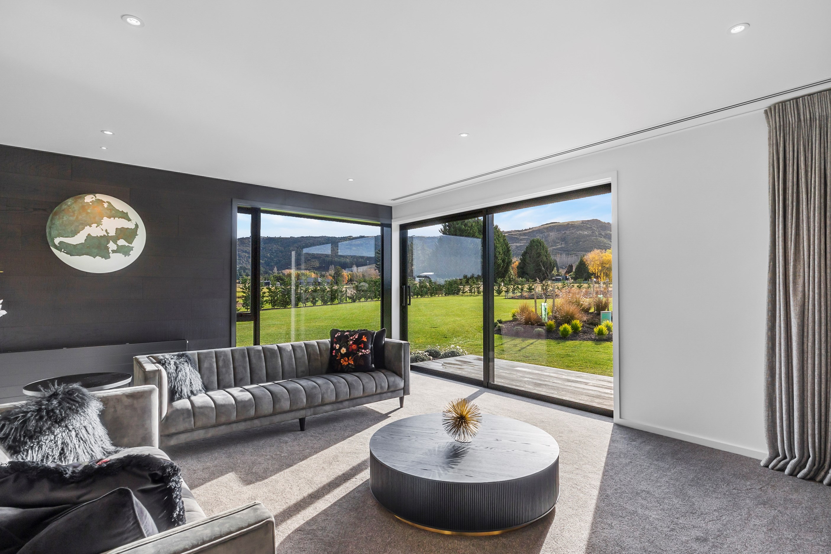Large-scale luxury comes to the rural outskirts of Dunedin in this sprawling, low-lying masterpiece. With more than 600sqm of floor slab and about 900sqm of timber-framed roofed zones, this was a mammoth carpentry project. Enter Stevenson & Williams who approached the six-bedroom, six ensuites project, configured in a cross shape, with relish. It isn’t every day that builders get to craft projects of this epic size and with this level of opulent detail. Where to begin? The semi-rural house, with claddings of cedar shiplap, precast-concrete wall panels, plaster and metal, combines strong angles and sweeping curves in one striking development.