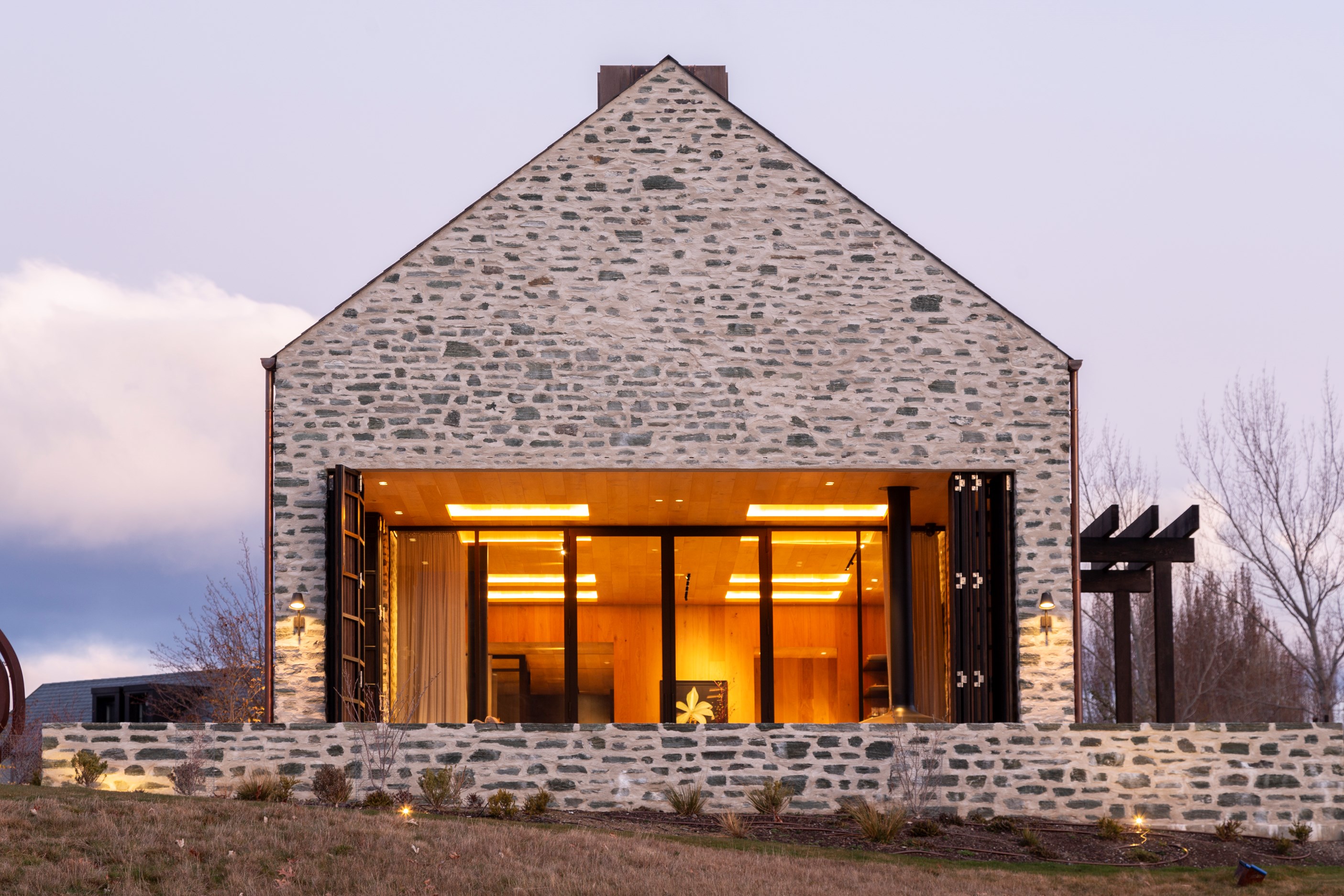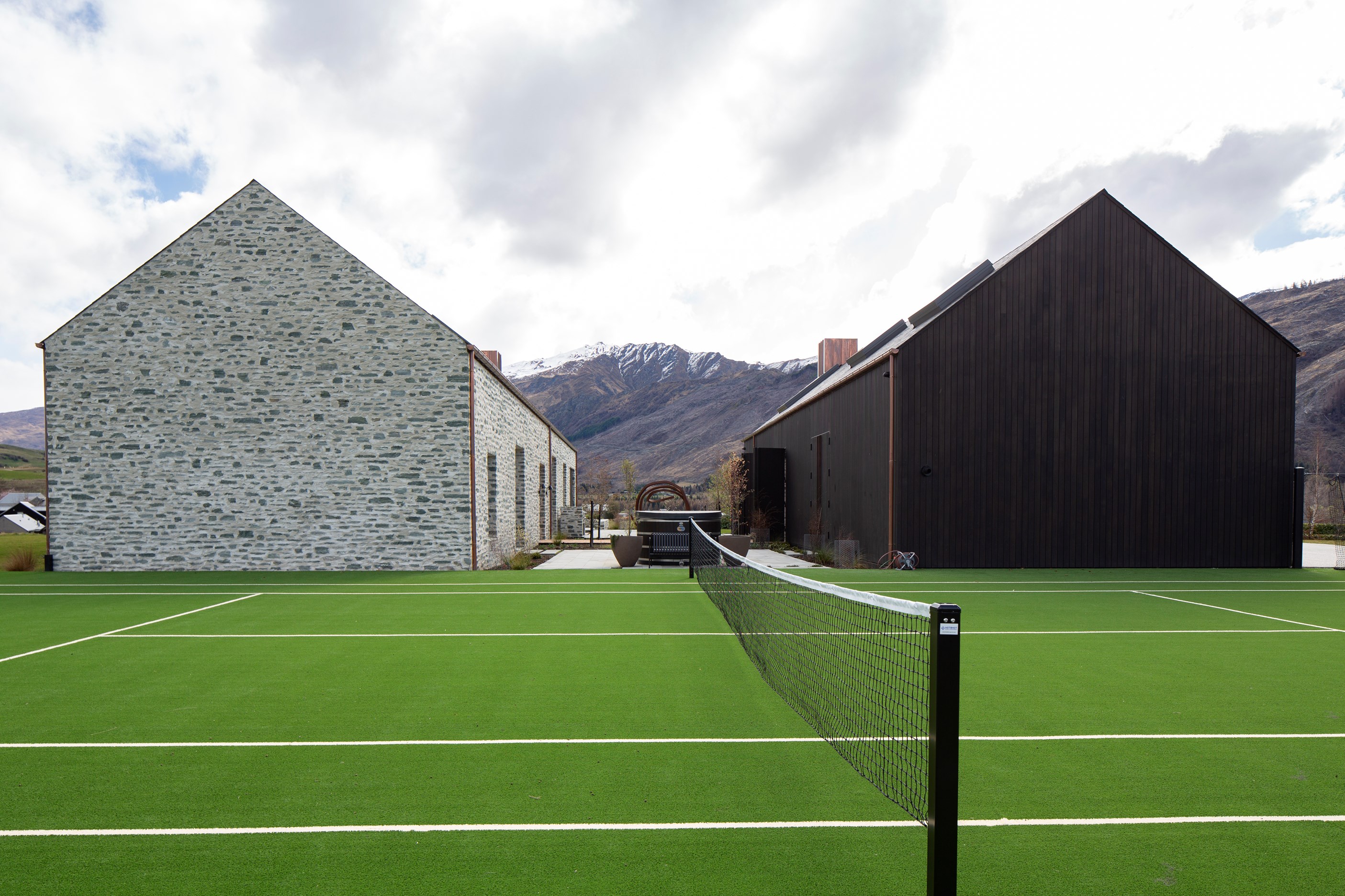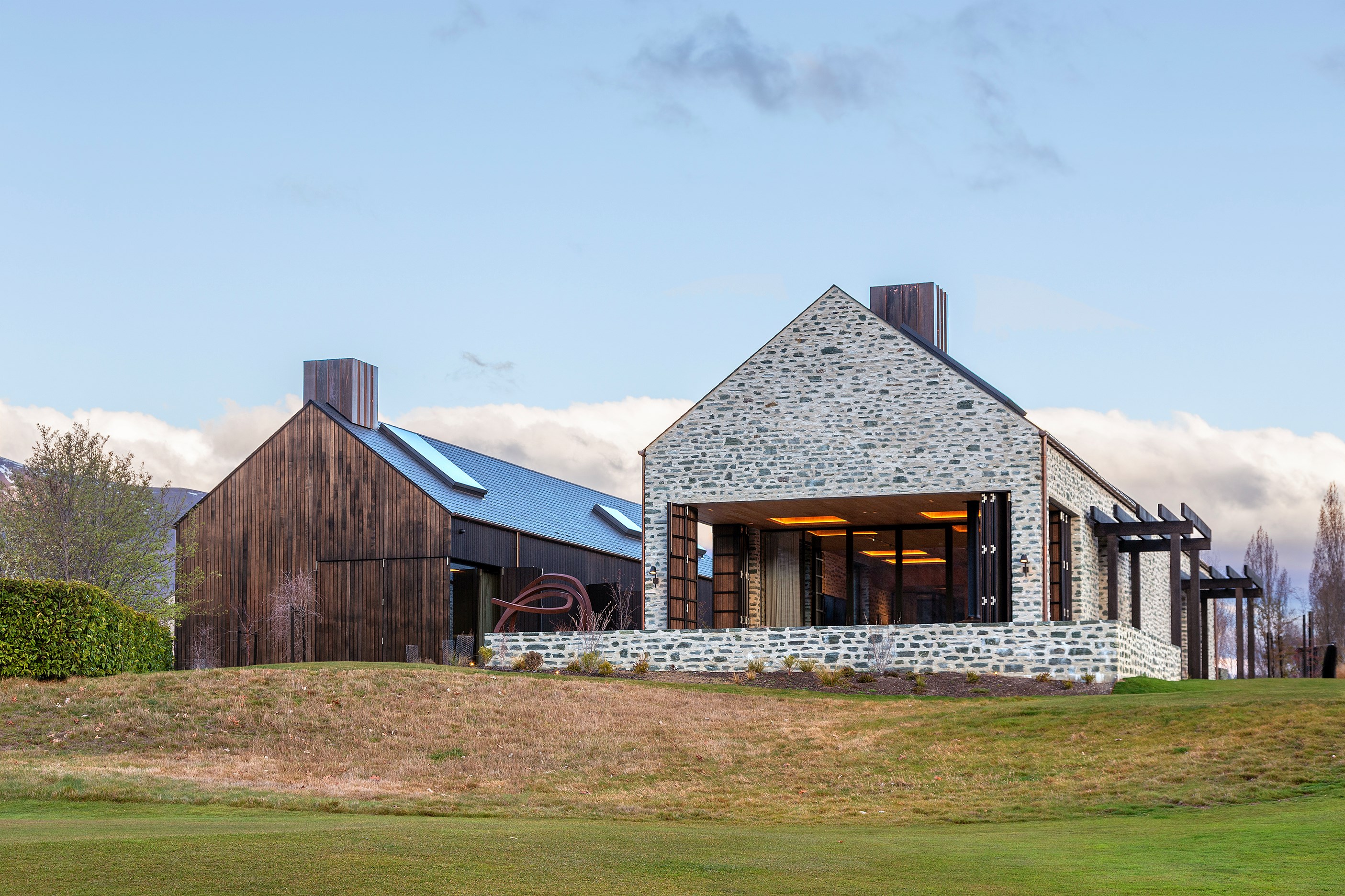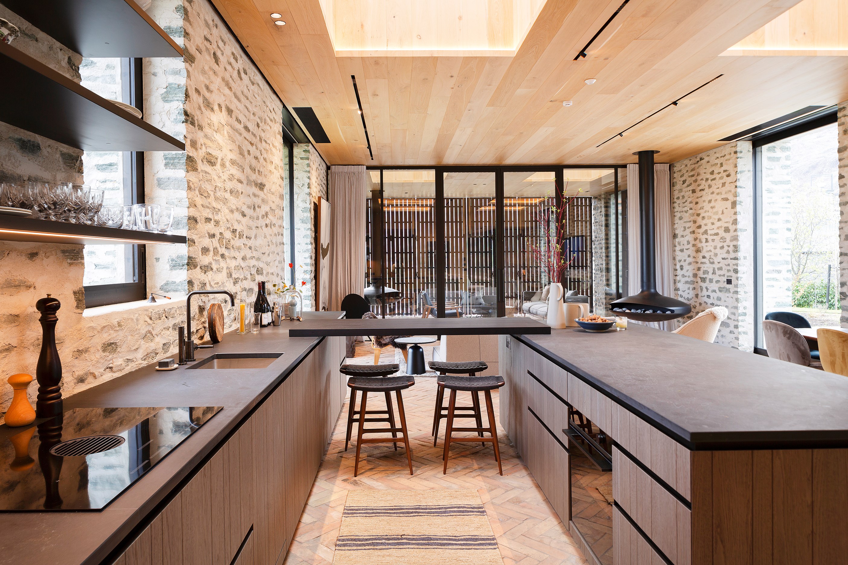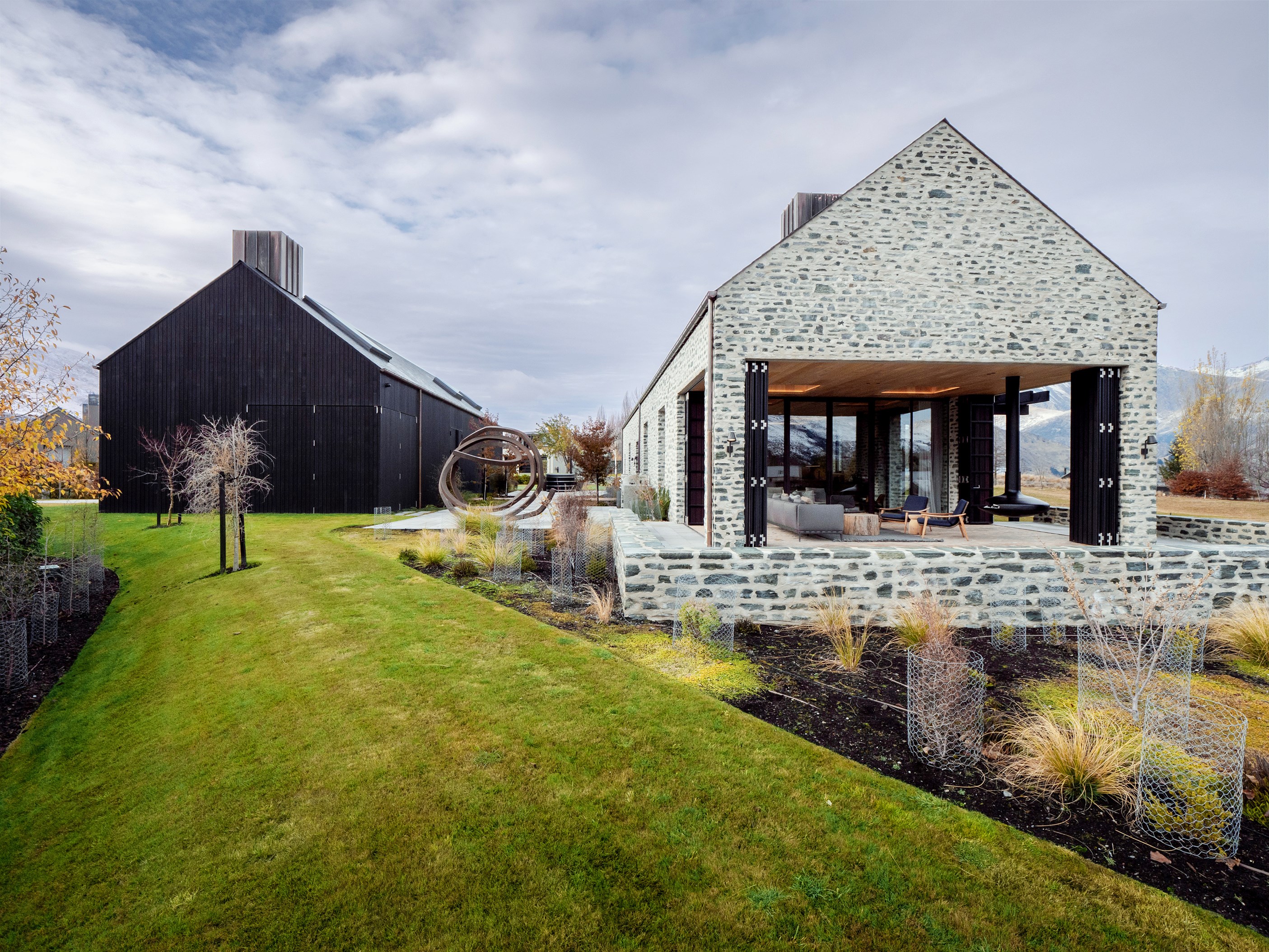 The simple barn form never looked so good. This Patterson Associates Architects-designed holiday home speaks the Central Otago language of stone and timber. The vernacular of The Gatehouse is expressed in two barn-like structures, one clad in local schist, the other in timber – wholly appropriate for a property on a former sheep station. The brief was to deliver a flexible home for family and guests, which is not as simple as it sounds. Sometimes it has to accommodate lots of people in various stages of their lives; at others, it has to be comfortable for just two. Flexibility was key to the configuration. Still,there was plenty of room to work with – 661sqm, in fact. The timber, slightly smaller of the two pavillions sits on the street side of the site and has bedrooms, bathrooms, a kitchen, living spaces and a garage. Across the courtyard and linked by a gallery is the stone pavillion, with bedrooms, a large open-plan kitchen, dining and living area.