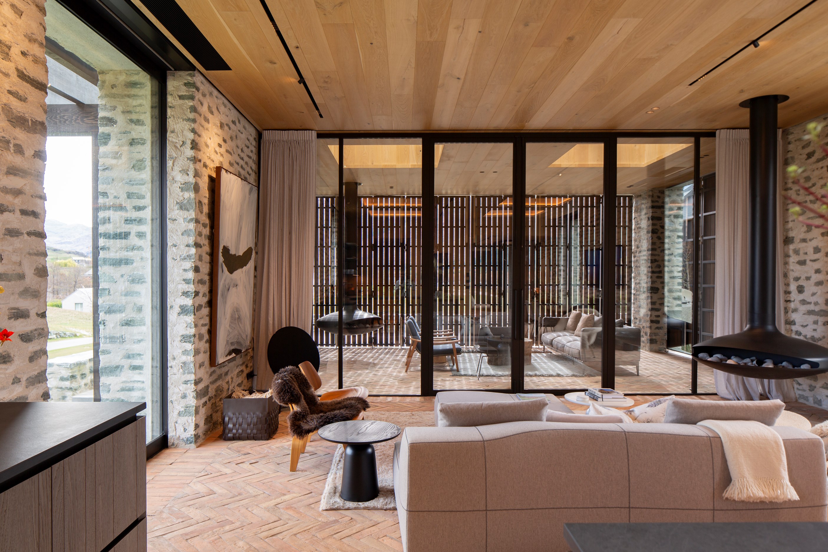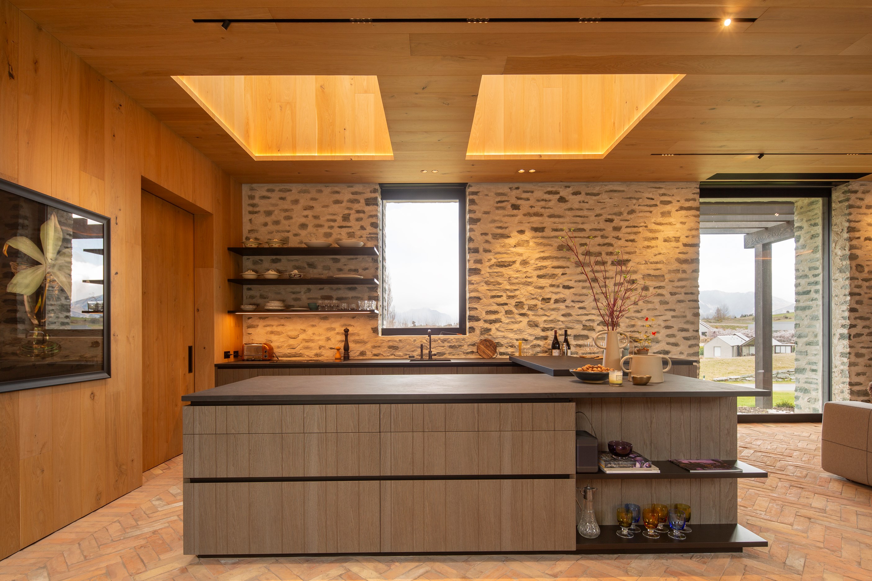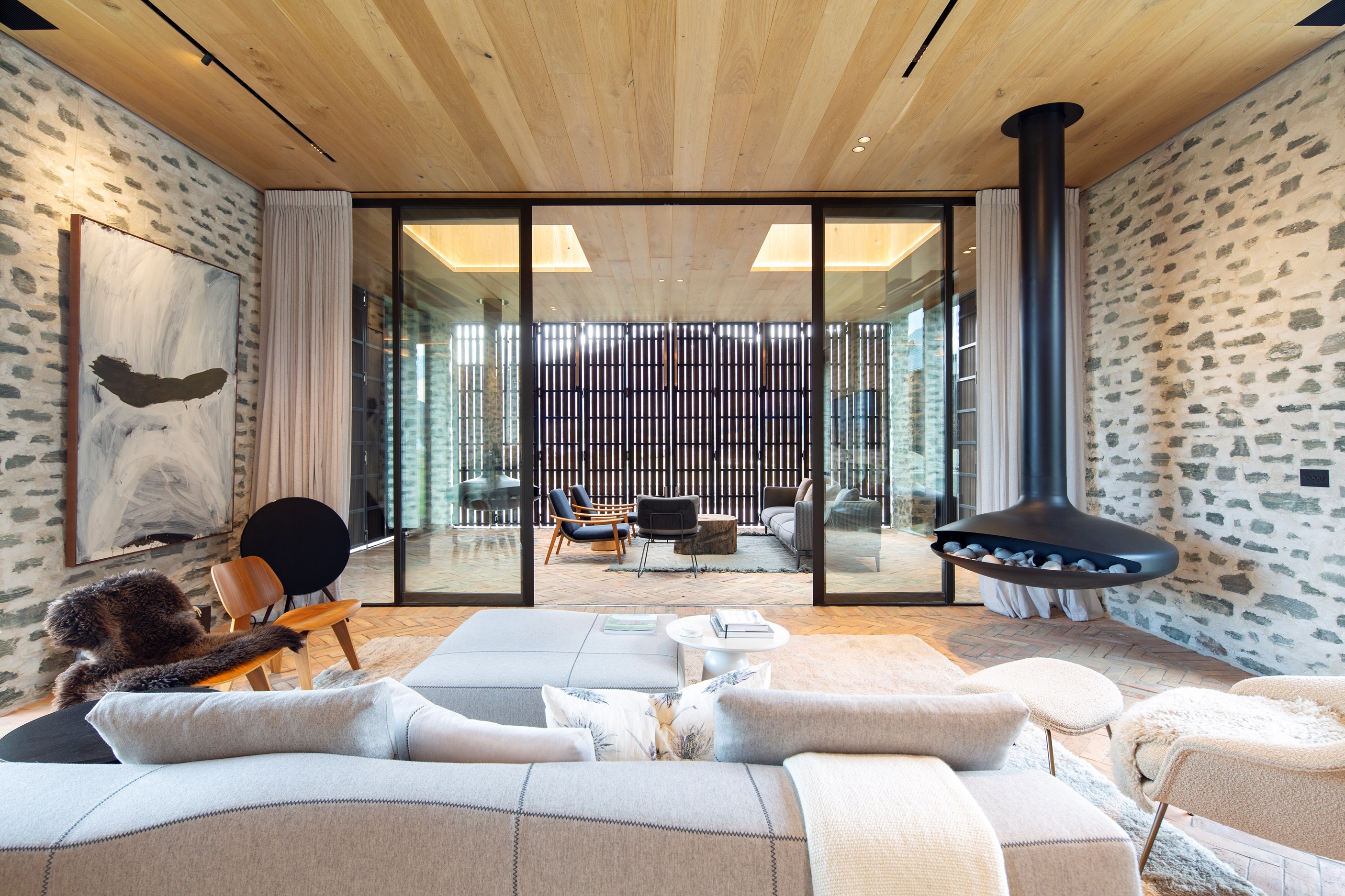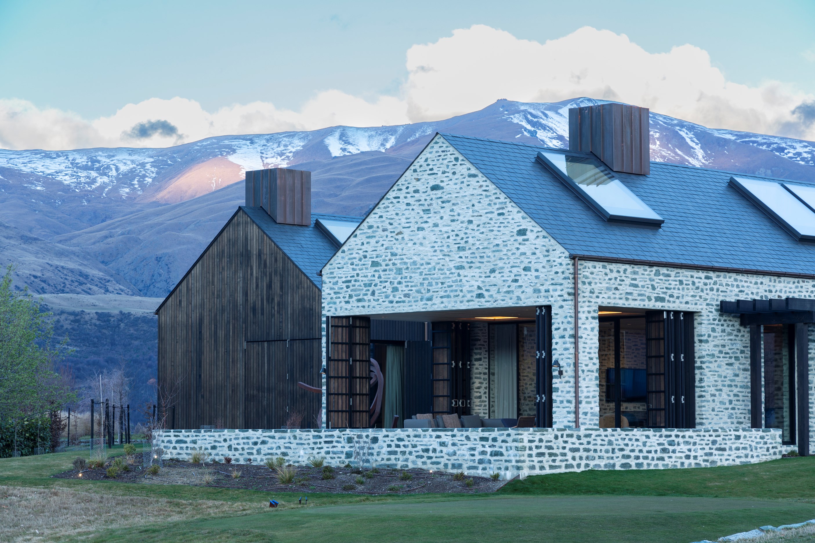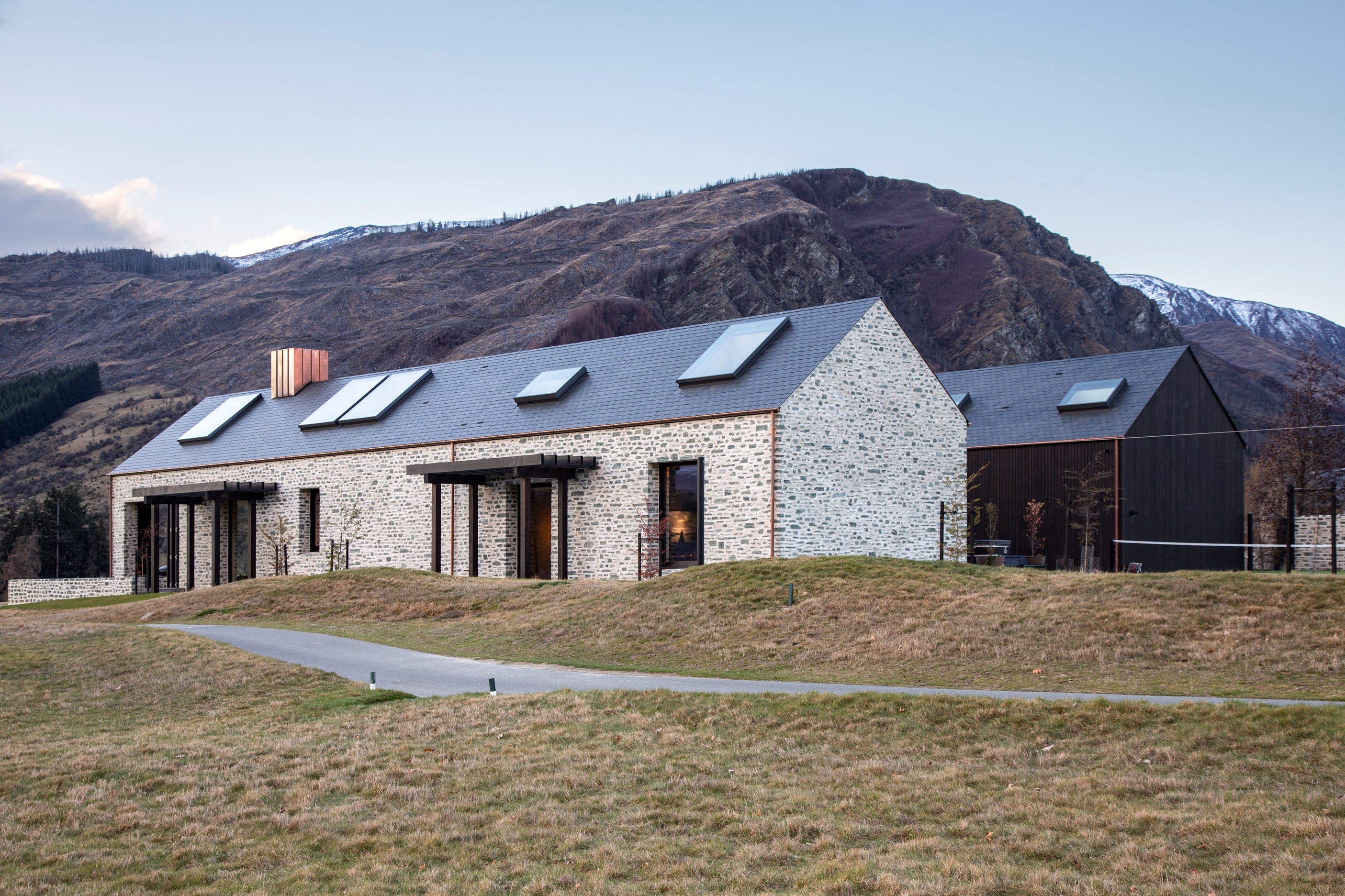 The simple barn form never looked so good. This Patterson Associates Architects-designed holiday home speaks the Central Otago language of stone and timber. The vernacular of The Gatehouse is expressed in two barn-like structures, one clad in local schist, the other in timber – wholly appropriate for a property on a former sheep station. The brief was to deliver a flexible home for family and guests, which is not as simple as it sounds. Sometimes it has to accommodate lots of people in various stages of their lives; at others, it has to be comfortable for just two. Flexibility was key to the configuration. Still,there was plenty of room to work with – 661sqm, in fact. The timber, slightly smaller of the two pavillions sits on the street side of the site and has bedrooms, bathrooms, a kitchen, living spaces and a garage. Across the courtyard and linked by a gallery is the stone pavillion, with bedrooms, a large open-plan kitchen, dining and living area.