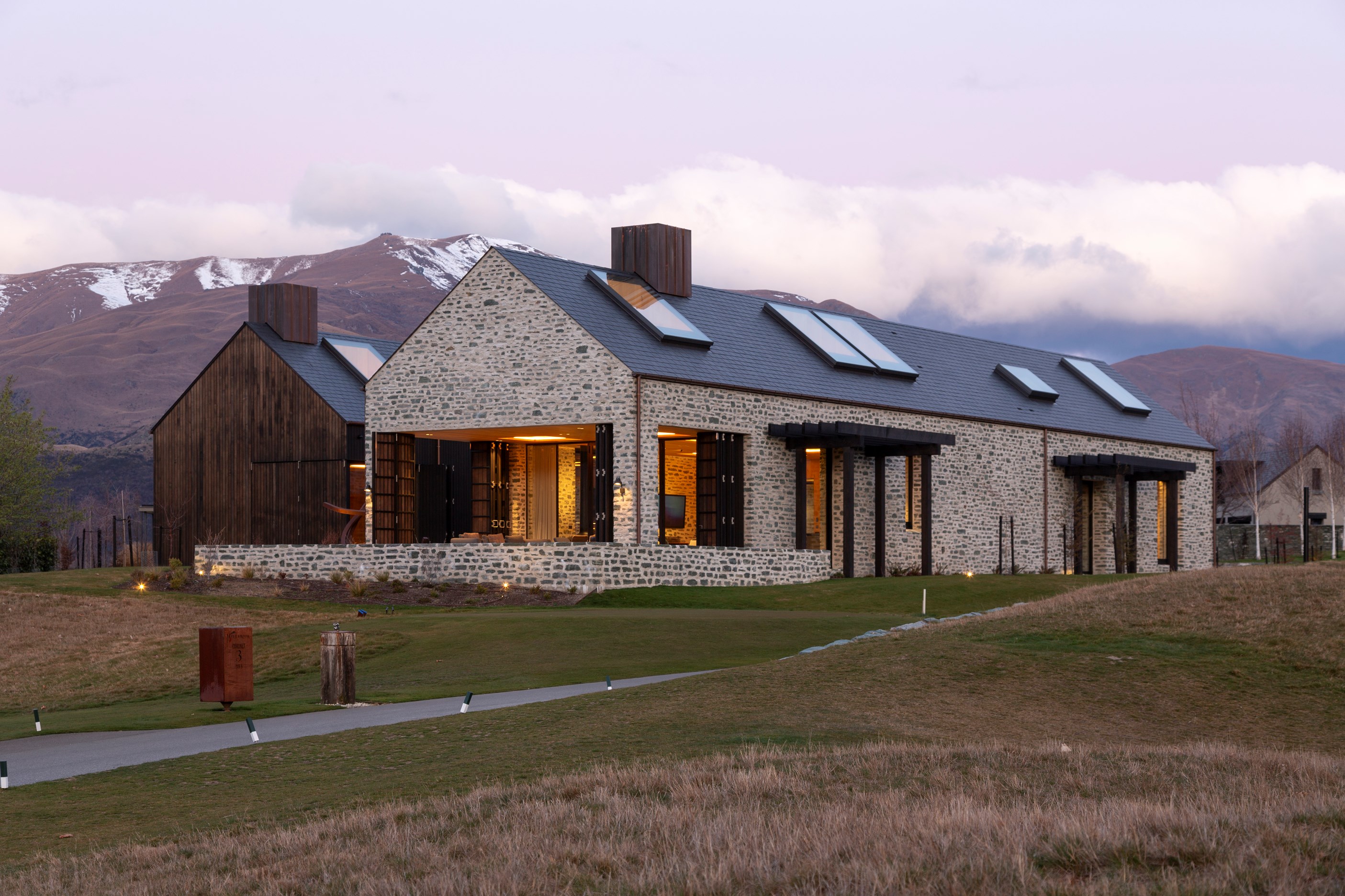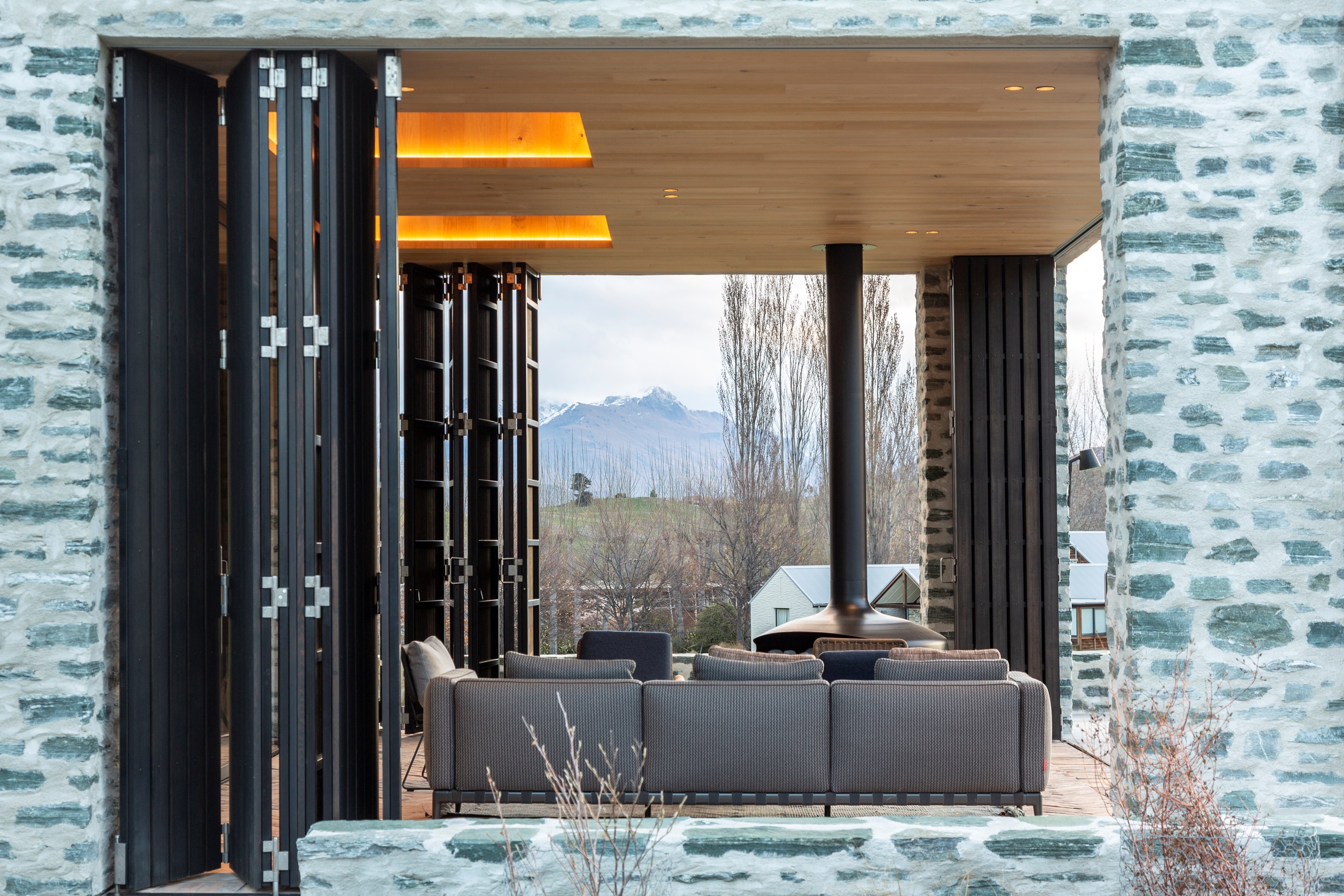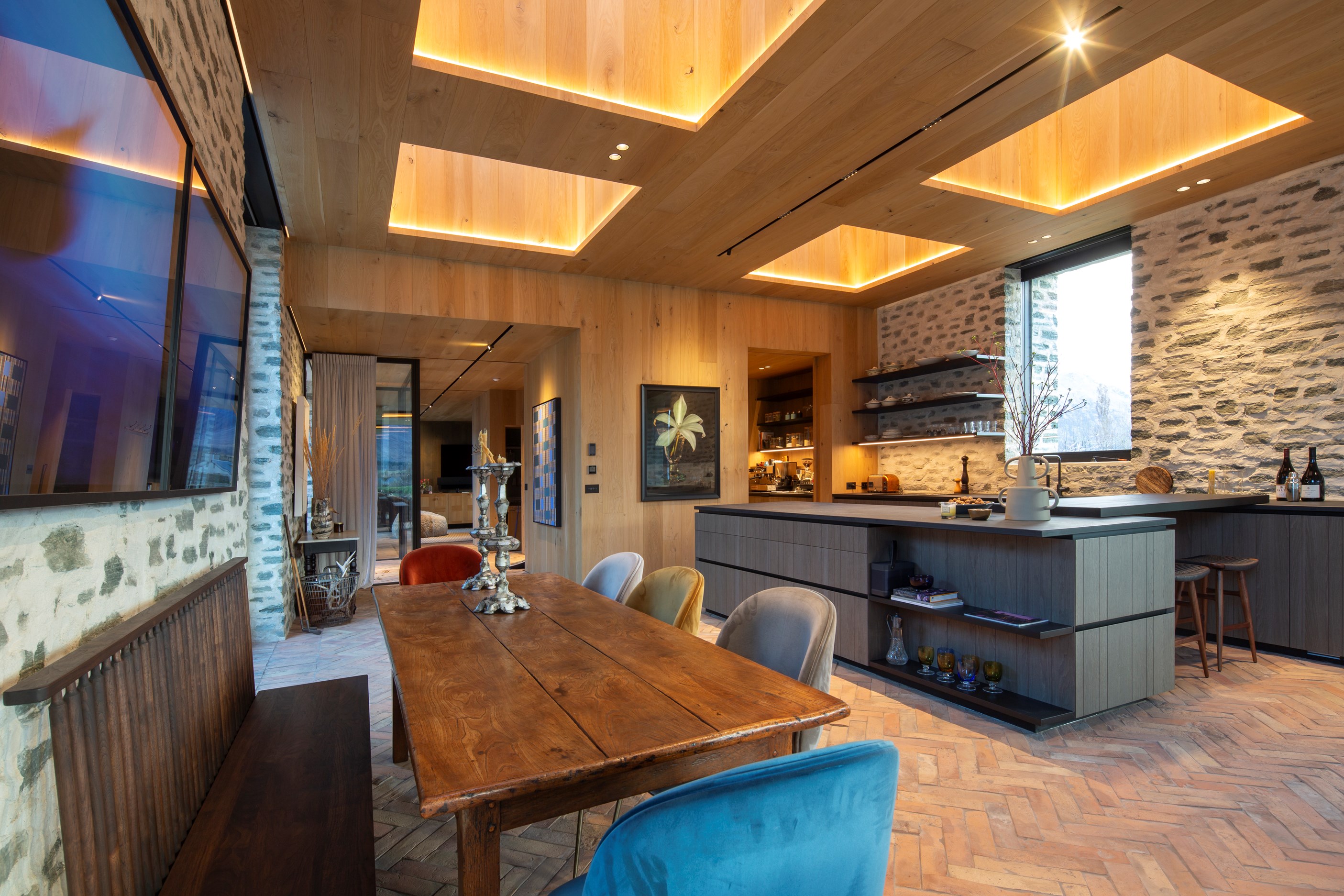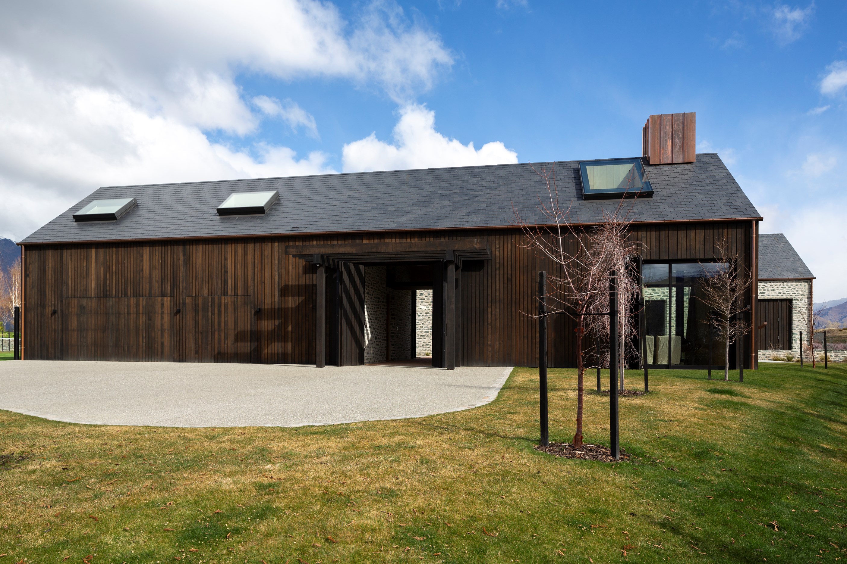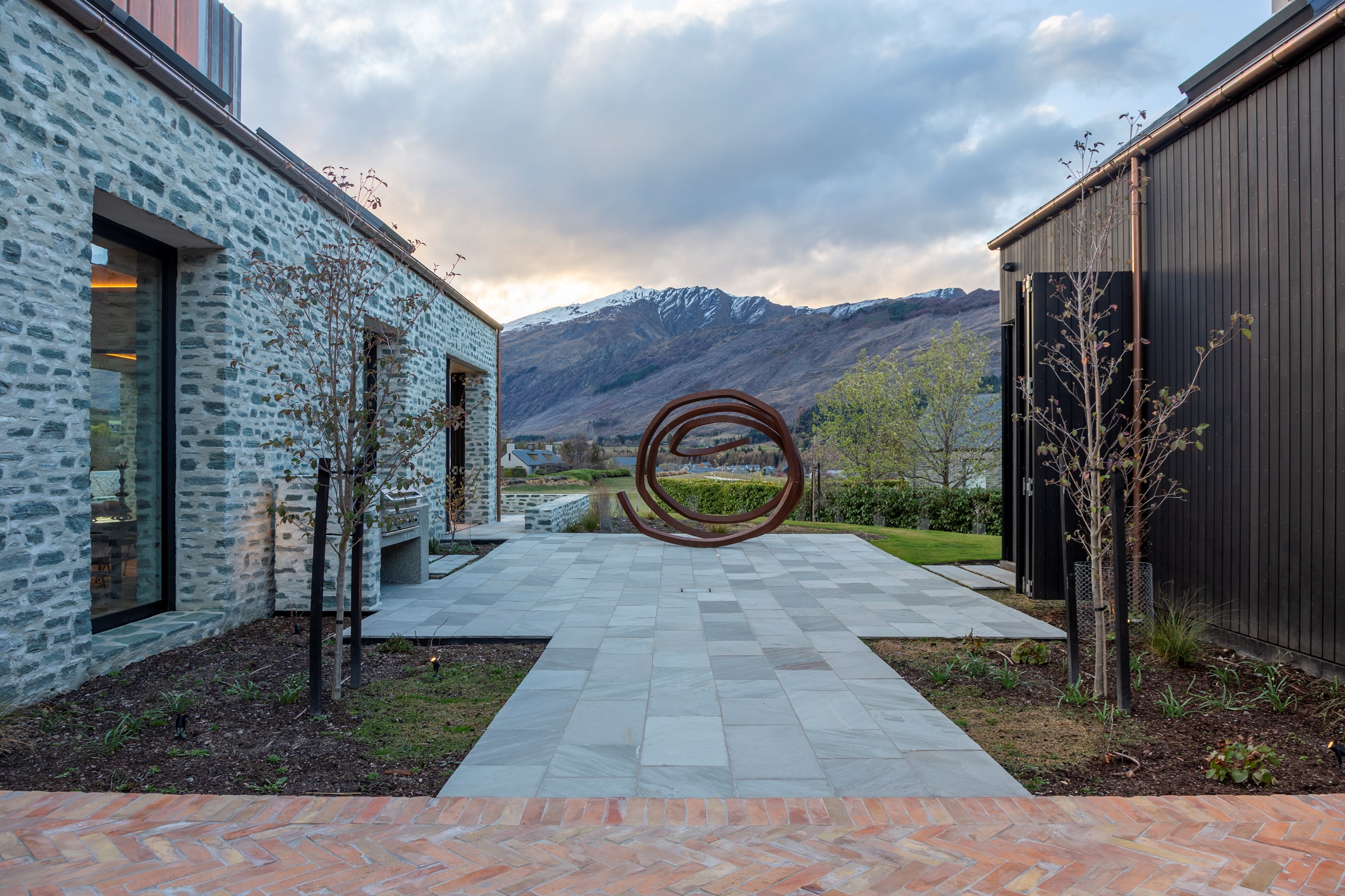 The simple barn form never looked so good. This Patterson Associates Architects-designed holiday home speaks the Central Otago language of stone and timber. The vernacular of The Gatehouse is expressed in two barn-like structures, one clad in local schist, the other in timber – wholly appropriate for a property on a former sheep station. The brief was to deliver a flexible home for family and guests, which is not as simple as it sounds. Sometimes it has to accommodate lots of people in various stages of their lives; at others, it has to be comfortable for just two. Flexibility was key to the configuration. Still,there was plenty of room to work with – 661sqm, in fact. The timber, slightly smaller of the two pavillions sits on the street side of the site and has bedrooms, bathrooms, a kitchen, living spaces and a garage. Across the courtyard and linked by a gallery is the stone pavillion, with bedrooms, a large open-plan kitchen, dining and living area.