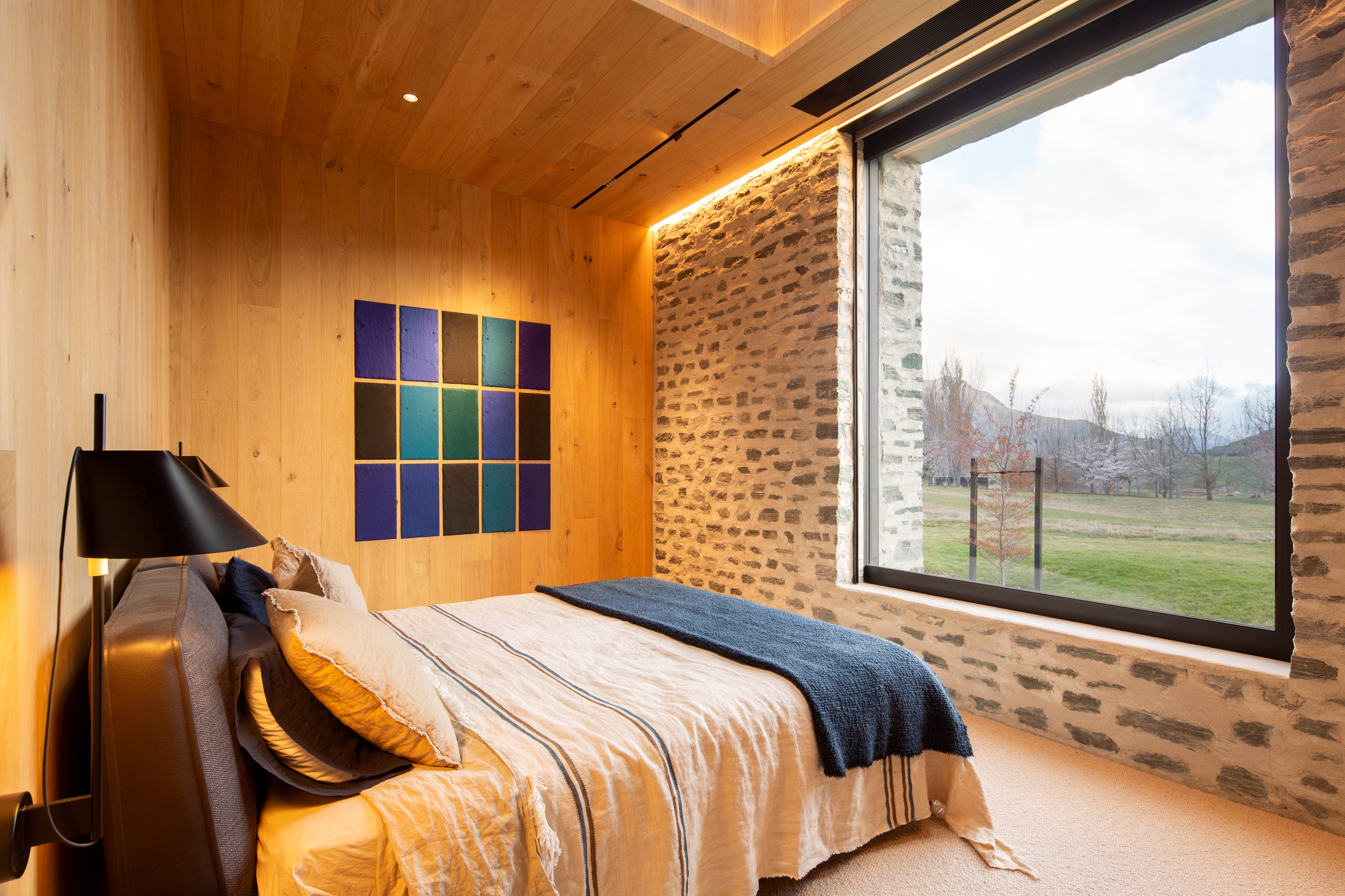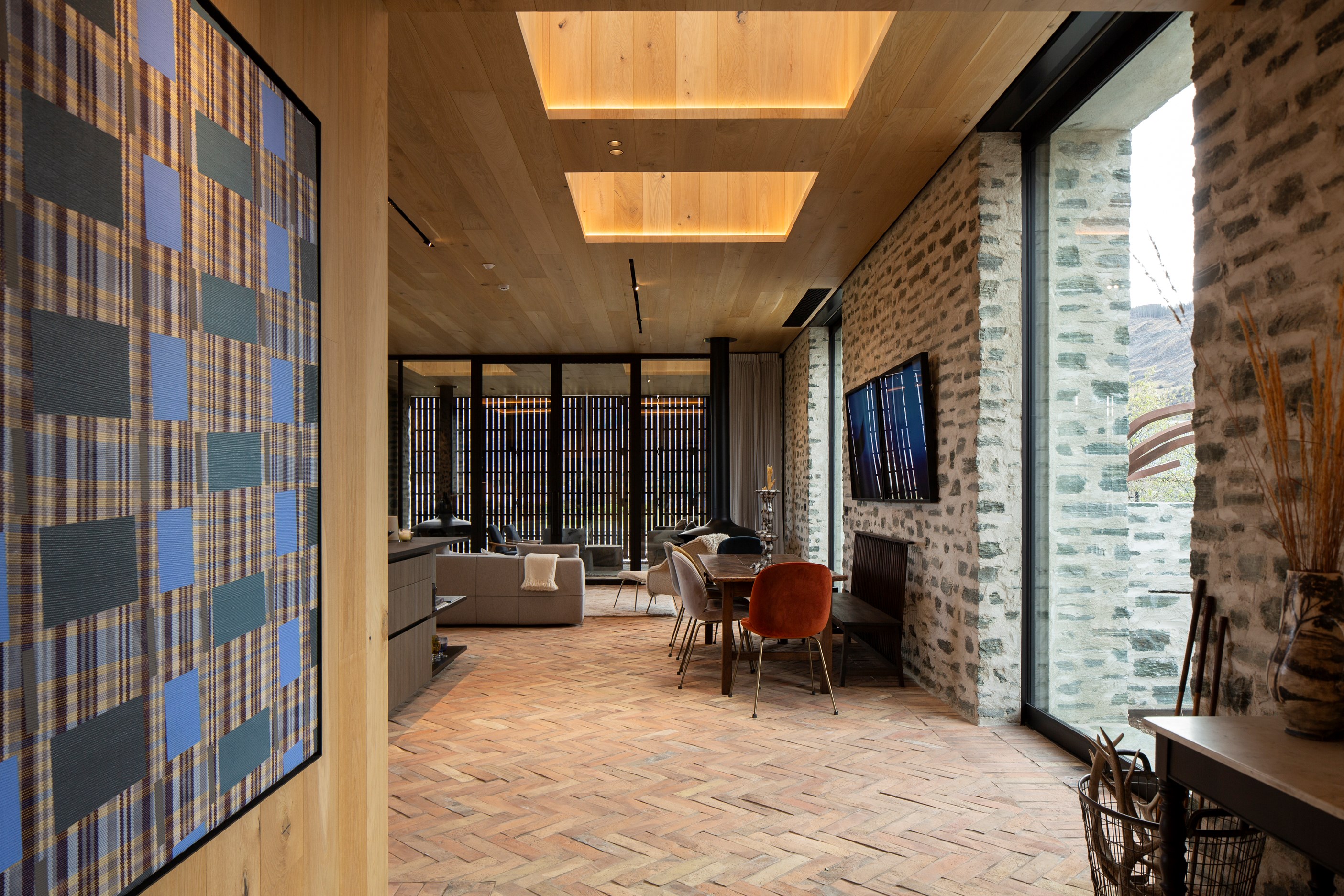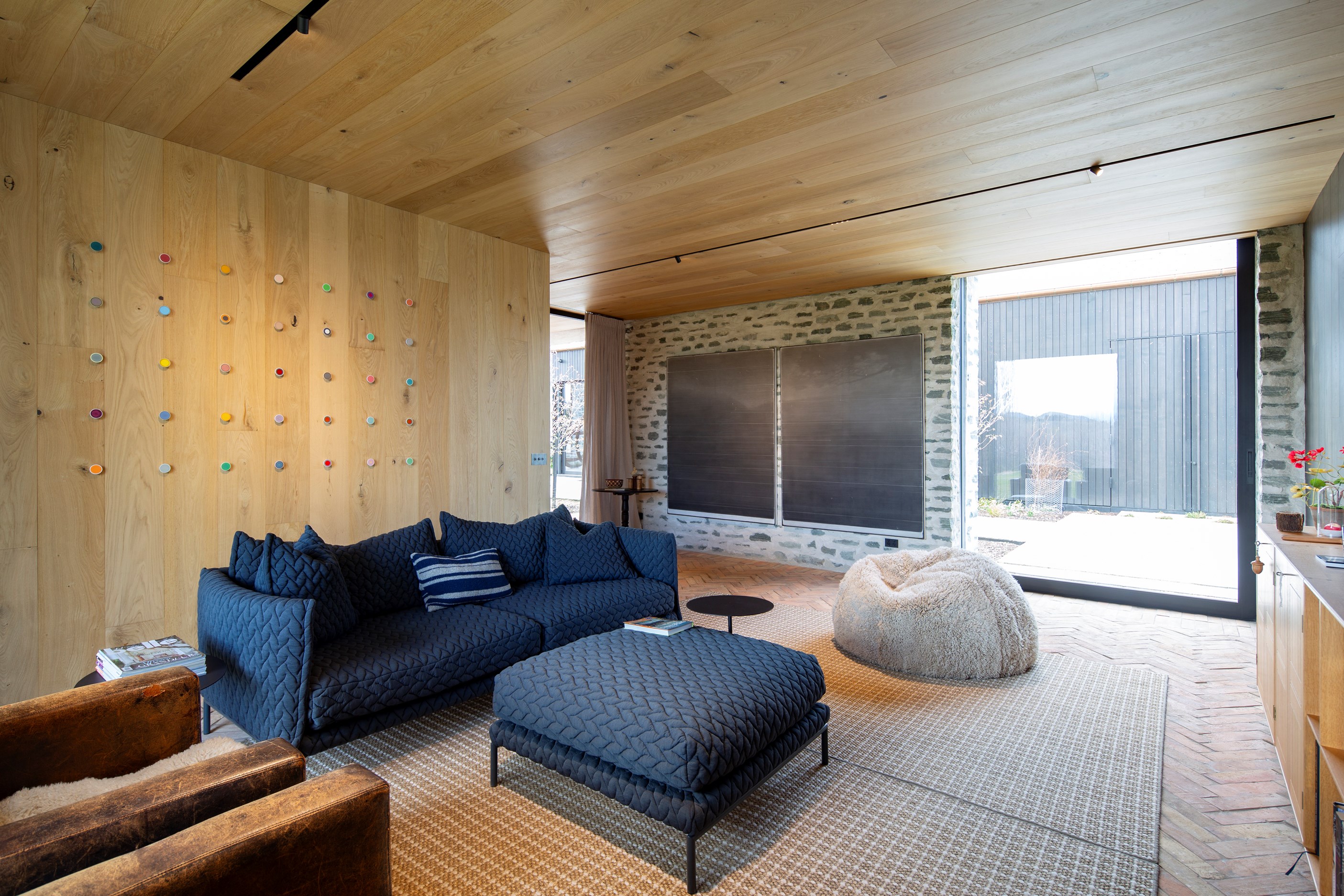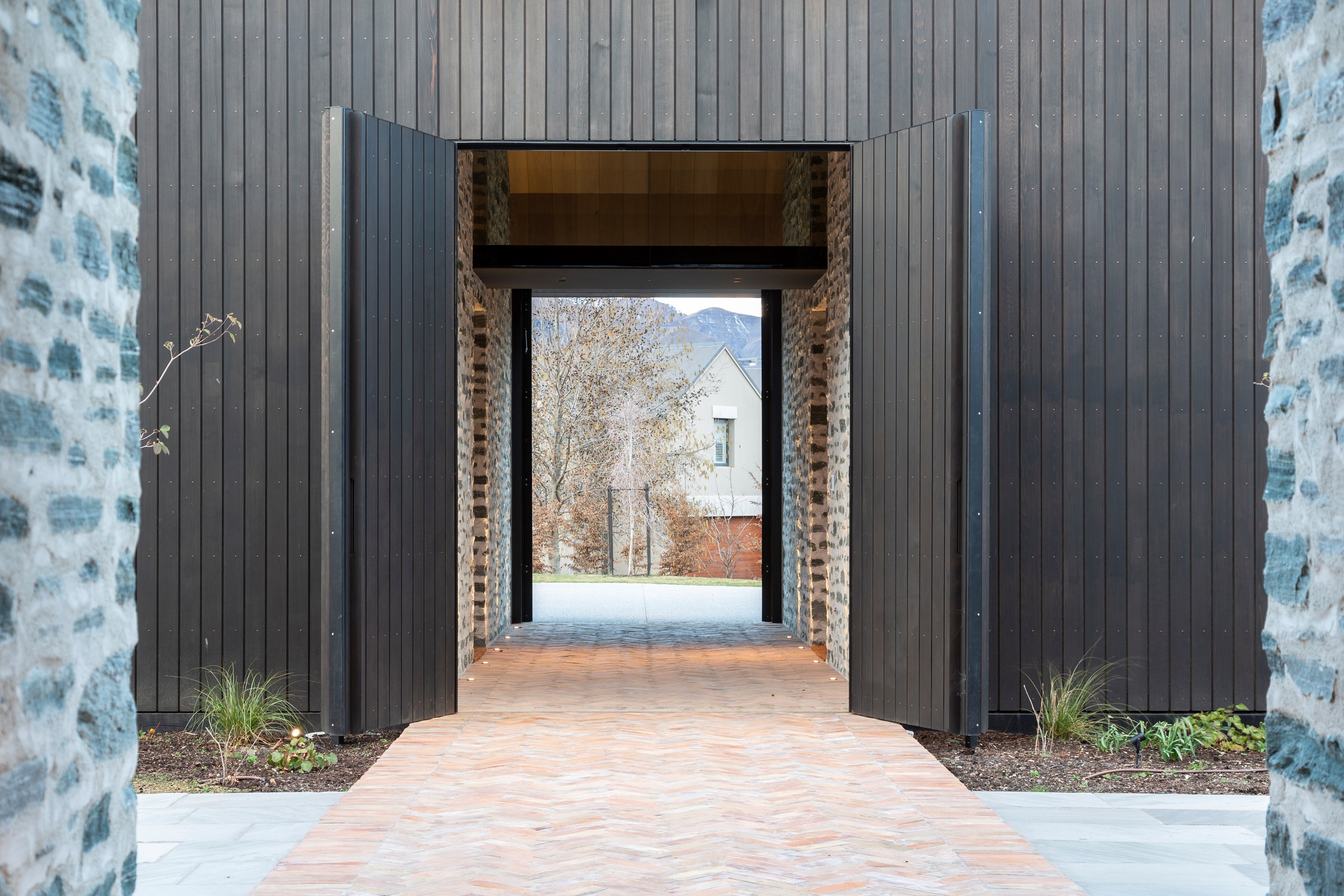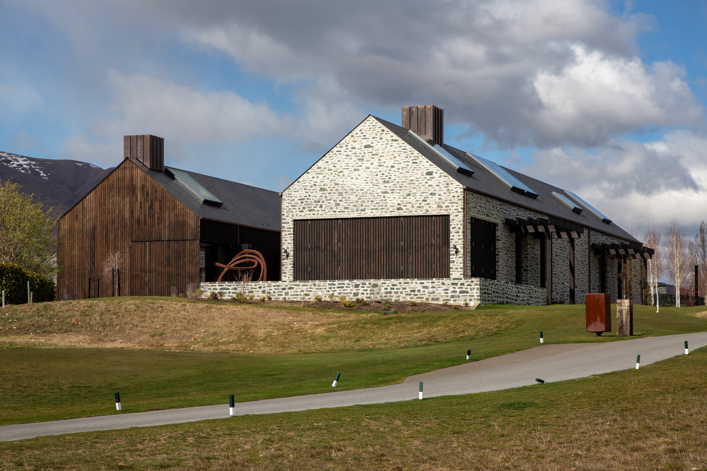 The simple barn form never looked so good. This Patterson Associates Architects-designed holiday home speaks the Central Otago language of stone and timber. The vernacular of The Gatehouse is expressed in two barn-like structures, one clad in local schist, the other in timber – wholly appropriate for a property on a former sheep station. The brief was to deliver a flexible home for family and guests, which is not as simple as it sounds. Sometimes it has to accommodate lots of people in various stages of their lives; at others, it has to be comfortable for just two. Flexibility was key to the configuration. Still,there was plenty of room to work with – 661sqm, in fact. The timber, slightly smaller of the two pavillions sits on the street side of the site and has bedrooms, bathrooms, a kitchen, living spaces and a garage. Across the courtyard and linked by a gallery is the stone pavillion, with bedrooms, a large open-plan kitchen, dining and living area.