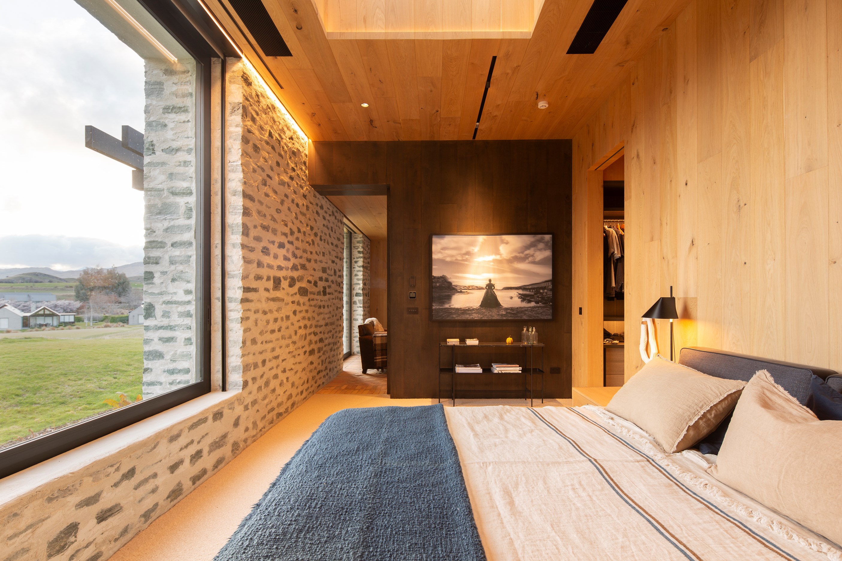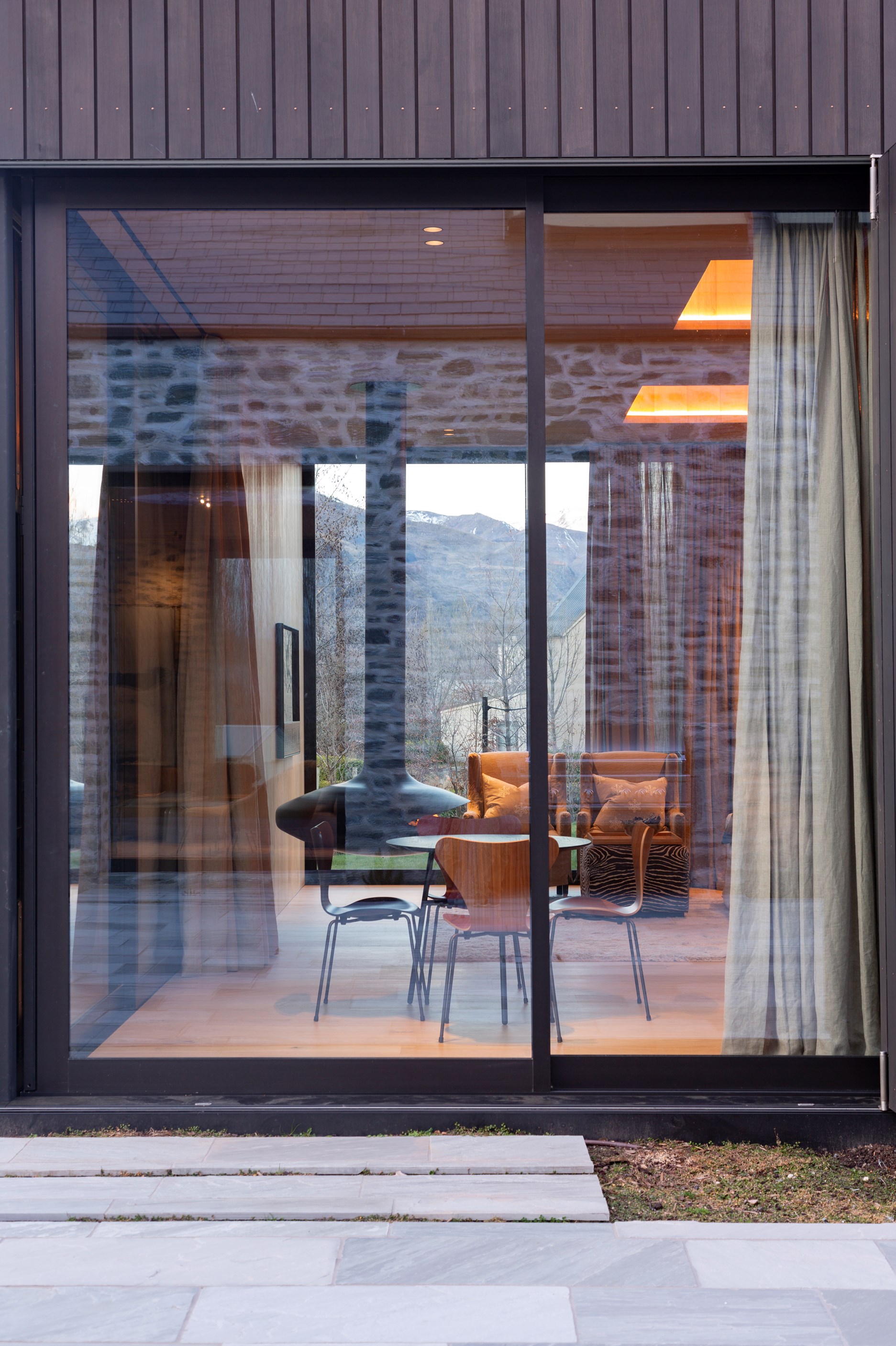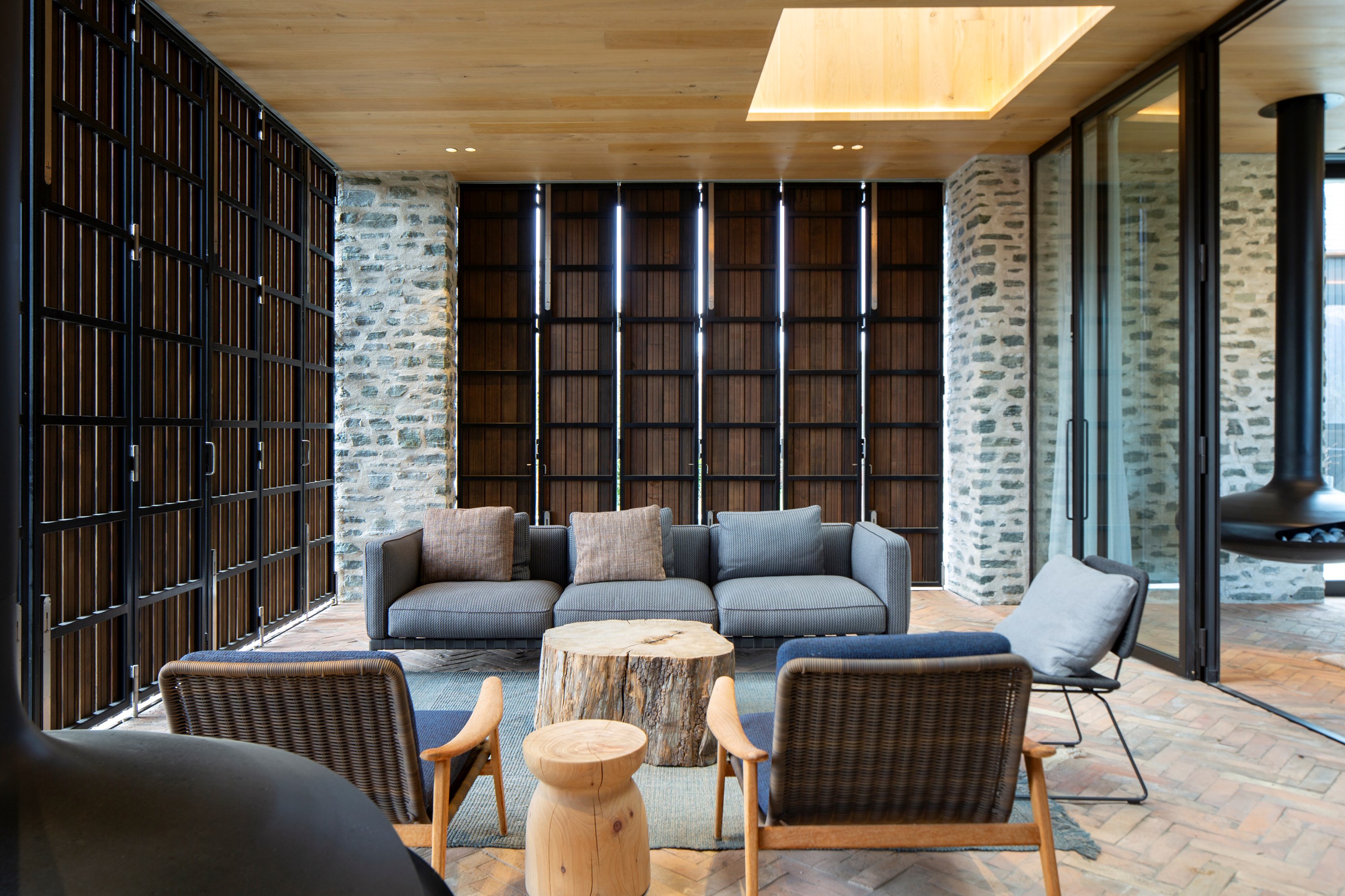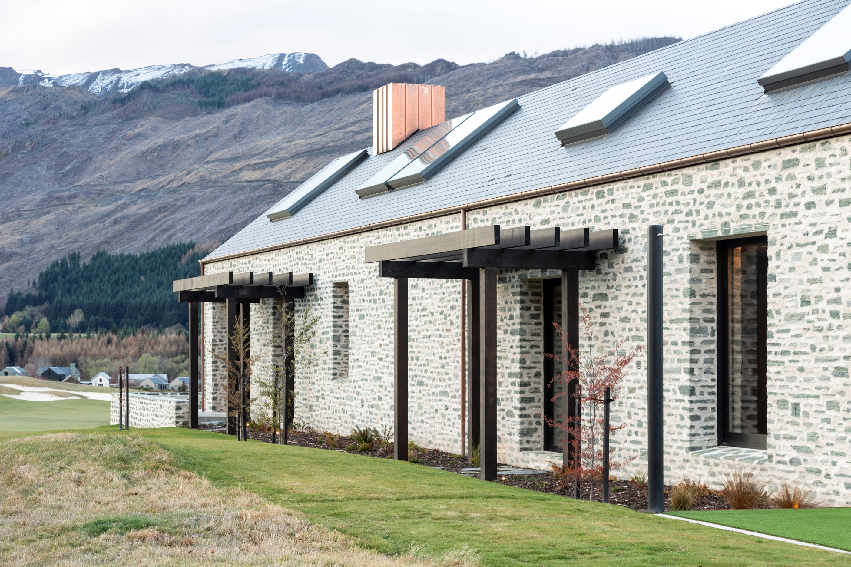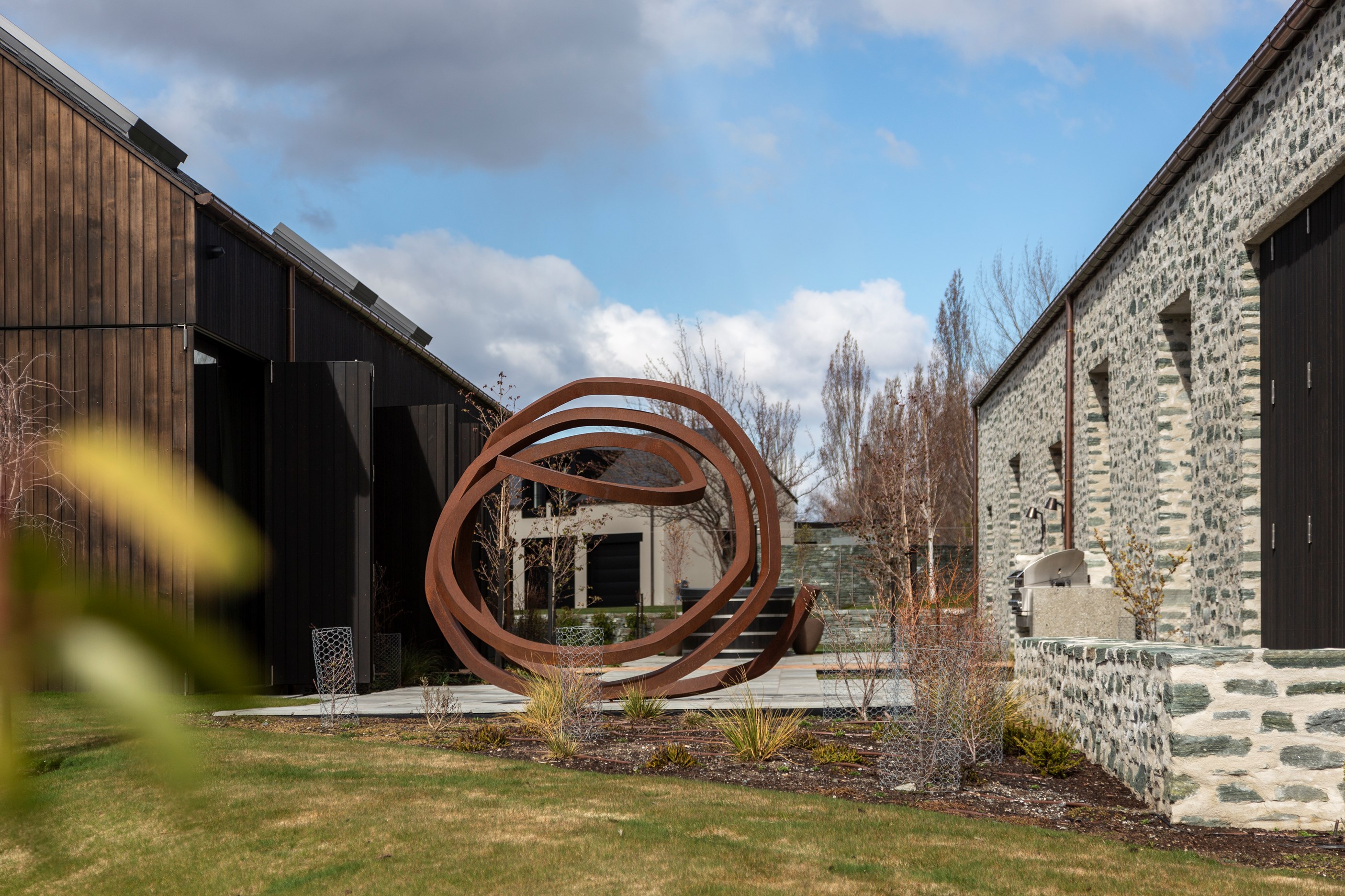 The simple barn form never looked so good. This Patterson Associates Architects-designed holiday home speaks the Central Otago language of stone and timber. The vernacular of The Gatehouse is expressed in two barn-like structures, one clad in local schist, the other in timber – wholly appropriate for a property on a former sheep station. The brief was to deliver a flexible home for family and guests, which is not as simple as it sounds. Sometimes it has to accommodate lots of people in various stages of their lives; at others, it has to be comfortable for just two. Flexibility was key to the configuration. Still,there was plenty of room to work with – 661sqm, in fact. The timber, slightly smaller of the two pavillions sits on the street side of the site and has bedrooms, bathrooms, a kitchen, living spaces and a garage. Across the courtyard and linked by a gallery is the stone pavillion, with bedrooms, a large open-plan kitchen, dining and living area.